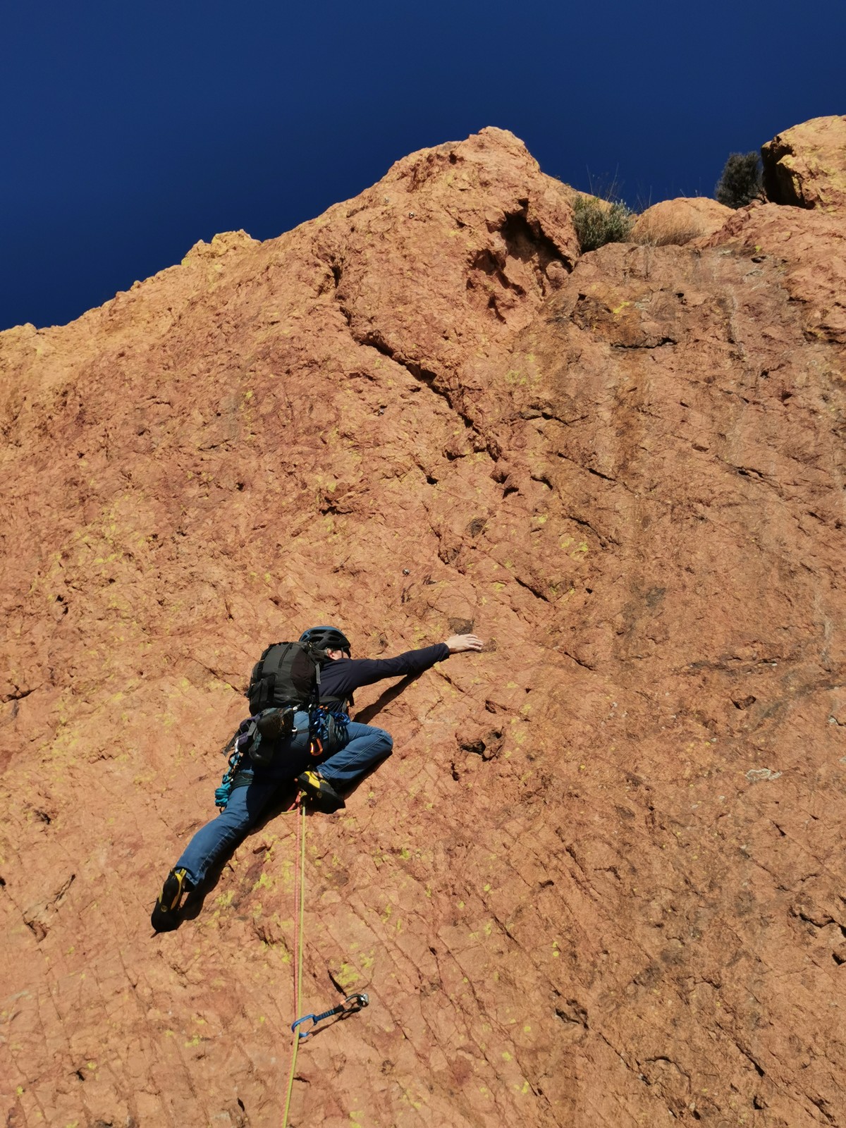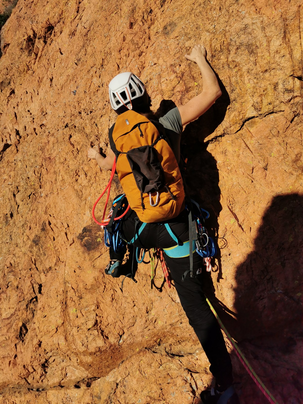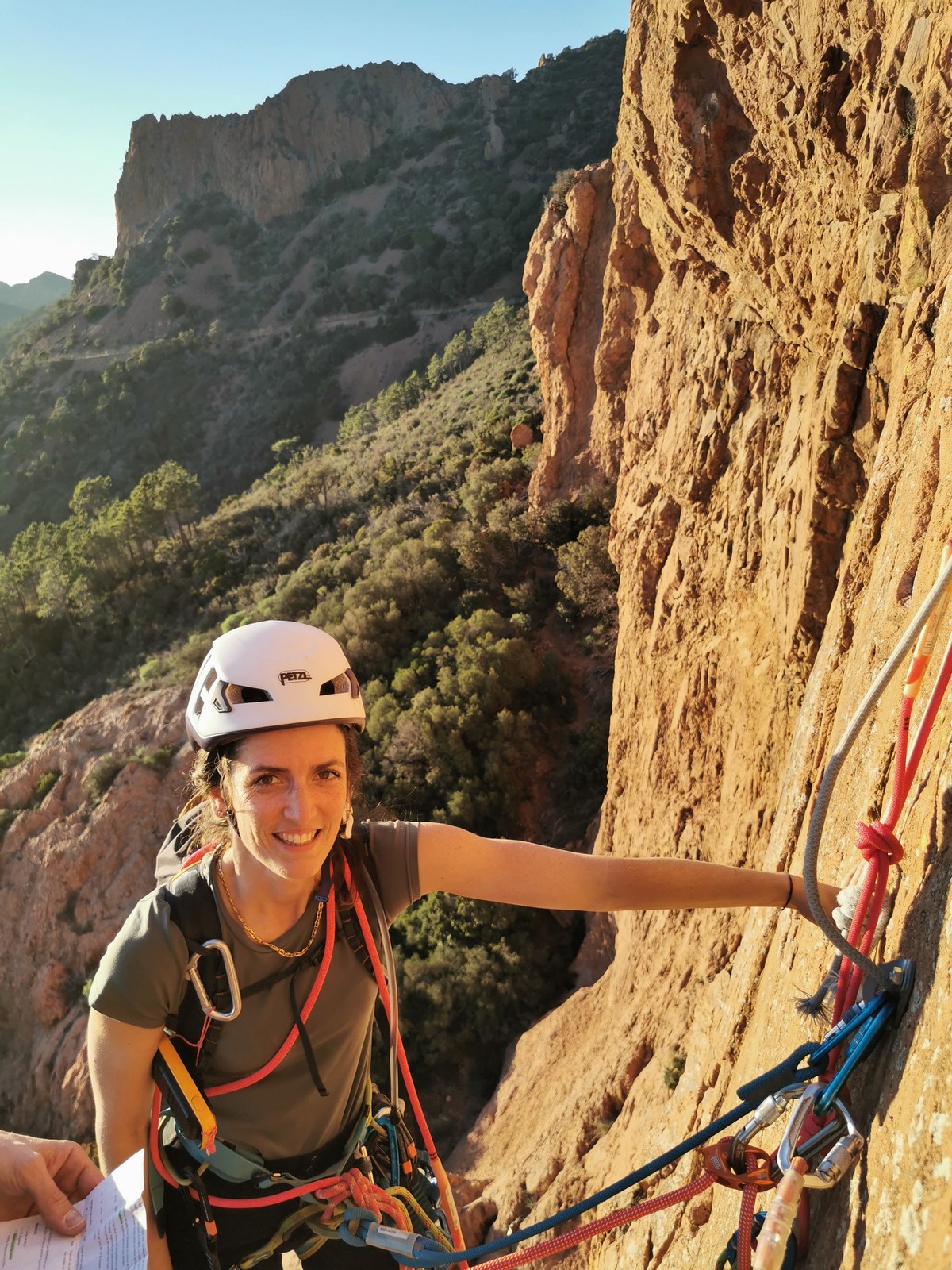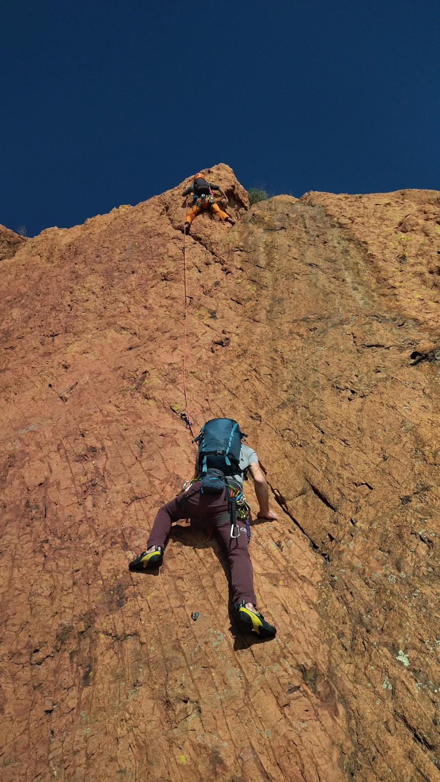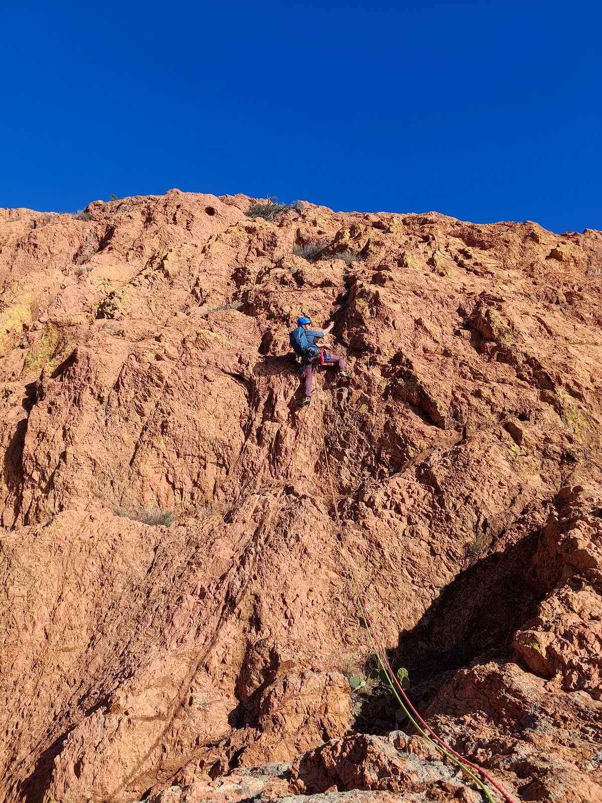 Nous planifions de nous retrouver au sommet pour manger un bout et repartir pour une seconde voie l’après-midi si le timing est correct (au moins une partie du groupe). Il faut garder à l’esprit que le soleil se couche à 17h et qu’il fait nuit à 17h30 ! Ainsi, les cordées s’activent aux sons des messages dans les talkies. Un « assuré » par-ci, un « départ bleu » par là me permet de garder à l’esprit où en est chacun de mes grimpeurs.