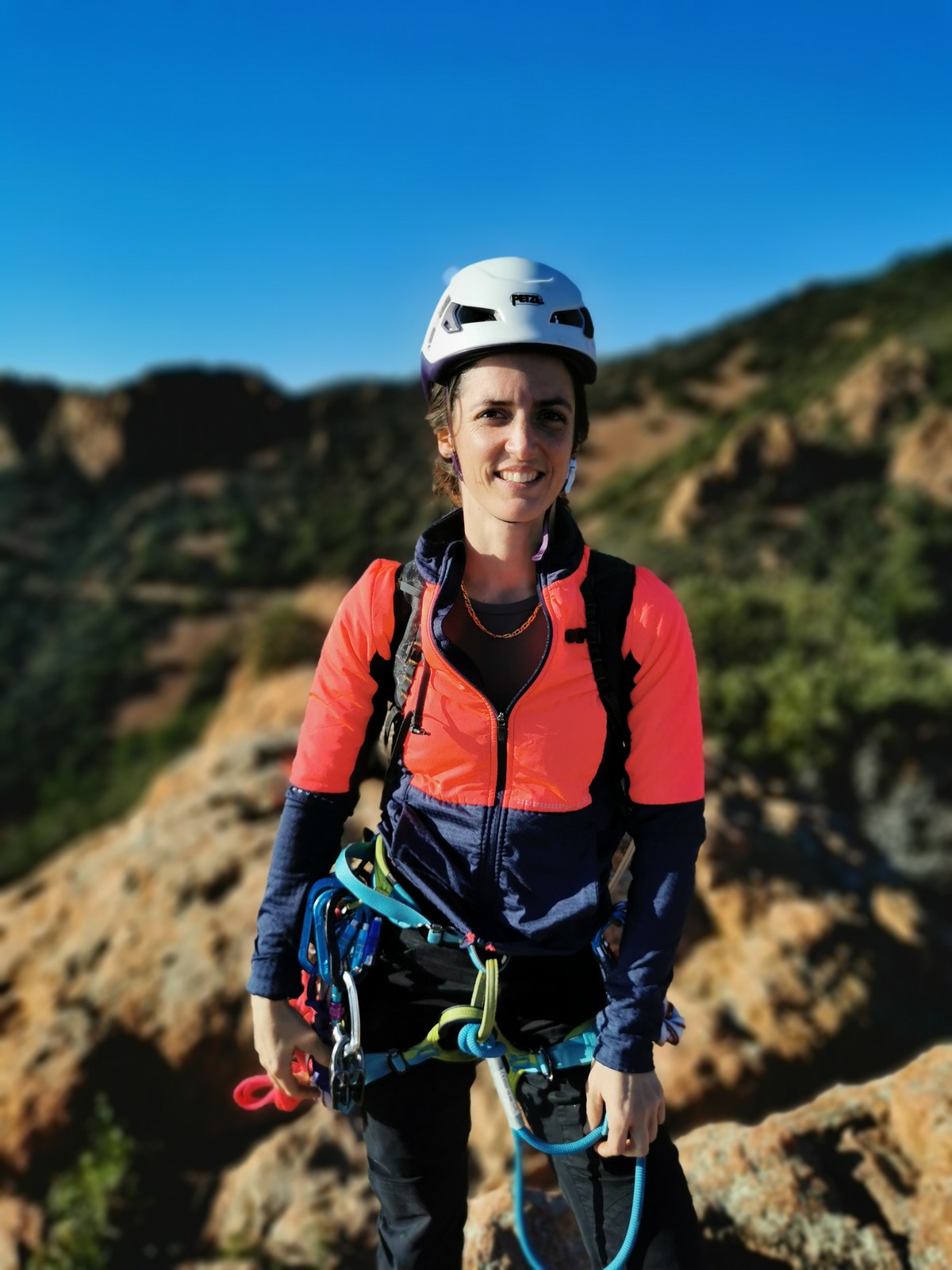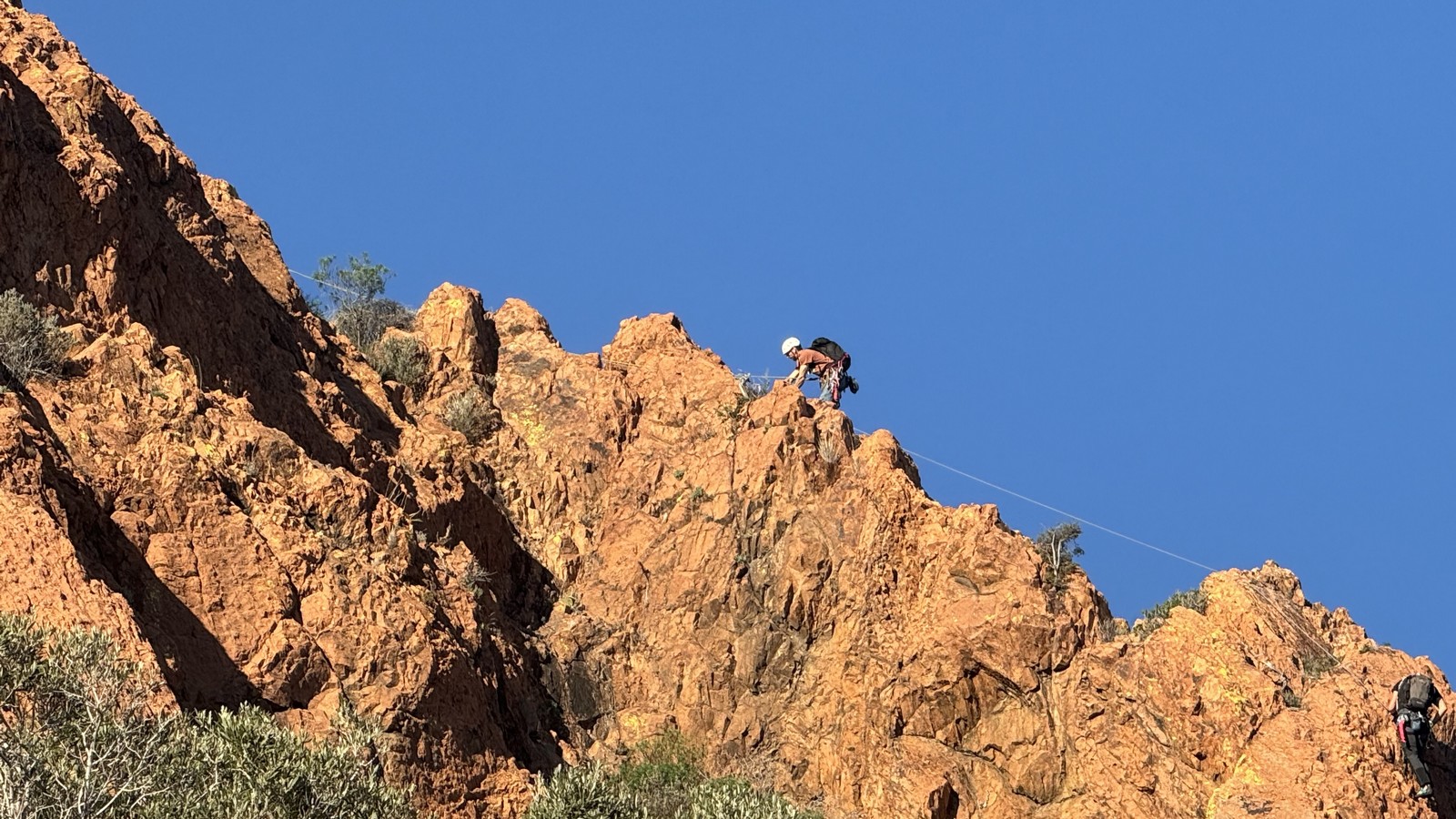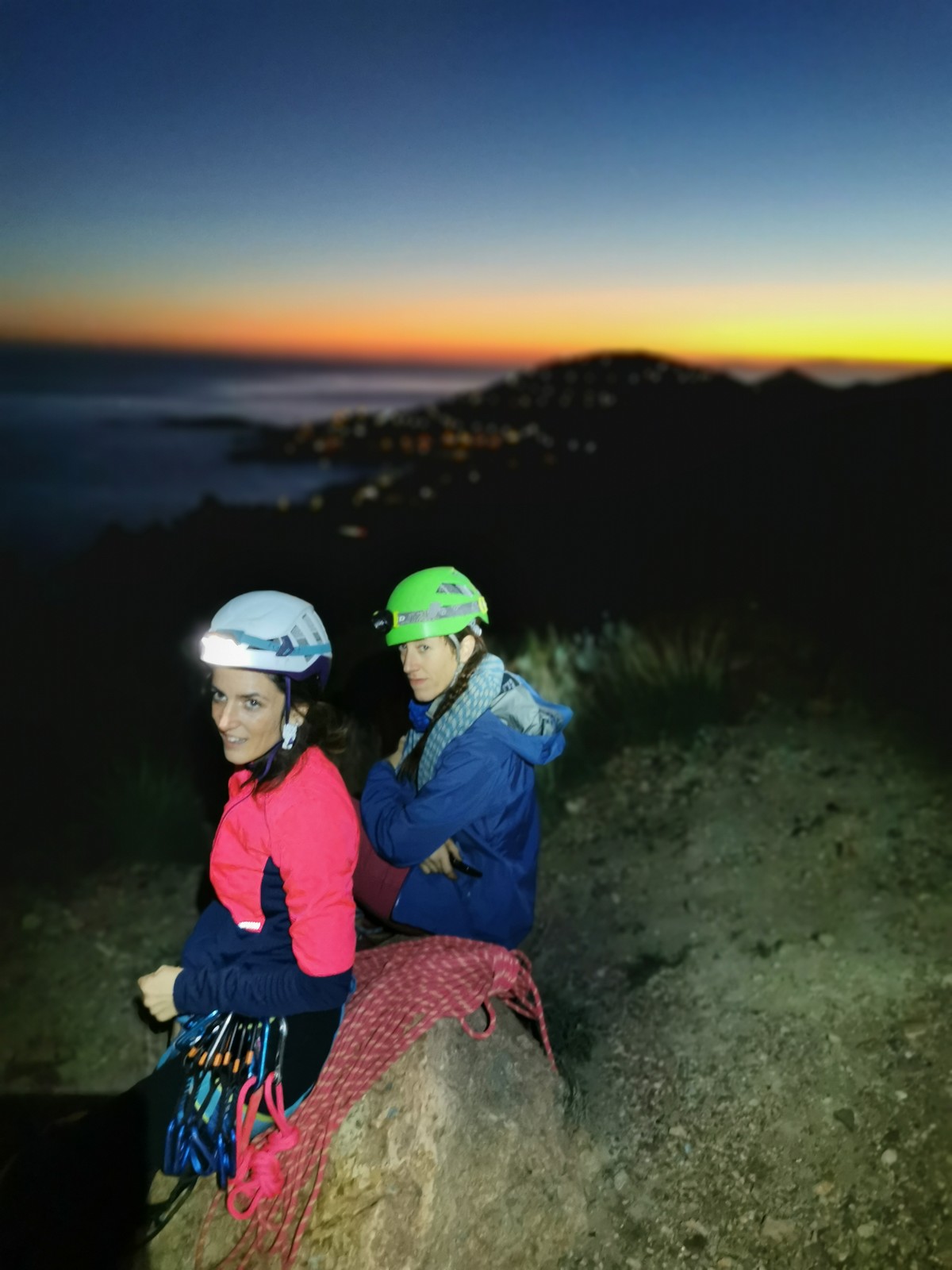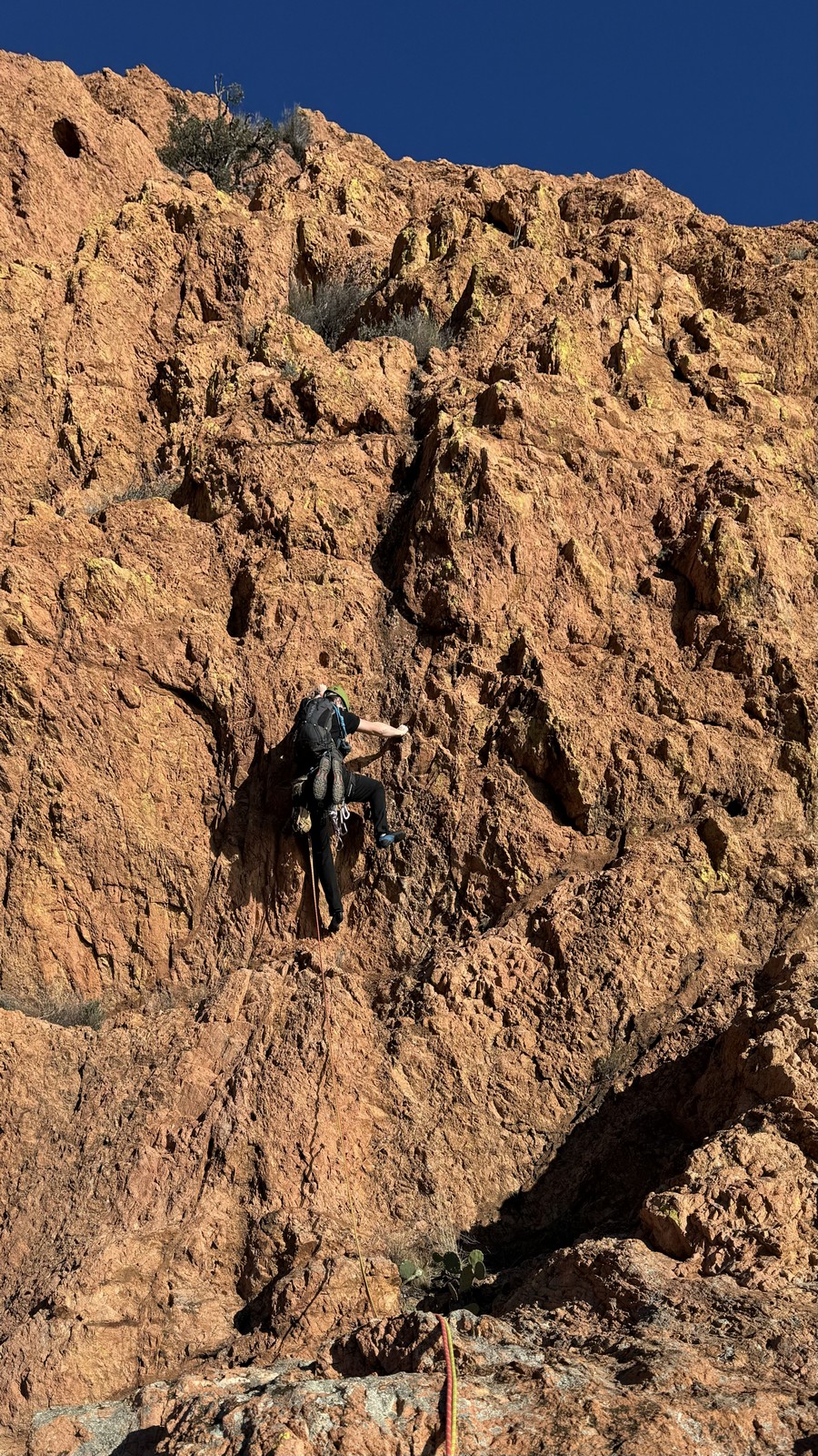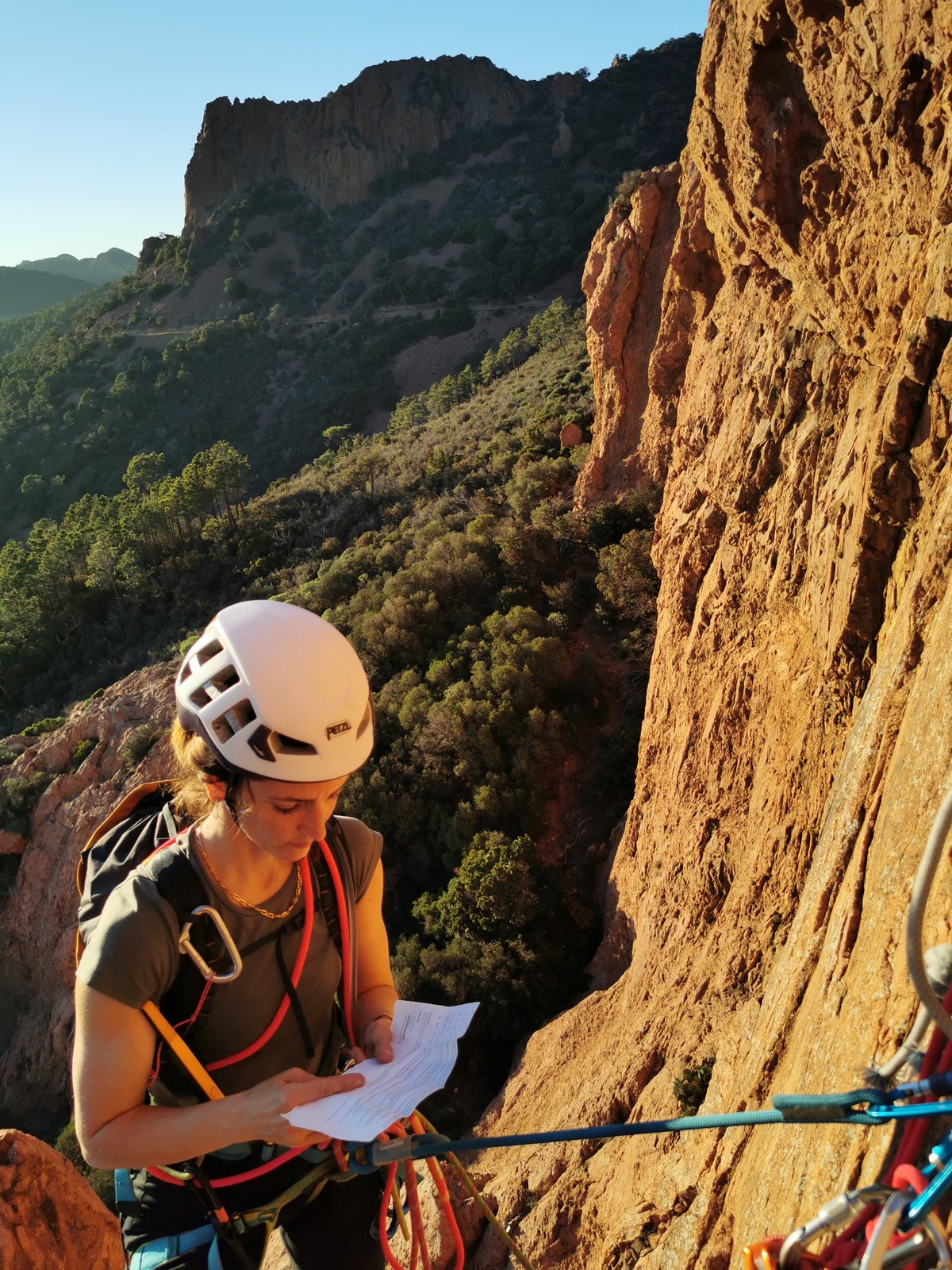 Nous planifions de nous retrouver au sommet pour manger un bout et repartir pour une seconde voie l’après-midi si le timing est correct (au moins une partie du groupe). Il faut garder à l’esprit que le soleil se couche à 17h et qu’il fait nuit à 17h30 ! Ainsi, les cordées s’activent aux sons des messages dans les talkies. Un « assuré » par-ci, un « départ bleu » par là me permet de garder à l’esprit où en est chacun de mes grimpeurs.