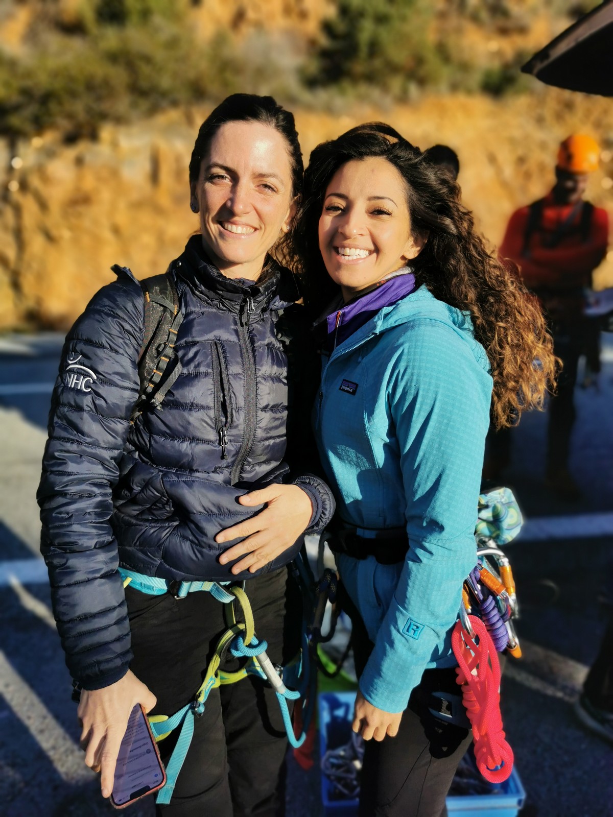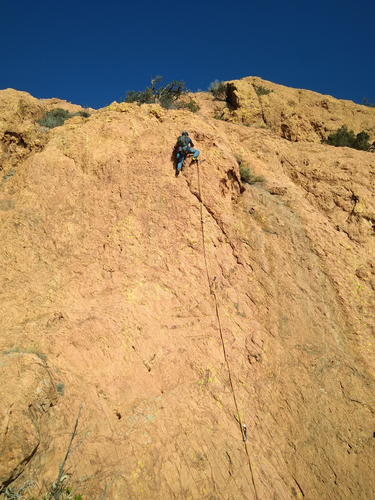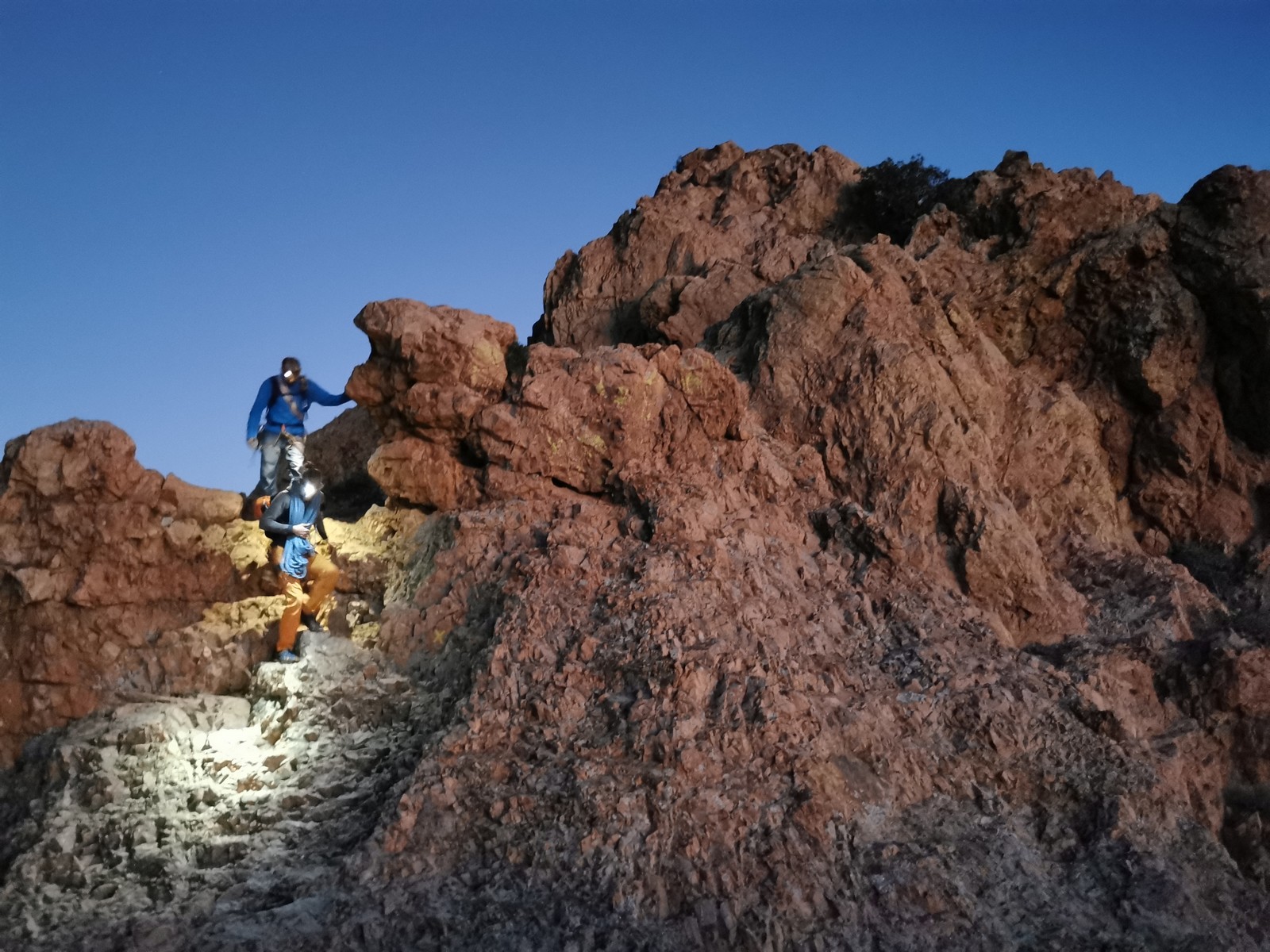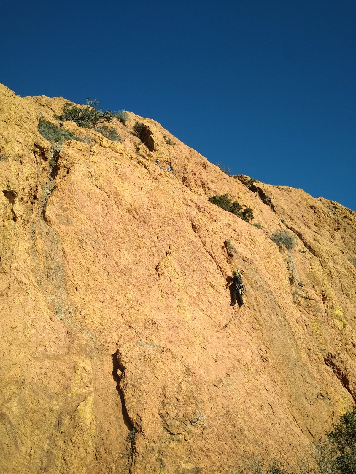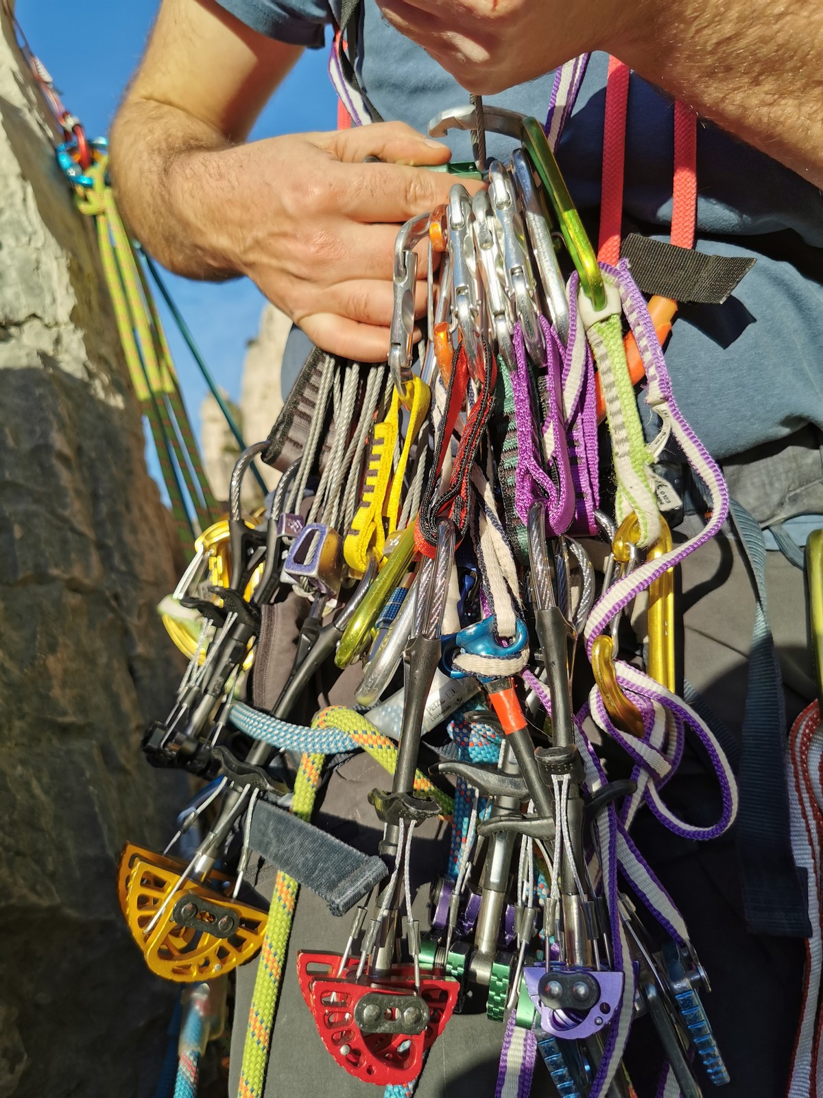 Nous planifions de nous retrouver au sommet pour manger un bout et repartir pour une seconde voie l’après-midi si le timing est correct (au moins une partie du groupe). Il faut garder à l’esprit que le soleil se couche à 17h et qu’il fait nuit à 17h30 ! Ainsi, les cordées s’activent aux sons des messages dans les talkies. Un « assuré » par-ci, un « départ bleu » par là me permet de garder à l’esprit où en est chacun de mes grimpeurs.