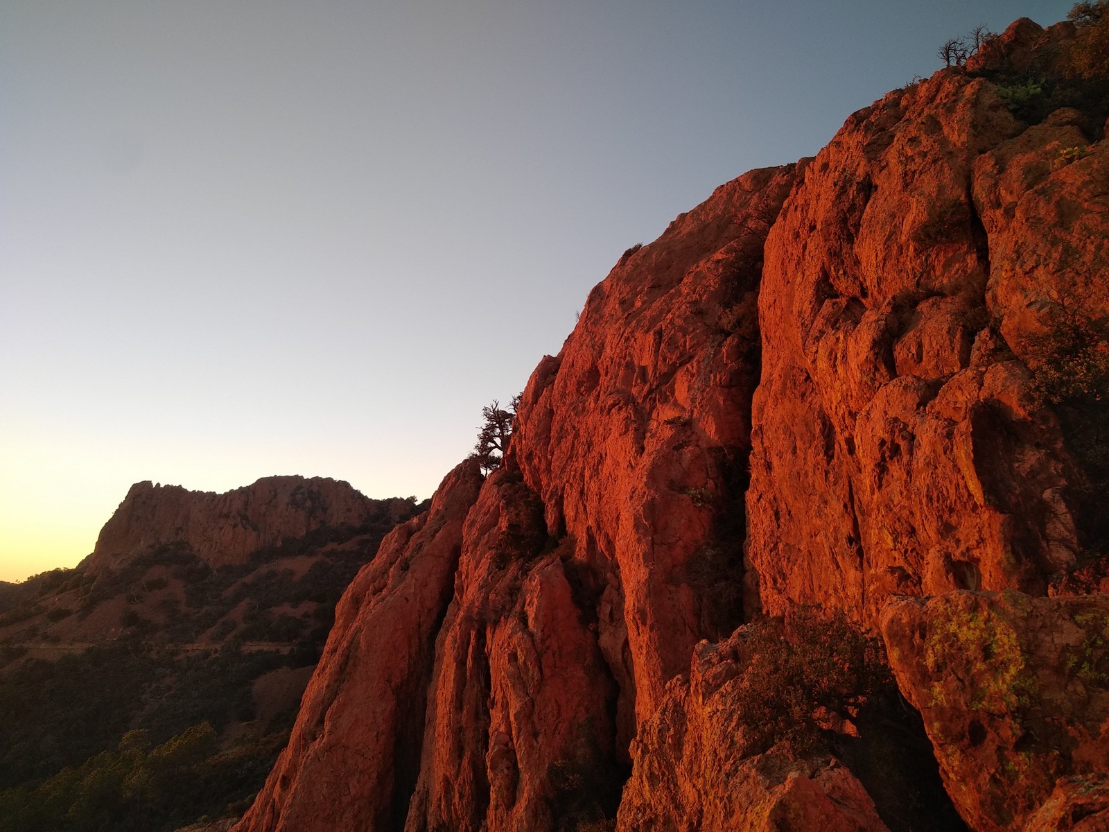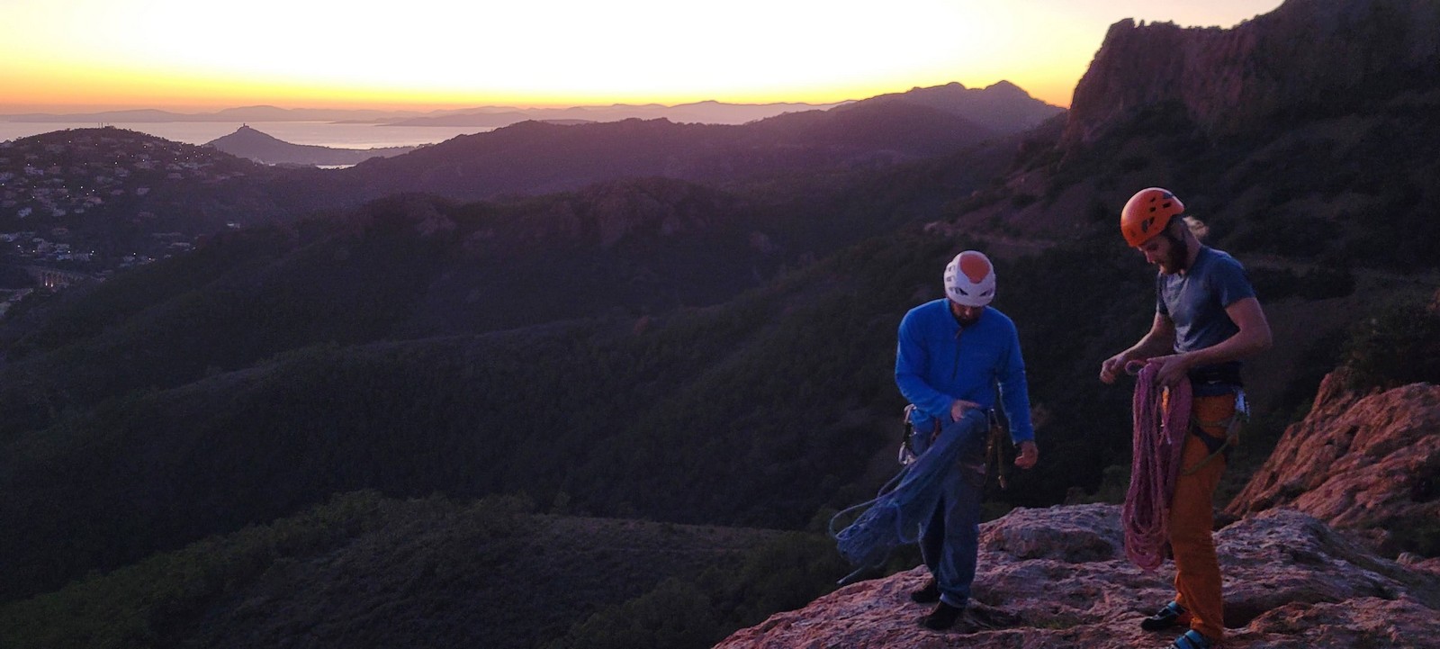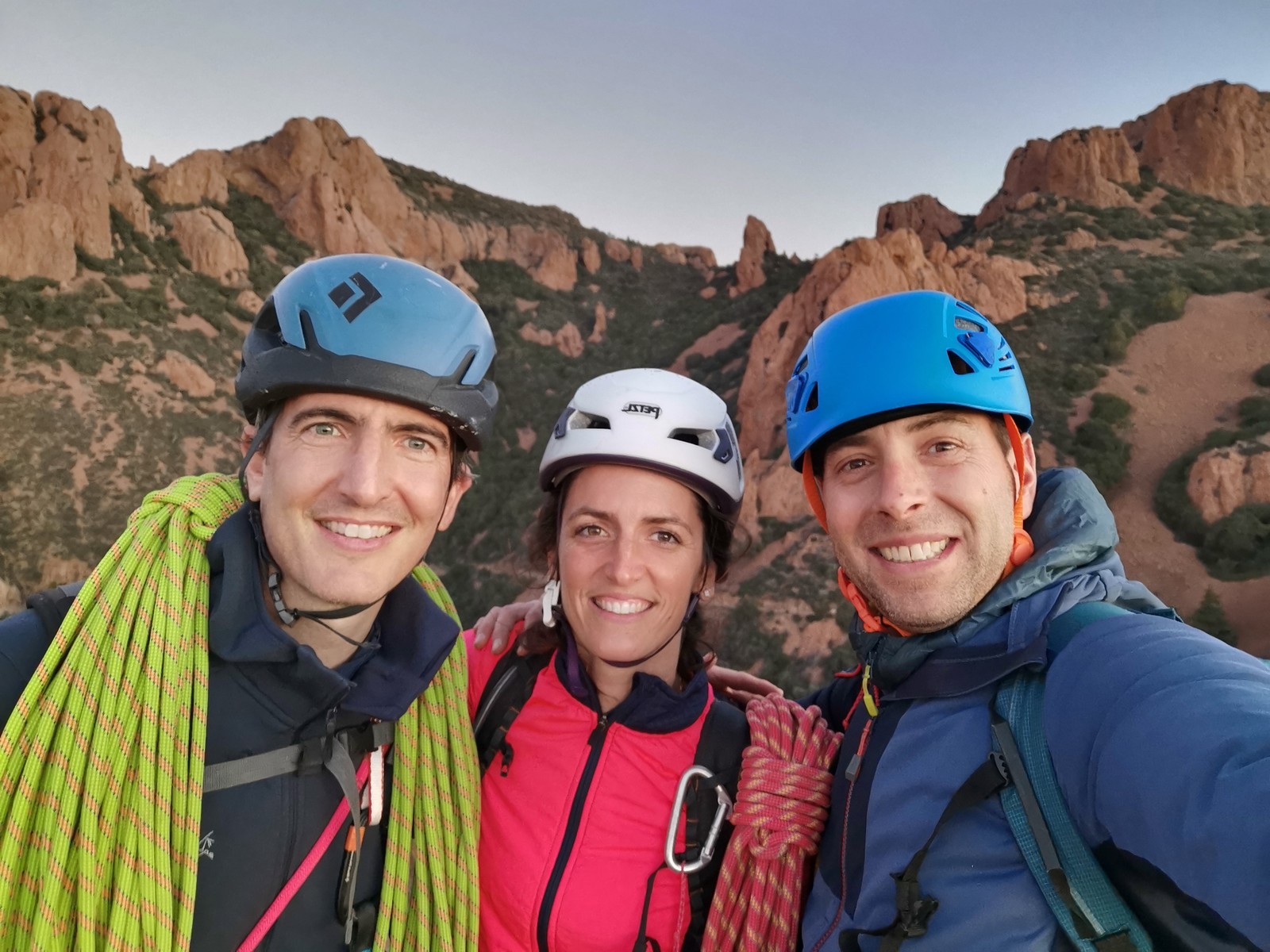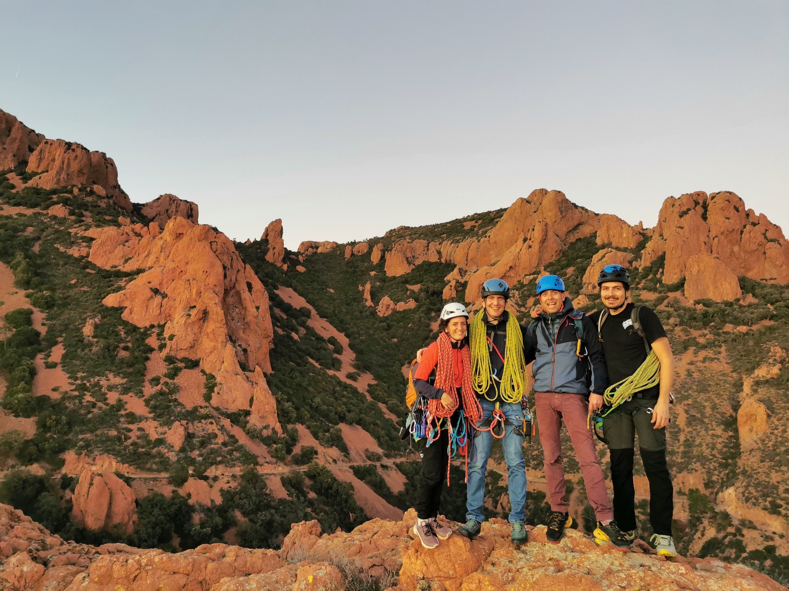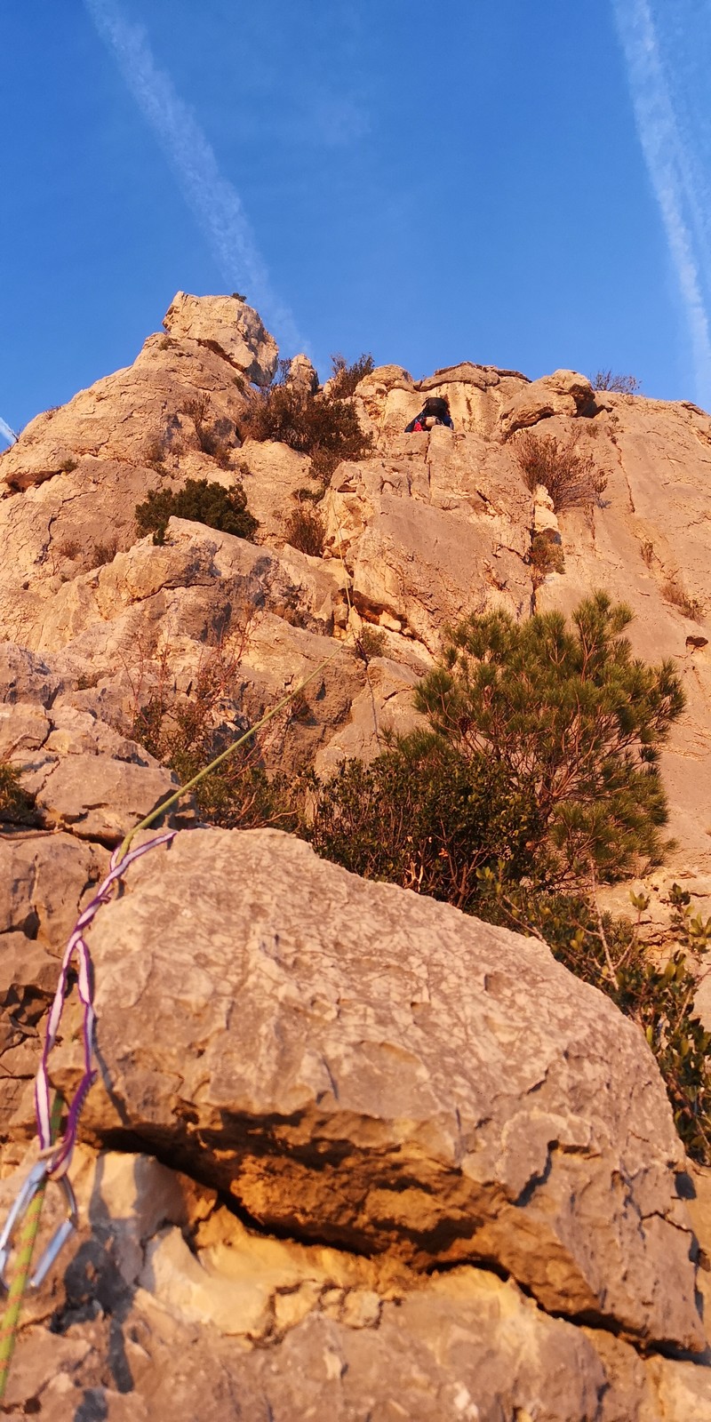 Julien, François et Cécile doivent également faire les Schtroumpfs mais tentent de descendre par 2 rappels depuis le sommet, pensant que ce serait plus rapide. Grosse erreur ! Je descends à pied avec JP, Xav et Laura qui jouent la sécurité en allant dans le croupion et rejoins Matthieu et Camille à l’autre bout de la falaise pour faire « Guides 06 contre-attaque« , une voie en TA que j’avais répérée quelques semaines auparavant et un peu plus dure. Camille avale la première longueur en 5c et cède la longueur facile à Matthieu qui part construire son premier relais TA sous mes conseils. Camille reprend la tête dans la longueur clé, elle a l’oeil et parvient à protéger régulièrement. On la rejoint et j’envoie en confiance Matthieu dans la suite, une longueur en 5c de quasi 50m qu’il négocie avec brio mais un peu de tirage. Le soleil est en train de se coucher lorsqu’on attaque la marche de fin vers le sommet.