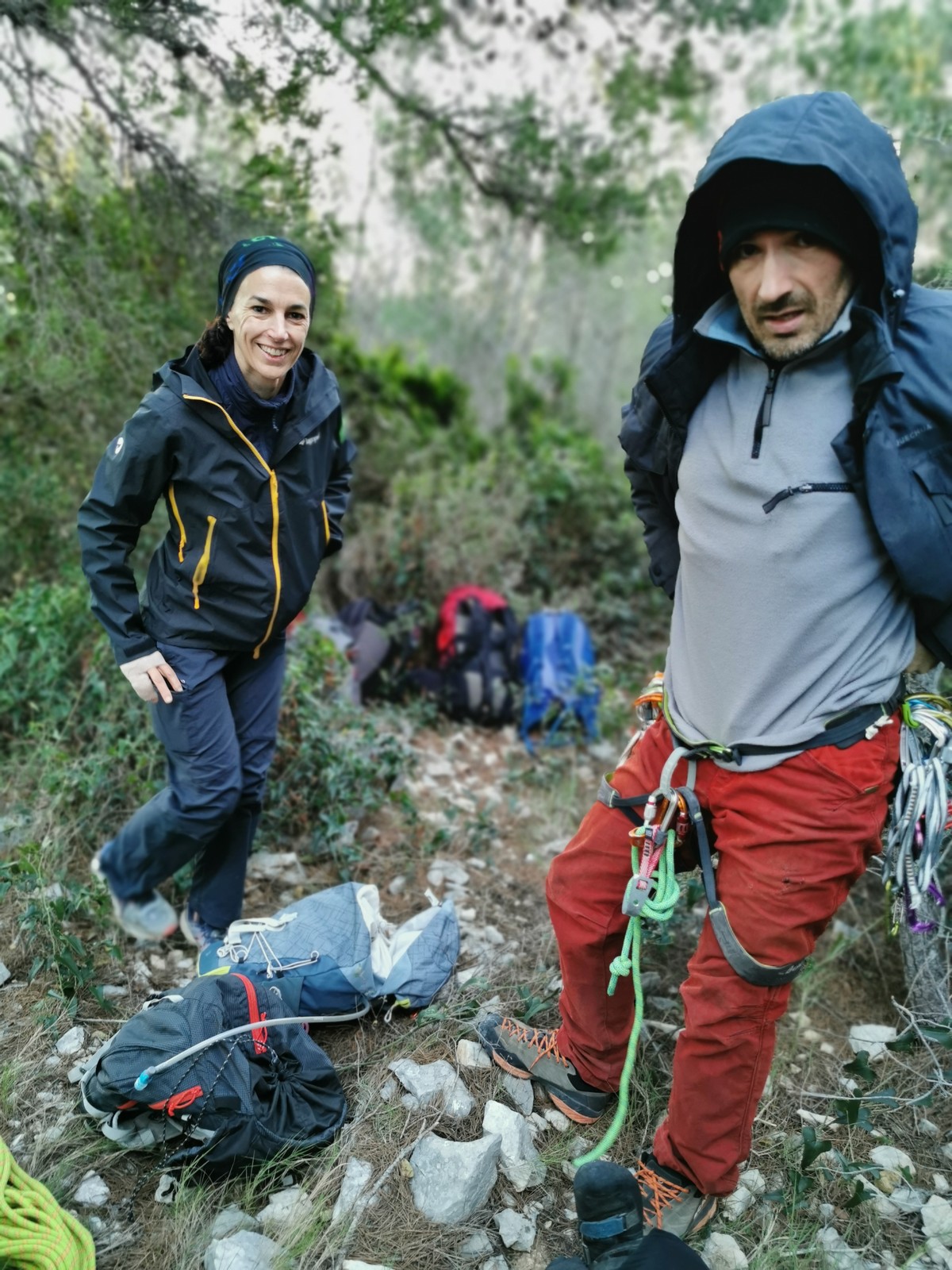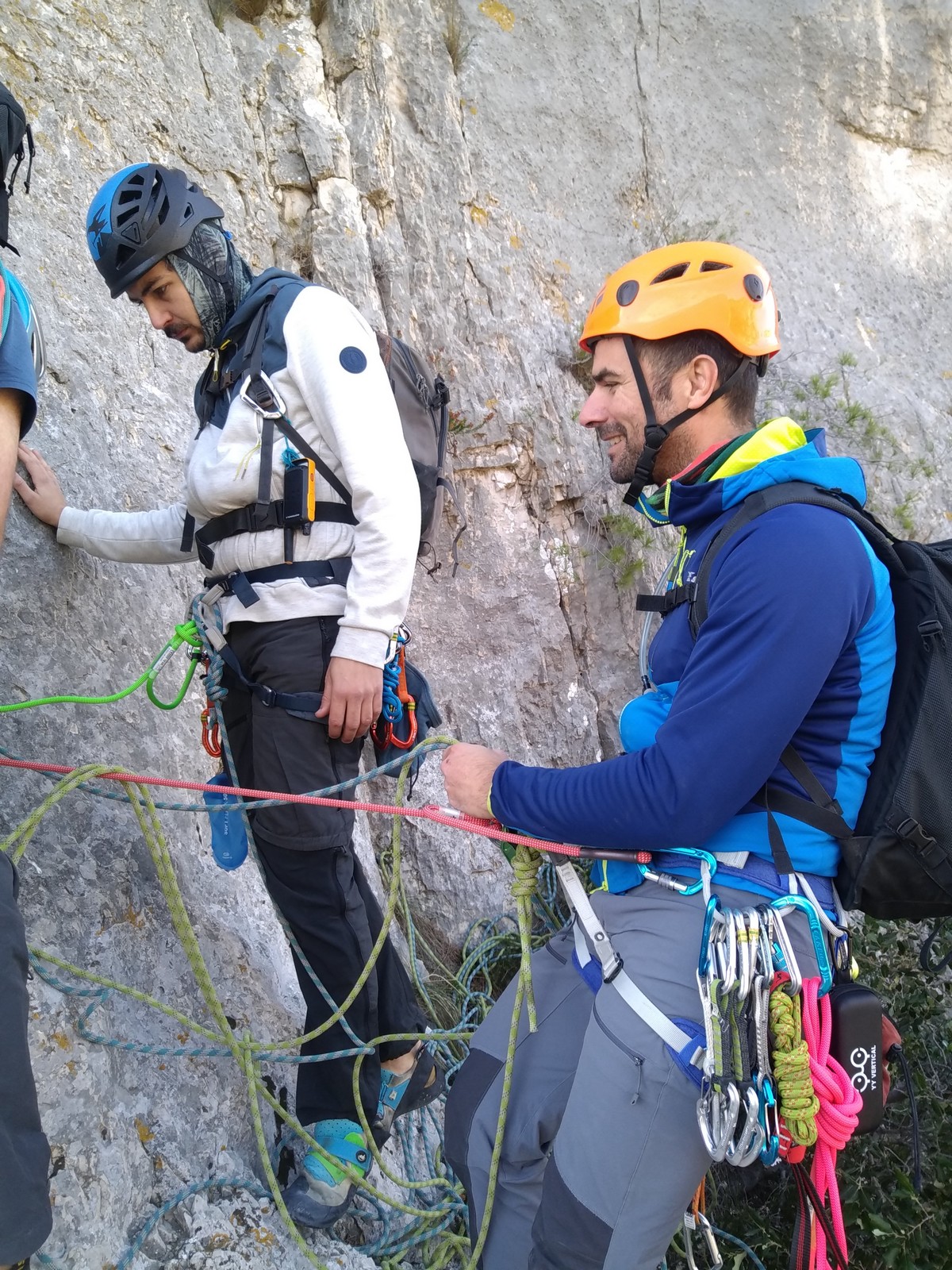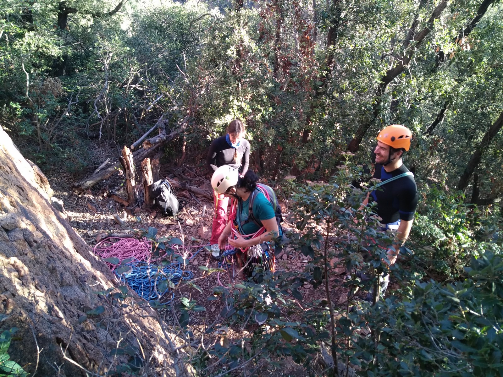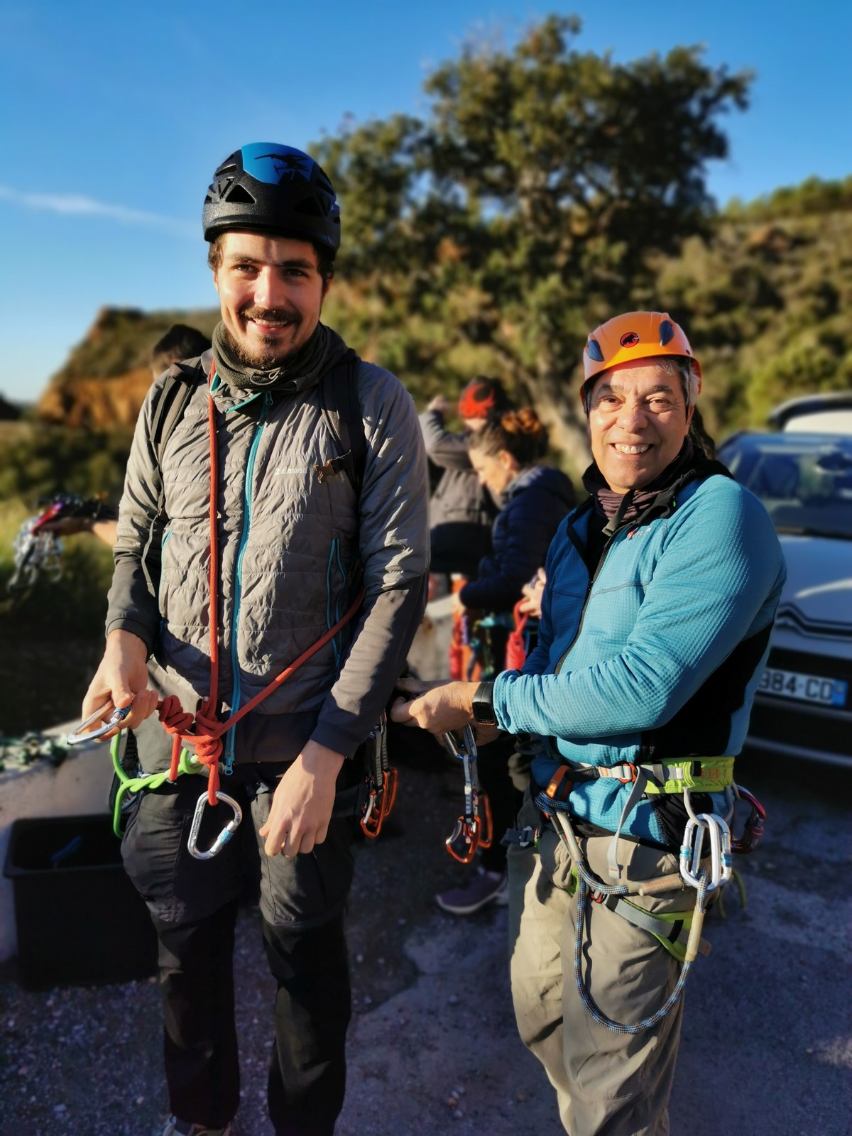 – Quelques dizaines de mètres à droite se trouve le départ de « Où sont passés les schtroumpfs ? » où deux cordées se préparent avec l’attirail de terrain d’aventure. La voie est parfaite pour l’inititiation au TA et ce sont Djé et Laura qui attaquent. Je m’encorde avec eux pour guider Sandrine qui pose avec un plaisir enfantin ses premières protections, assurée par Dounia et Gautier.