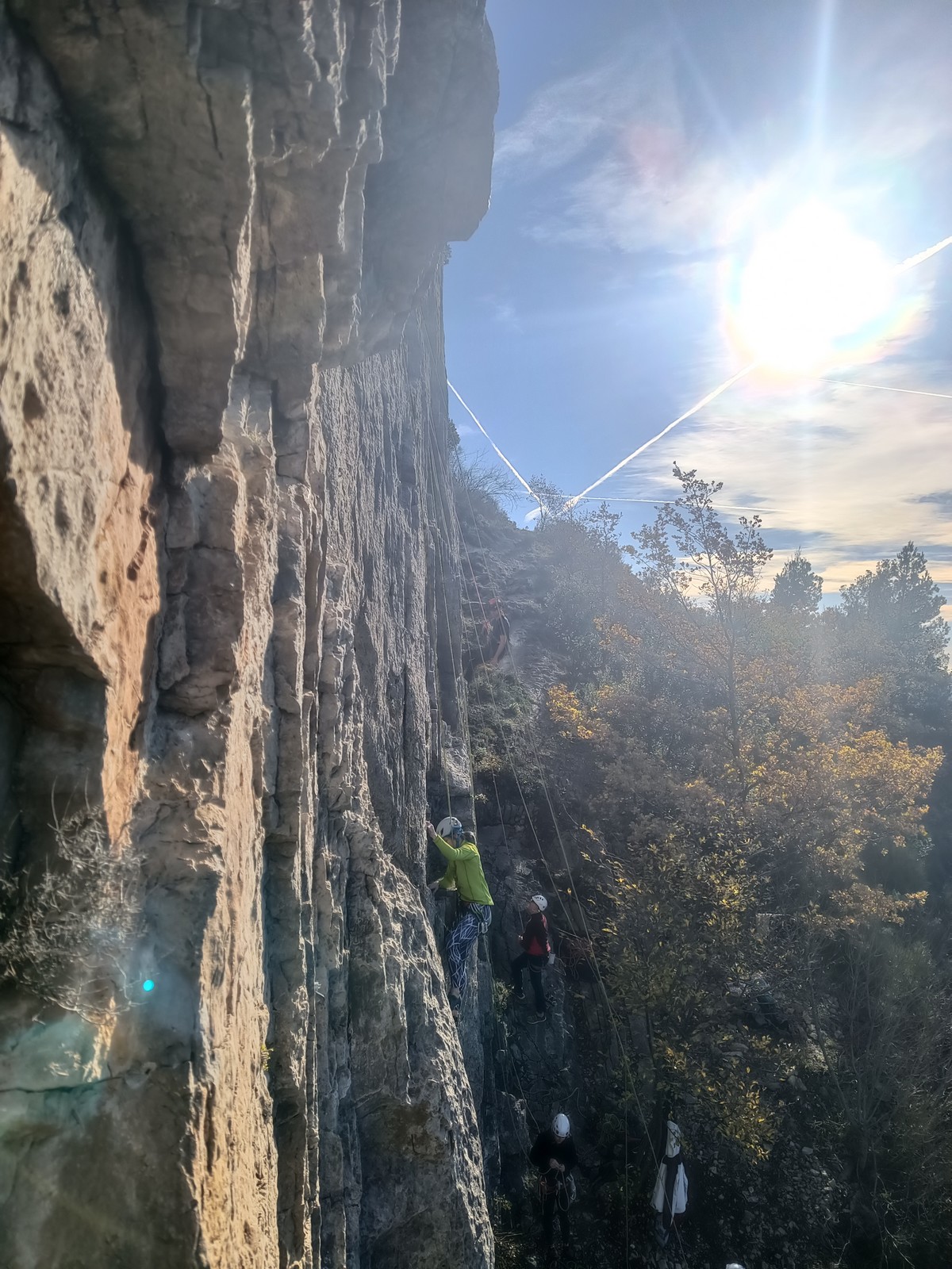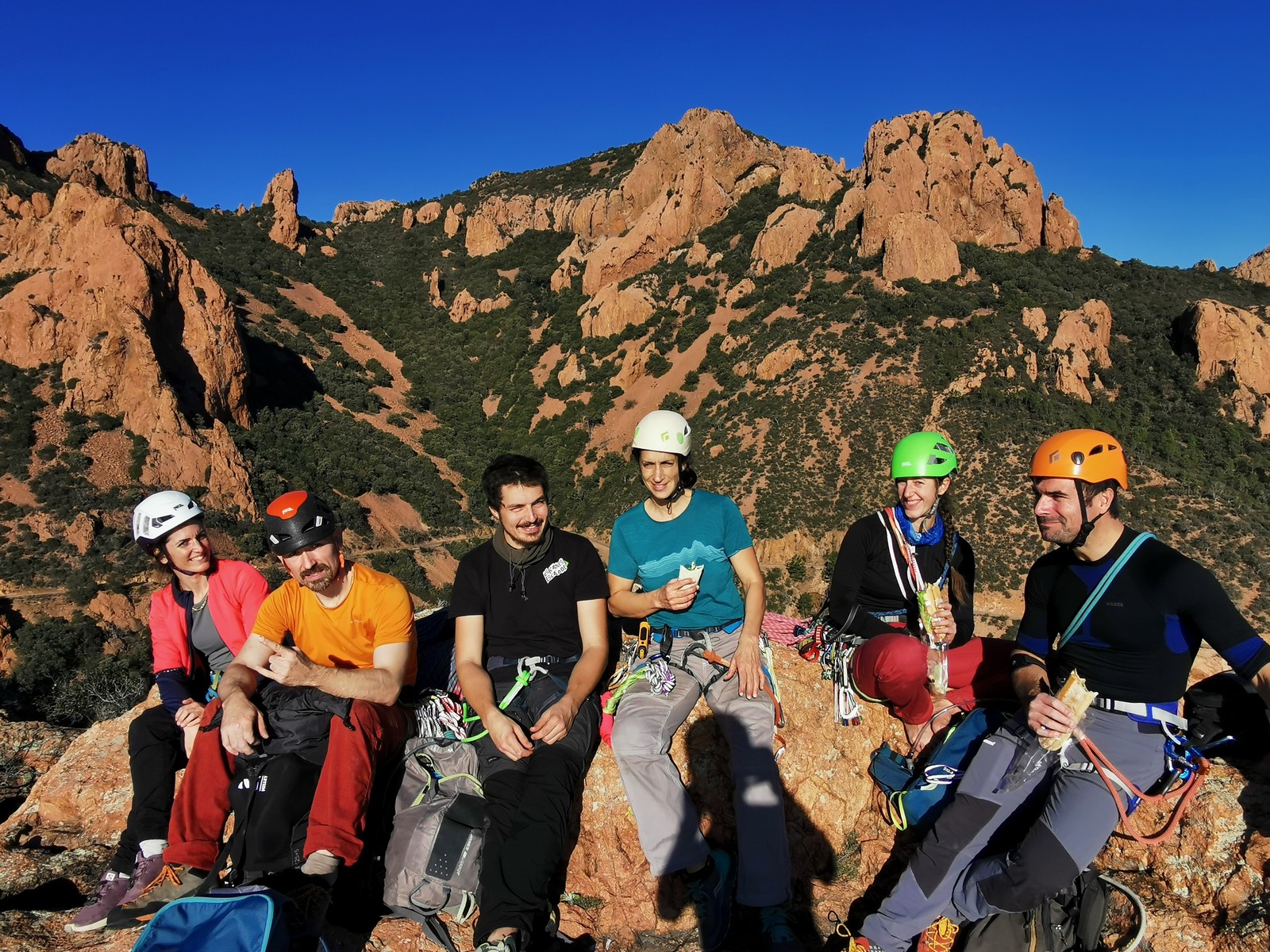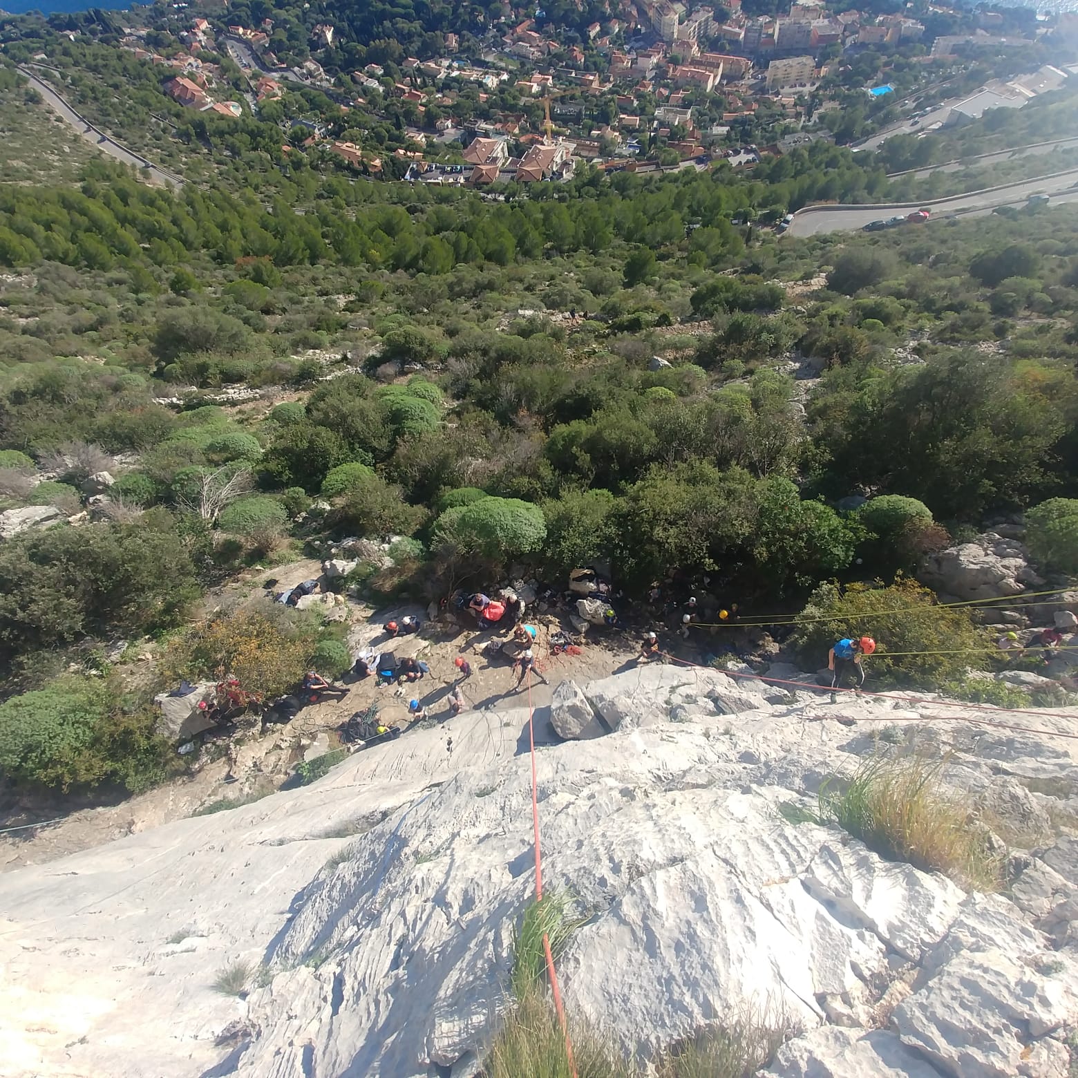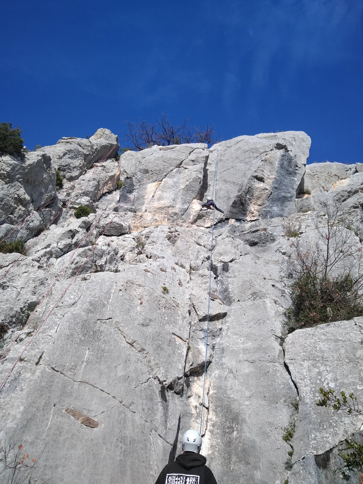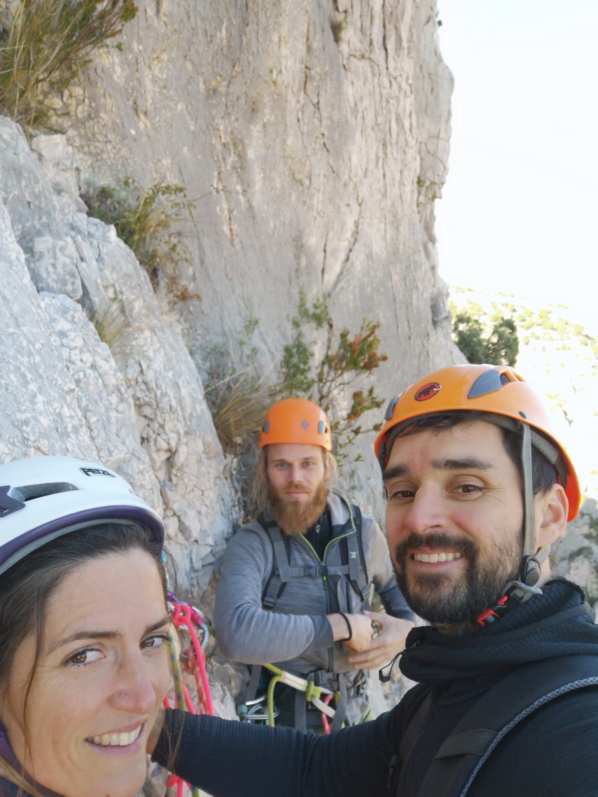 Chez nous, un petit rappel de 20m en pleine voie nous permet de rejoindre la cordée de Cécile qui termine dans une jolie longueur en TA. Je sors le second et monte voir comment ça se passe pour Djé, Sandrine et Saliha qui sortent également. Il est un peu plus de midi, on est pas mal ! Julien arrive peu après et organise son premier relais. Rapidement, il ne reste plus que la cordée de Xavier sur la paroi. Je garde le contact radio tandis que nous nous réchauffons au soleil sur le plateau de Castelvieil et cassons la croûte. Stéphanie a sorti un 5c en tête mais a buté sur le 6a de fin et c’est JP qui a du prendre le relais.