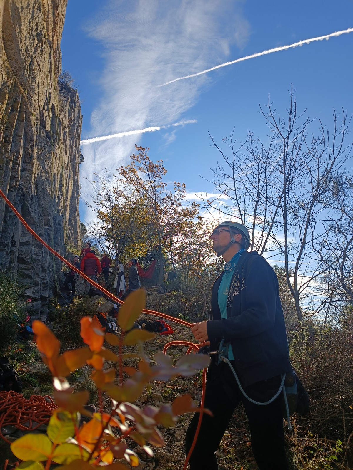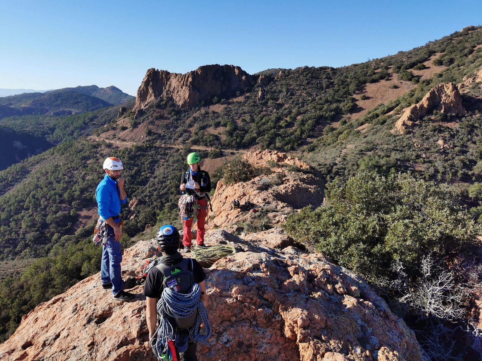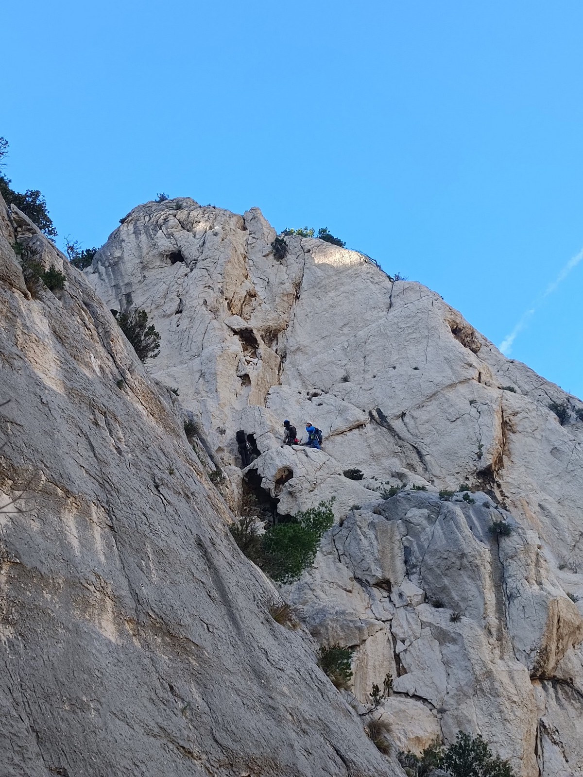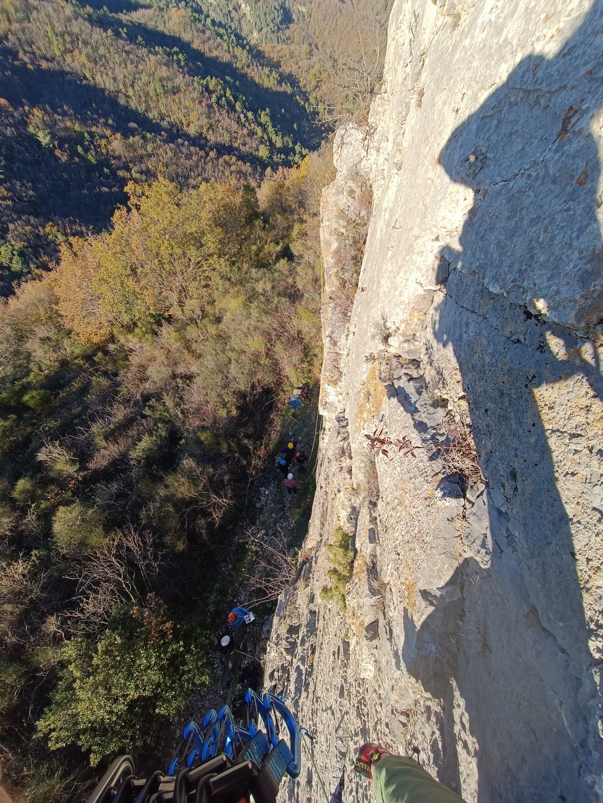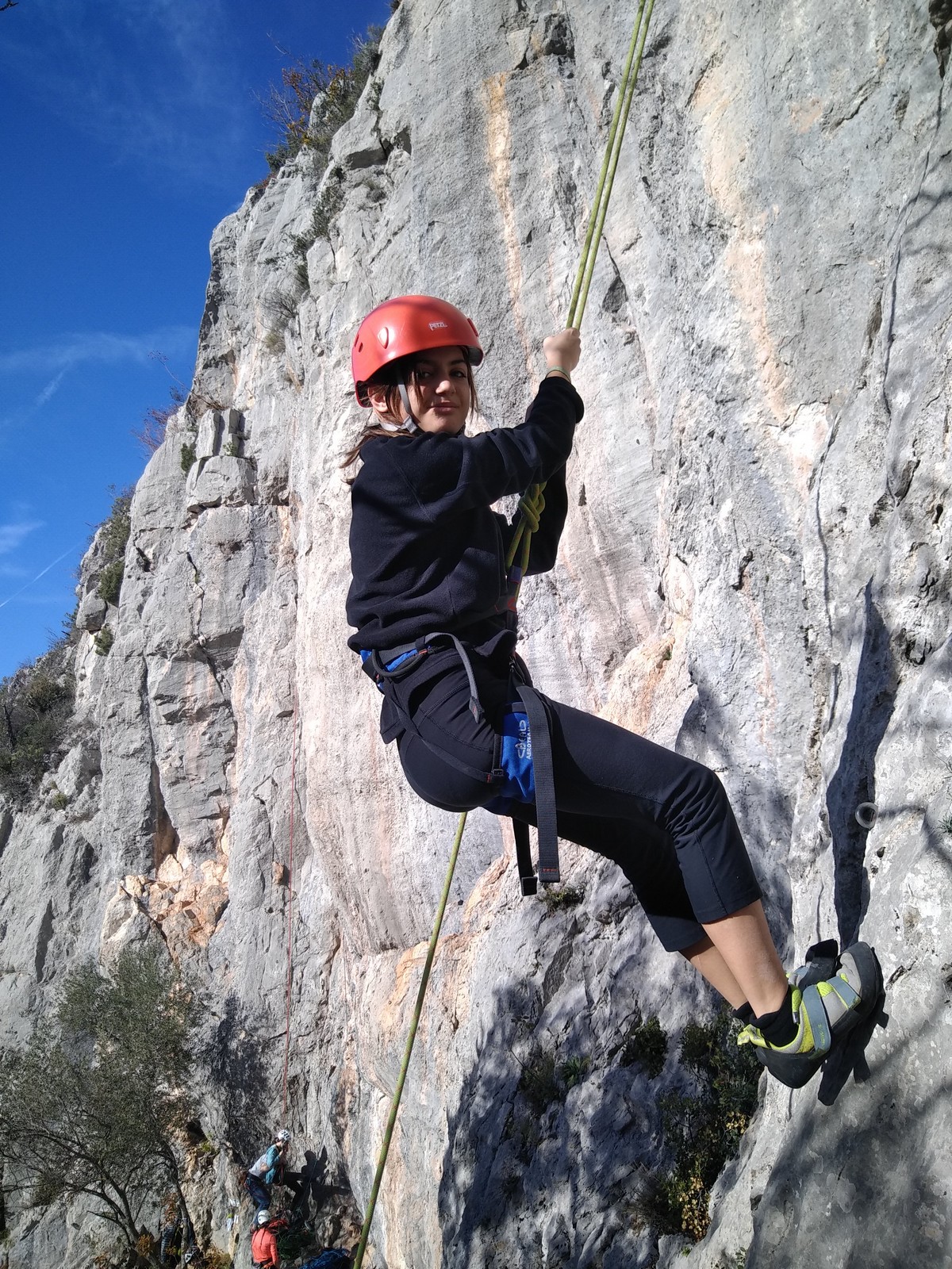 Chez nous, un petit rappel de 20m en pleine voie nous permet de rejoindre la cordée de Cécile qui termine dans une jolie longueur en TA. Je sors le second et monte voir comment ça se passe pour Djé, Sandrine et Saliha qui sortent également. Il est un peu plus de midi, on est pas mal ! Julien arrive peu après et organise son premier relais. Rapidement, il ne reste plus que la cordée de Xavier sur la paroi. Je garde le contact radio tandis que nous nous réchauffons au soleil sur le plateau de Castelvieil et cassons la croûte. Stéphanie a sorti un 5c en tête mais a buté sur le 6a de fin et c’est JP qui a du prendre le relais.
