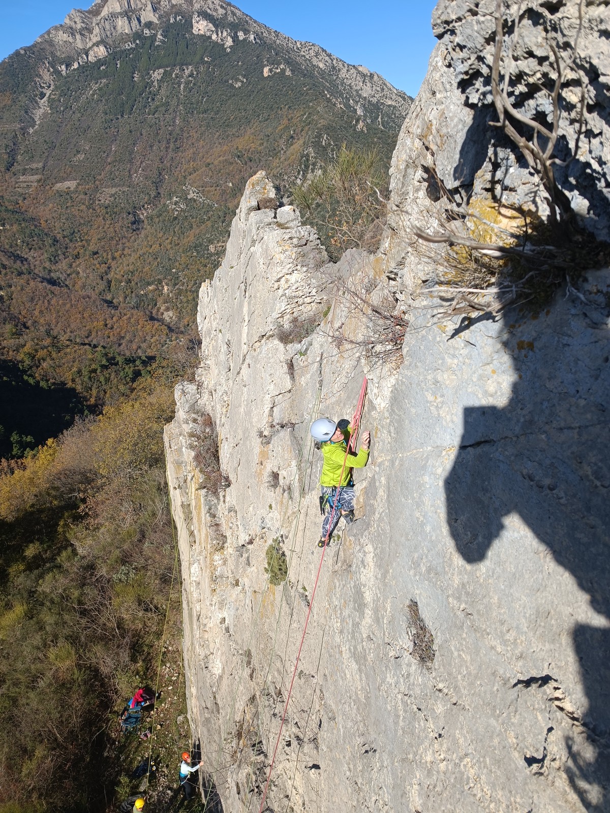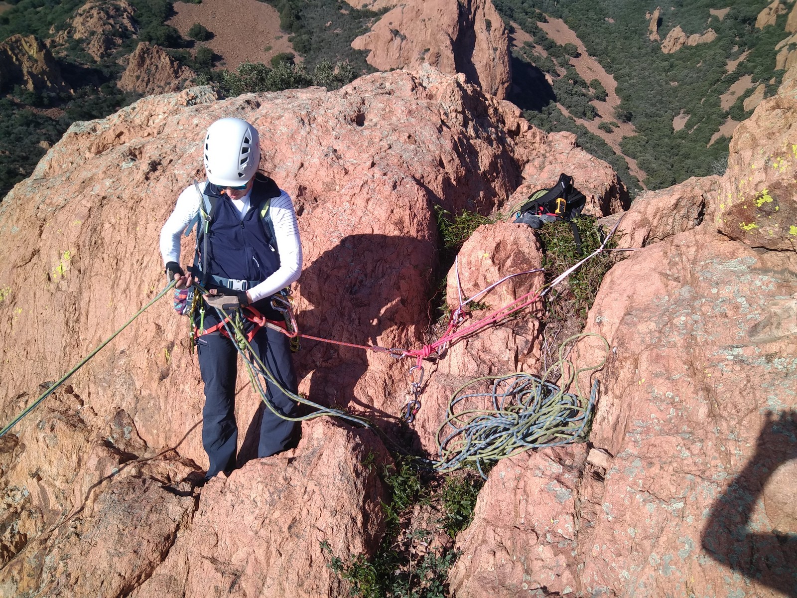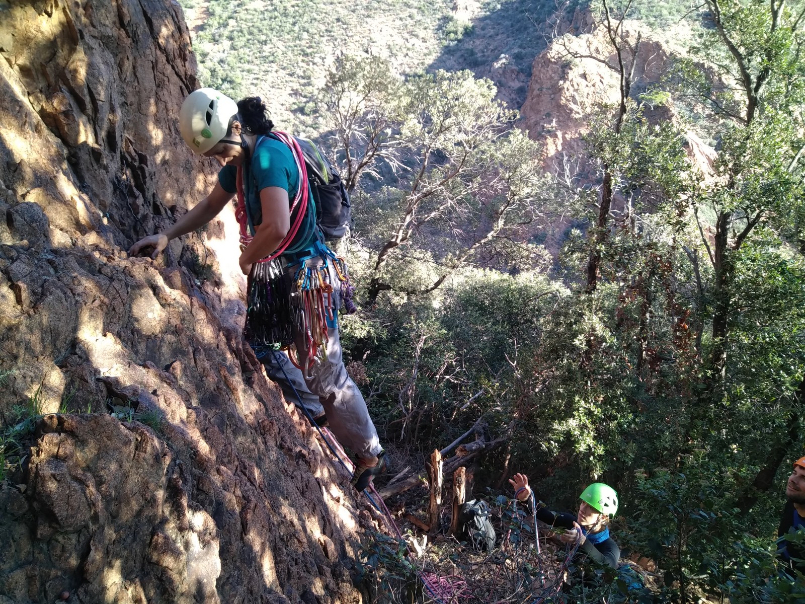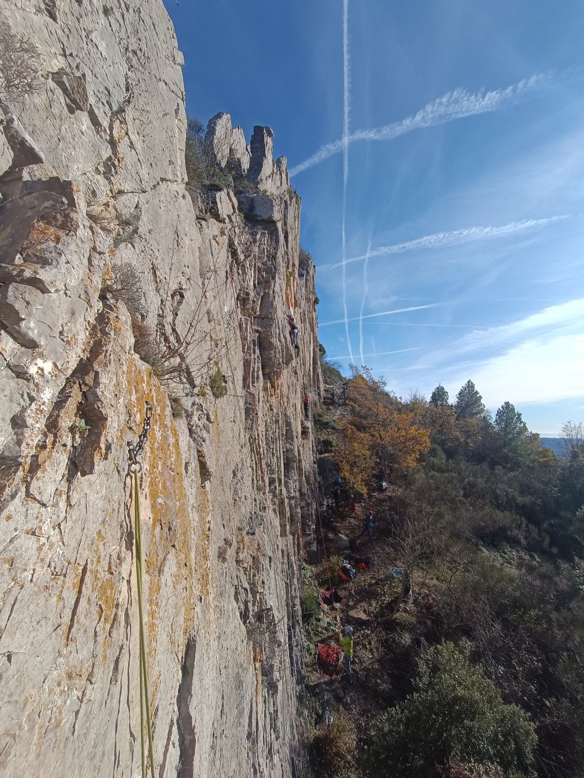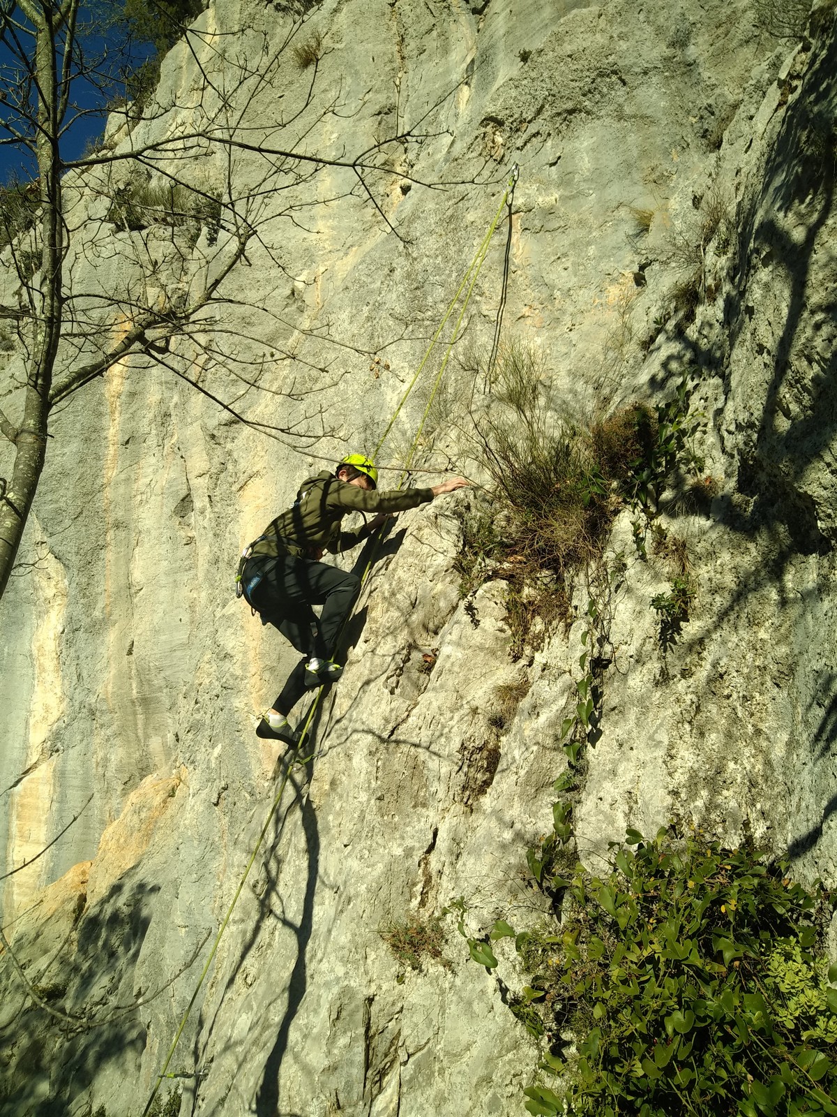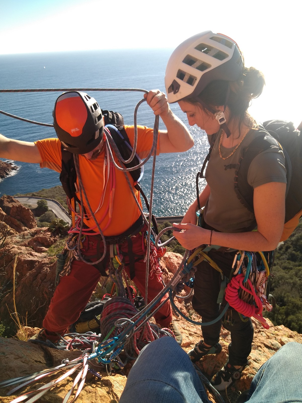 Chez nous, un petit rappel de 20m en pleine voie nous permet de rejoindre la cordée de Cécile qui termine dans une jolie longueur en TA. Je sors le second et monte voir comment ça se passe pour Djé, Sandrine et Saliha qui sortent également. Il est un peu plus de midi, on est pas mal ! Julien arrive peu après et organise son premier relais. Rapidement, il ne reste plus que la cordée de Xavier sur la paroi. Je garde le contact radio tandis que nous nous réchauffons au soleil sur le plateau de Castelvieil et cassons la croûte. Stéphanie a sorti un 5c en tête mais a buté sur le 6a de fin et c’est JP qui a du prendre le relais.