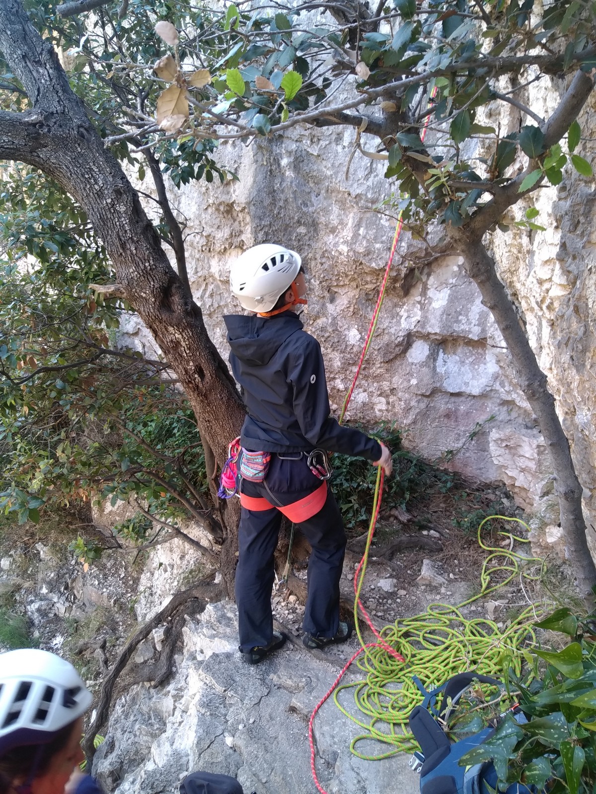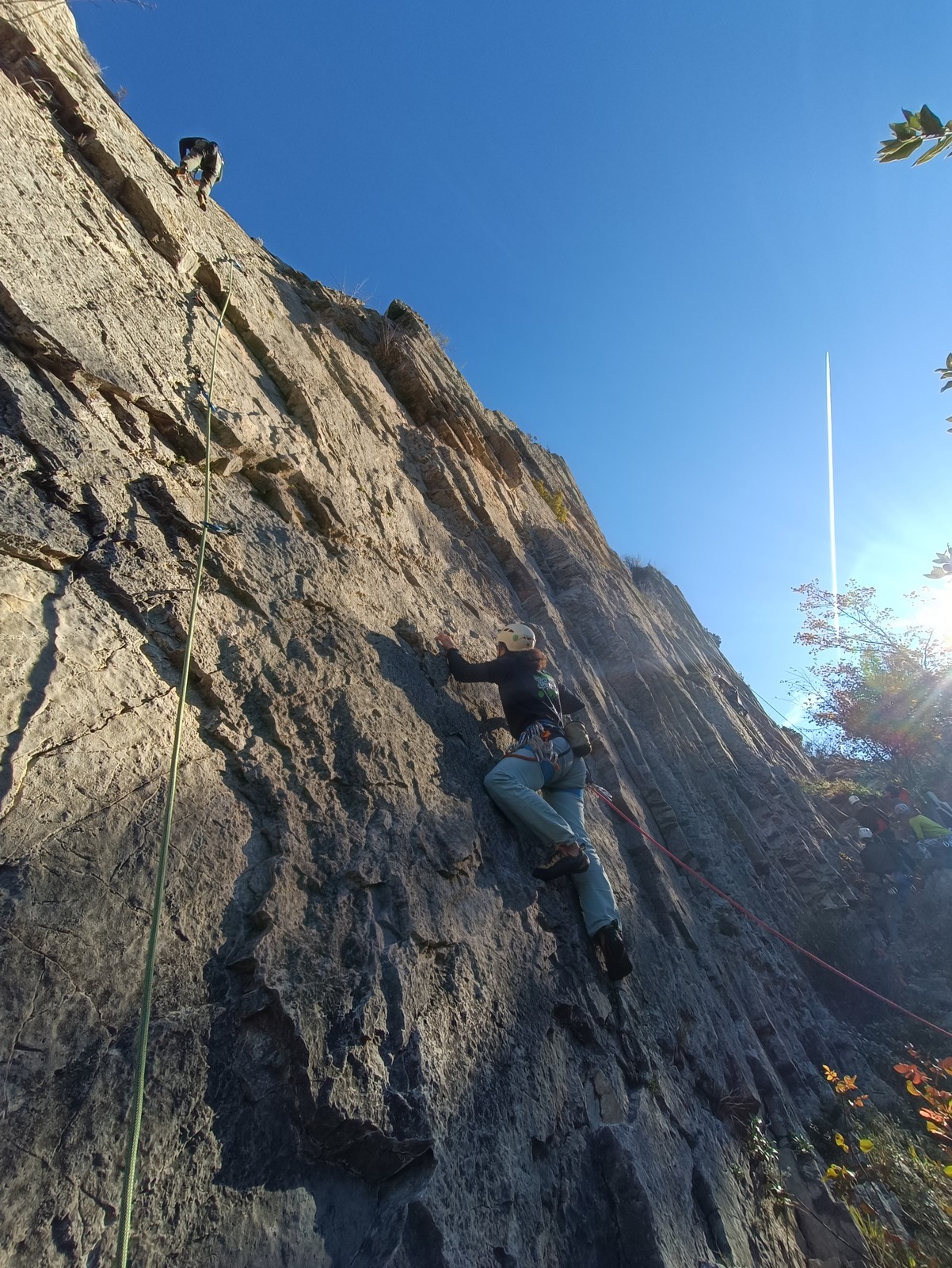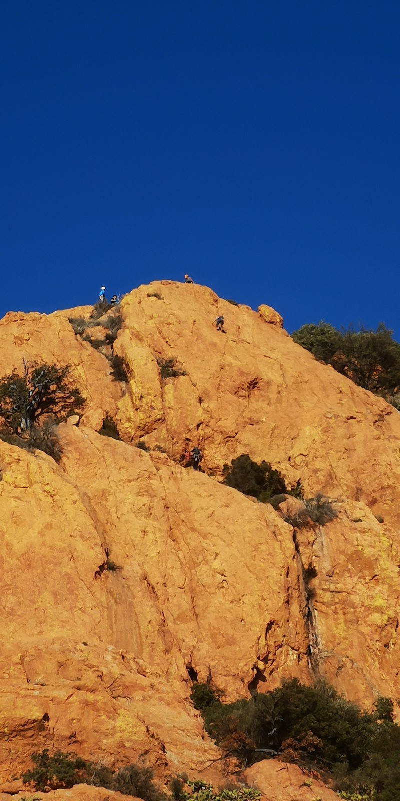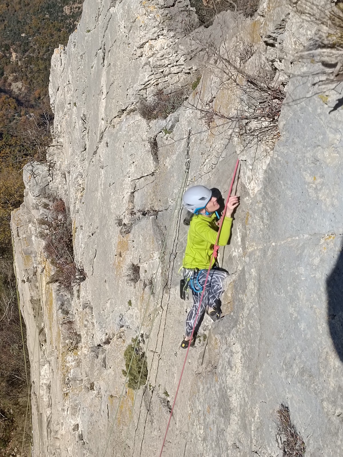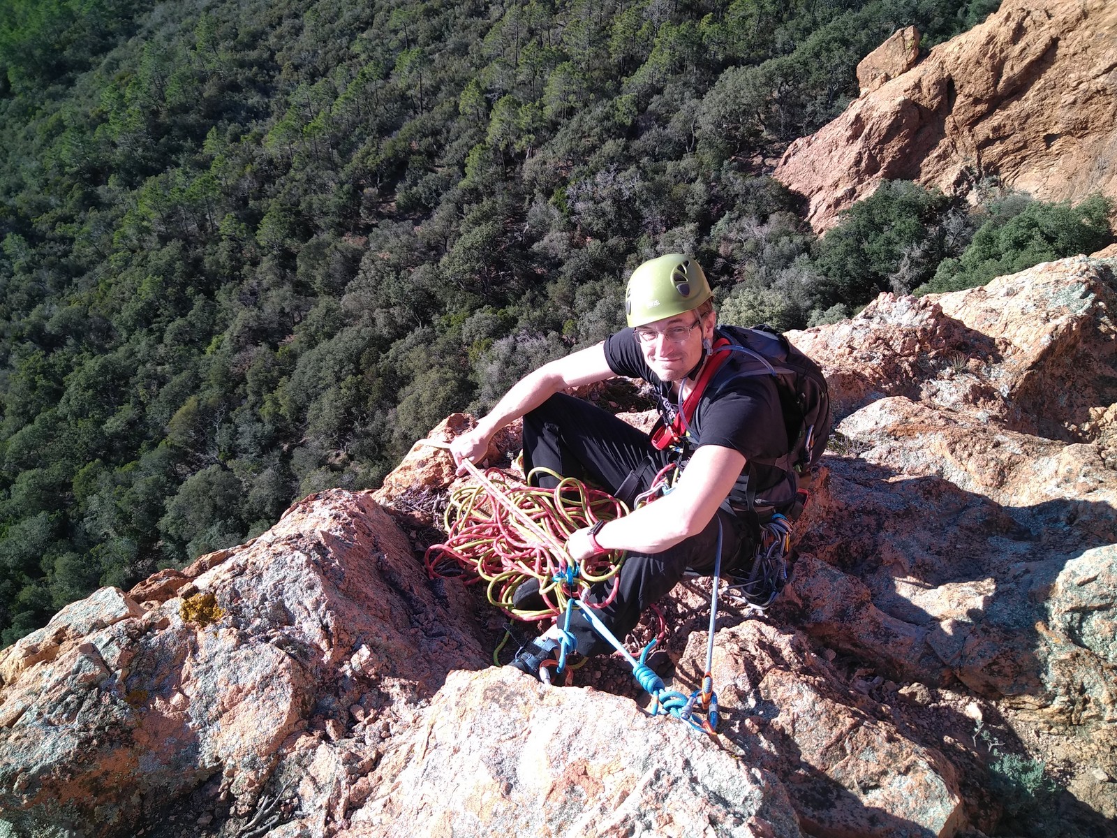 Chez nous, un petit rappel de 20m en pleine voie nous permet de rejoindre la cordée de Cécile qui termine dans une jolie longueur en TA. Je sors le second et monte voir comment ça se passe pour Djé, Sandrine et Saliha qui sortent également. Il est un peu plus de midi, on est pas mal ! Julien arrive peu après et organise son premier relais. Rapidement, il ne reste plus que la cordée de Xavier sur la paroi. Je garde le contact radio tandis que nous nous réchauffons au soleil sur le plateau de Castelvieil et cassons la croûte. Stéphanie a sorti un 5c en tête mais a buté sur le 6a de fin et c’est JP qui a du prendre le relais.
