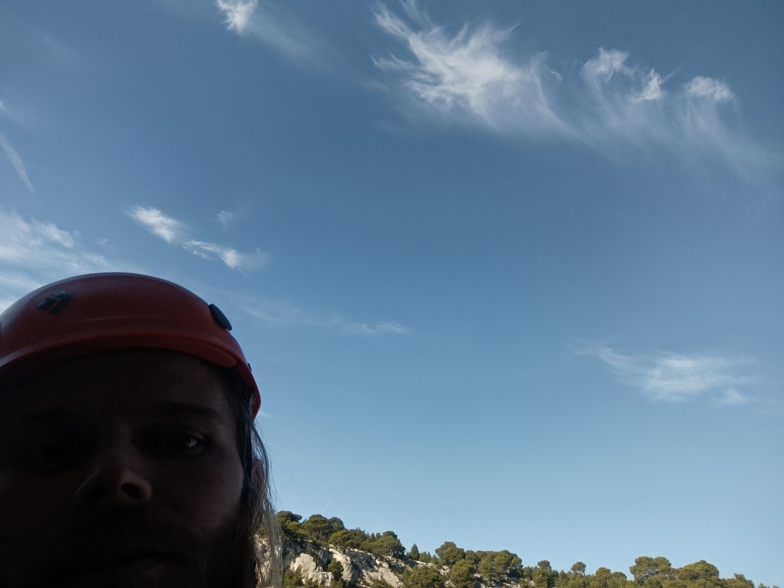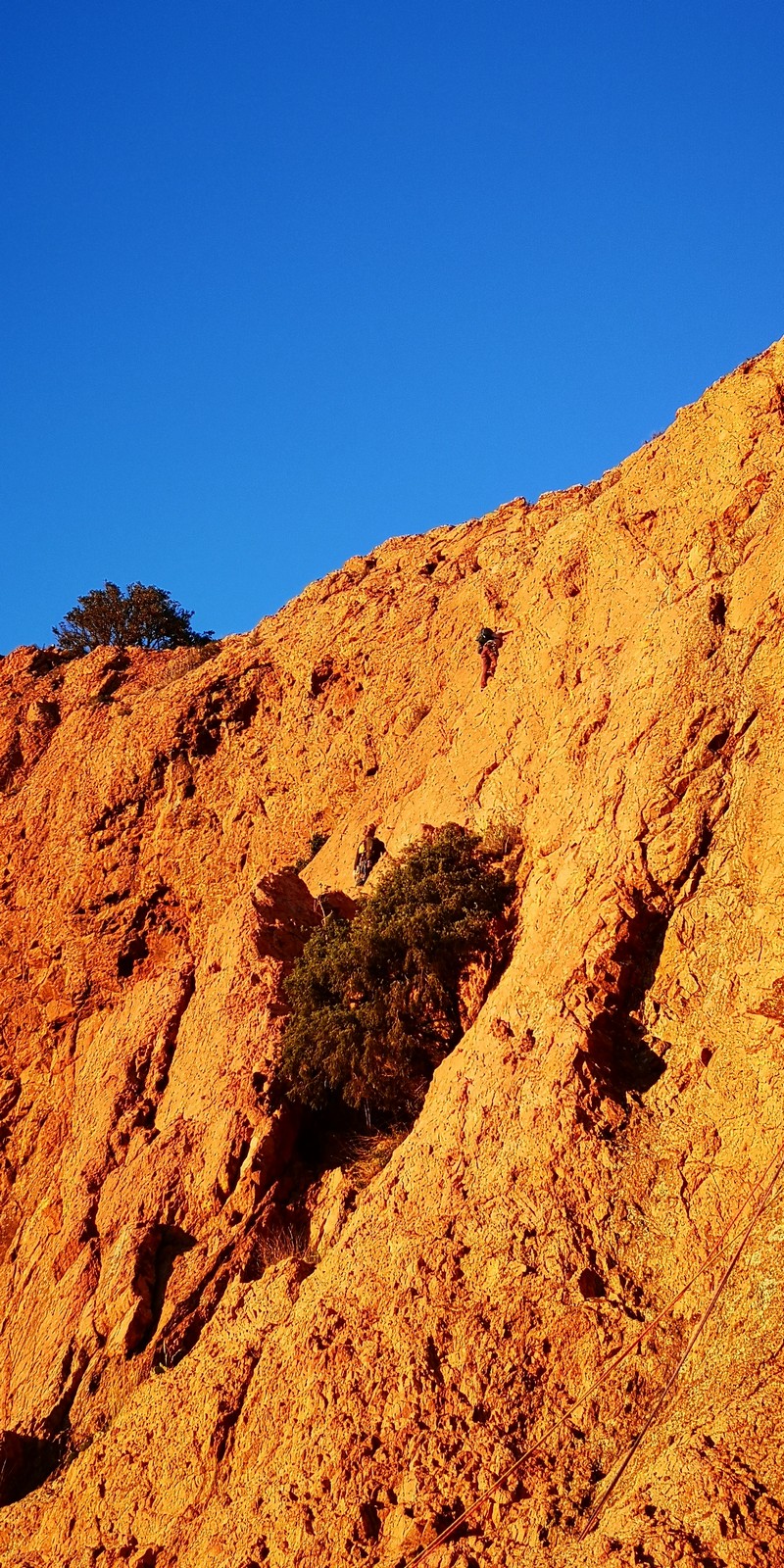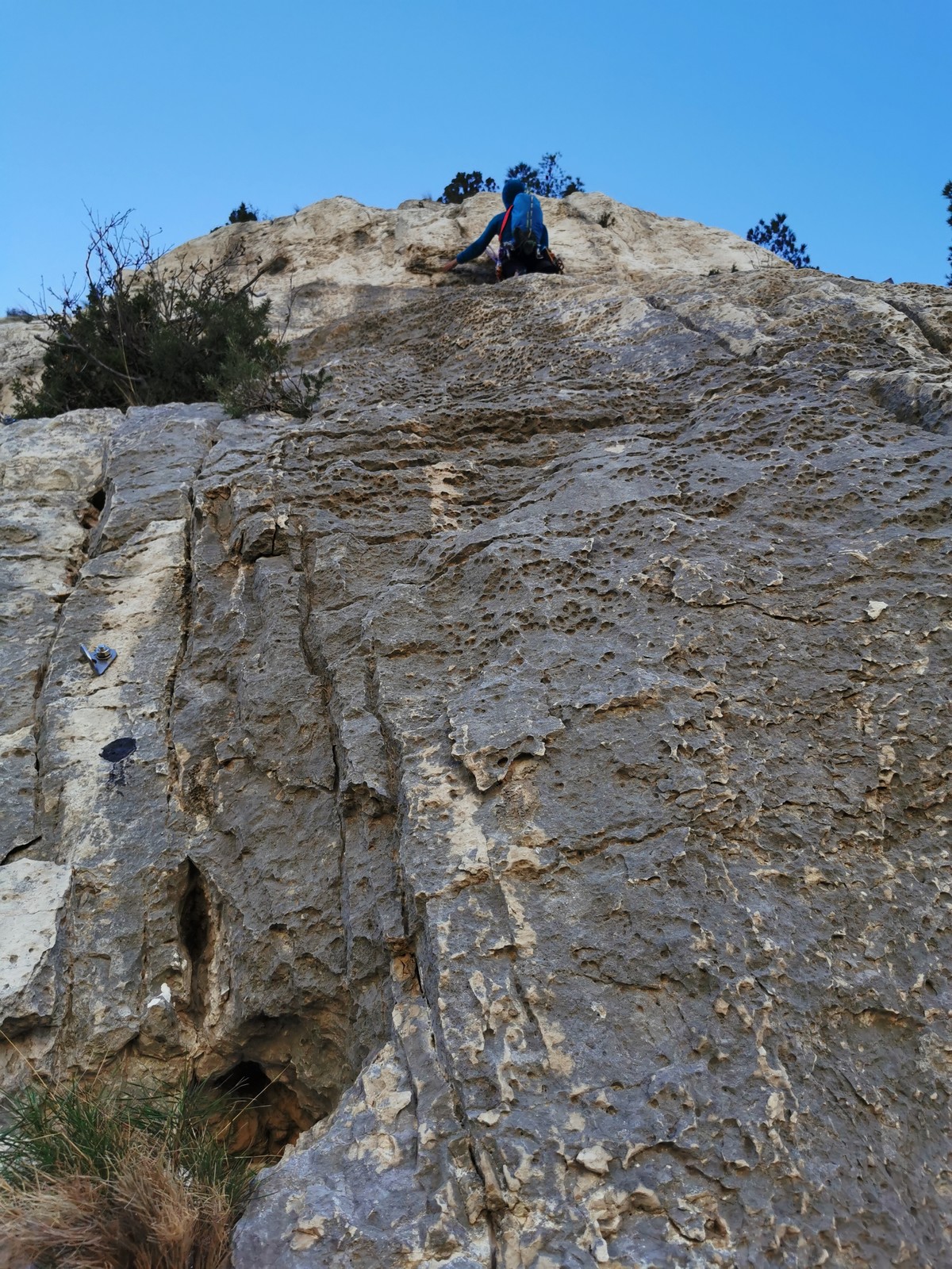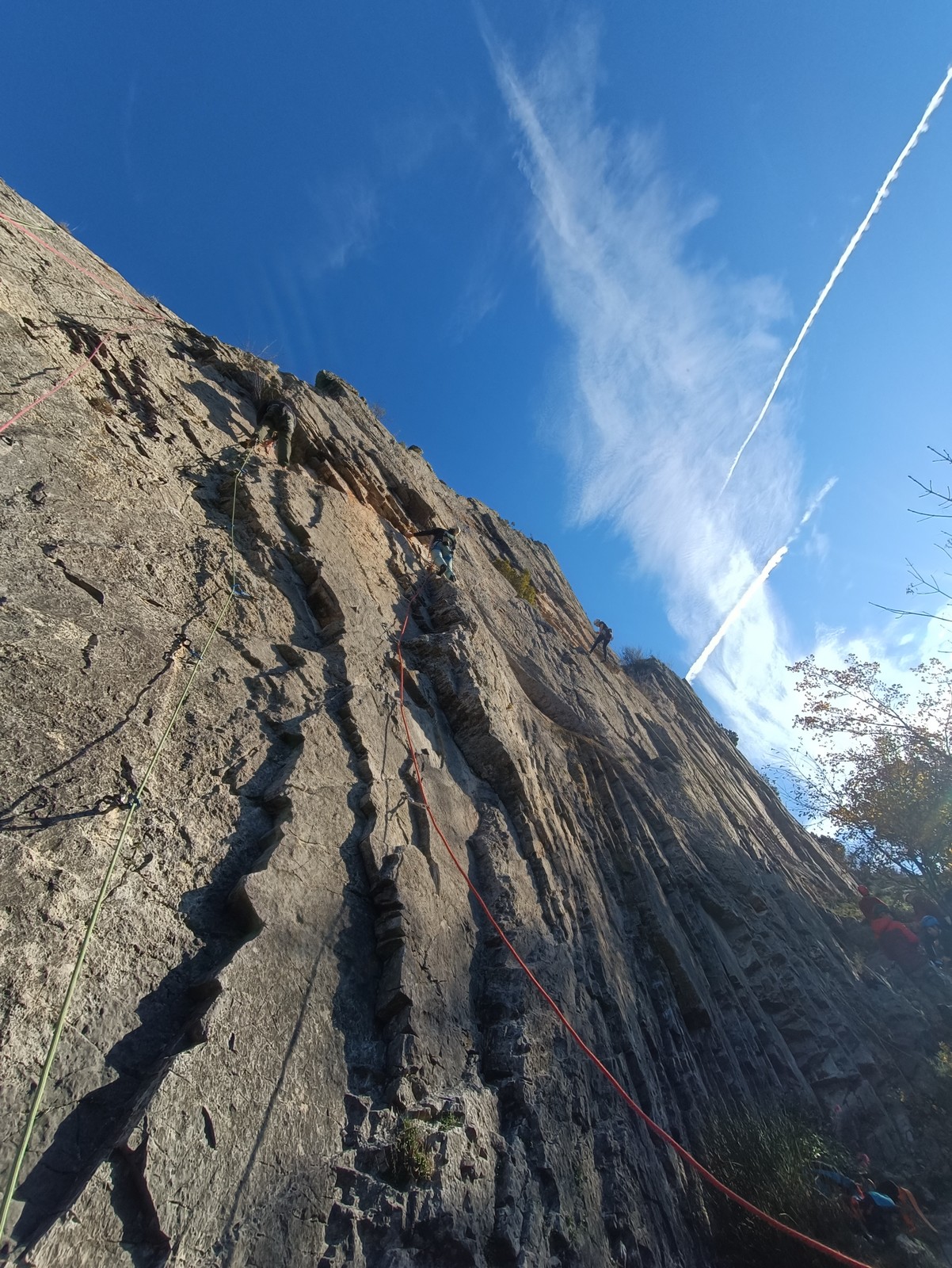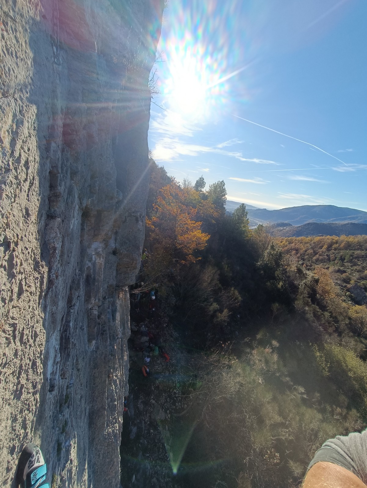 Chez nous, un petit rappel de 20m en pleine voie nous permet de rejoindre la cordée de Cécile qui termine dans une jolie longueur en TA. Je sors le second et monte voir comment ça se passe pour Djé, Sandrine et Saliha qui sortent également. Il est un peu plus de midi, on est pas mal ! Julien arrive peu après et organise son premier relais. Rapidement, il ne reste plus que la cordée de Xavier sur la paroi. Je garde le contact radio tandis que nous nous réchauffons au soleil sur le plateau de Castelvieil et cassons la croûte. Stéphanie a sorti un 5c en tête mais a buté sur le 6a de fin et c’est JP qui a du prendre le relais.