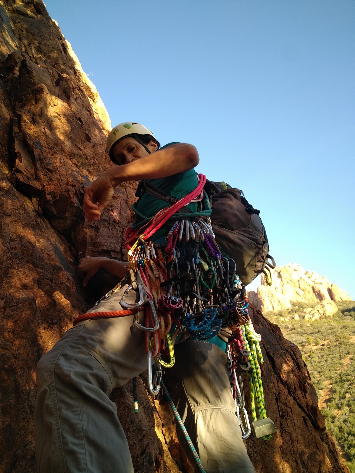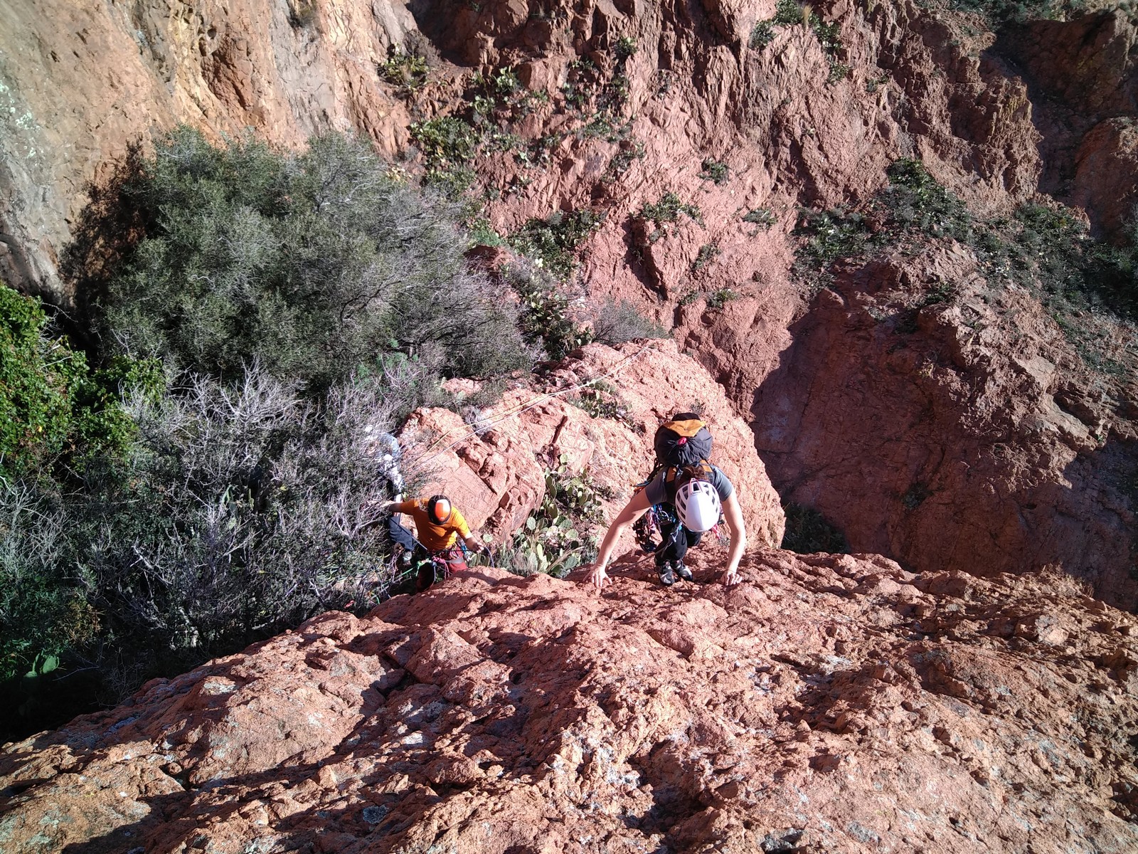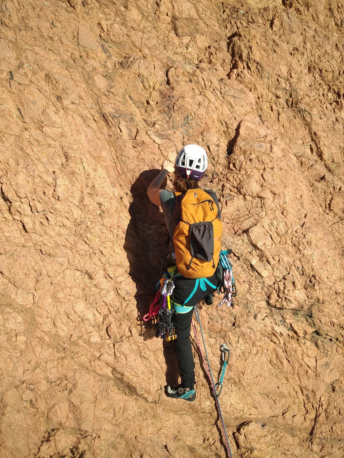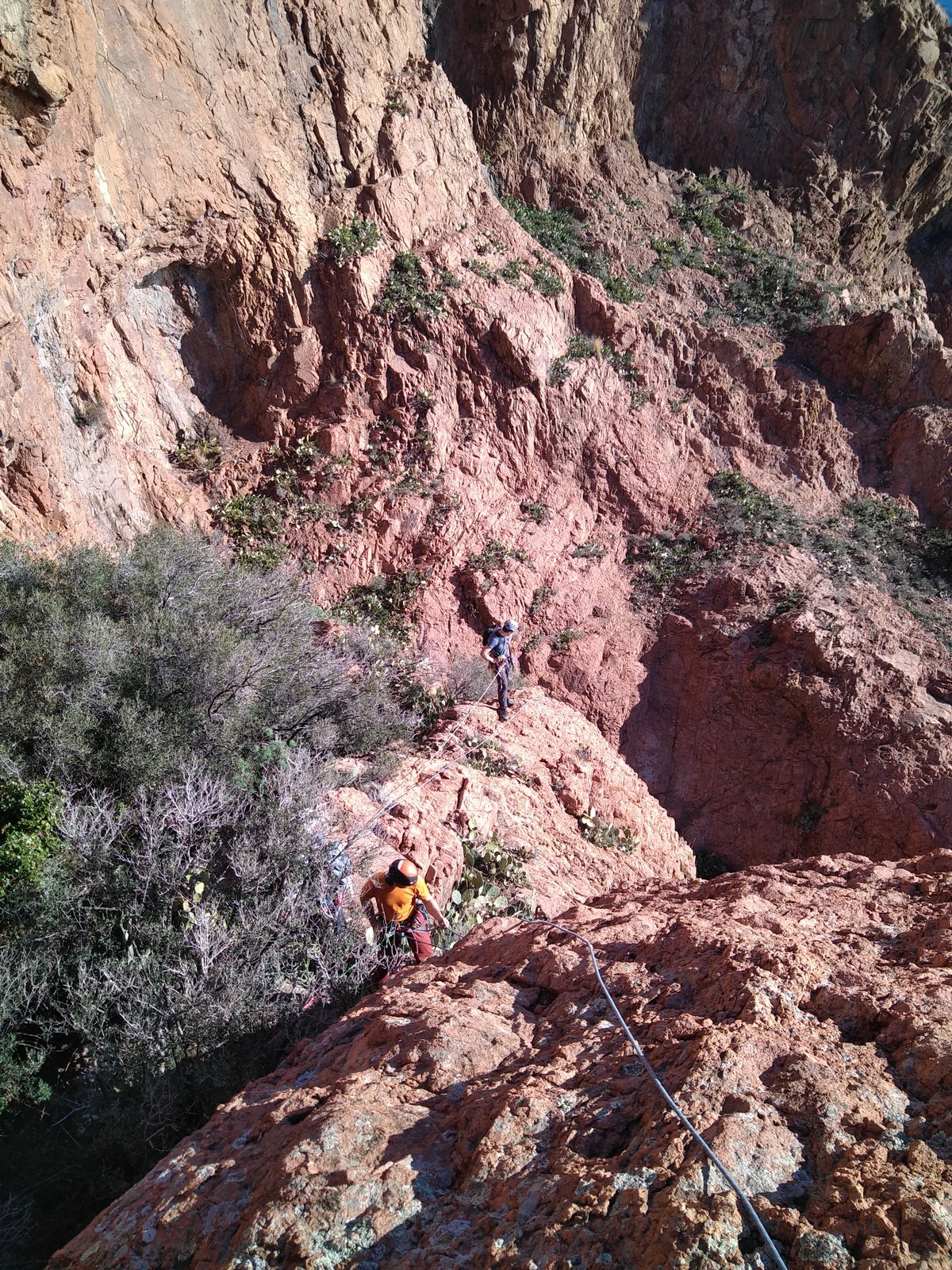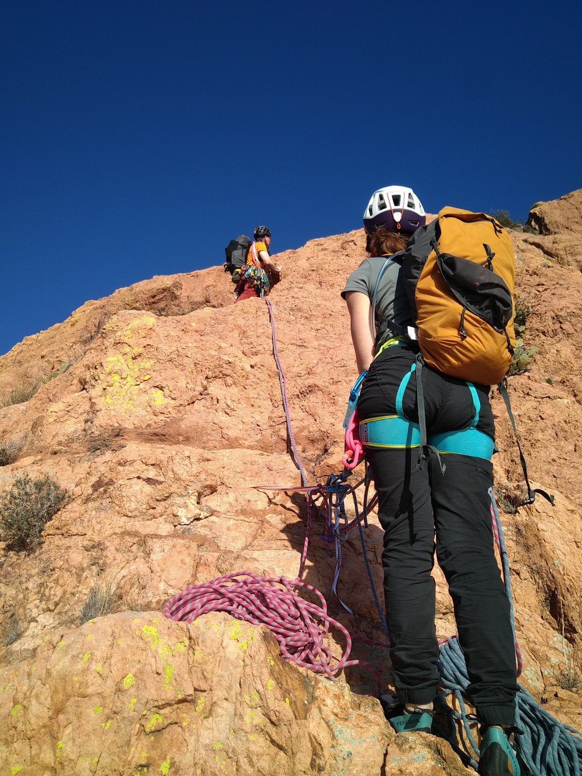 Dans notre voie, on prend le temps mais tout se déroule bien. La consigne, c’est de poser un maximum de friends, câblés et sangles, de tester pour comprendre ce qui marche et ce qui ne marche pas. Si Djé a fait la première longueur, Laura part en tête dans la seconde. Je vais avec elle pour la seconder et construire un beau relais avec becquet coiffé, friend et câblé. Joli ! Dounia part également en tête pour la première fois dans une grande voie, et c’est pour du TA. On construit un relais juste au dessous de celui de Laura. Magnifique. Les longueurs sont très faciles et idéales pour apprendre sans se faire peur. On arrive finalement assez vite à la grande terrasse médiane où on croise ceux qui grimpent dans le tracas.