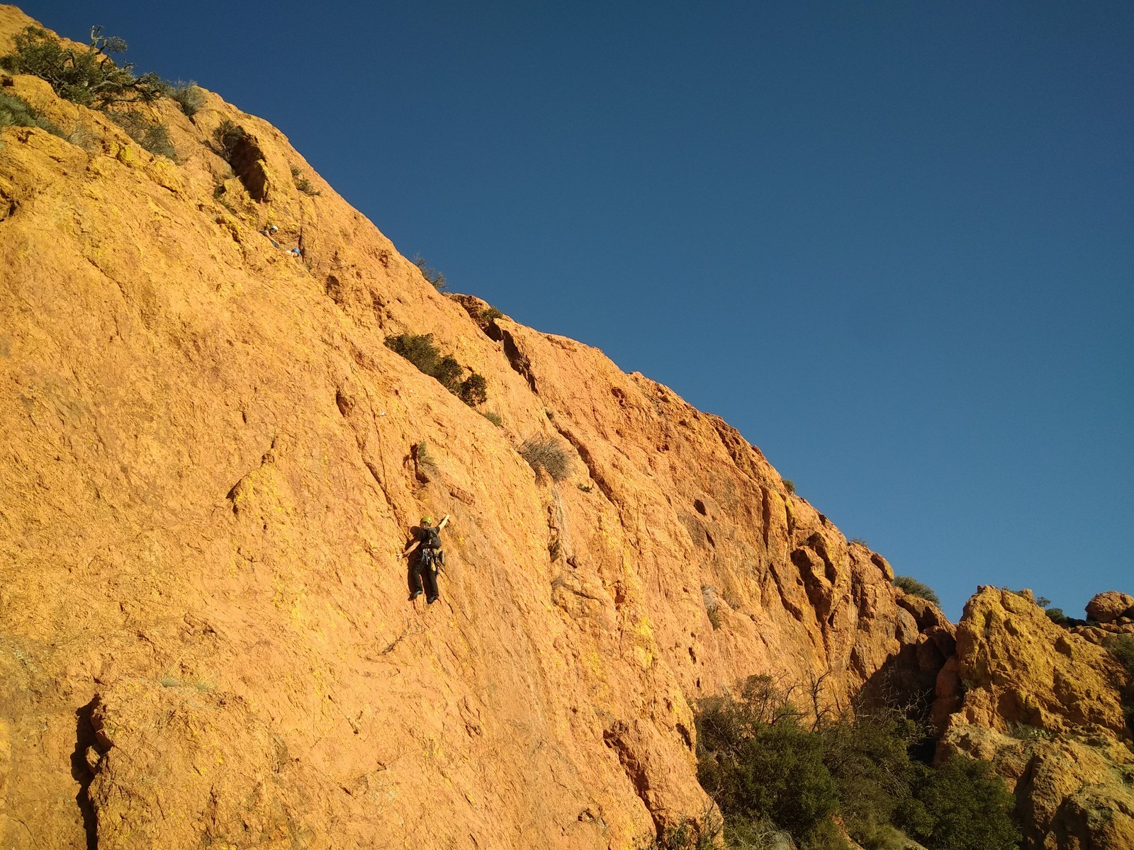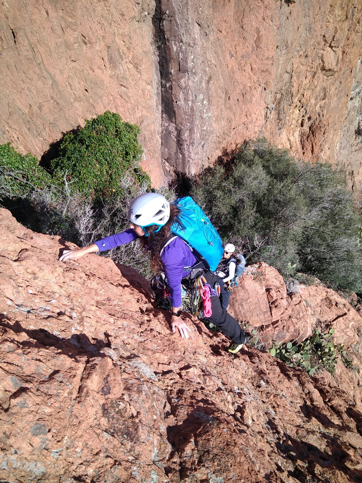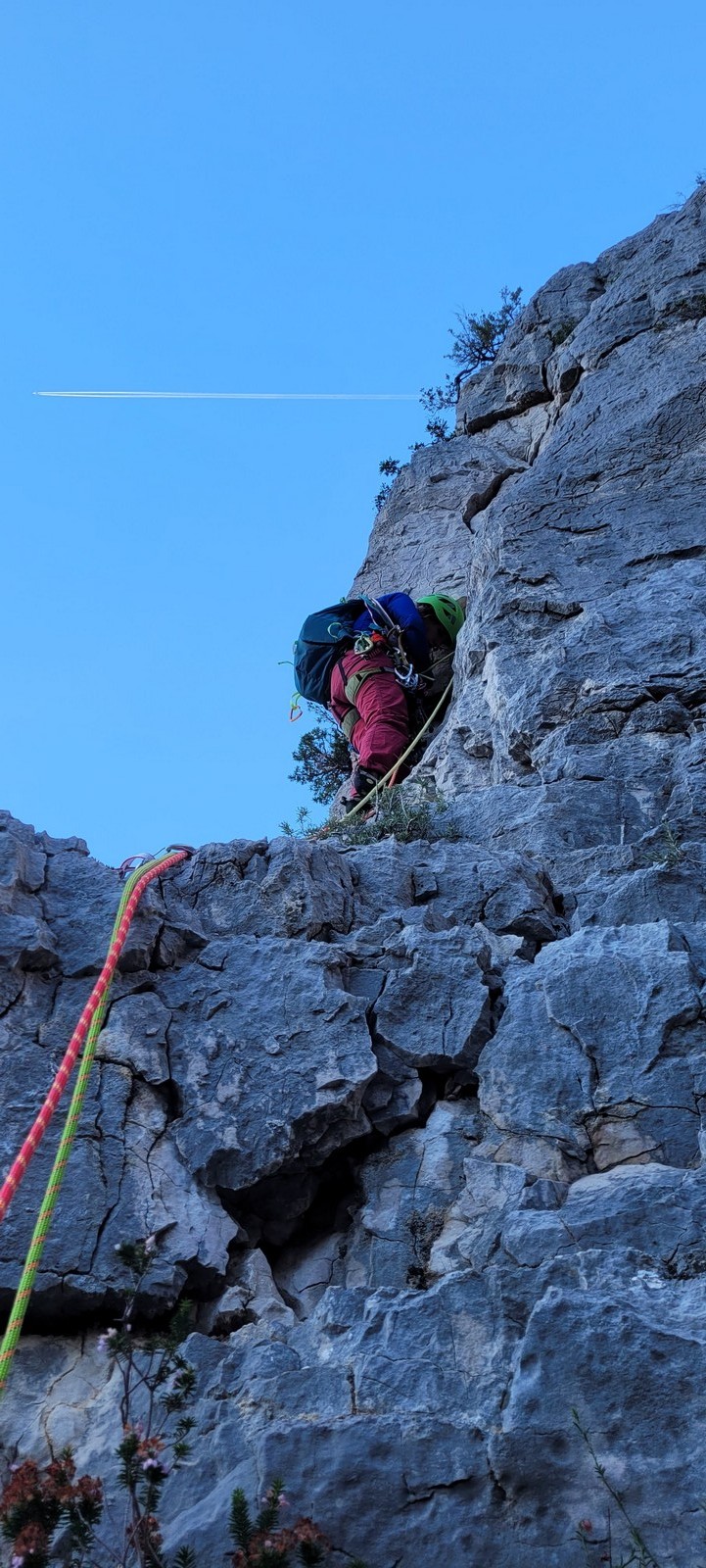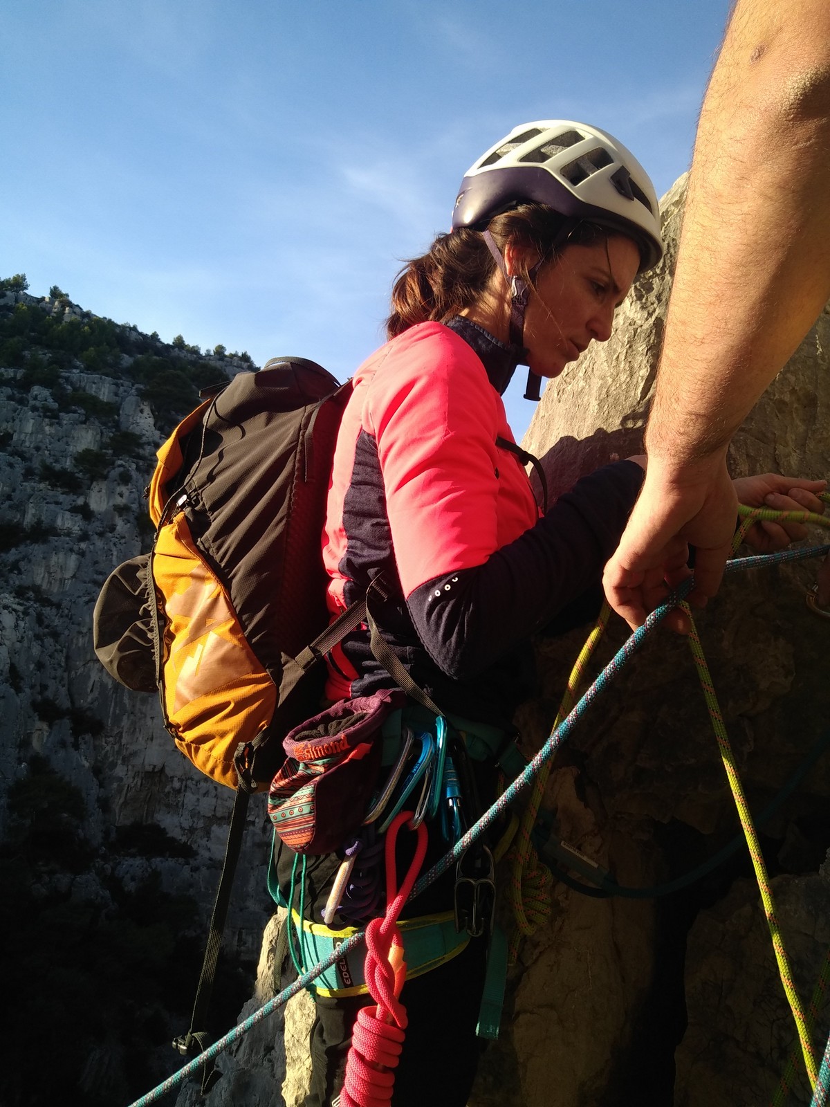 Dans notre voie, on prend le temps mais tout se déroule bien. La consigne, c’est de poser un maximum de friends, câblés et sangles, de tester pour comprendre ce qui marche et ce qui ne marche pas. Si Djé a fait la première longueur, Laura part en tête dans la seconde. Je vais avec elle pour la seconder et construire un beau relais avec becquet coiffé, friend et câblé. Joli ! Dounia part également en tête pour la première fois dans une grande voie, et c’est pour du TA. On construit un relais juste au dessous de celui de Laura. Magnifique. Les longueurs sont très faciles et idéales pour apprendre sans se faire peur. On arrive finalement assez vite à la grande terrasse médiane où on croise ceux qui grimpent dans le tracas.