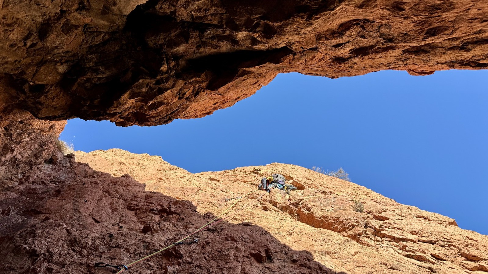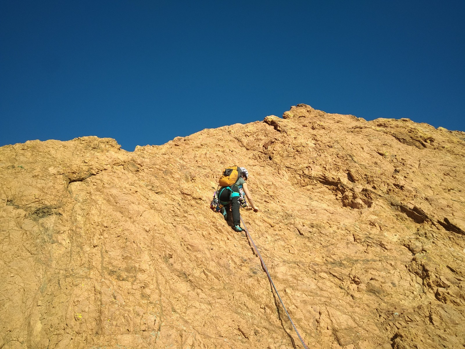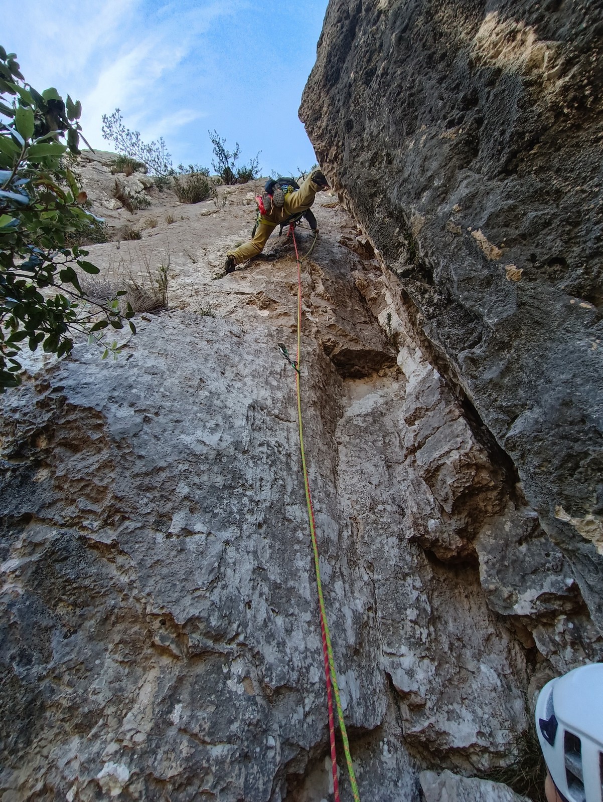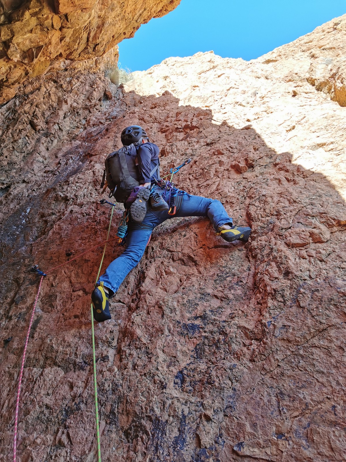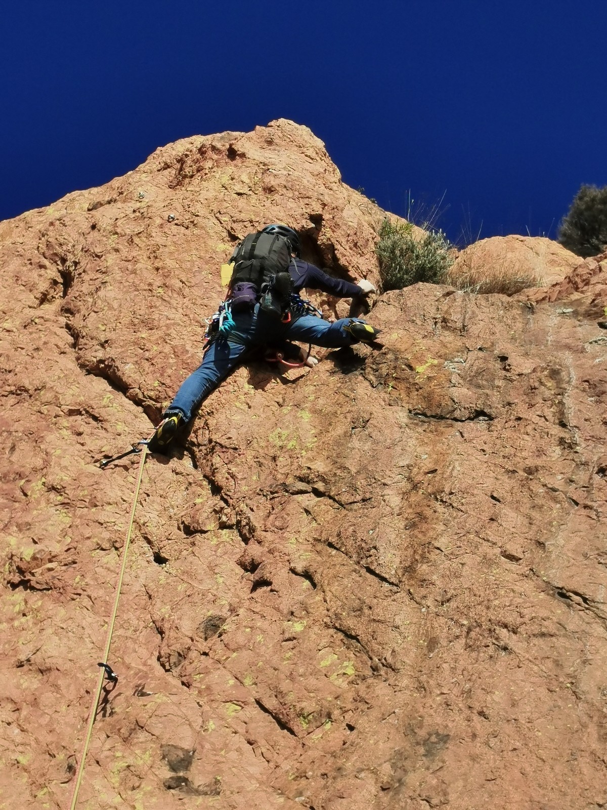 Dans notre voie, on prend le temps mais tout se déroule bien. La consigne, c’est de poser un maximum de friends, câblés et sangles, de tester pour comprendre ce qui marche et ce qui ne marche pas. Si Djé a fait la première longueur, Laura part en tête dans la seconde. Je vais avec elle pour la seconder et construire un beau relais avec becquet coiffé, friend et câblé. Joli ! Dounia part également en tête pour la première fois dans une grande voie, et c’est pour du TA. On construit un relais juste au dessous de celui de Laura. Magnifique. Les longueurs sont très faciles et idéales pour apprendre sans se faire peur. On arrive finalement assez vite à la grande terrasse médiane où on croise ceux qui grimpent dans le tracas.