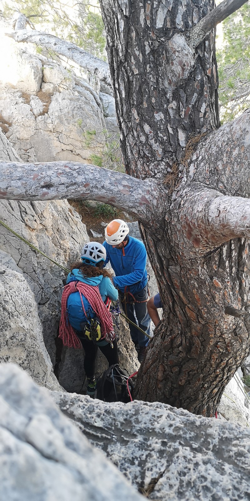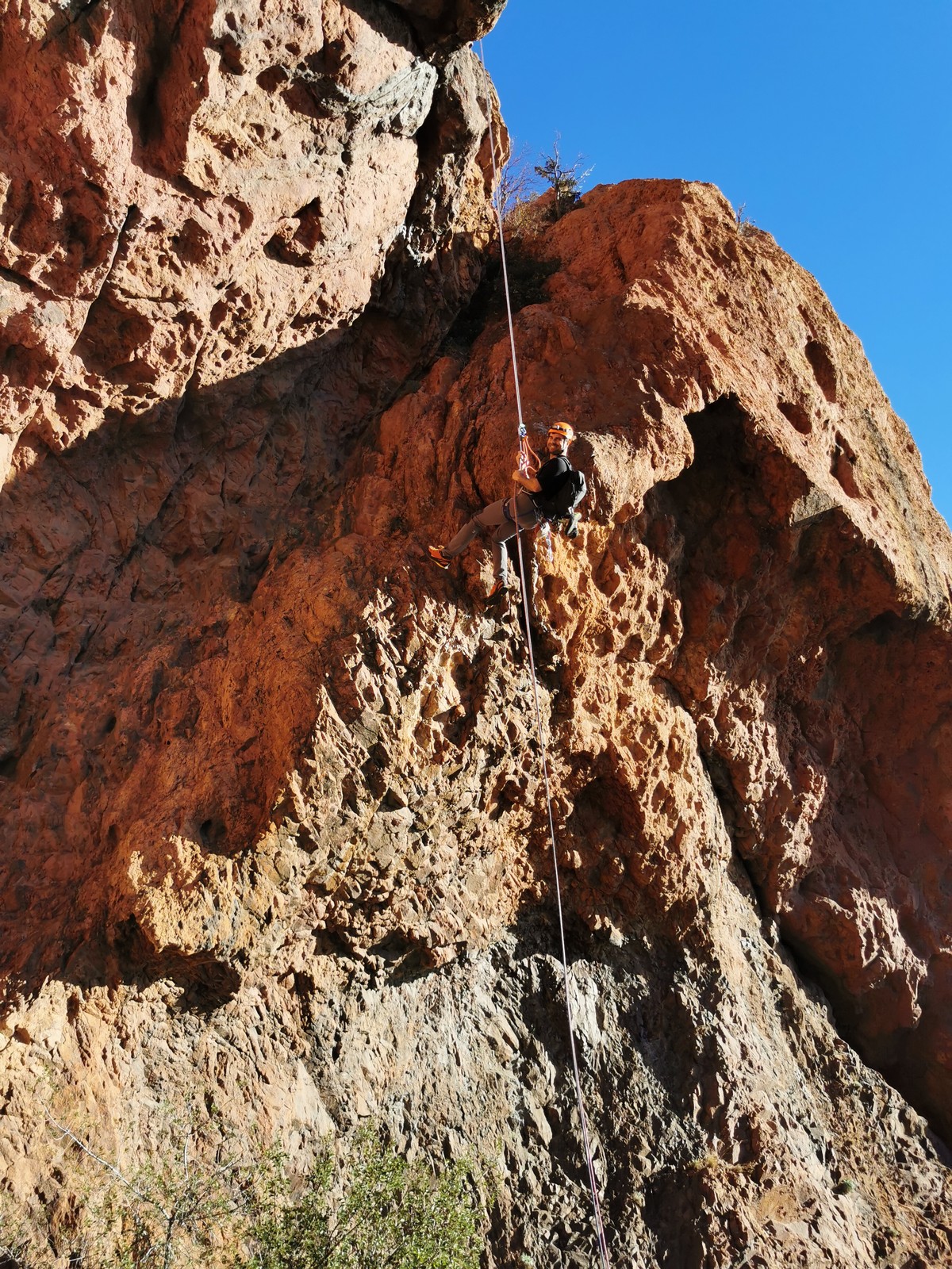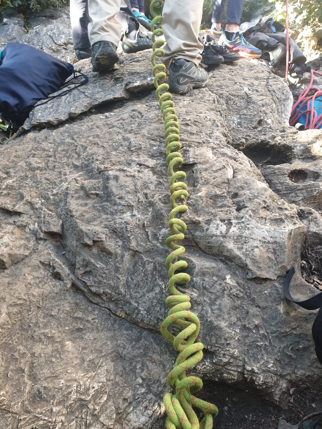 Après cette pause bien méritée, la journée continue. Je prends les devants car pour redescendre du plateau, il faut faire un rappel de 20m. Je pars avec 2 cordes pour les installer puis presse un peu le groupe. La dernière cordée est sur le point de sortir et si on veut enchainer l’après-midi, il faut s’activer. Le groupe arrive au compte goutte au rappel que je triple afin d’aller plus vite. Certains sont déjà bien crevés et vont décider de s’arrêter là pour la journée.