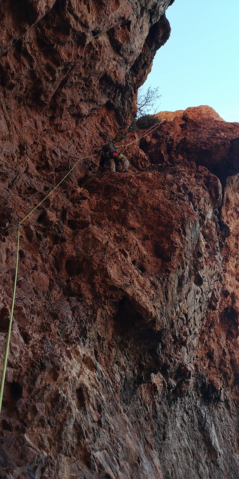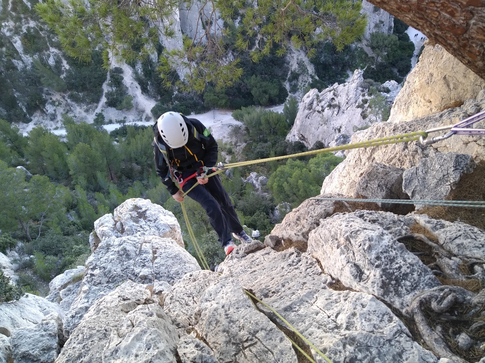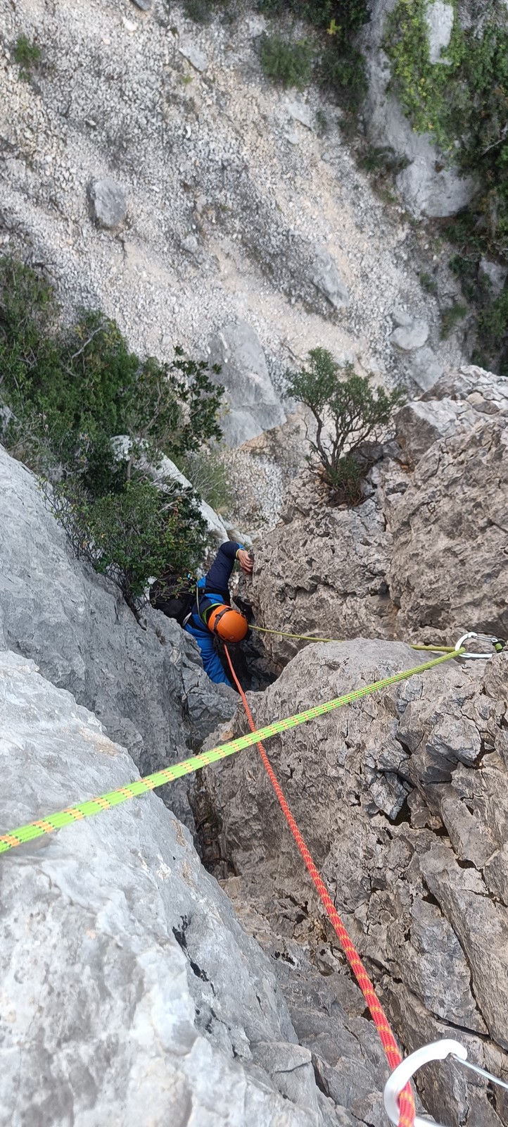 Après cette pause bien méritée, la journée continue. Je prends les devants car pour redescendre du plateau, il faut faire un rappel de 20m. Je pars avec 2 cordes pour les installer puis presse un peu le groupe. La dernière cordée est sur le point de sortir et si on veut enchainer l’après-midi, il faut s’activer. Le groupe arrive au compte goutte au rappel que je triple afin d’aller plus vite. Certains sont déjà bien crevés et vont décider de s’arrêter là pour la journée.
