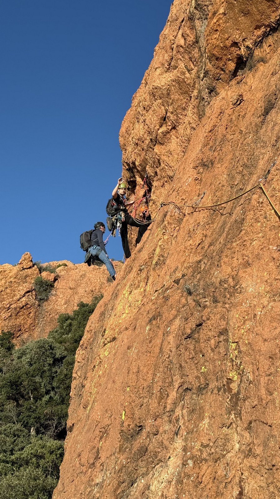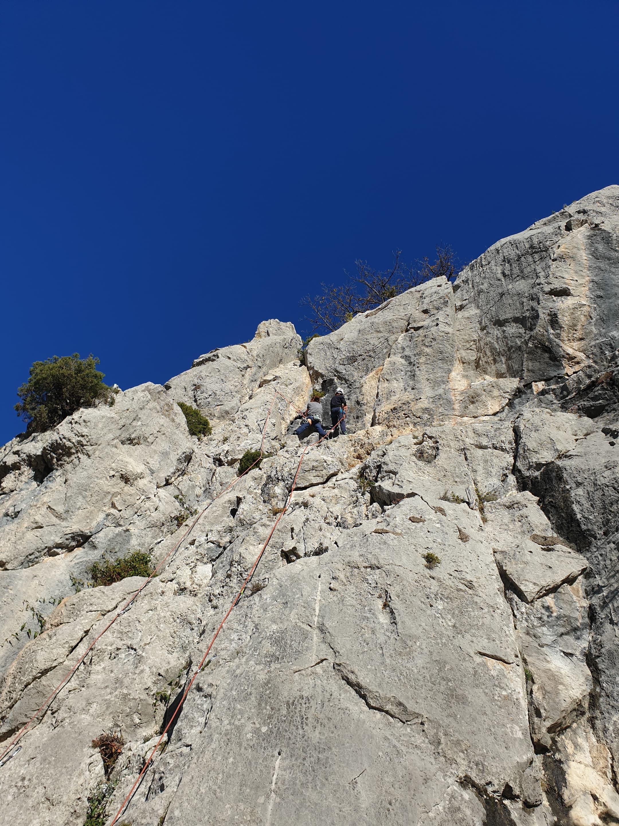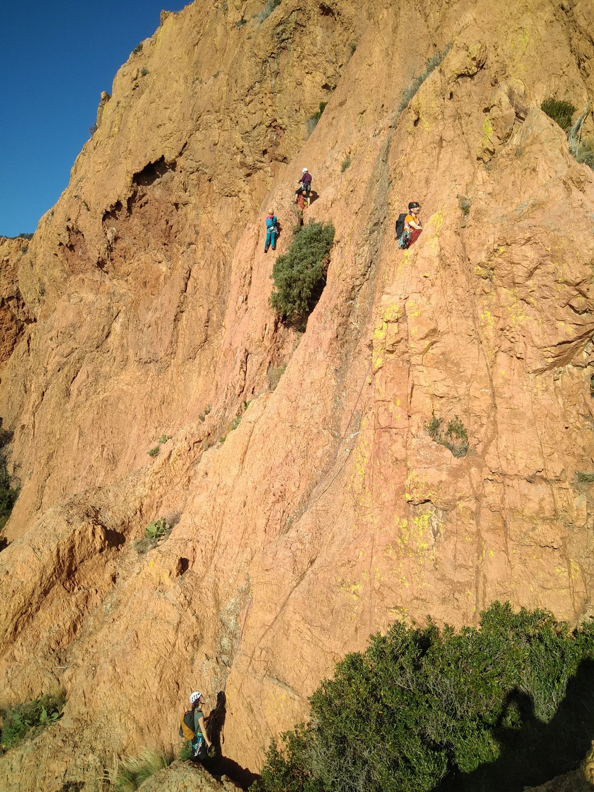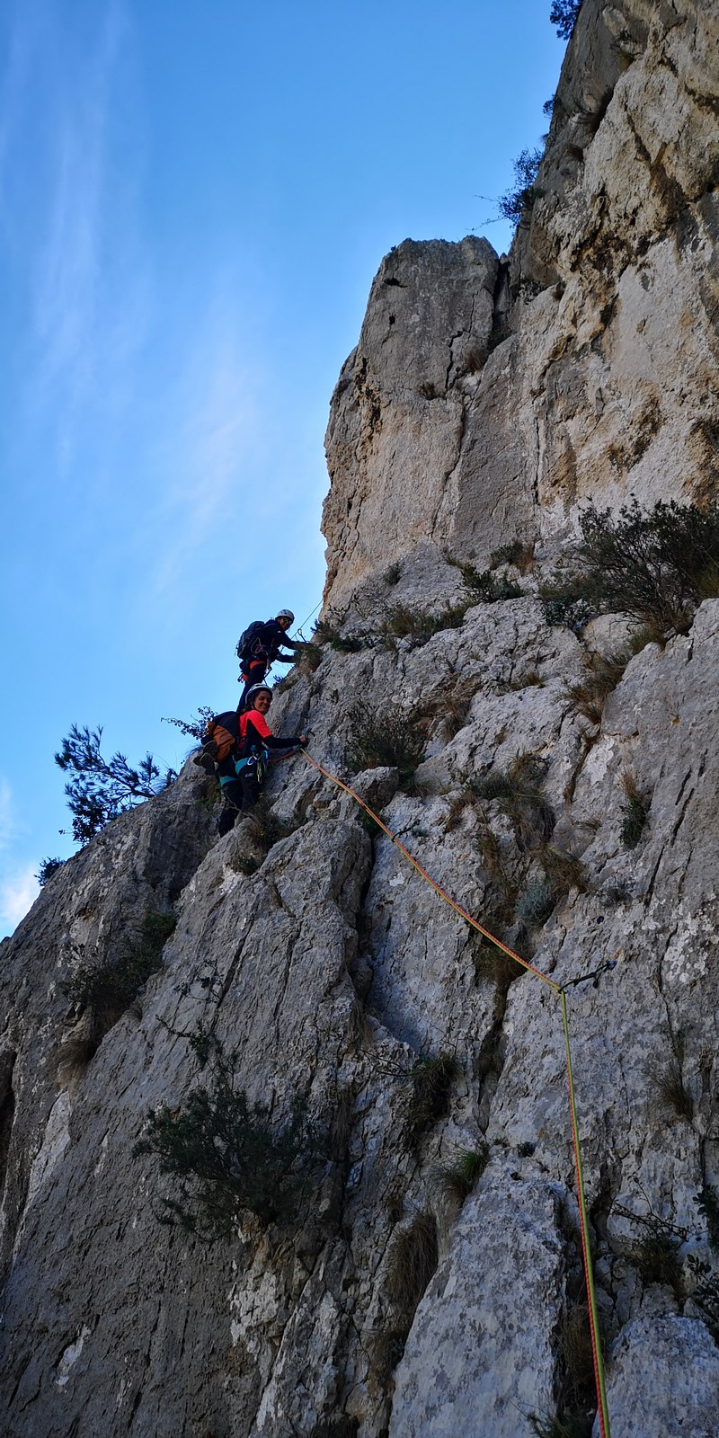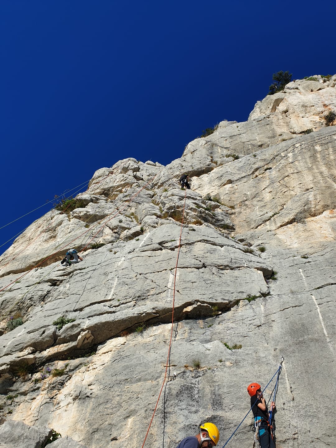 Je décolle de la vire avec la cordée de Gautier en super flèche, choix stratégique car j’ai vue sur presque tout le monde. Les talkies nous permettent de communiquer sereinement et tout le monde avance bien. Chez nous, Gautier avance tranquillement, prend le temps de consulter le topo quand un doute le prend sur un relais : il est complètement autonome. Dounia a un peu galéré dans la première longueur et Cécile prend la suite en tête, un 4c avec du caillou moyen mais qu’elle grimpe sans problème. Plus loin, il me semble que Djé saute un relais mais il me dit qu’il n’a rien vu. Il fait une longueur de quasiment 50m mais il négocie bien à la fois le tirage et le manque de dégaines. Derrière, je m’inquiète un peu plus pour Laura et je leur demande de s’arrêter au relais que Sandrine a finalement repéré mais par qui proquo, Laura continue malgré tout et finit par galérer avec son tirage ! Chaque erreur est de l’expérience engrangée.