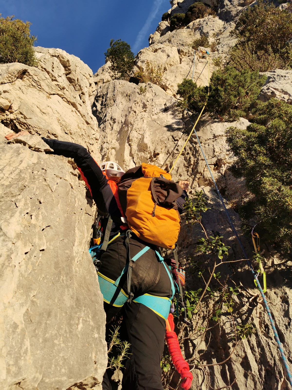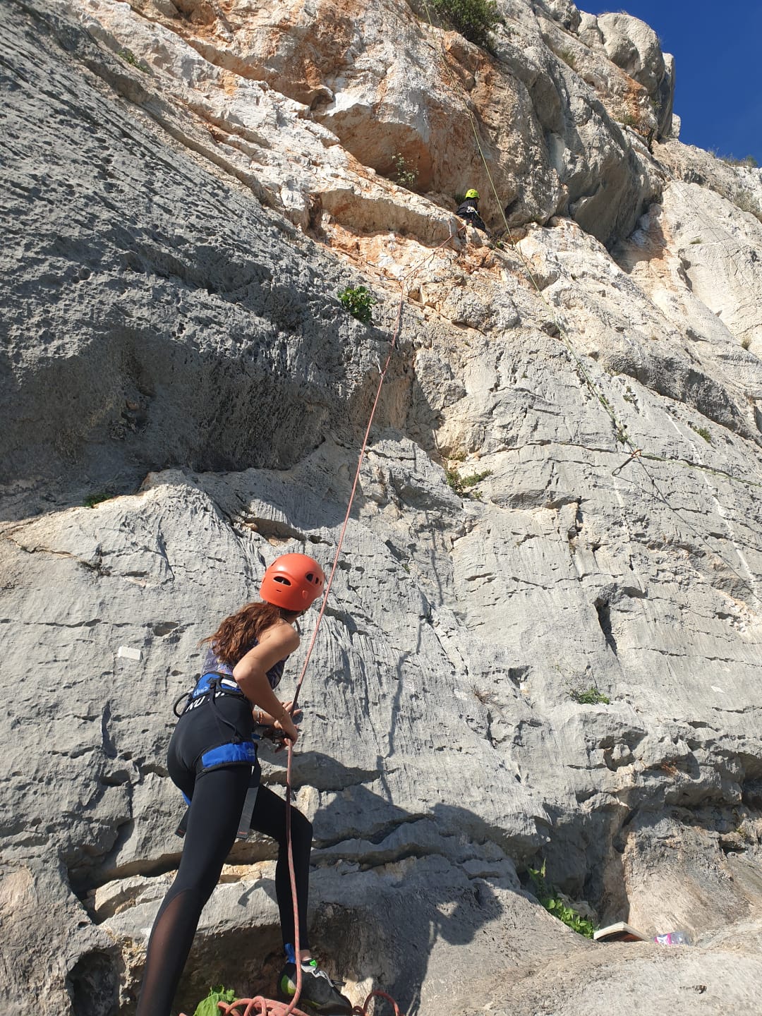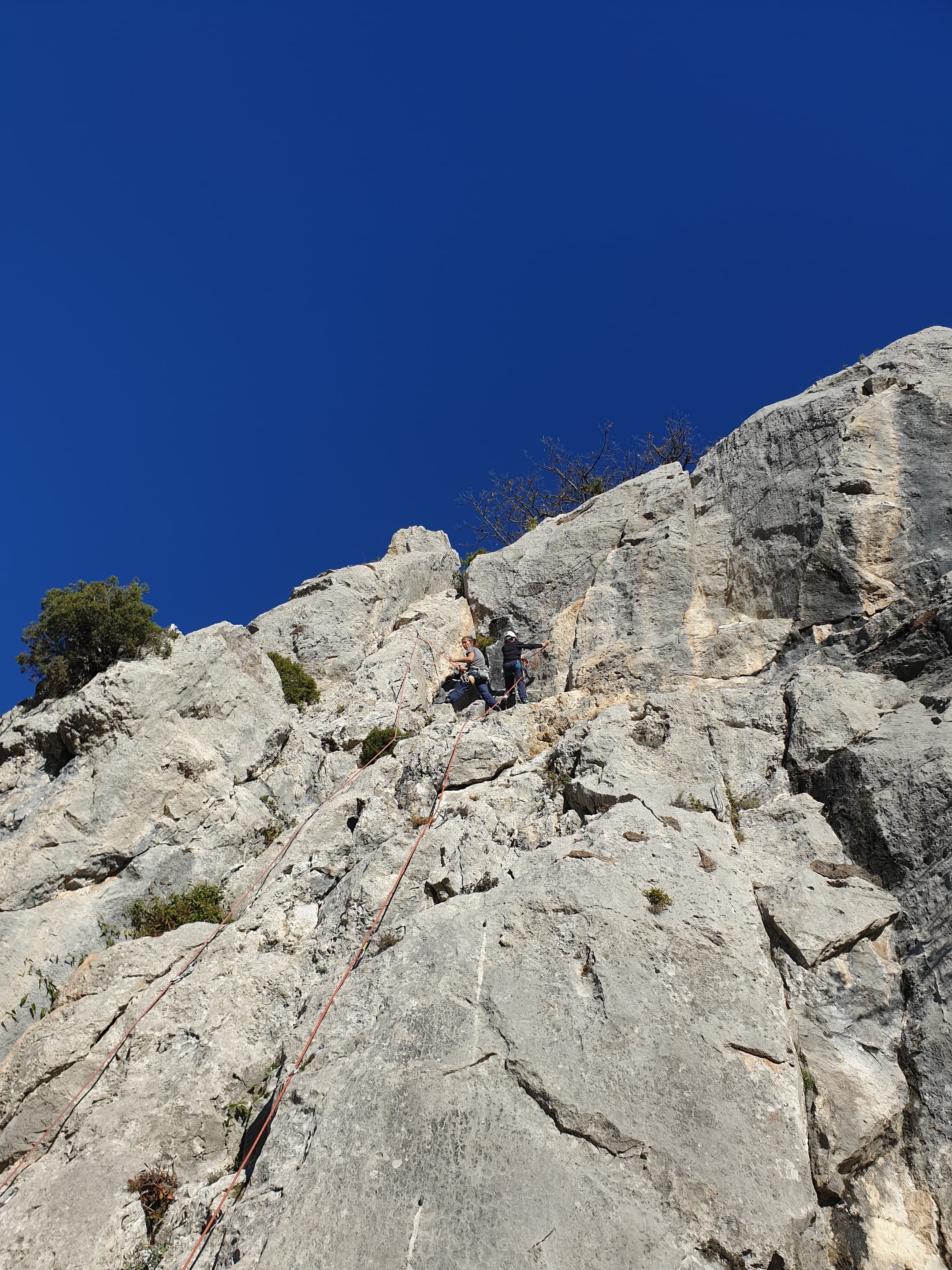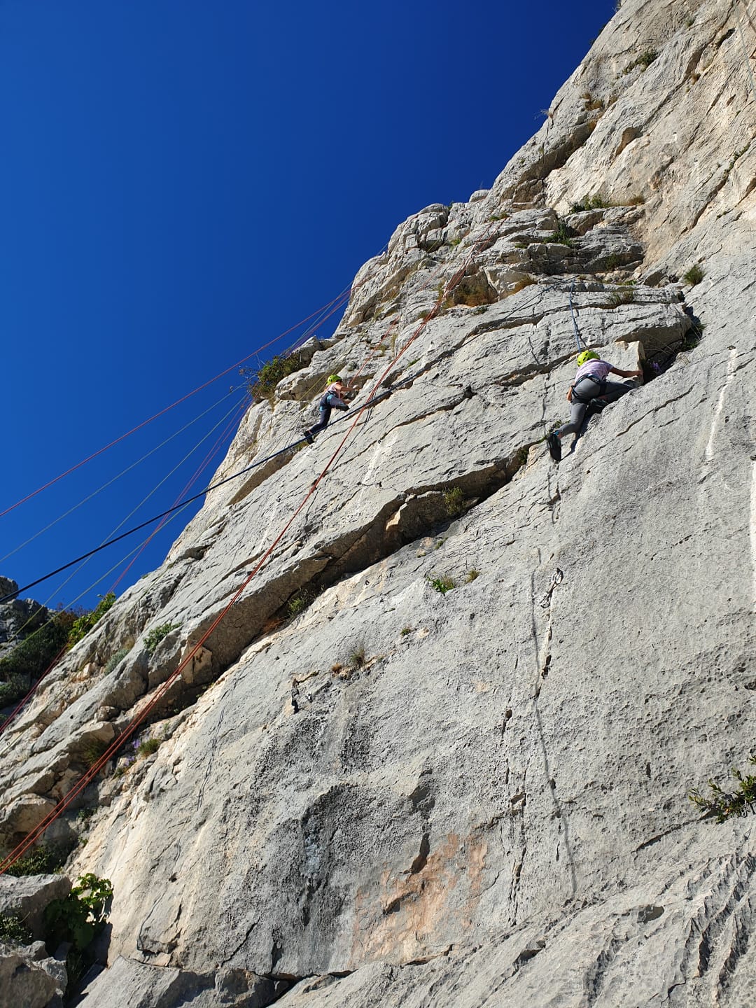 Je décolle de la vire avec la cordée de Gautier en super flèche, choix stratégique car j’ai vue sur presque tout le monde. Les talkies nous permettent de communiquer sereinement et tout le monde avance bien. Chez nous, Gautier avance tranquillement, prend le temps de consulter le topo quand un doute le prend sur un relais : il est complètement autonome. Dounia a un peu galéré dans la première longueur et Cécile prend la suite en tête, un 4c avec du caillou moyen mais qu’elle grimpe sans problème. Plus loin, il me semble que Djé saute un relais mais il me dit qu’il n’a rien vu. Il fait une longueur de quasiment 50m mais il négocie bien à la fois le tirage et le manque de dégaines. Derrière, je m’inquiète un peu plus pour Laura et je leur demande de s’arrêter au relais que Sandrine a finalement repéré mais par qui proquo, Laura continue malgré tout et finit par galérer avec son tirage ! Chaque erreur est de l’expérience engrangée.