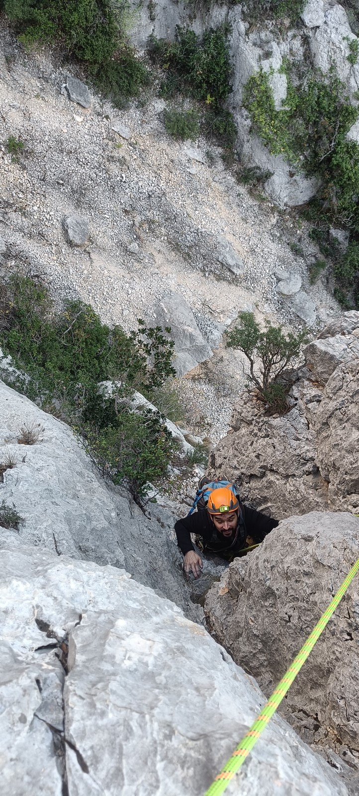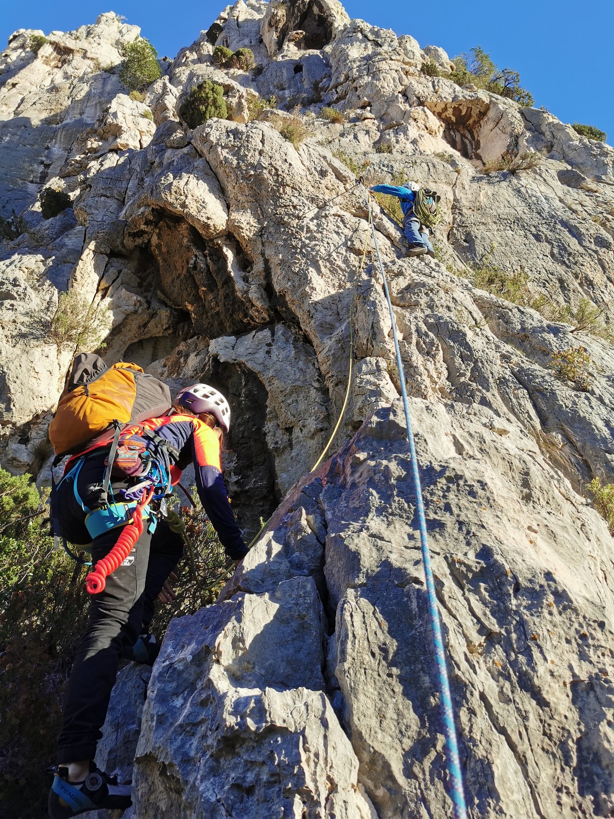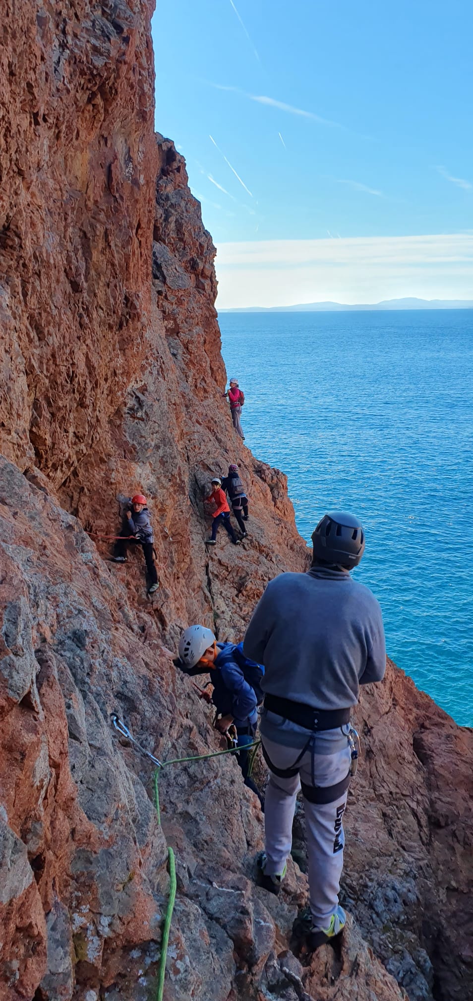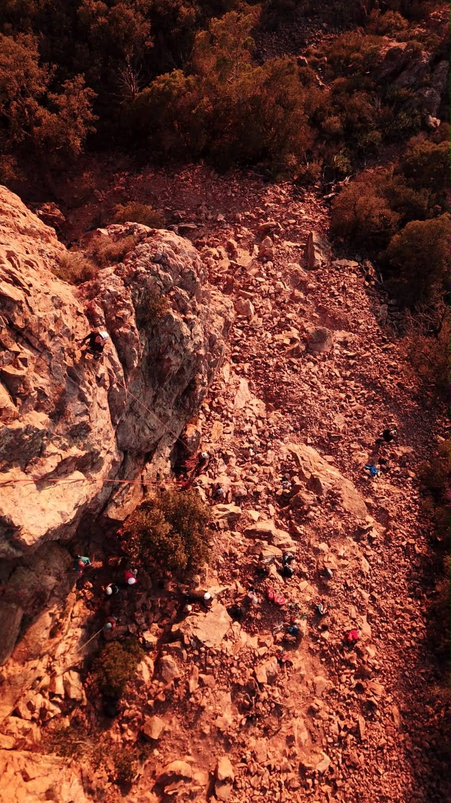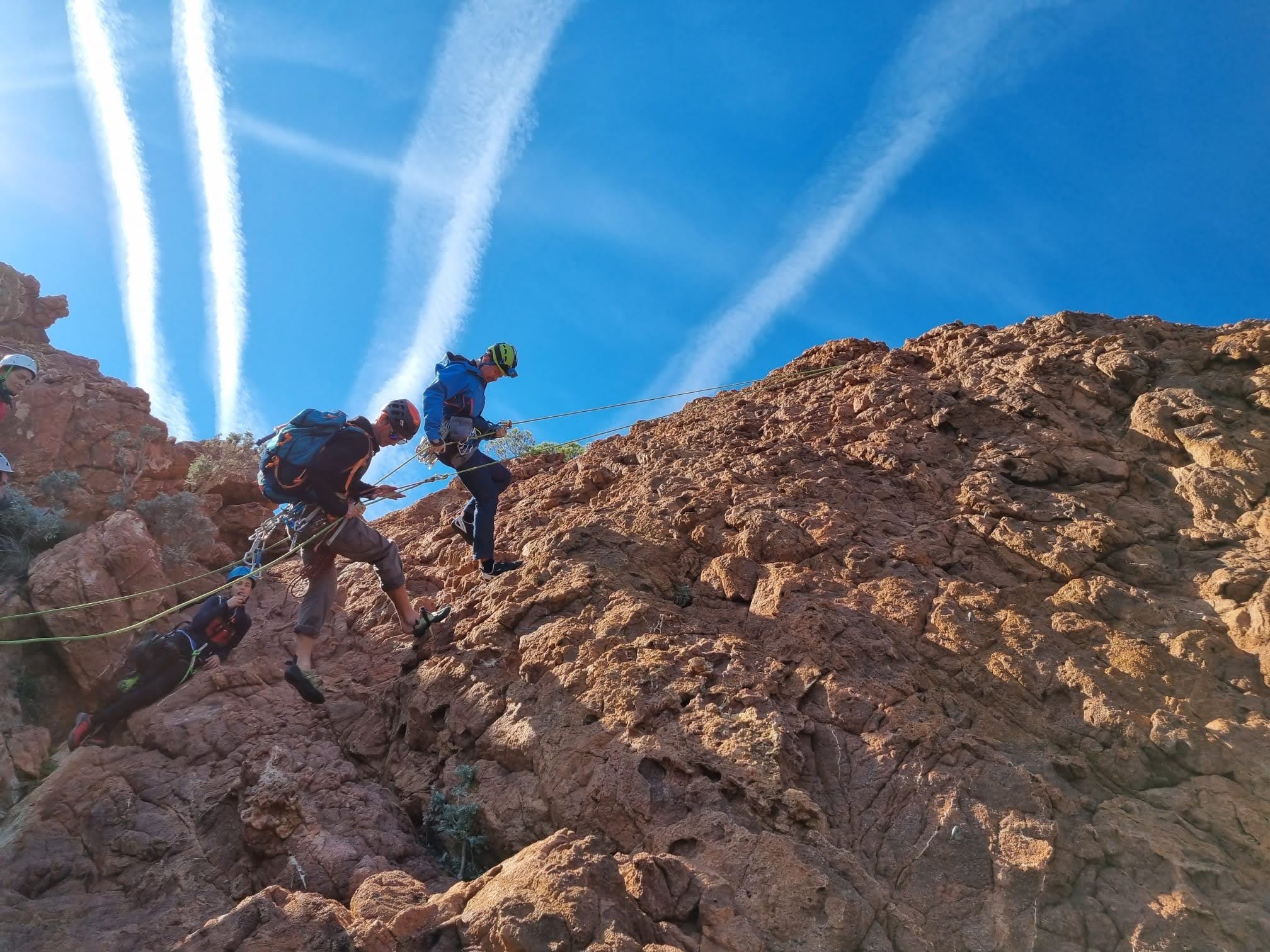 Je décolle de la vire avec la cordée de Gautier en super flèche, choix stratégique car j’ai vue sur presque tout le monde. Les talkies nous permettent de communiquer sereinement et tout le monde avance bien. Chez nous, Gautier avance tranquillement, prend le temps de consulter le topo quand un doute le prend sur un relais : il est complètement autonome. Dounia a un peu galéré dans la première longueur et Cécile prend la suite en tête, un 4c avec du caillou moyen mais qu’elle grimpe sans problème. Plus loin, il me semble que Djé saute un relais mais il me dit qu’il n’a rien vu. Il fait une longueur de quasiment 50m mais il négocie bien à la fois le tirage et le manque de dégaines. Derrière, je m’inquiète un peu plus pour Laura et je leur demande de s’arrêter au relais que Sandrine a finalement repéré mais par qui proquo, Laura continue malgré tout et finit par galérer avec son tirage ! Chaque erreur est de l’expérience engrangée.