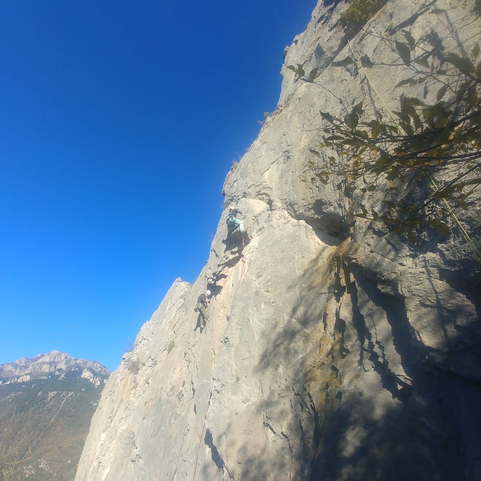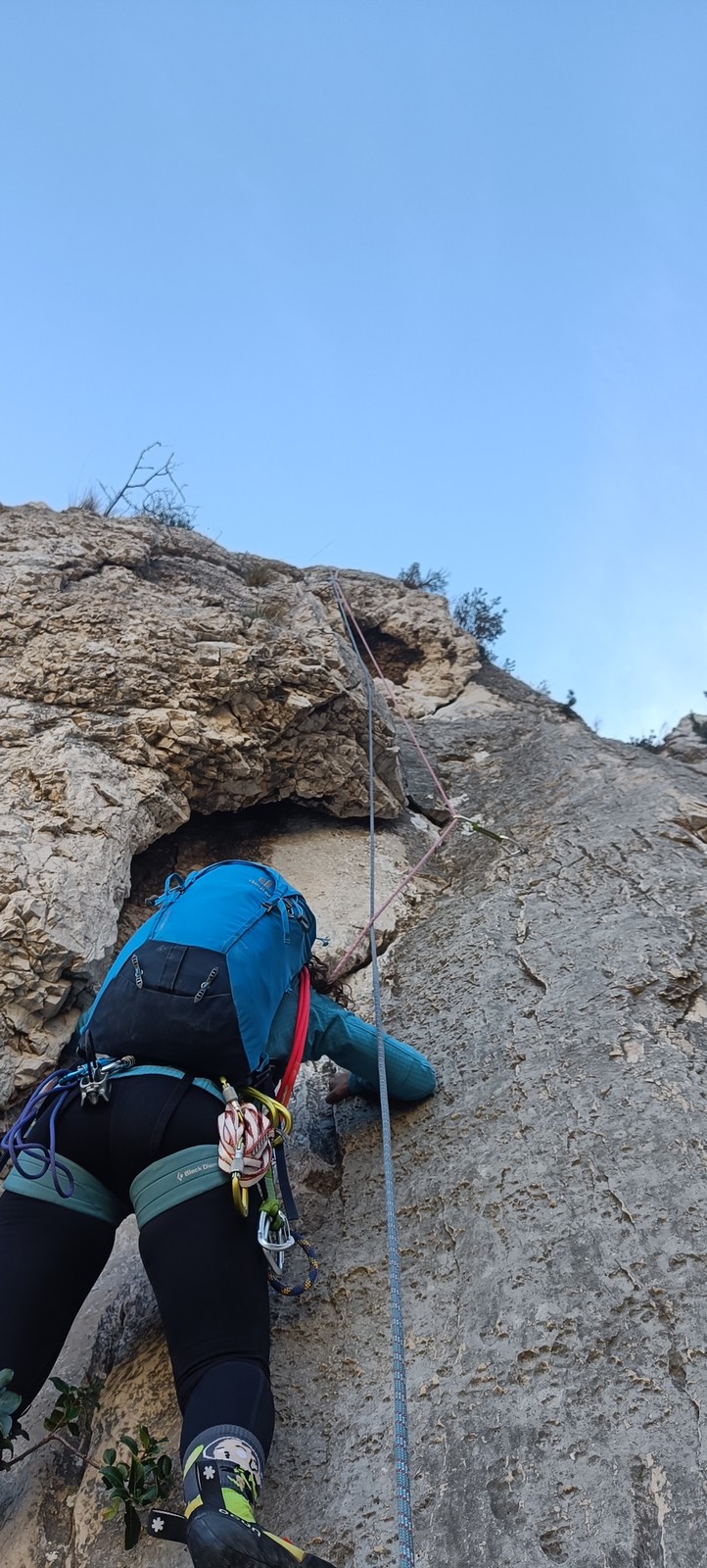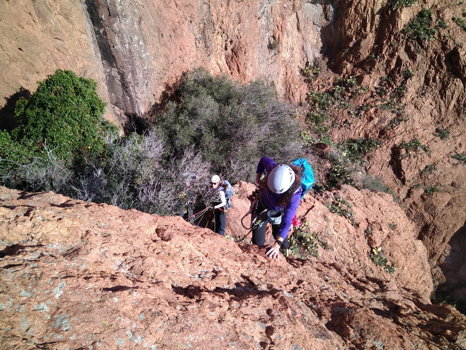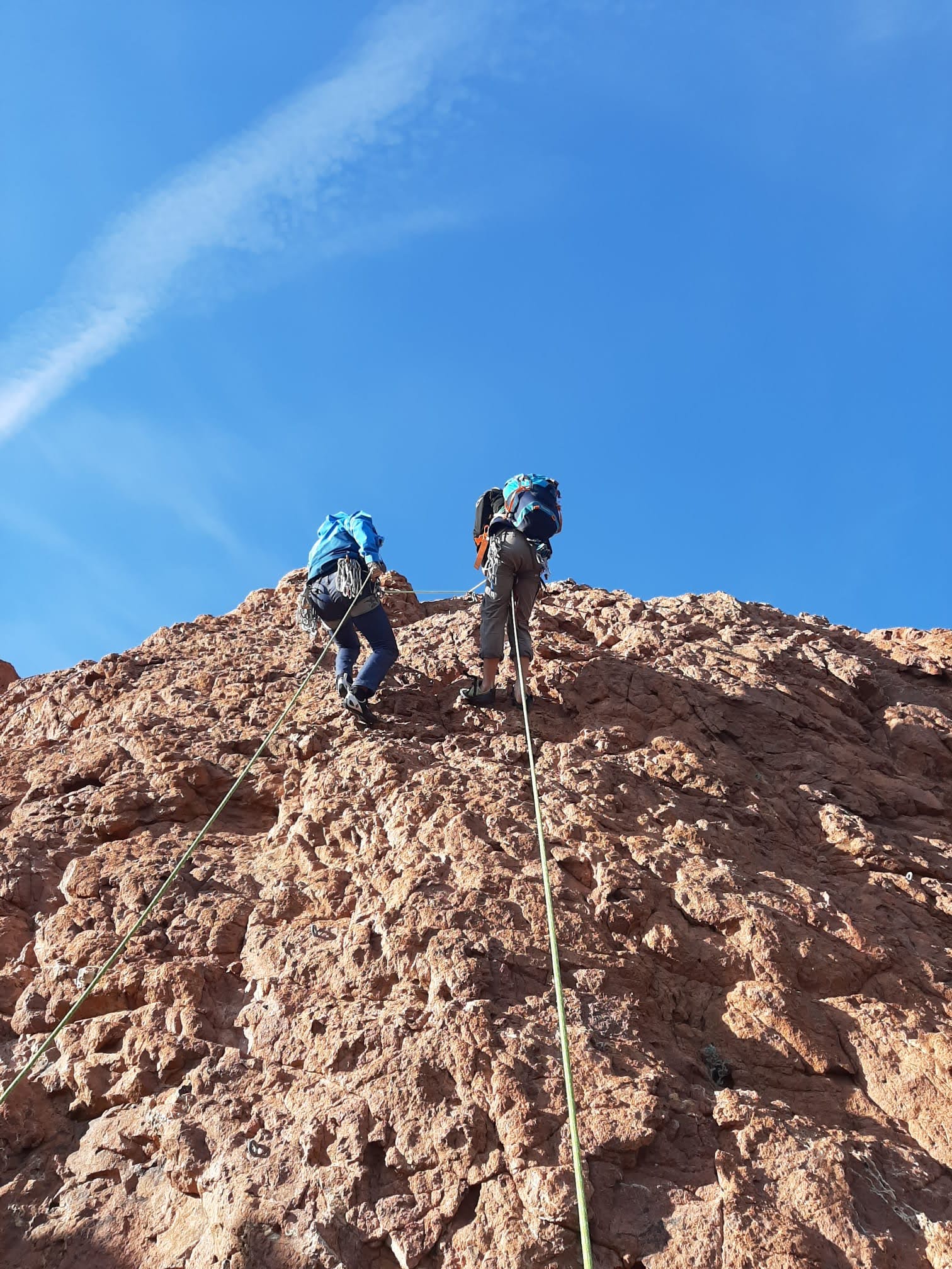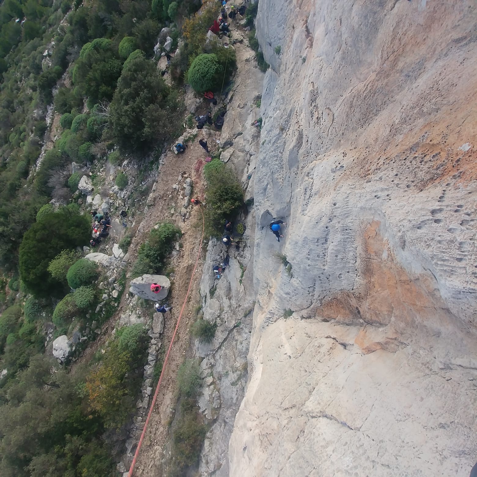 Je décolle de la vire avec la cordée de Gautier en super flèche, choix stratégique car j’ai vue sur presque tout le monde. Les talkies nous permettent de communiquer sereinement et tout le monde avance bien. Chez nous, Gautier avance tranquillement, prend le temps de consulter le topo quand un doute le prend sur un relais : il est complètement autonome. Dounia a un peu galéré dans la première longueur et Cécile prend la suite en tête, un 4c avec du caillou moyen mais qu’elle grimpe sans problème. Plus loin, il me semble que Djé saute un relais mais il me dit qu’il n’a rien vu. Il fait une longueur de quasiment 50m mais il négocie bien à la fois le tirage et le manque de dégaines. Derrière, je m’inquiète un peu plus pour Laura et je leur demande de s’arrêter au relais que Sandrine a finalement repéré mais par qui proquo, Laura continue malgré tout et finit par galérer avec son tirage ! Chaque erreur est de l’expérience engrangée.