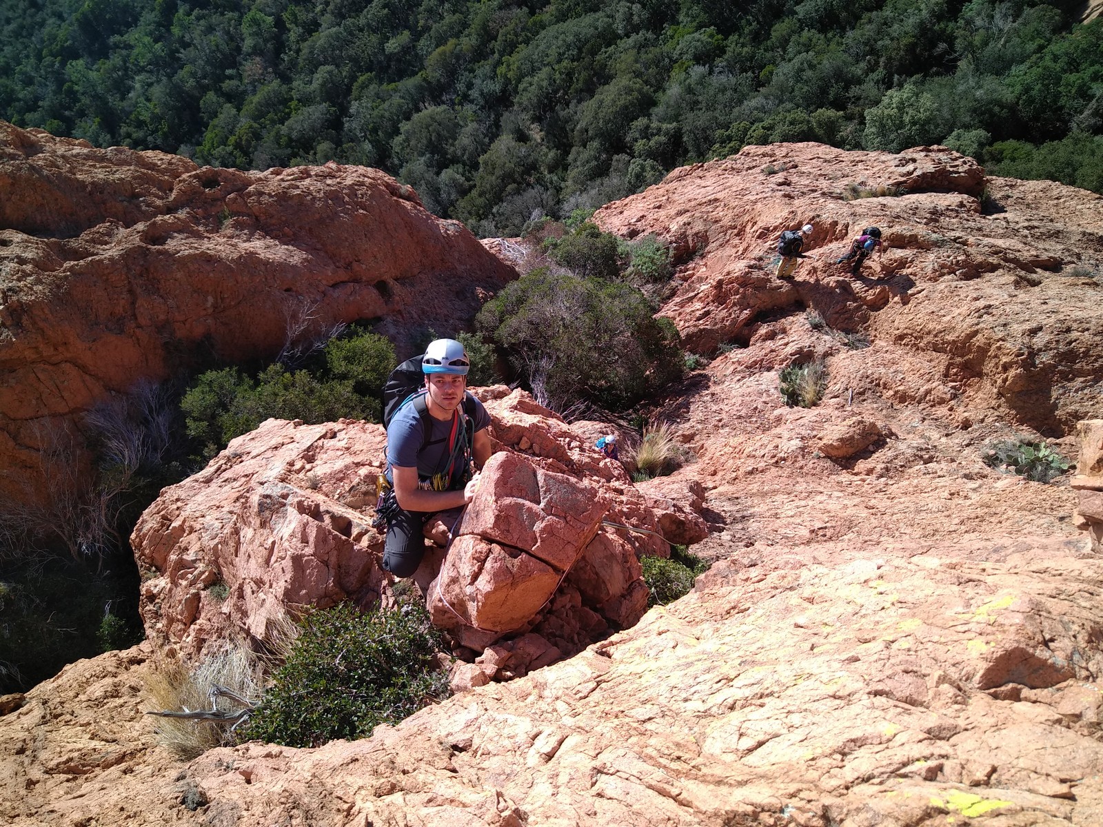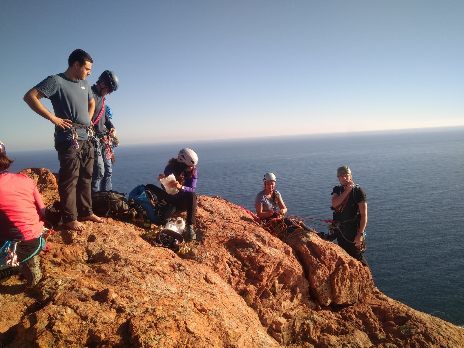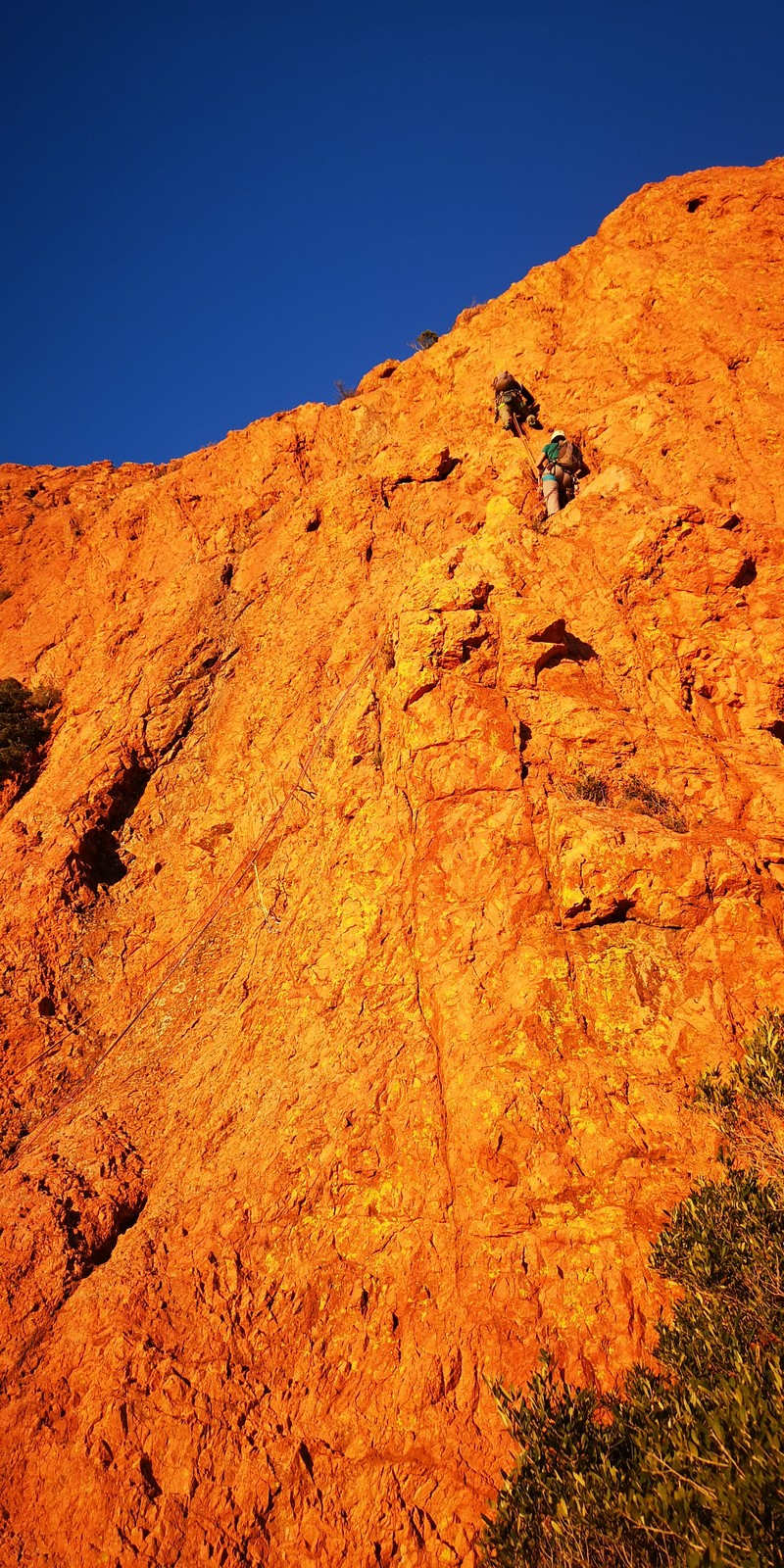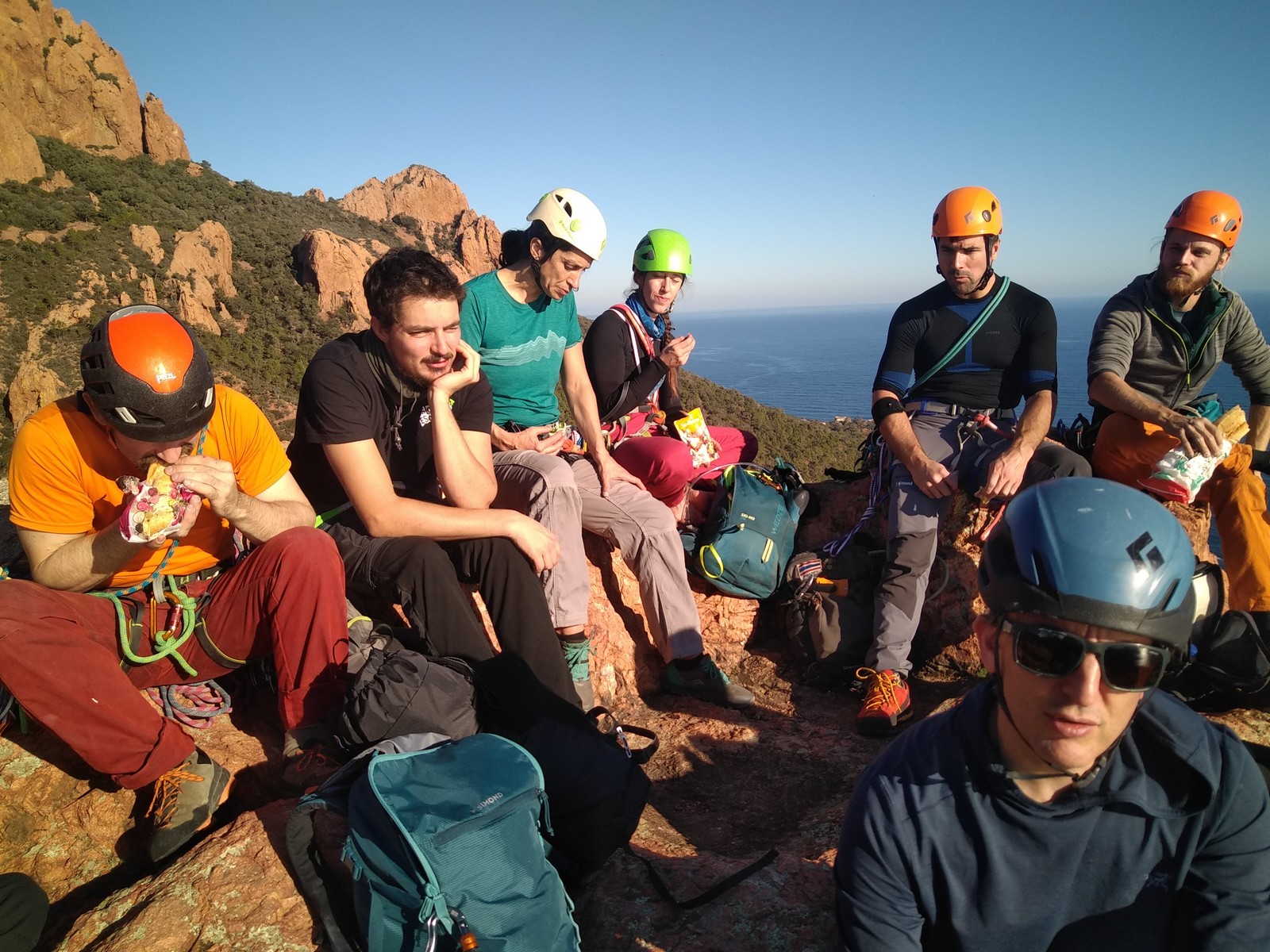 La cordée de Jean-Luc en est déjà à sa dernière longueur. Faut dire qu’ils n’en avaient que 5 à faire. Ils vont devoir patienter un peu au sommet. Dans le tracas, le petit rappel à tirer entre L6 et L7 embrouille un peu la cordée de tête mais ils s’en sortent finalement et attaquent l’avant dernière longueur en 6a. Nous, on doit traverser toute la terrasse et Djé part dans une grande longueur très jolie qui grimpe un peu plus que les autres. Gautier mettra les chaussons, lui qui se faisait balader jusque là, pour nous suivre. Une dernière longueur où Laura pose des protections un peu limites et nous voilà au sommet à retrouver Jean-Luc, Brice et Matthieu. JP, Julien, Xav, Cécile, François et Camille nous rejoignent rapidement. Quelques minutes plus tard, tout le monde est là.