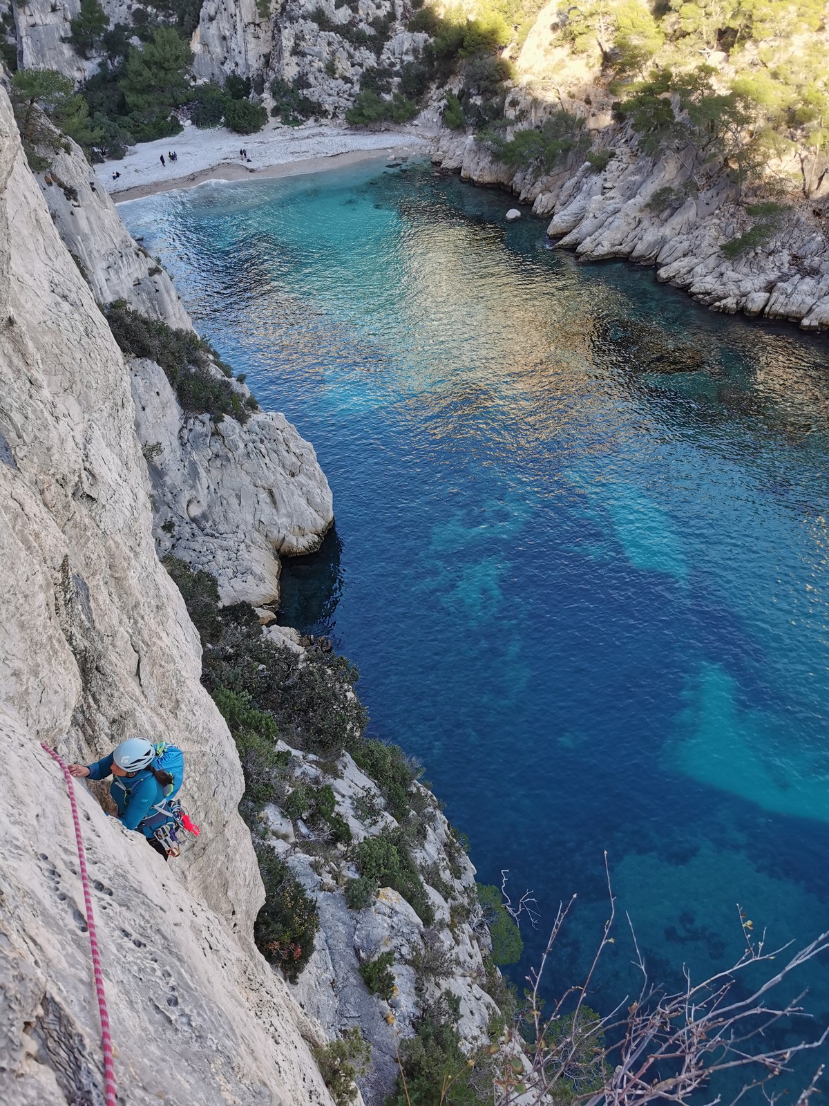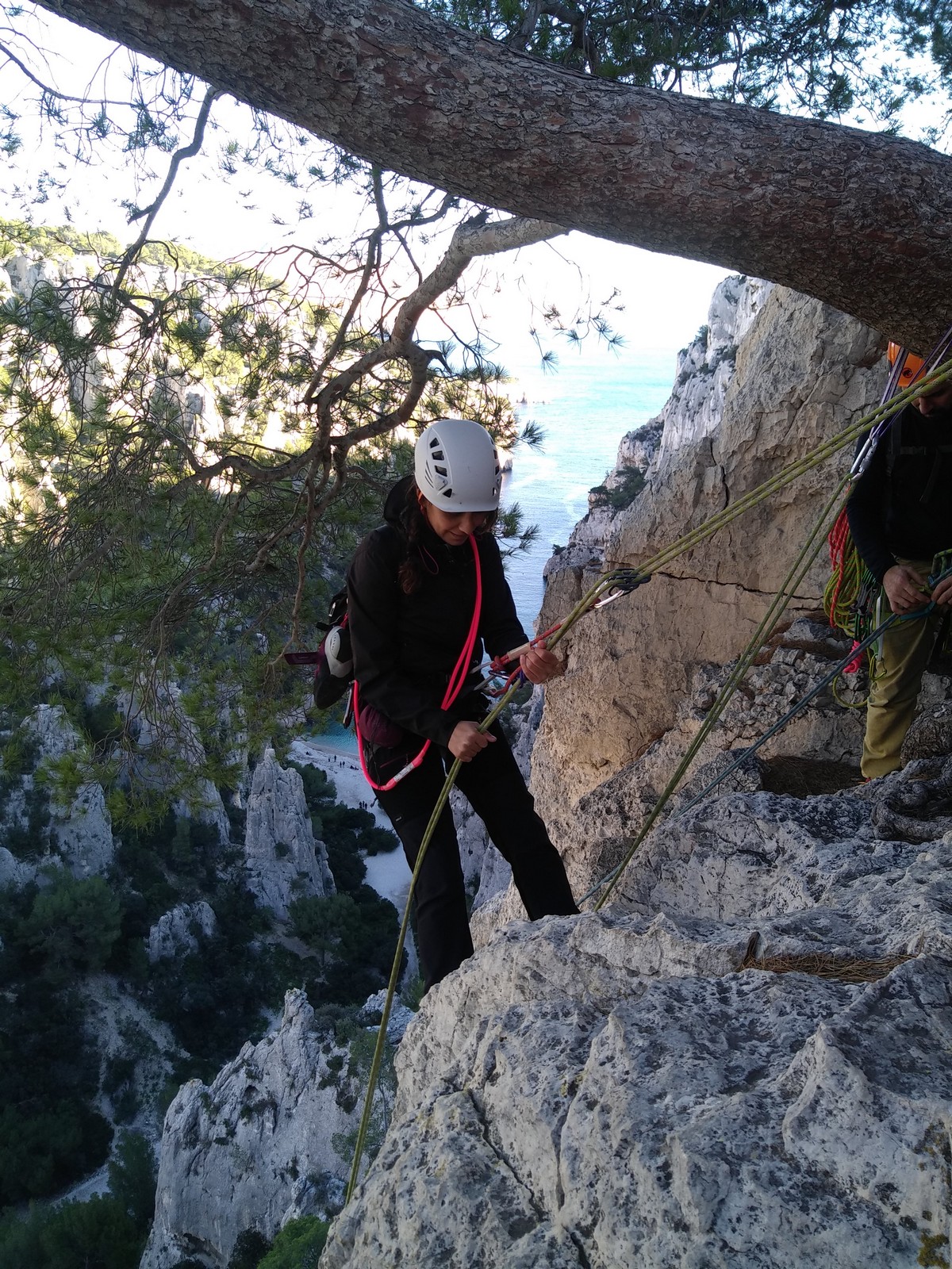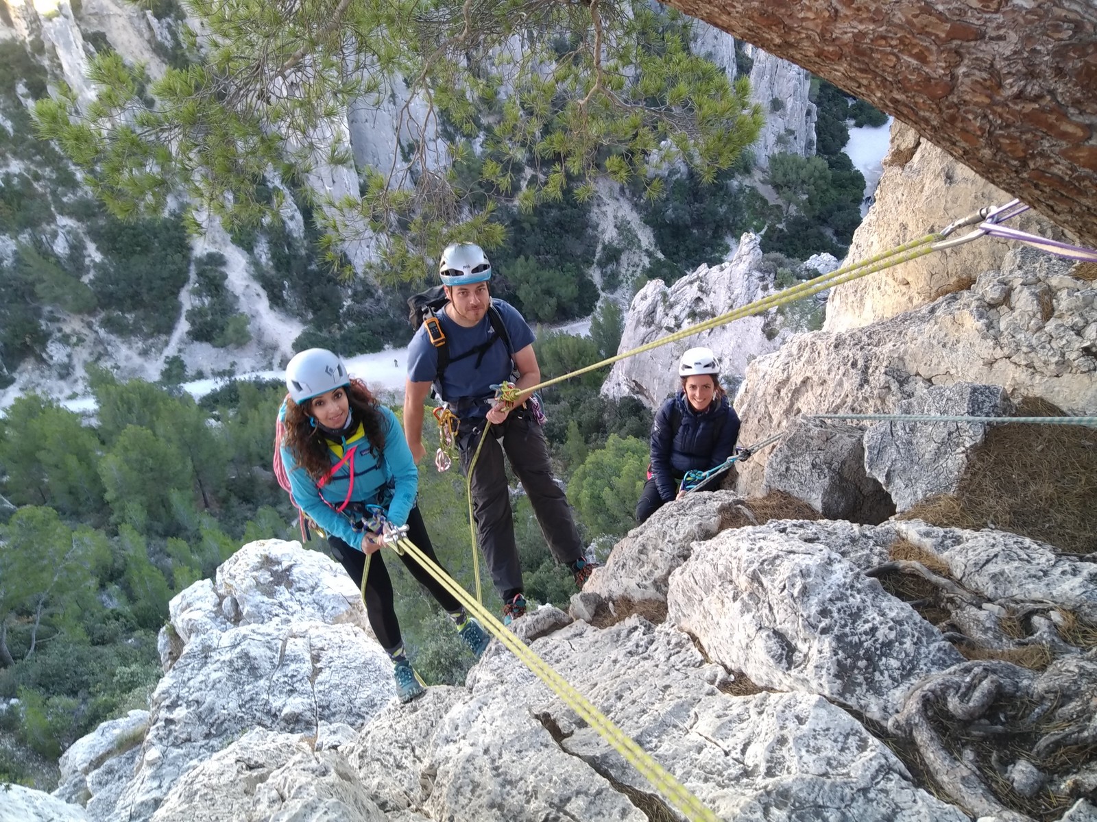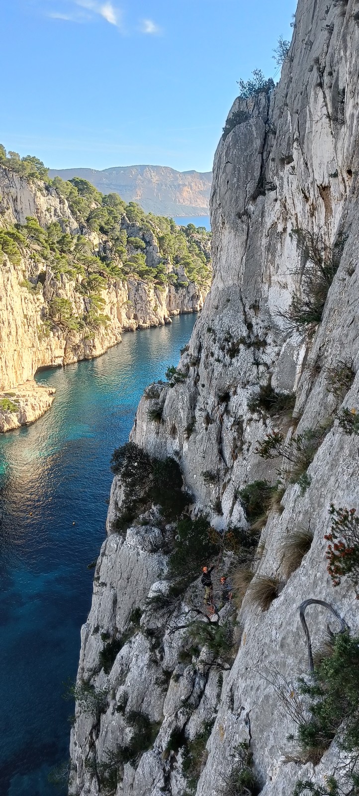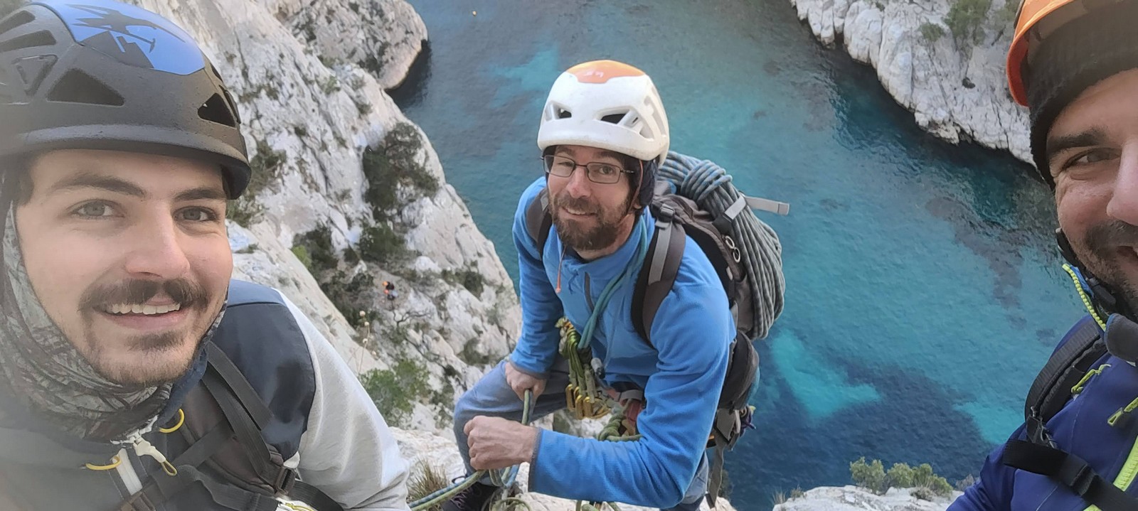 La cordée Xavier, Stéphanie et JP ont choisi la voie la plus dure du jour, le Calendal avec une longueur en 6b. Elle commence par un rappel pour aller chercher une première longueur au bord de l’eau. Ils s’installent pendant que je fais des allers et retours pour vérifier que tout le monde a ce qu’il faut. Dans la voie la plus facile, la Calanque, Djé est missionné pour s’occuper de Sandrine, fraîchement opérée de la main mais qui ne voulait manquer la journée sous aucun prétexte, et de Saliha. Derrière, Laura et Brice gagnent en responsabilité et doivent assurer avec Julien qui fait sa première grande voie.