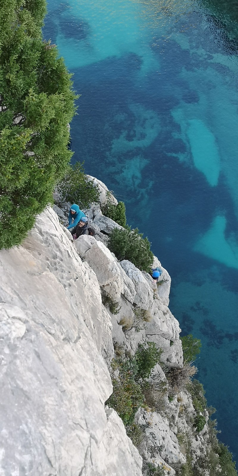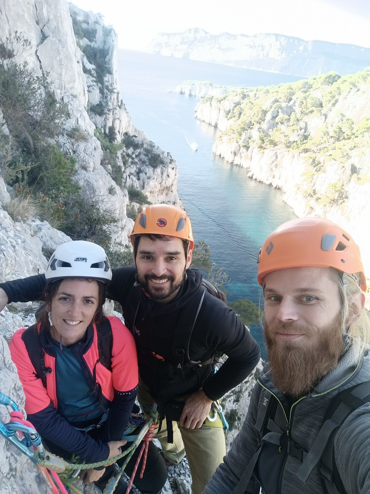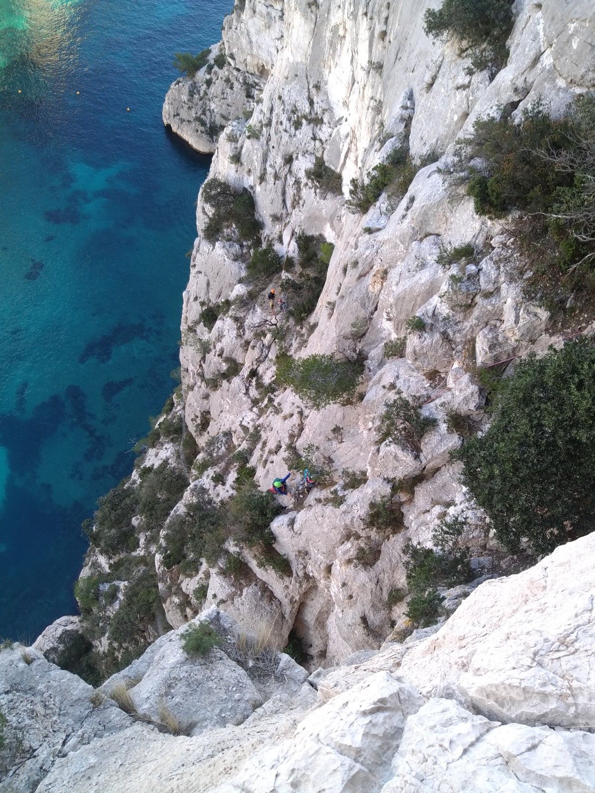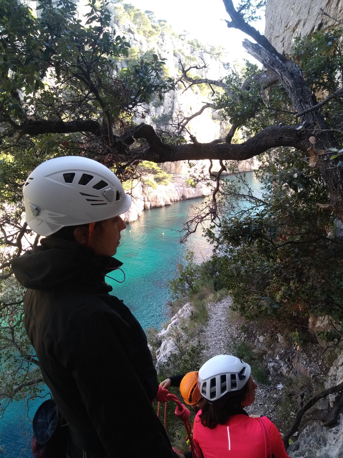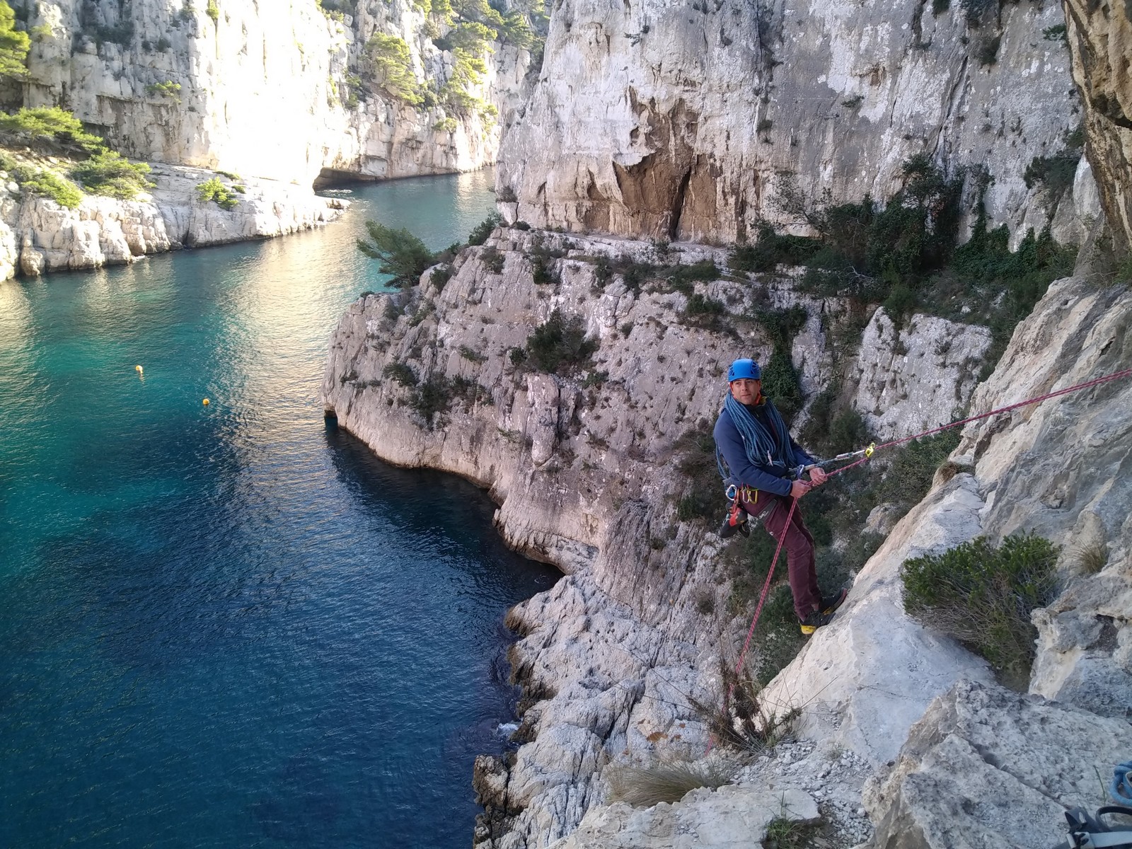 La cordée Xavier, Stéphanie et JP ont choisi la voie la plus dure du jour, le Calendal avec une longueur en 6b. Elle commence par un rappel pour aller chercher une première longueur au bord de l’eau. Ils s’installent pendant que je fais des allers et retours pour vérifier que tout le monde a ce qu’il faut. Dans la voie la plus facile, la Calanque, Djé est missionné pour s’occuper de Sandrine, fraîchement opérée de la main mais qui ne voulait manquer la journée sous aucun prétexte, et de Saliha. Derrière, Laura et Brice gagnent en responsabilité et doivent assurer avec Julien qui fait sa première grande voie.