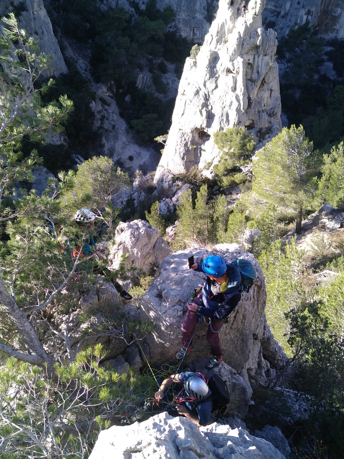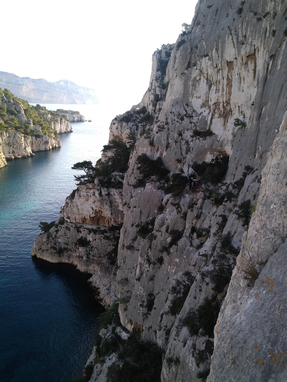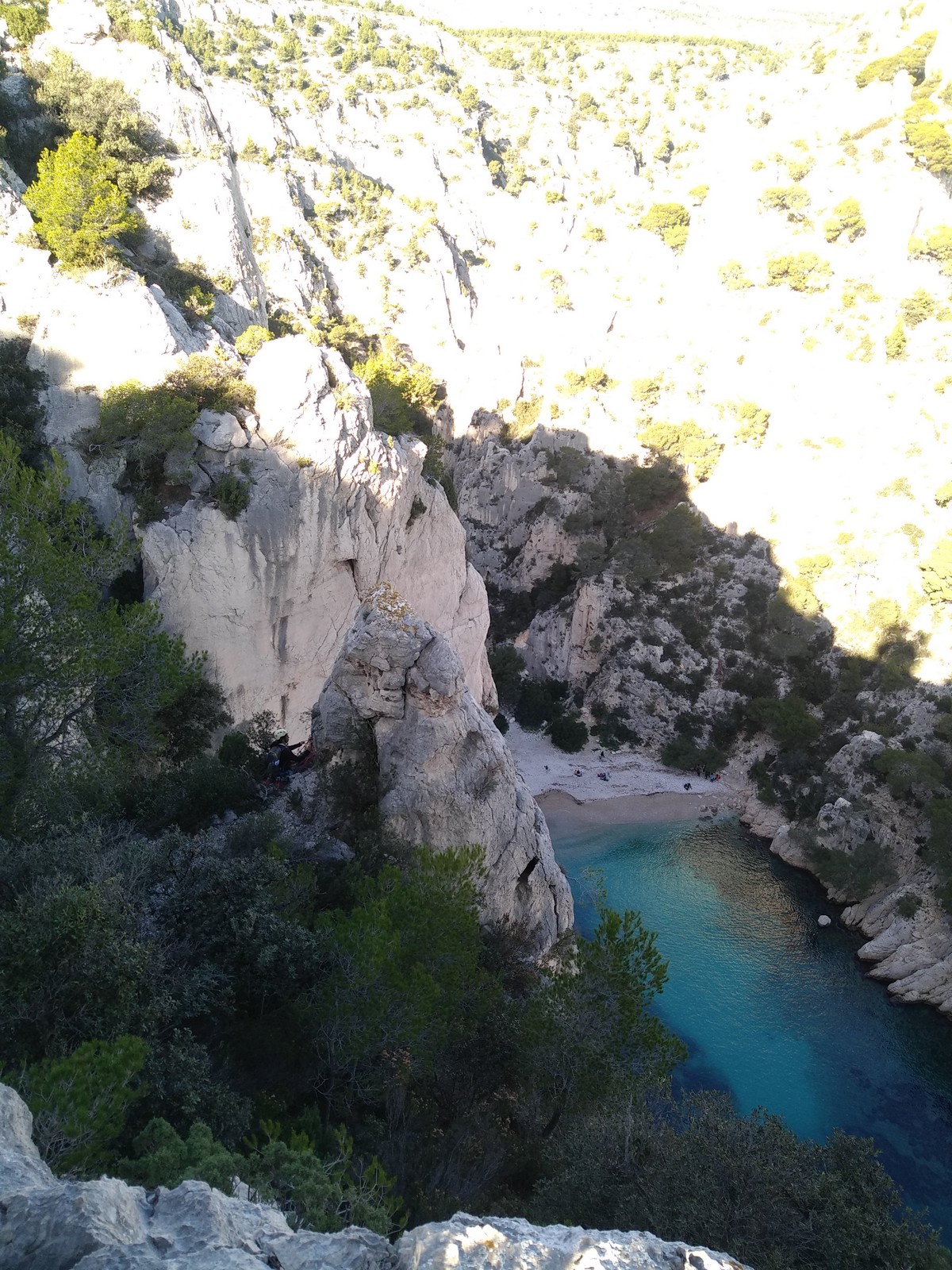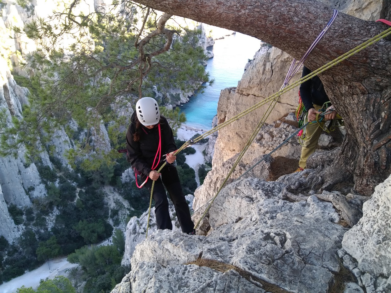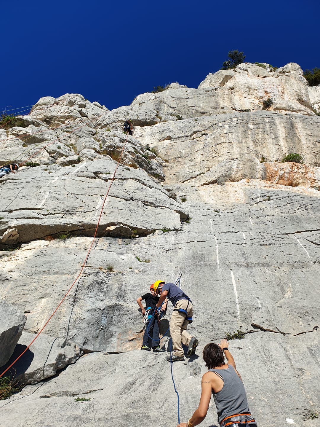 La cordée Xavier, Stéphanie et JP ont choisi la voie la plus dure du jour, le Calendal avec une longueur en 6b. Elle commence par un rappel pour aller chercher une première longueur au bord de l’eau. Ils s’installent pendant que je fais des allers et retours pour vérifier que tout le monde a ce qu’il faut. Dans la voie la plus facile, la Calanque, Djé est missionné pour s’occuper de Sandrine, fraîchement opérée de la main mais qui ne voulait manquer la journée sous aucun prétexte, et de Saliha. Derrière, Laura et Brice gagnent en responsabilité et doivent assurer avec Julien qui fait sa première grande voie.
