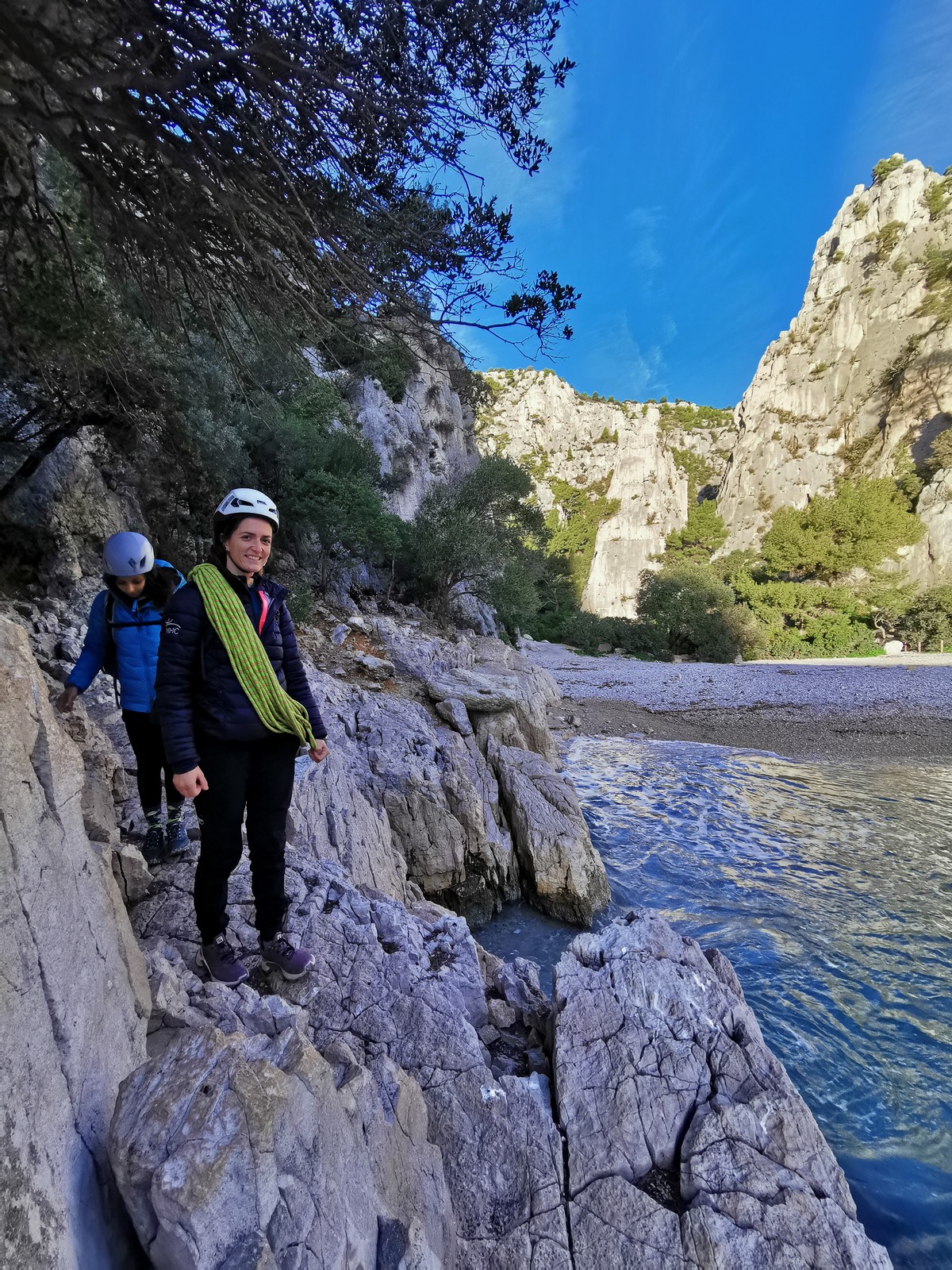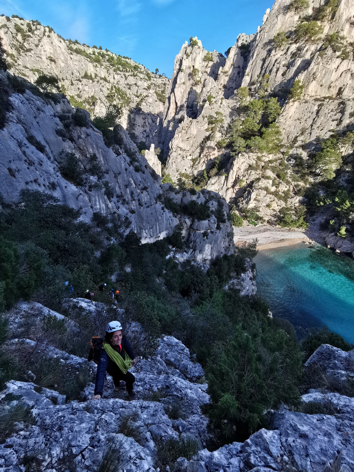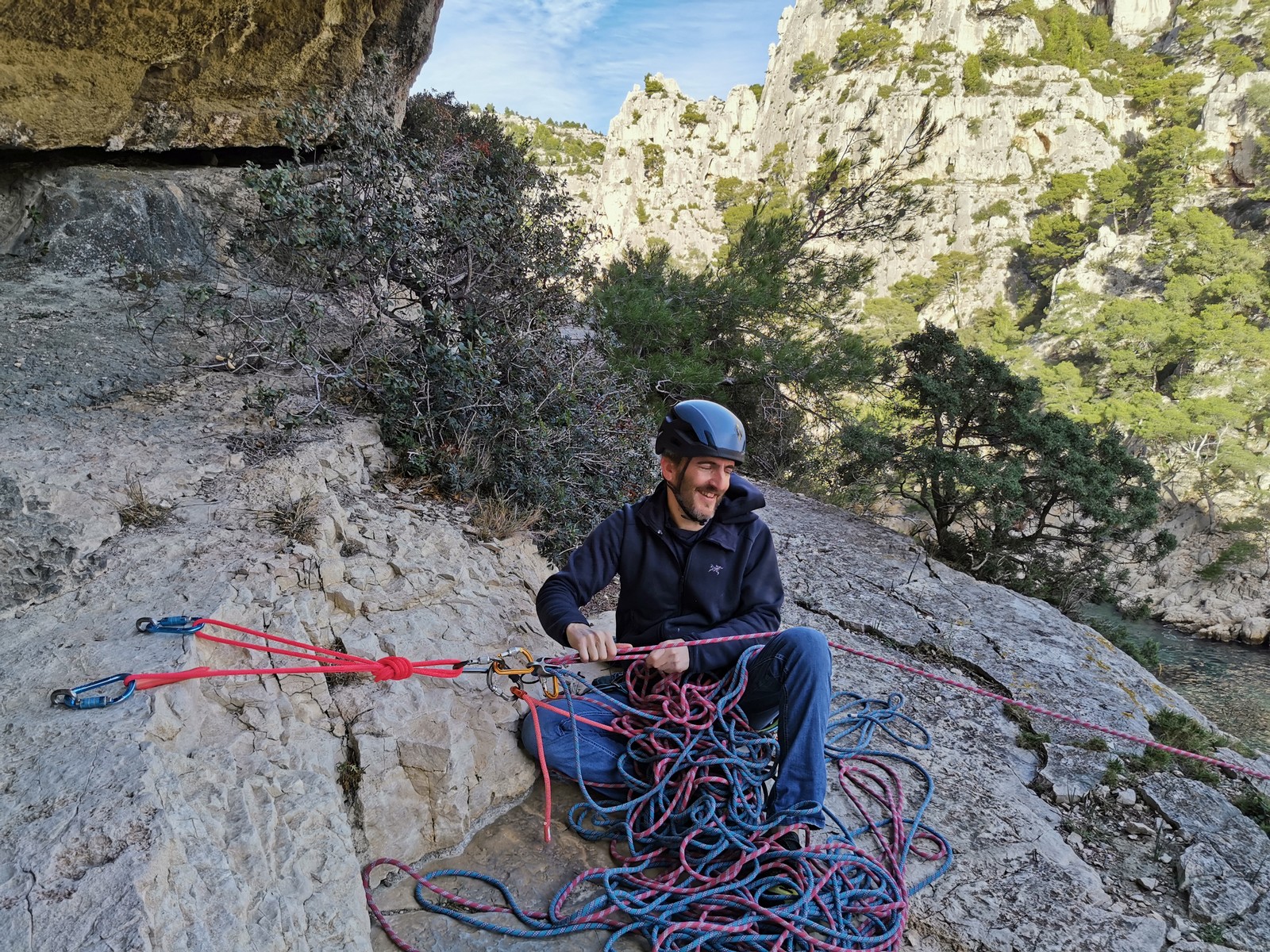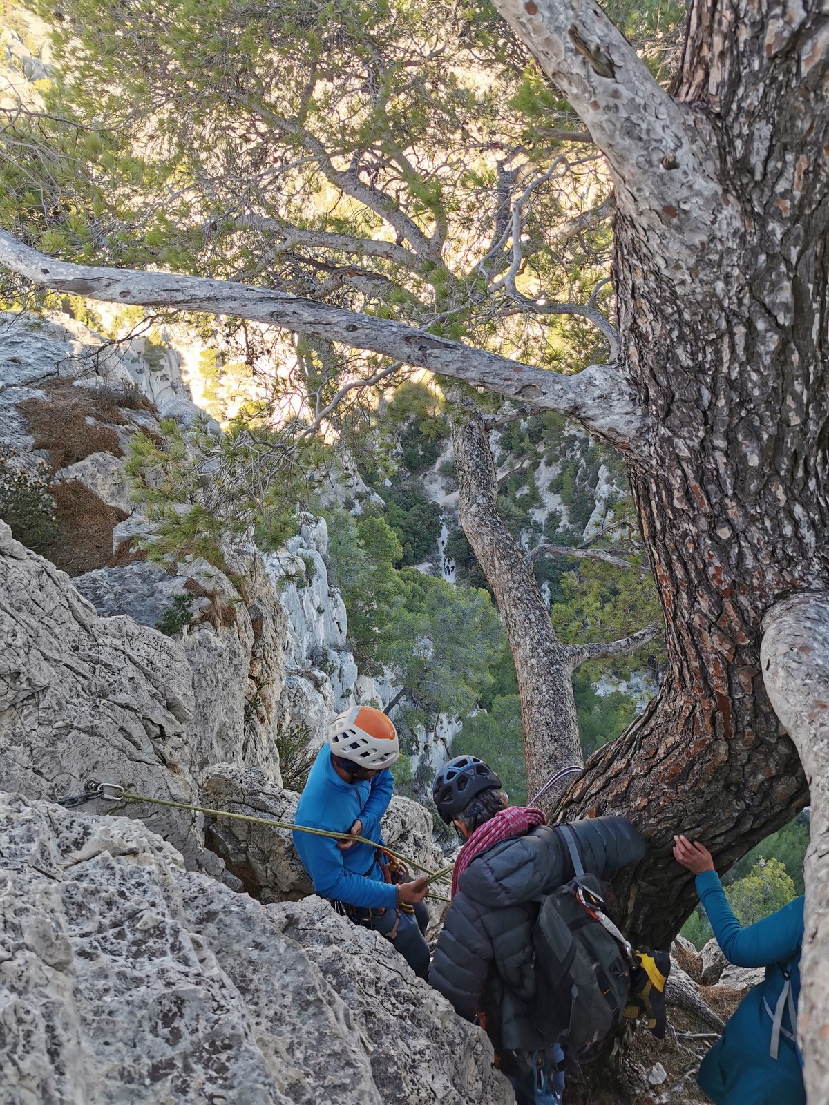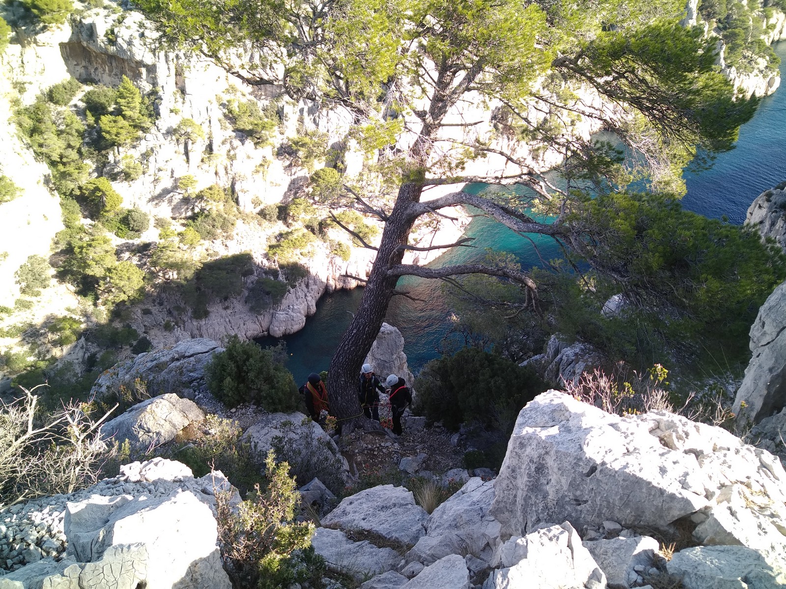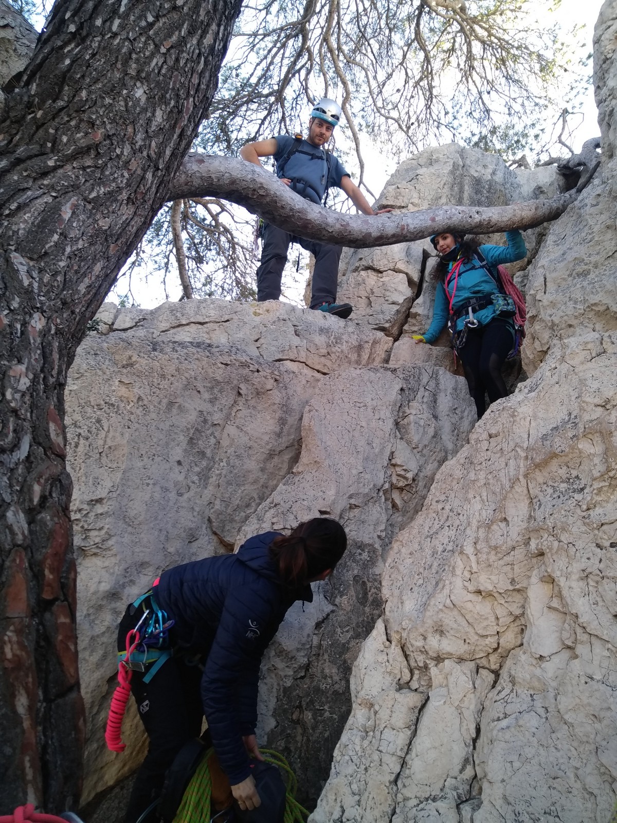La cordée Xavier, Stéphanie et JP ont choisi la voie la plus dure du jour, le Calendal avec une longueur en 6b. Elle commence par un rappel pour aller chercher une première longueur au bord de l’eau. Ils s’installent pendant que je fais des allers et retours pour vérifier que tout le monde a ce qu’il faut. Dans la voie la plus facile, la Calanque, Djé est missionné pour s’occuper de Sandrine, fraîchement opérée de la main mais qui ne voulait manquer la journée sous aucun prétexte, et de Saliha. Derrière, Laura et Brice gagnent en responsabilité et doivent assurer avec Julien qui fait sa première grande voie.