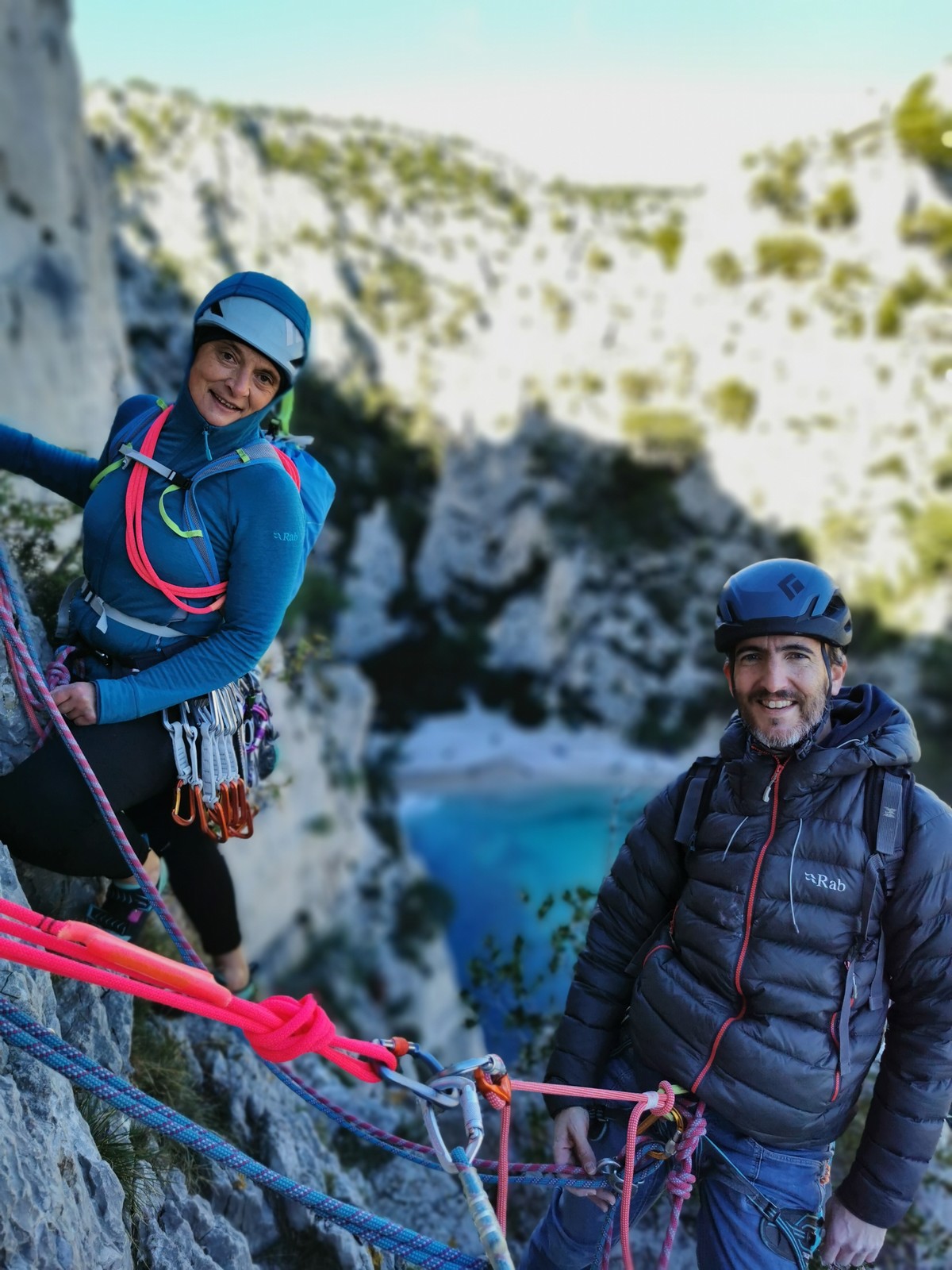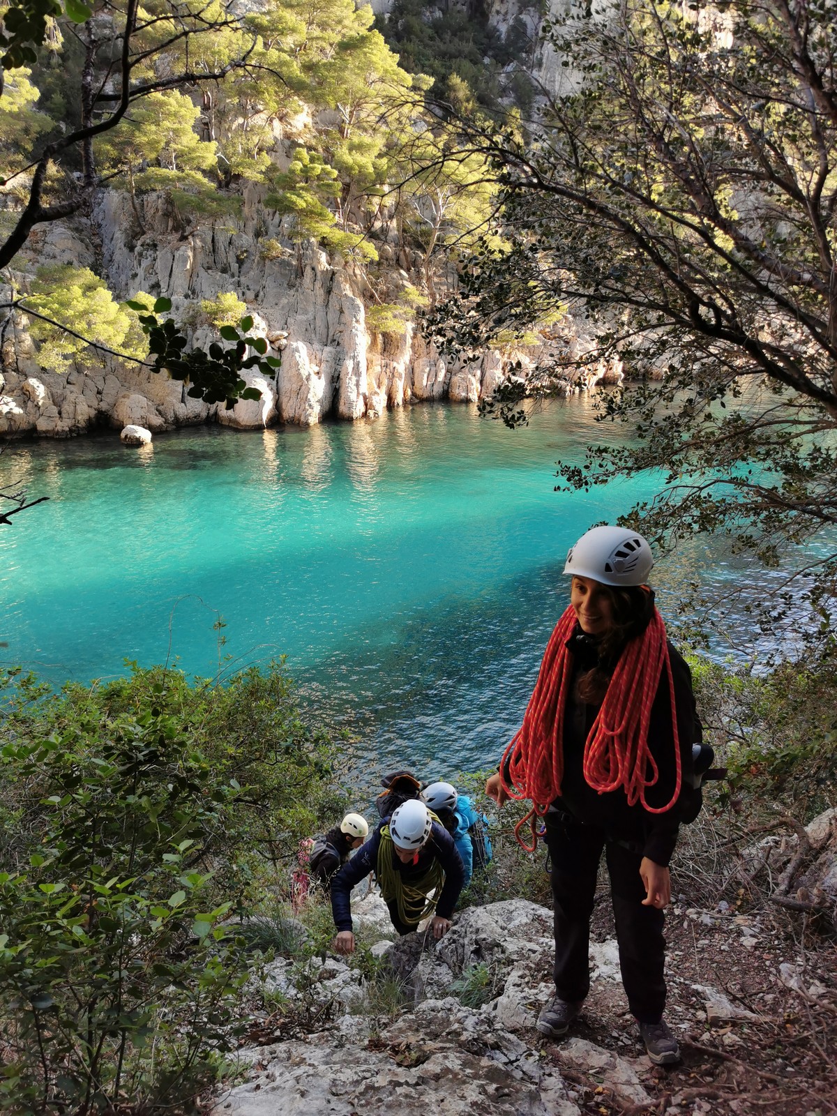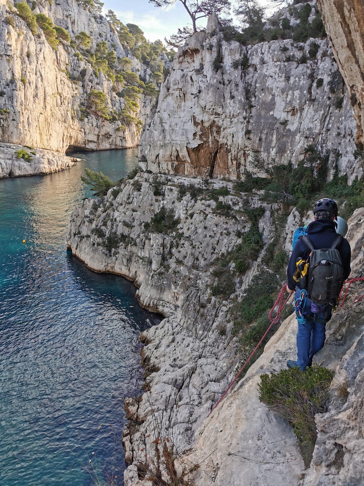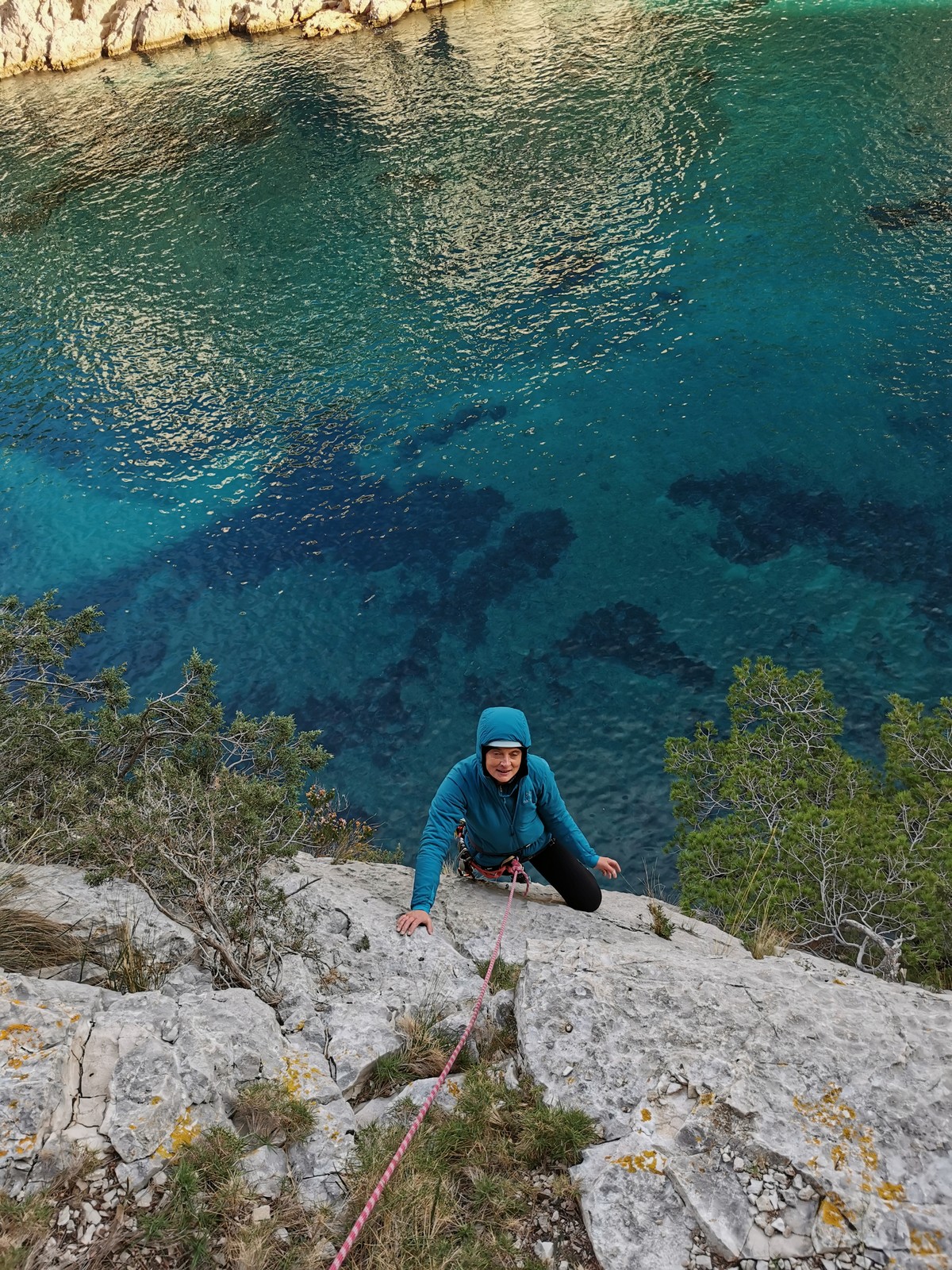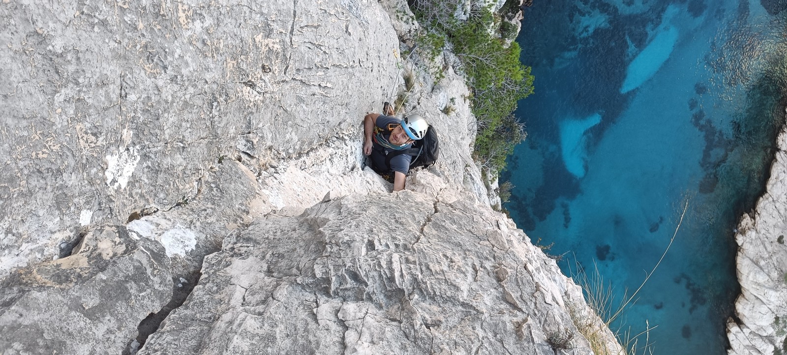 La cordée Xavier, Stéphanie et JP ont choisi la voie la plus dure du jour, le Calendal avec une longueur en 6b. Elle commence par un rappel pour aller chercher une première longueur au bord de l’eau. Ils s’installent pendant que je fais des allers et retours pour vérifier que tout le monde a ce qu’il faut. Dans la voie la plus facile, la Calanque, Djé est missionné pour s’occuper de Sandrine, fraîchement opérée de la main mais qui ne voulait manquer la journée sous aucun prétexte, et de Saliha. Derrière, Laura et Brice gagnent en responsabilité et doivent assurer avec Julien qui fait sa première grande voie.