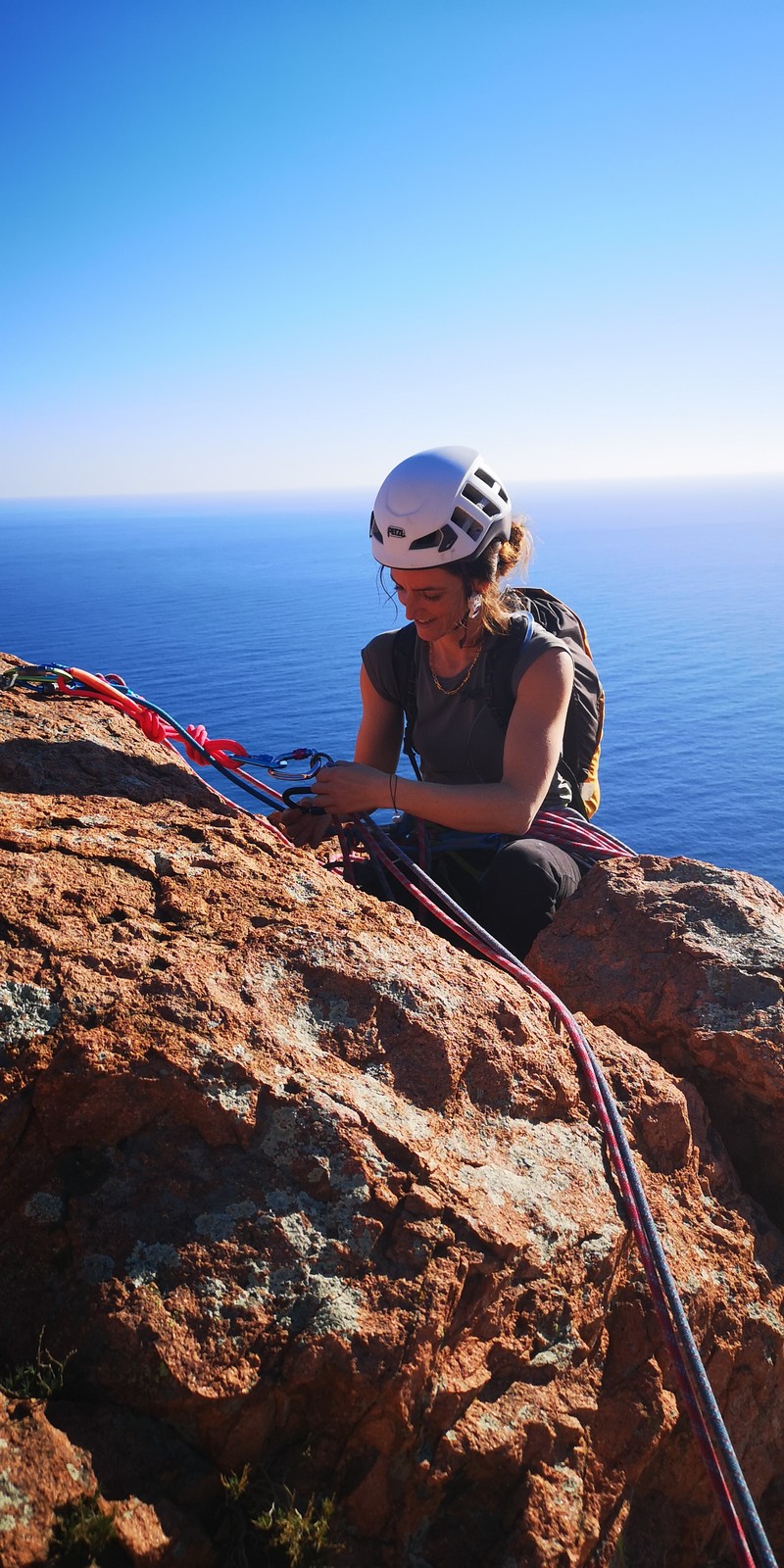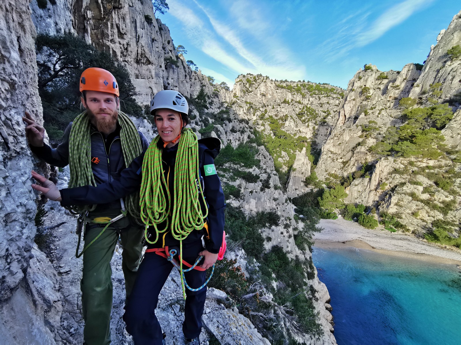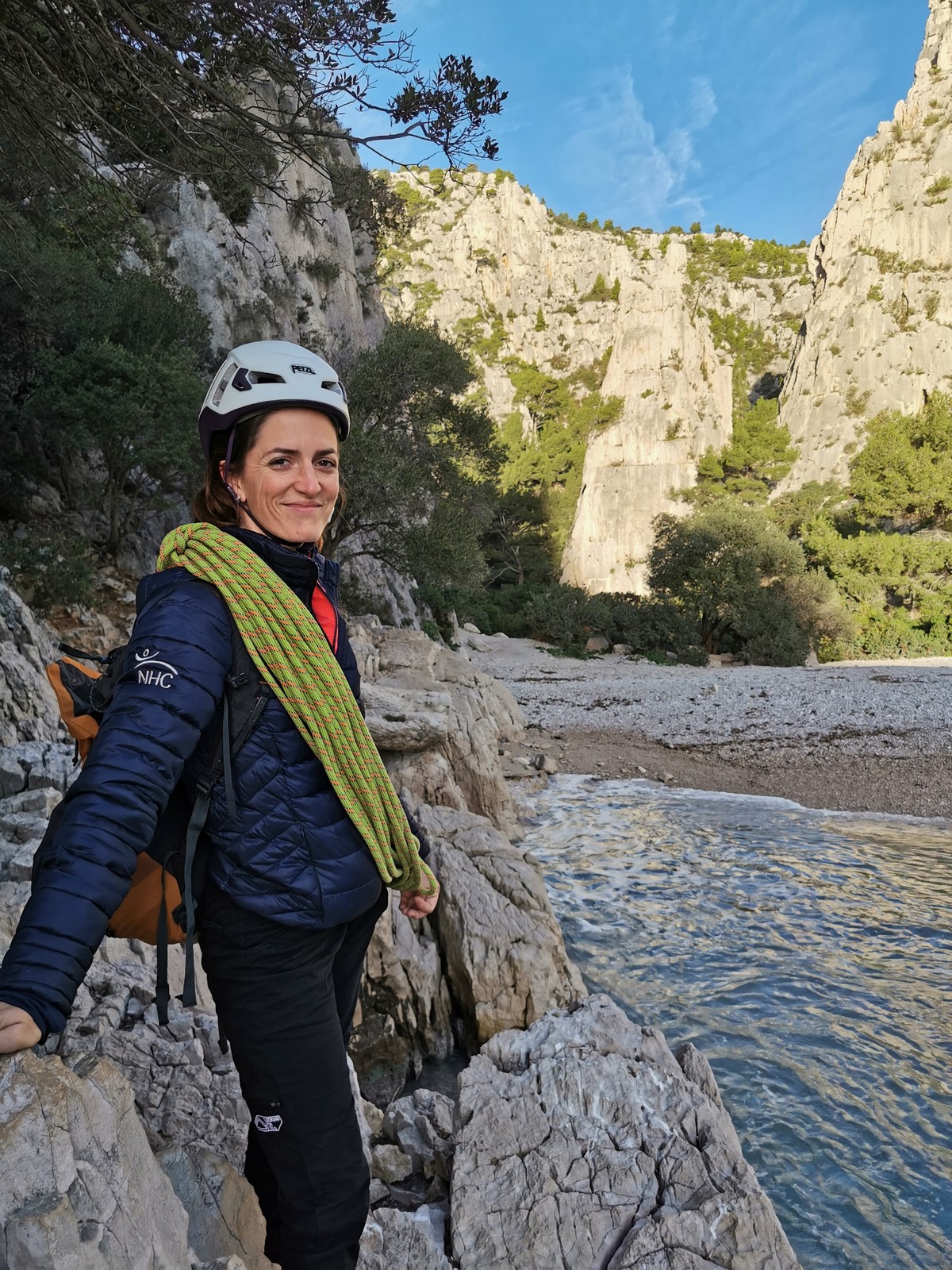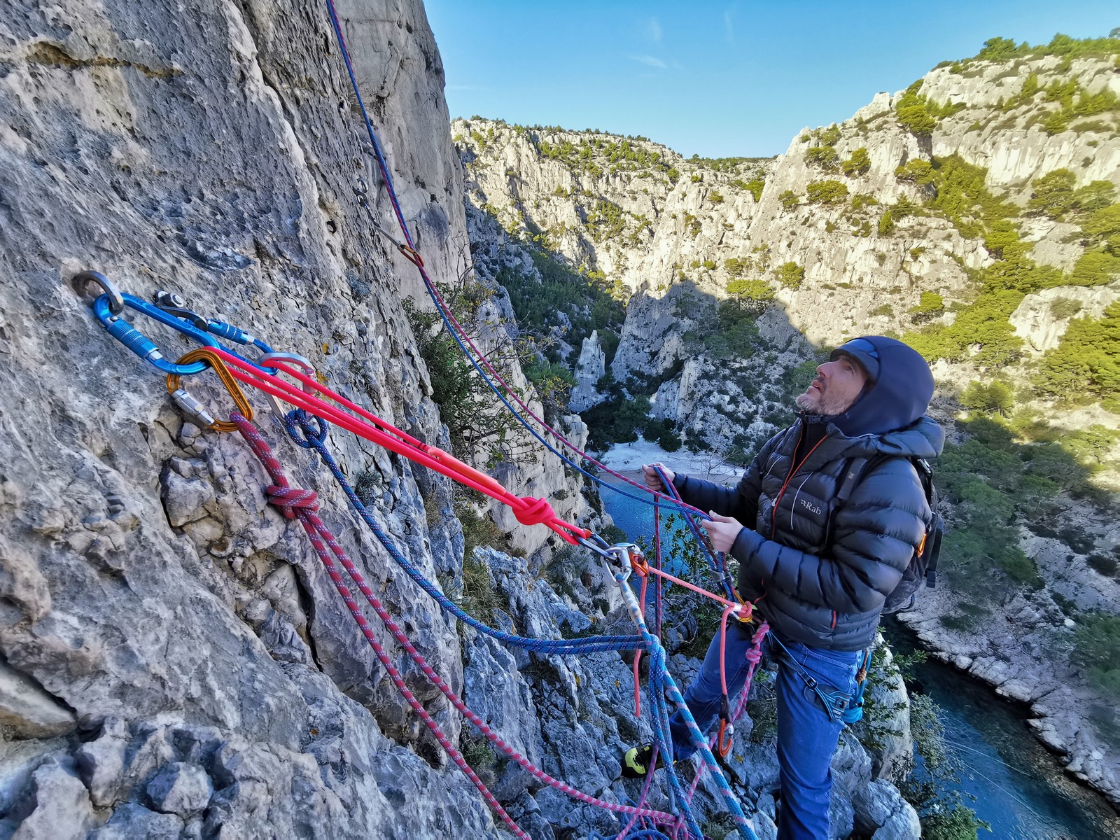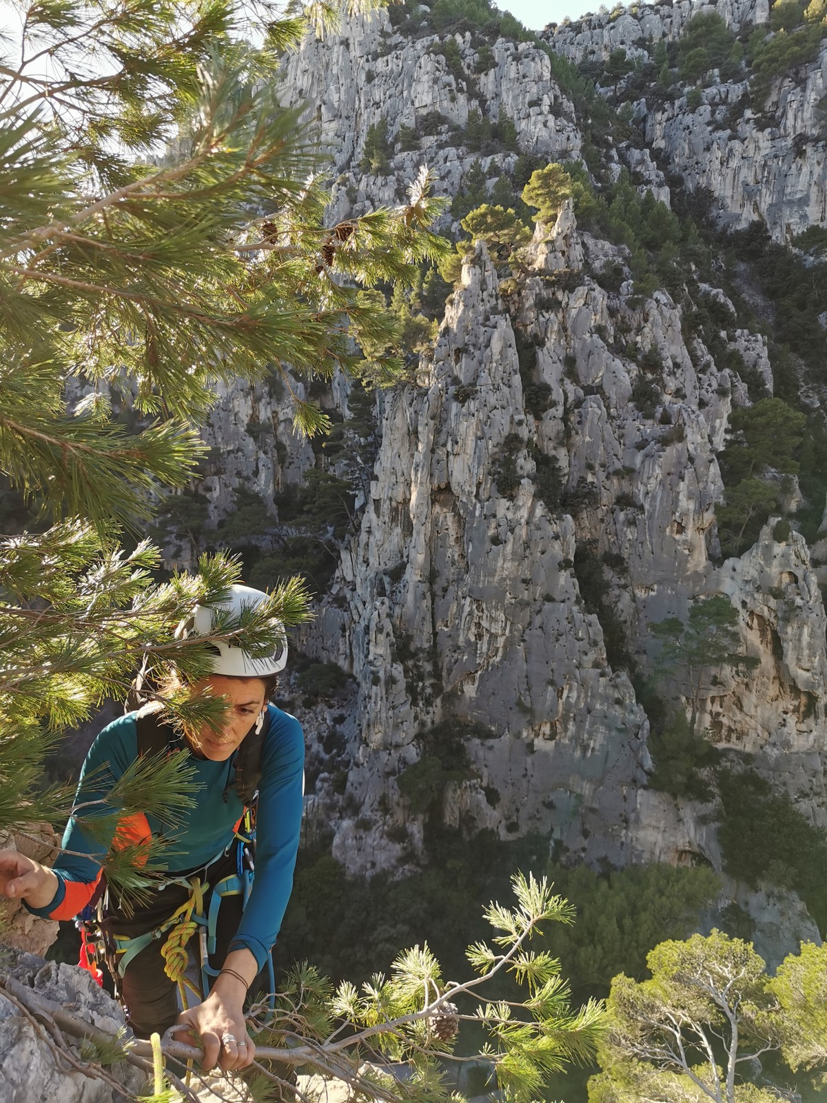 La cordée Xavier, Stéphanie et JP ont choisi la voie la plus dure du jour, le Calendal avec une longueur en 6b. Elle commence par un rappel pour aller chercher une première longueur au bord de l’eau. Ils s’installent pendant que je fais des allers et retours pour vérifier que tout le monde a ce qu’il faut. Dans la voie la plus facile, la Calanque, Djé est missionné pour s’occuper de Sandrine, fraîchement opérée de la main mais qui ne voulait manquer la journée sous aucun prétexte, et de Saliha. Derrière, Laura et Brice gagnent en responsabilité et doivent assurer avec Julien qui fait sa première grande voie.