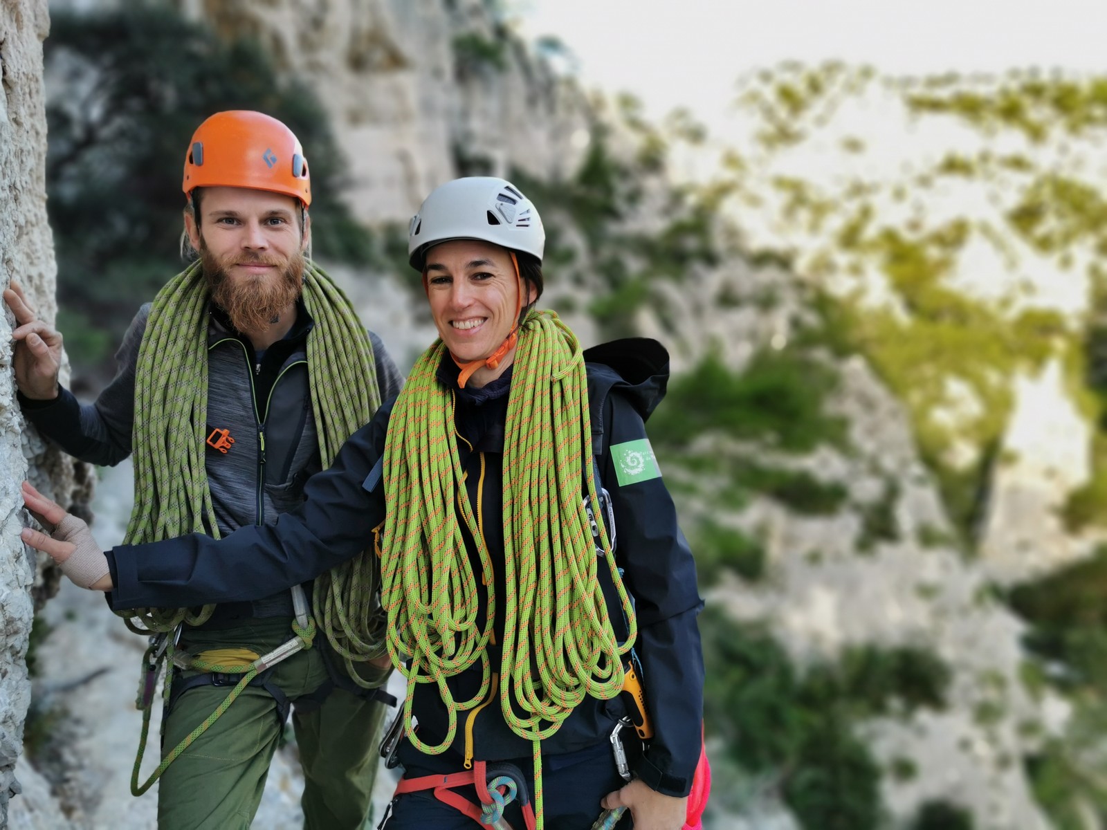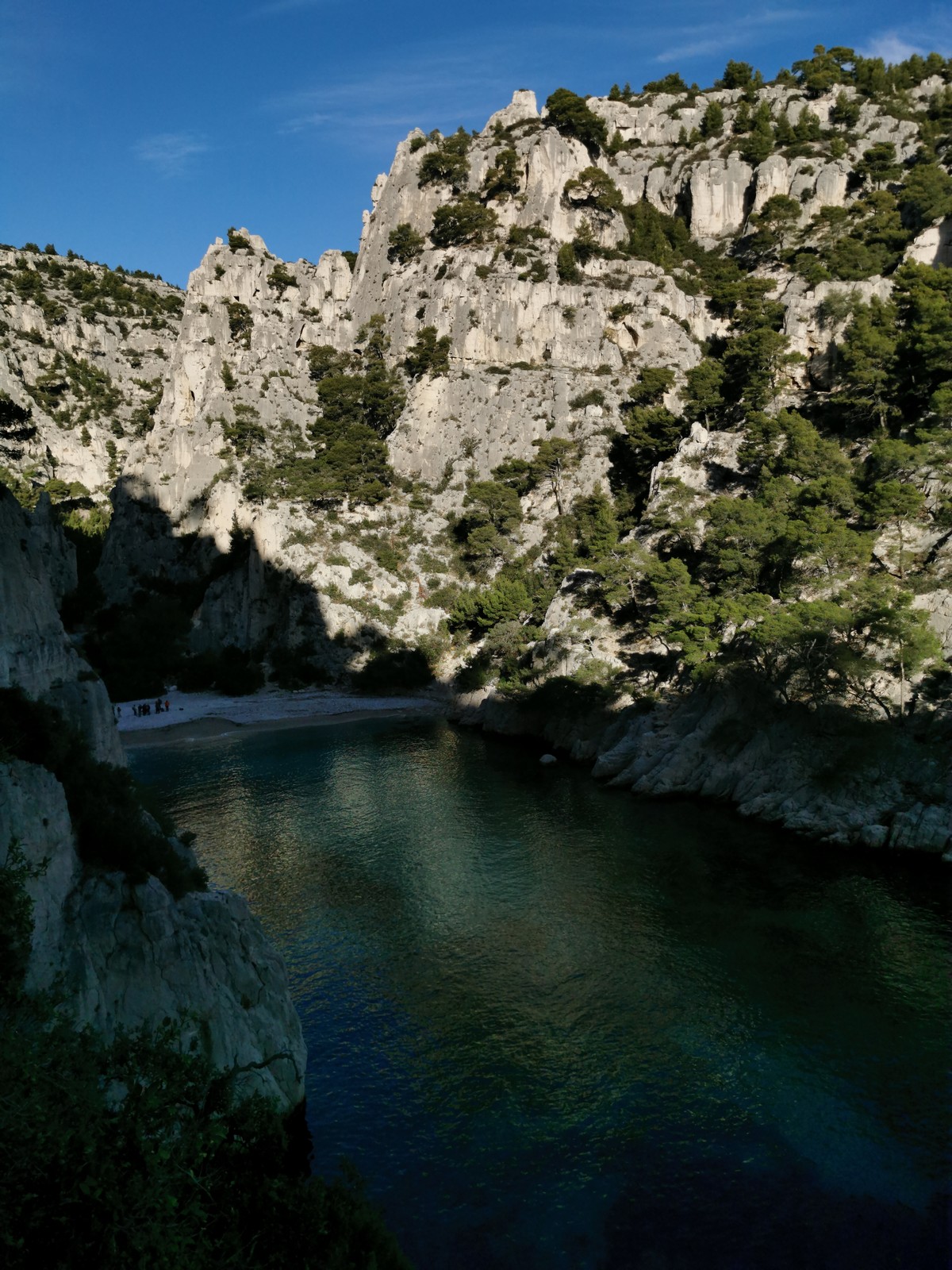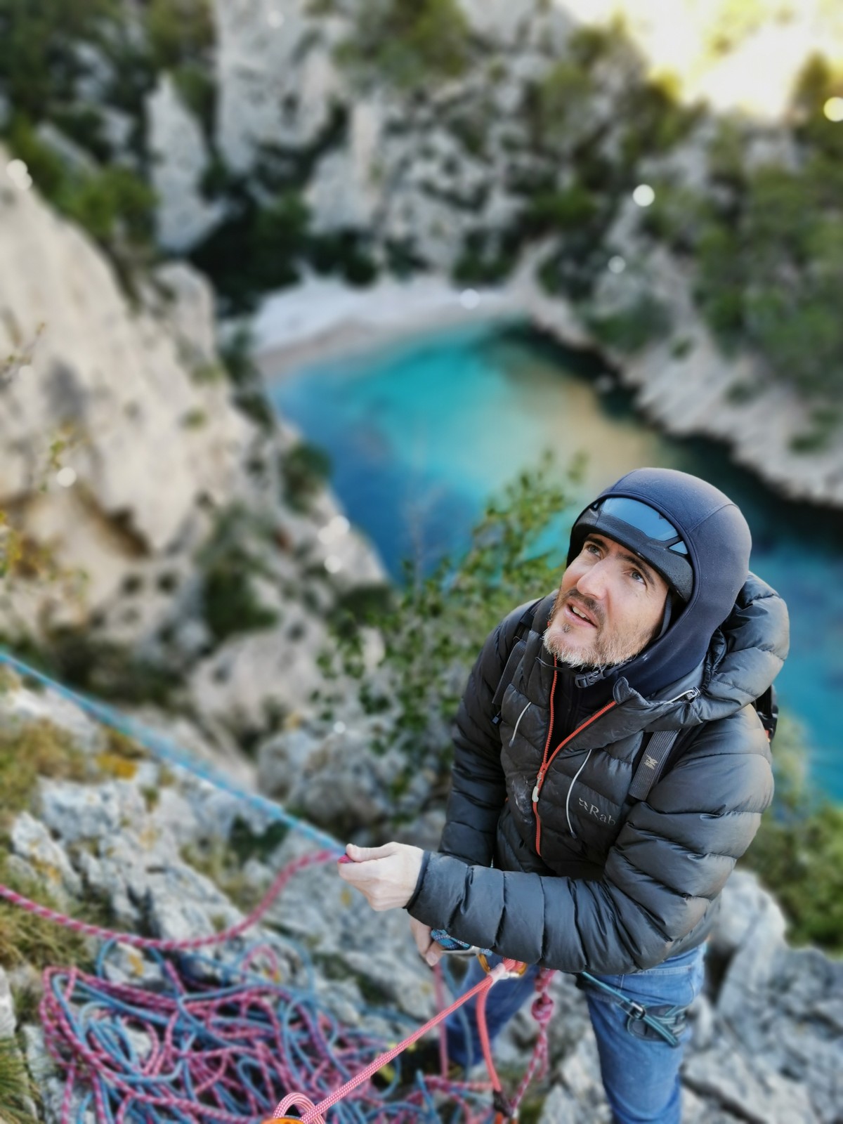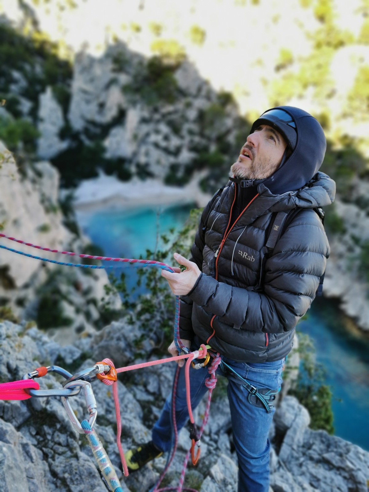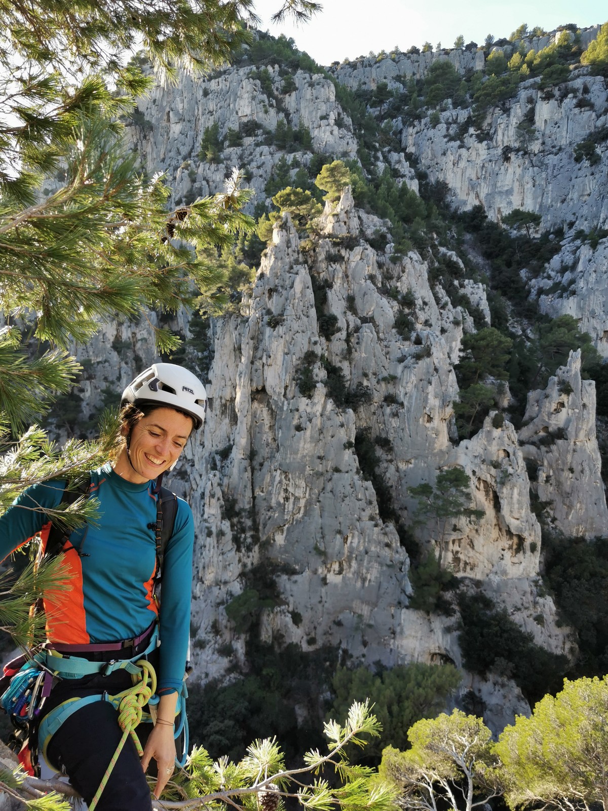 La cordée Xavier, Stéphanie et JP ont choisi la voie la plus dure du jour, le Calendal avec une longueur en 6b. Elle commence par un rappel pour aller chercher une première longueur au bord de l’eau. Ils s’installent pendant que je fais des allers et retours pour vérifier que tout le monde a ce qu’il faut. Dans la voie la plus facile, la Calanque, Djé est missionné pour s’occuper de Sandrine, fraîchement opérée de la main mais qui ne voulait manquer la journée sous aucun prétexte, et de Saliha. Derrière, Laura et Brice gagnent en responsabilité et doivent assurer avec Julien qui fait sa première grande voie.