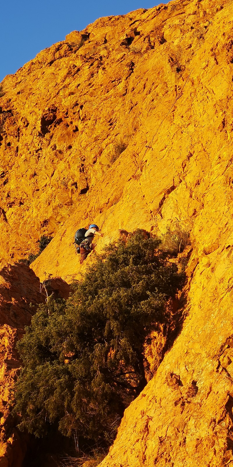 Cécile, qui n’aime pas trop perdre son temps, essaie d’organiser les cordées avec ceux qui restent tandis que je fais passer Stéphanie, Xav et JP qui sont finalement sortis de leur voie mais n’ont pas eu le temps de manger ! Lorsque je rejoins le groupe, on est à peu près calés. Ils sont 6 à vouloir rentrer. Pour les autres, c’est reparti pour un tour. Gros avantage, cette fois on est au soleil ! Mais il est 14h30, on a encore 3h de lumière.