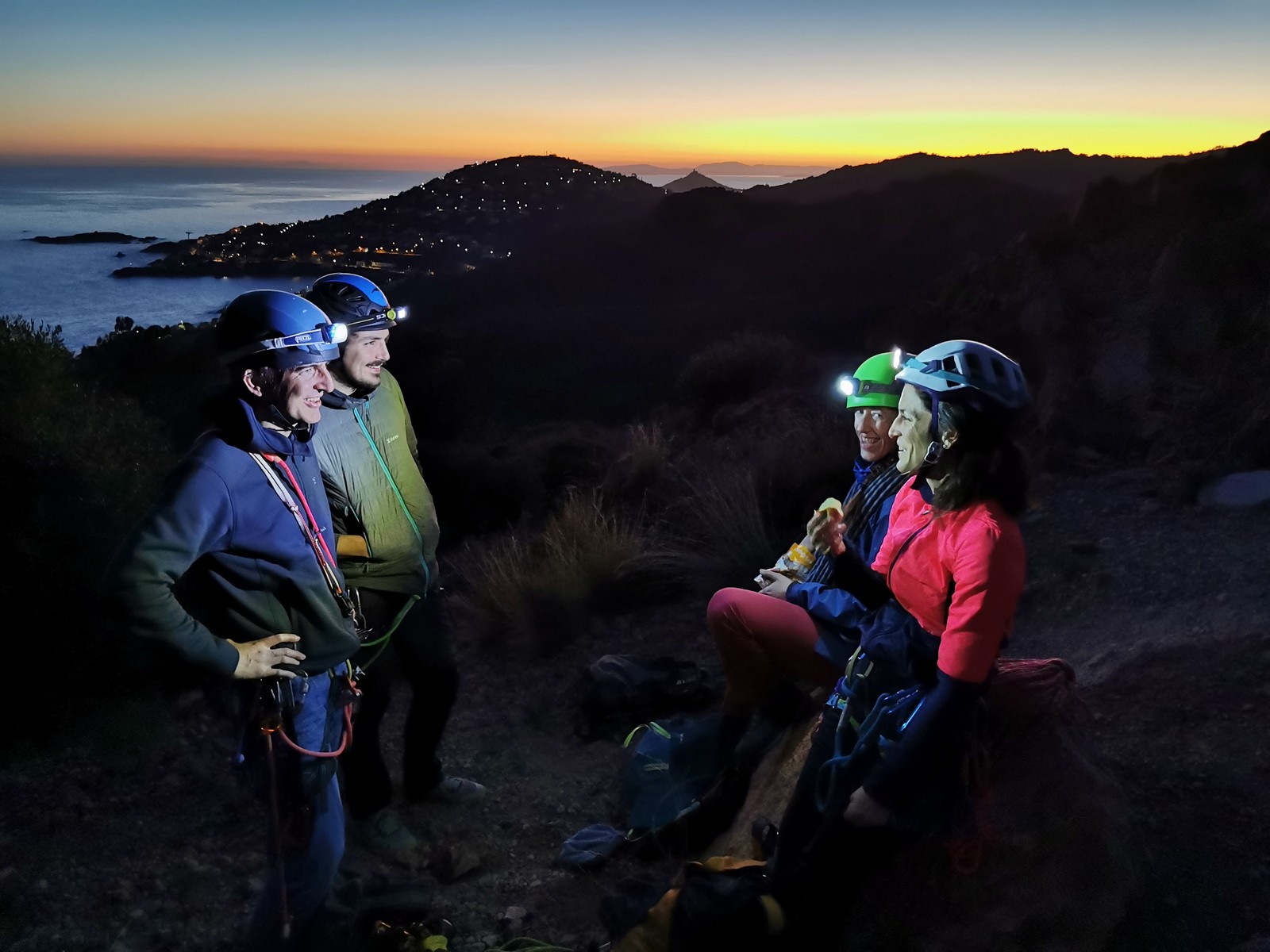 Dans les Schtroumpfs, ça a été un peu plus compliqué. Brice découvrait le TA mais il était tout seul pour ça. Il a surprotégé et pris beaucoup de temps. Ca a permis à la cordée des rappeleurs de les recoller et même de les doubler. Cécile est devant, bille en tête et c’est trop facile pour qu’elle perde du temps à mettre beaucoup de protections. Elle trace entraînant Julien et François. Ce sont eux qui arrivent en premier au sommet. Jean-Luc arrive juste derrière et finalement, avec la lumière déclinante, on voit la frontale que Brice avait allumée sortir du dernier mur raide. Tout le monde est là ! On finit de faire un tri sommaire, on plie, et on décolle rapidement pour profiter du peu de lumière qu’il nous reste pour la descente du sommet un peu engagée. Le retour se fait sans problème, il est 18h et il fait complètement nuit quand nous sommes à la voiture.