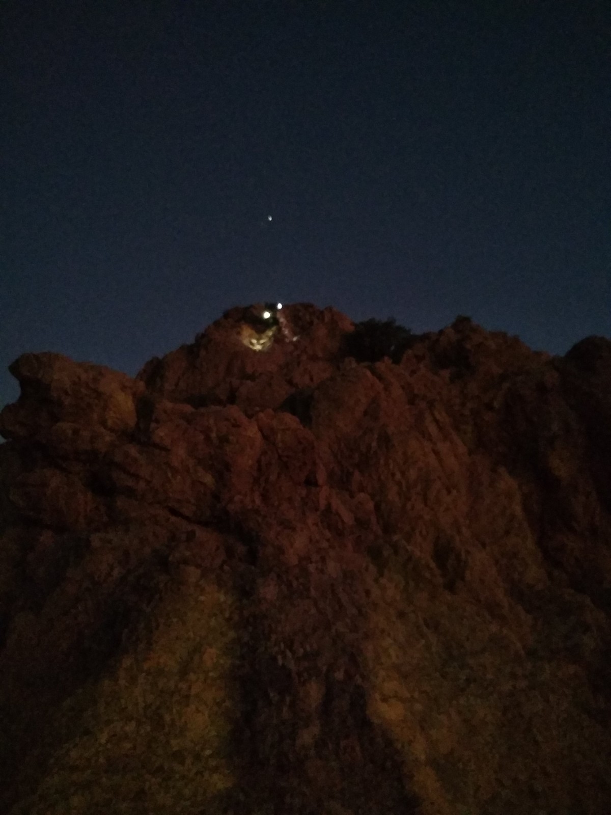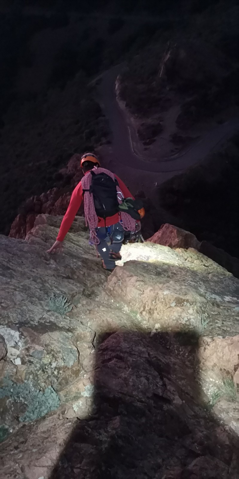 Cécile part en trombe dans la Saphir, petite voie équipée, avec Julien et JP. Camille se prend au jeu du TA et prend François et Brice dans l’arête des garçons de café. Et moi je reste avec Gautier, mais cette fois avec Laura et Xav dans la directe de la Serpentine. Pour nous, c’est du pur TA. On ne croisera quasiment aucun équipement. Gautier s’en sort vraiment bien, jusque dans le pas dur de la longueur clé, un 5a vraiment pas facile. Je vibre en peu en le voyant se mettre au taquet, mais il a bien protégé et parvient à enchainer. Lorque je le rejoins, il me cède la place pour que je termine la voie. Je tire une grande longueur jusqu’au mini gendarme final. On essaie de maniper assez vite pour redescendre derrière. La nuit tombe et le vent a forci, on gèle sur place ! Cécile est sortie depuis longtemps et leur cordée a récupéré les affaires cachées. Camille sort à peu près en même temps que le soleil disparaît. Le temps de faire monter tout le monde et il fait bien nuit !