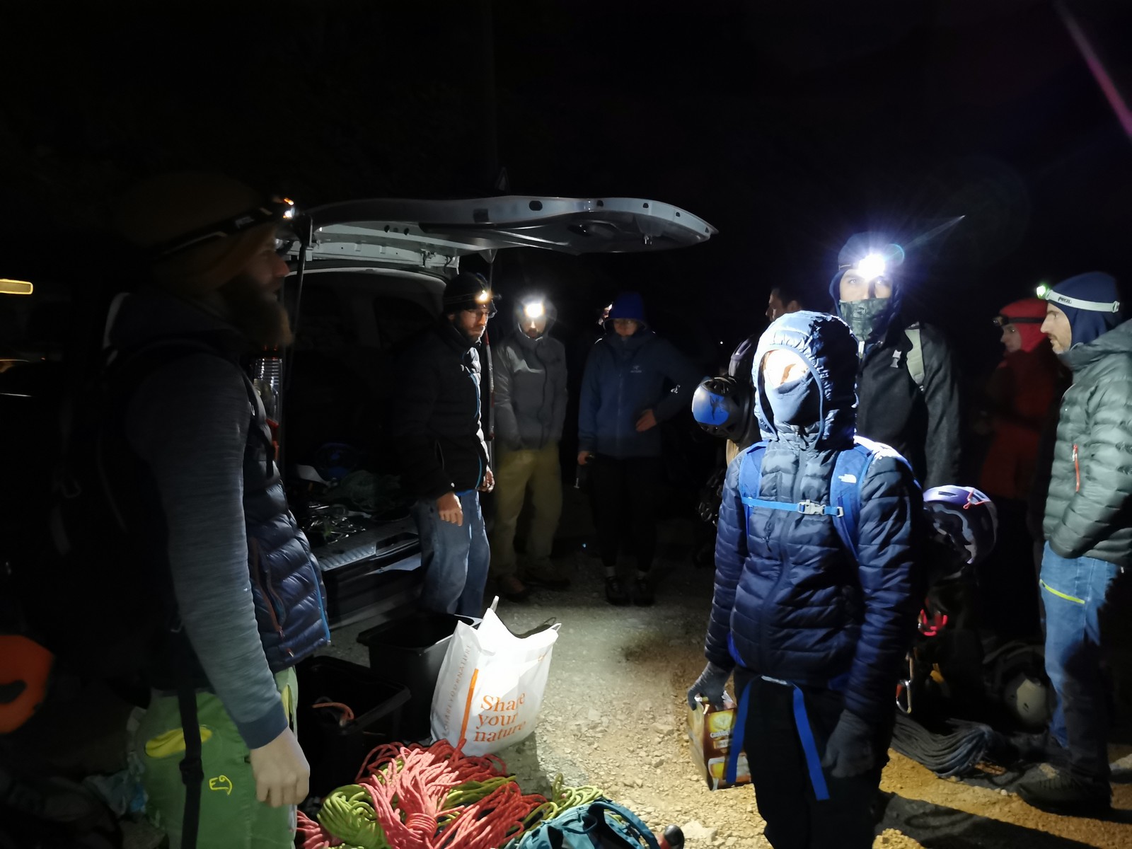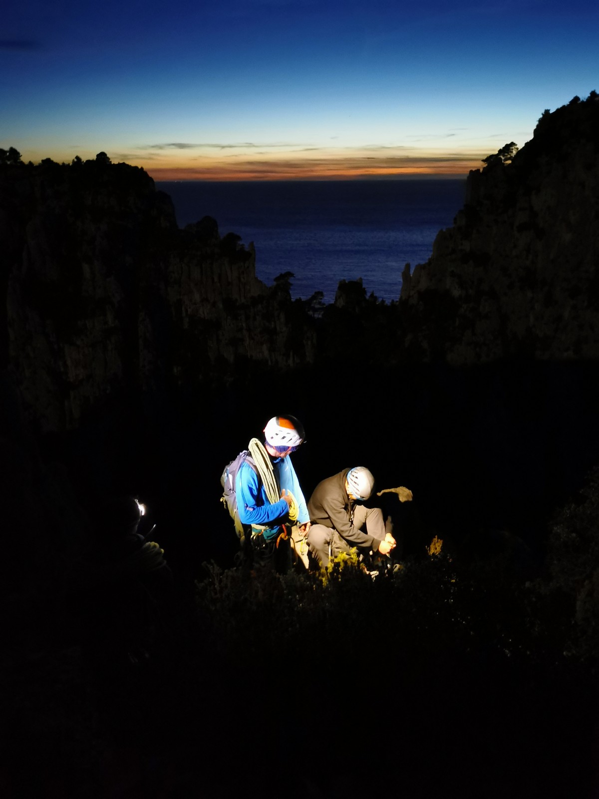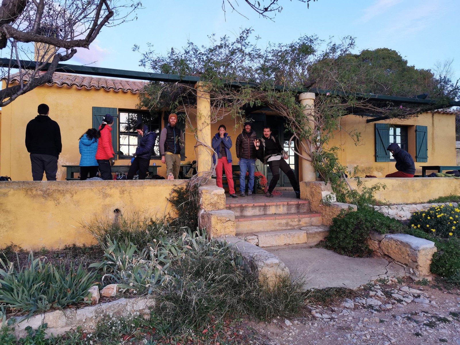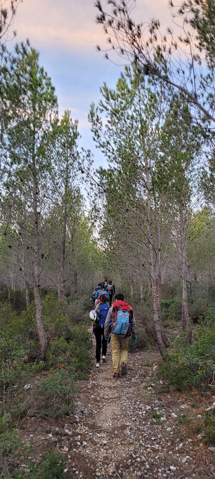 Le rendez-vous est donné à Sauvaigo à 17h30 directement après mes cours. Je suis le dernier à arriver et pas le temps de trop discuter, il faut arriver à l’auberge avant 20h30 ! On charge les voitures et c’est parti direction le petit parking de la calanque de Port Miou. Nous arrivons vers 20h, le mistral souffle et il fait froid ! 5 petits degrés au thermomètre ! Le temps de distribuer le matos et on attaque la marche de 30min pour atteindre l’auberge.
