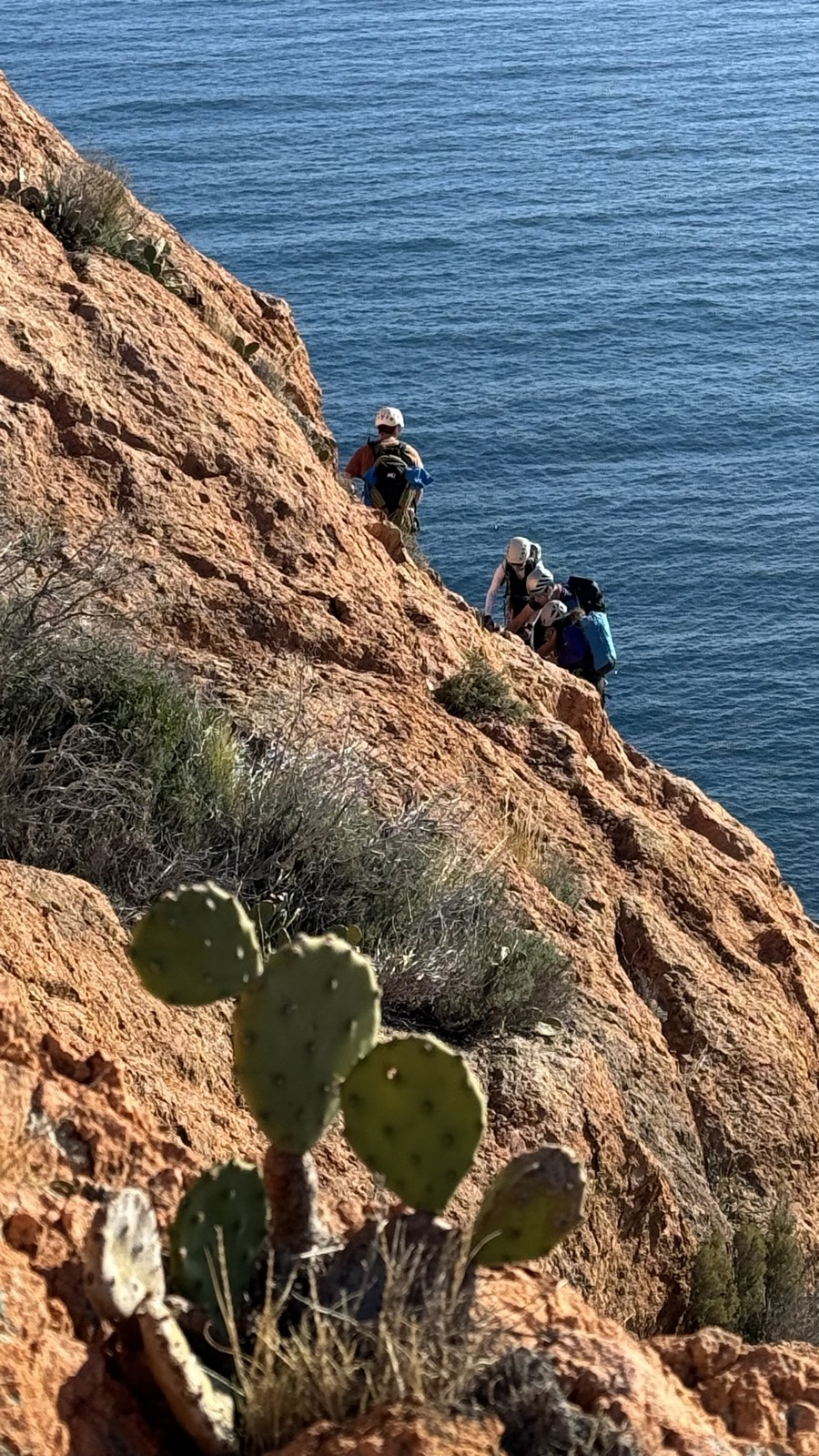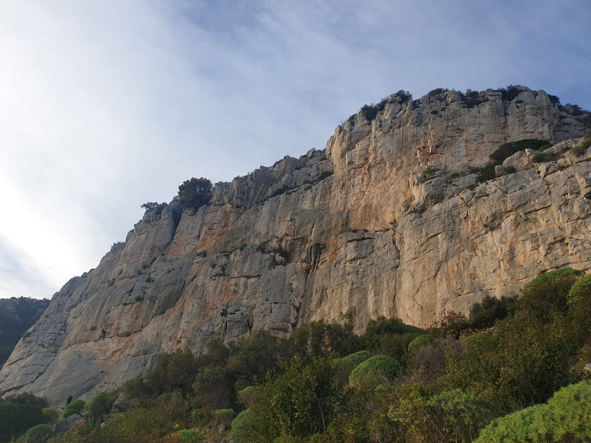 Nous finissons par descendre dans le vallon et arriver à la plage. Le soleil est déjà bien levé. J’avais décidé de faire grimper tout le monde en rive droite, pensant qu’on aurait du soleil le matin. Mais la falaise est orientée NE et le soleil est déjà passé… Ce sera ombre. Il ne fait pas chaud et certains vont souffrir un peu du froid mais ça va, pour une fin novembre, c’est très acceptable et le vent n’est pas de la partie. On cherche l’accès à la vire, point de départ de toutes les voies. Je m’engage dans un petit couloir direct au dessus de la plage pour me rendre compte que ce n’est pas là… Encore du temps perdu. On arrive finalement sur la vire et chacun repère son départ.