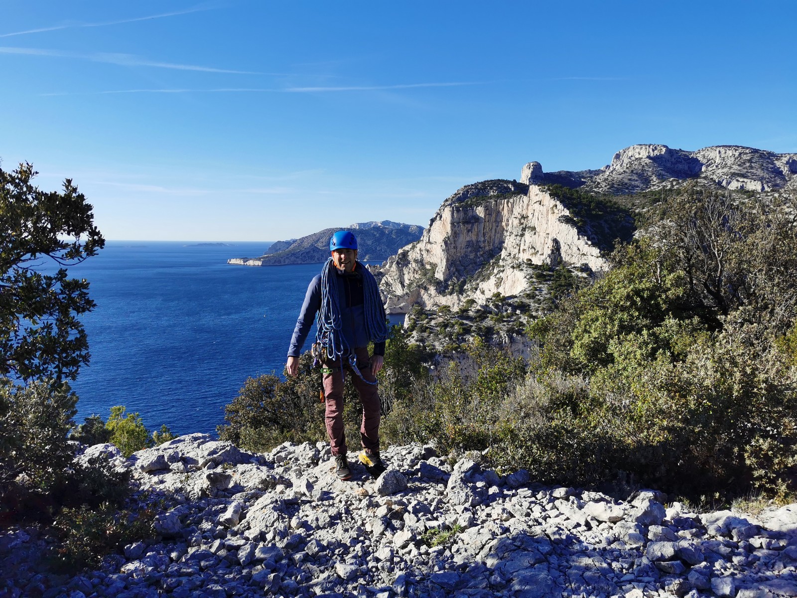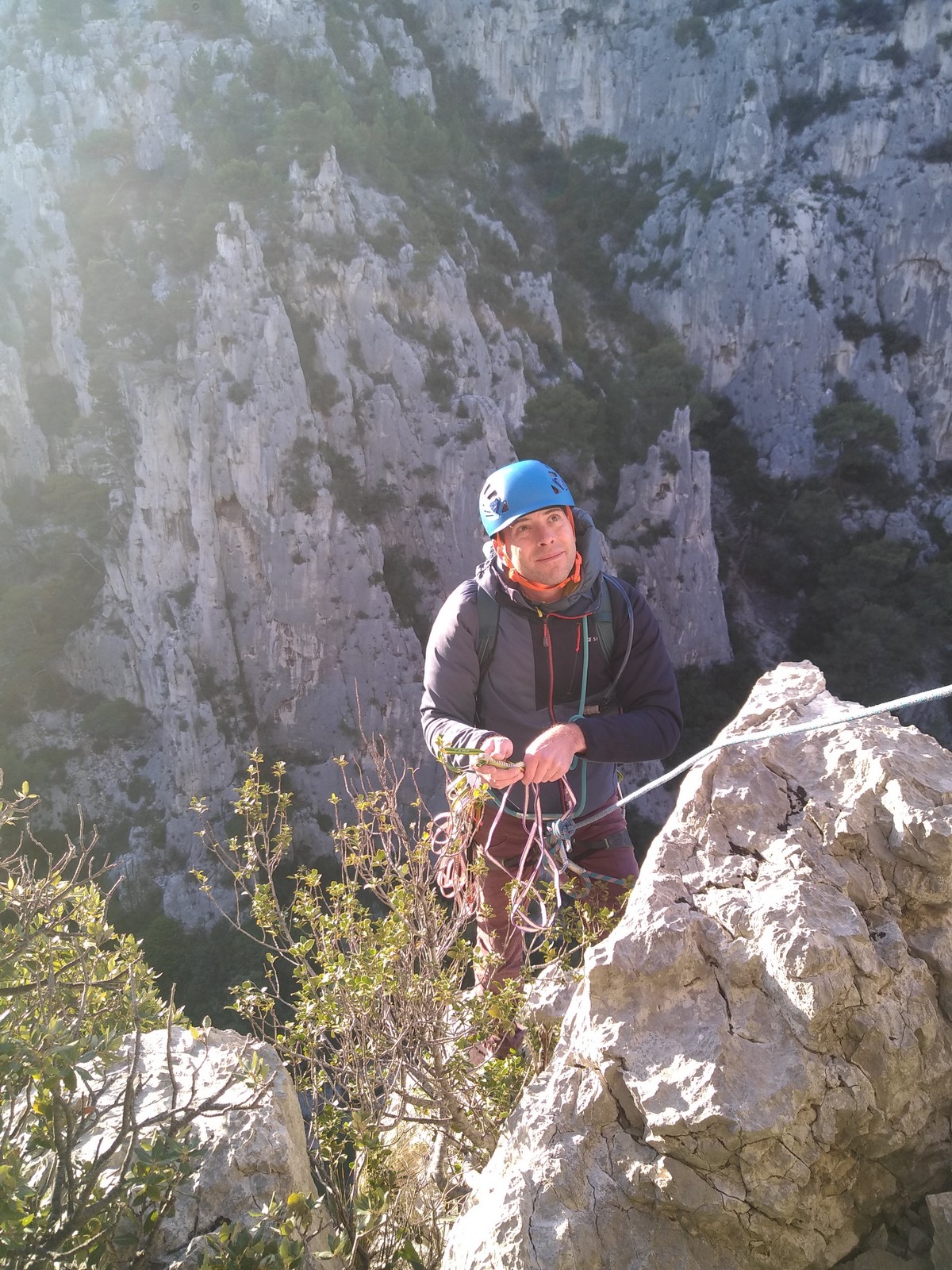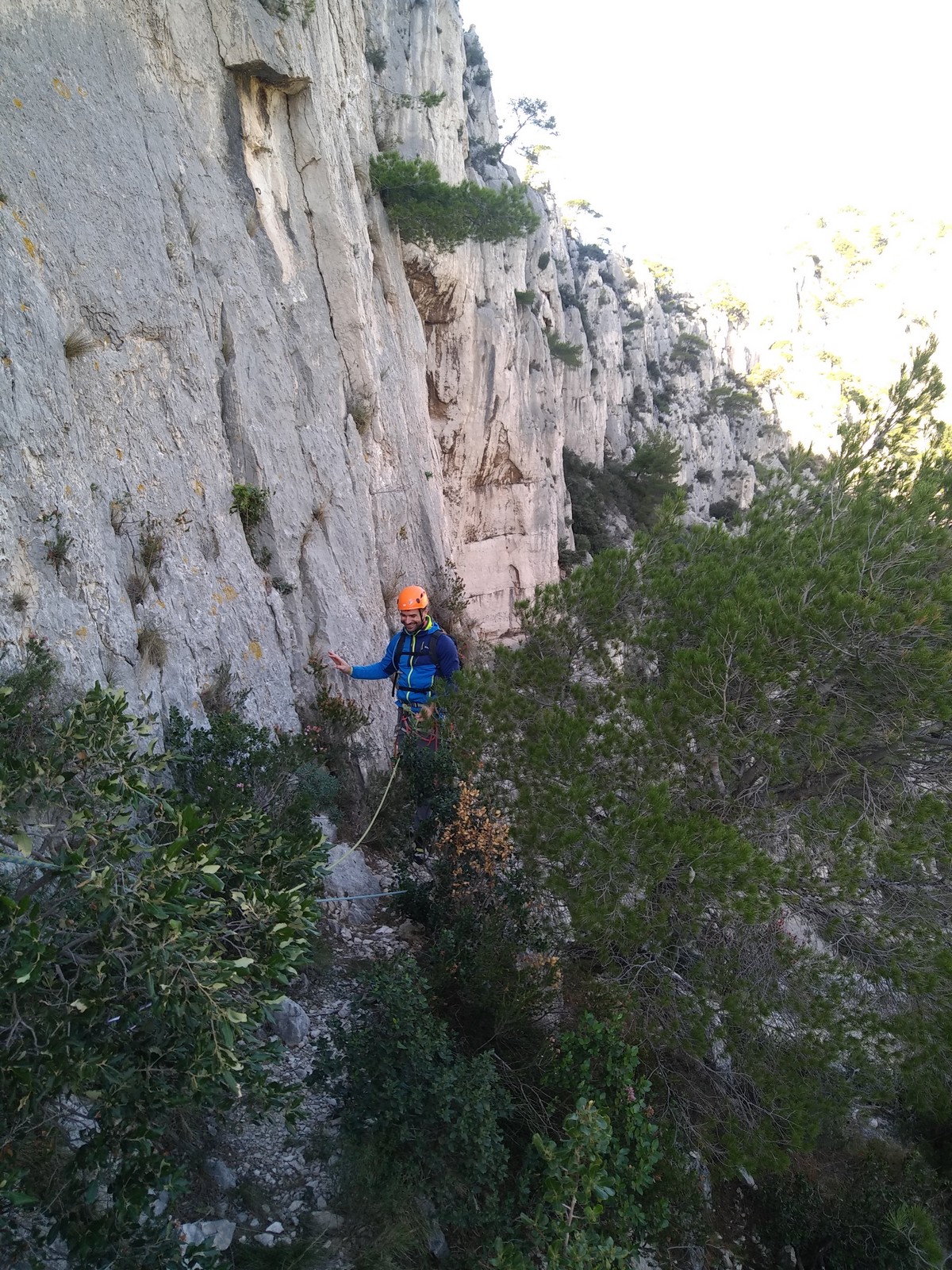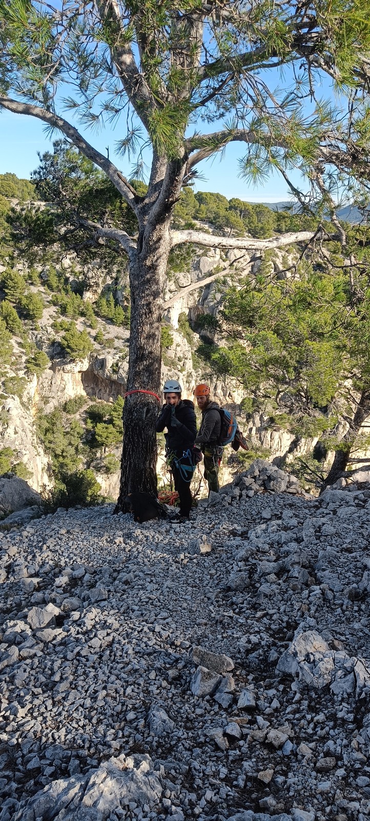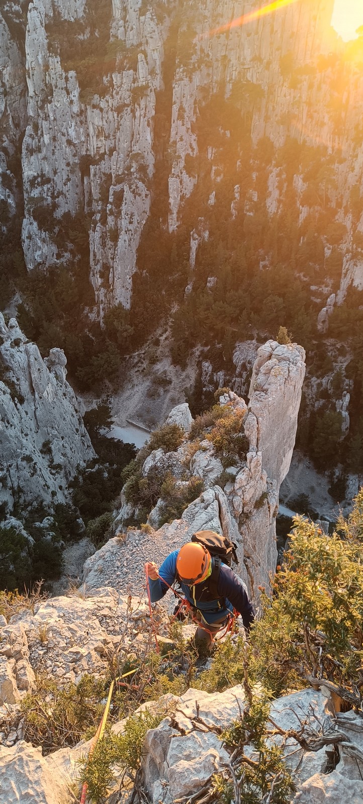 Plutôt moins pour moi et je me lève à 6h30, réveillé depuis belle lurette. Petit déjeuner frugal et je finis de préparer le matériel. On est prêt vers 7h40, 10 petites minutes en retard sur l’horaire prévu. Pas mal… La marche d’approche finit de nous réveiller. Le mistral est tombé, il fait bien moins froid que la veille. On arrive sur le plateau au dessus de la calanque on a décidé de cacher nous sacs avec nos affaires inutiles pour la journée. Dans un groupe comme ça, chaque étape prend du temps. Certains n’avaient pas encore préparé leur sac de grimpe. Je travaille ma patience, sachant pertinemment que chaque minute perdue, c’est du temps de lumière gaché. A cette période de l’année, il fait nuit à 17h30, il ne faut pas trop traîner. Mais il ne faut pas non plus presser…