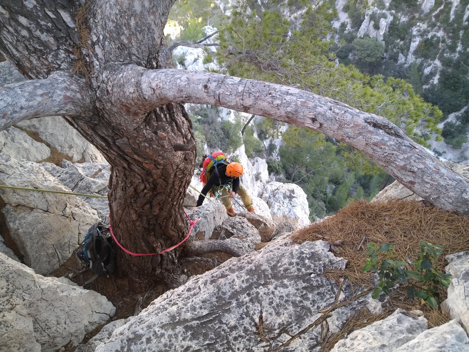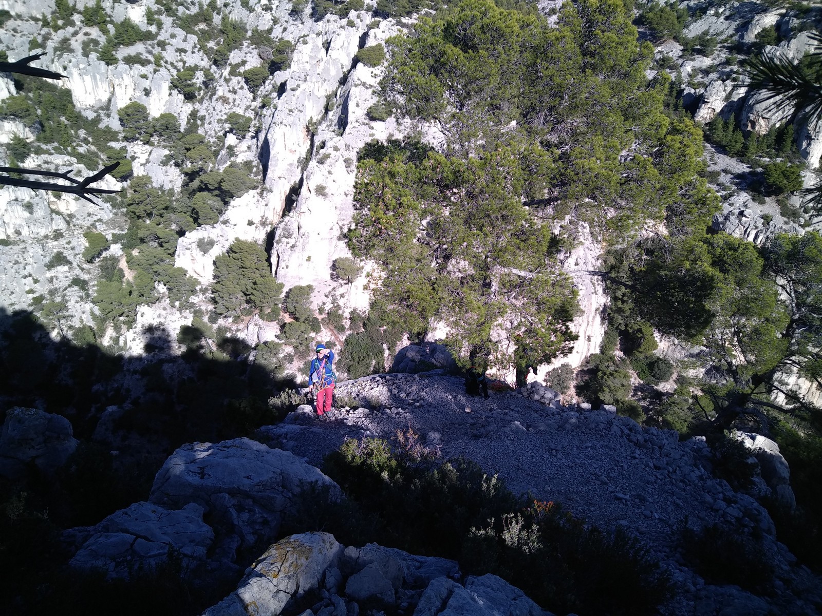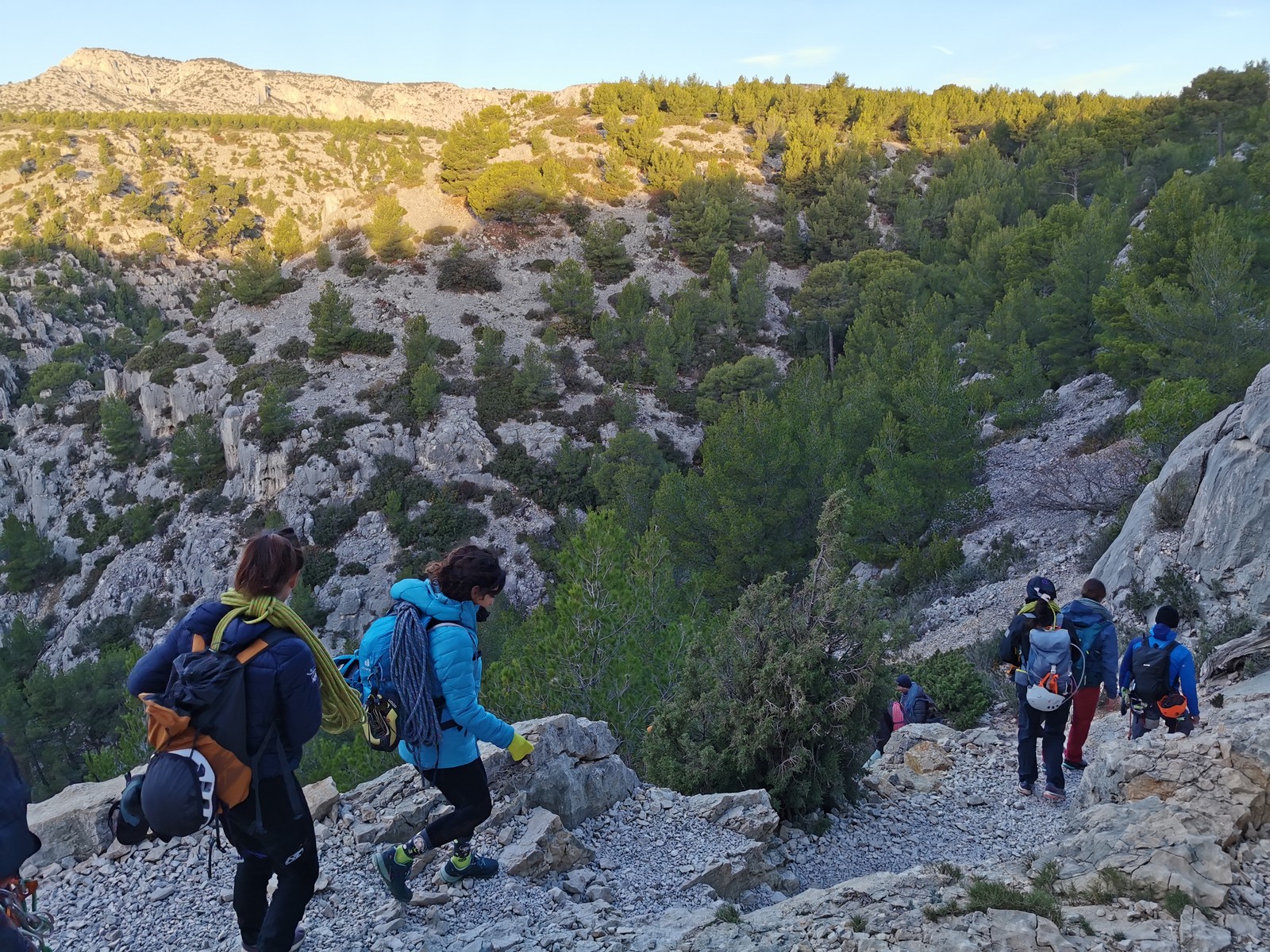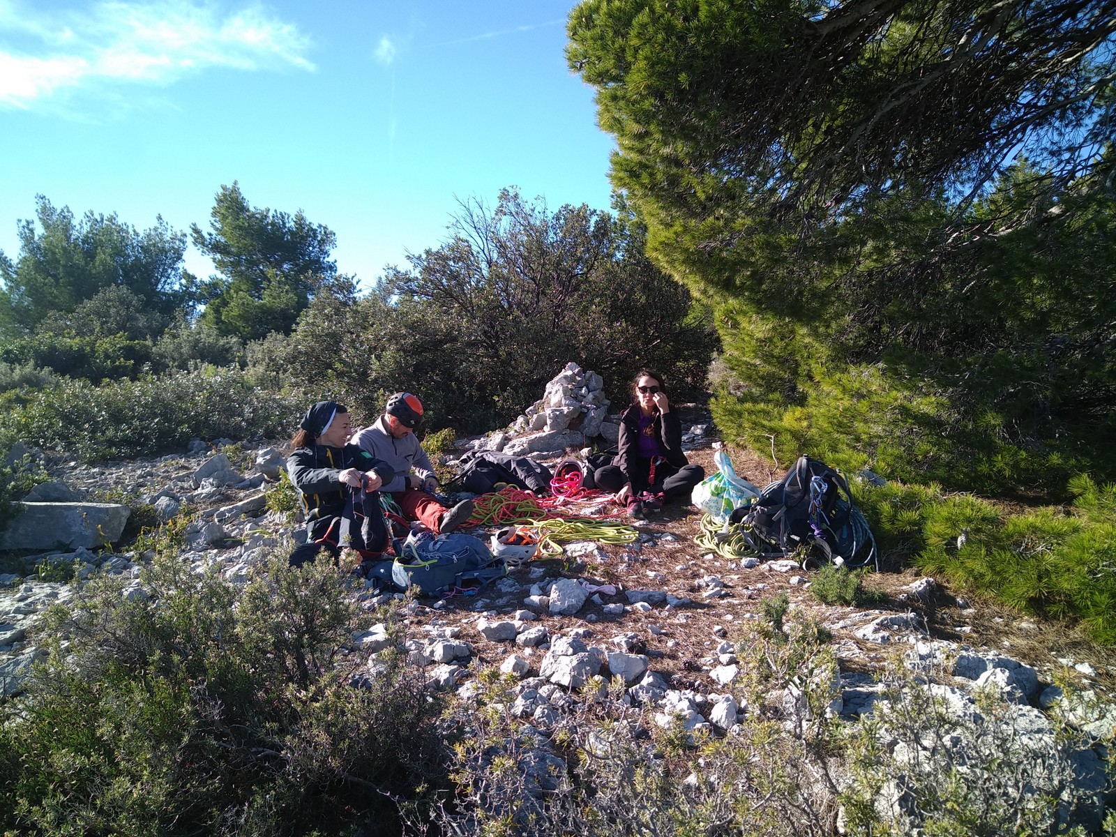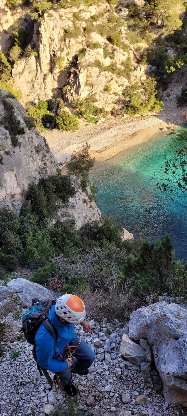 Plutôt moins pour moi et je me lève à 6h30, réveillé depuis belle lurette. Petit déjeuner frugal et je finis de préparer le matériel. On est prêt vers 7h40, 10 petites minutes en retard sur l’horaire prévu. Pas mal… La marche d’approche finit de nous réveiller. Le mistral est tombé, il fait bien moins froid que la veille. On arrive sur le plateau au dessus de la calanque on a décidé de cacher nous sacs avec nos affaires inutiles pour la journée. Dans un groupe comme ça, chaque étape prend du temps. Certains n’avaient pas encore préparé leur sac de grimpe. Je travaille ma patience, sachant pertinemment que chaque minute perdue, c’est du temps de lumière gaché. A cette période de l’année, il fait nuit à 17h30, il ne faut pas trop traîner. Mais il ne faut pas non plus presser…