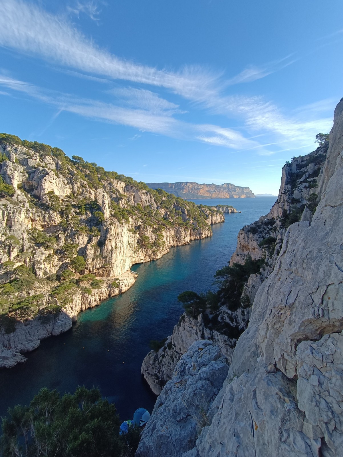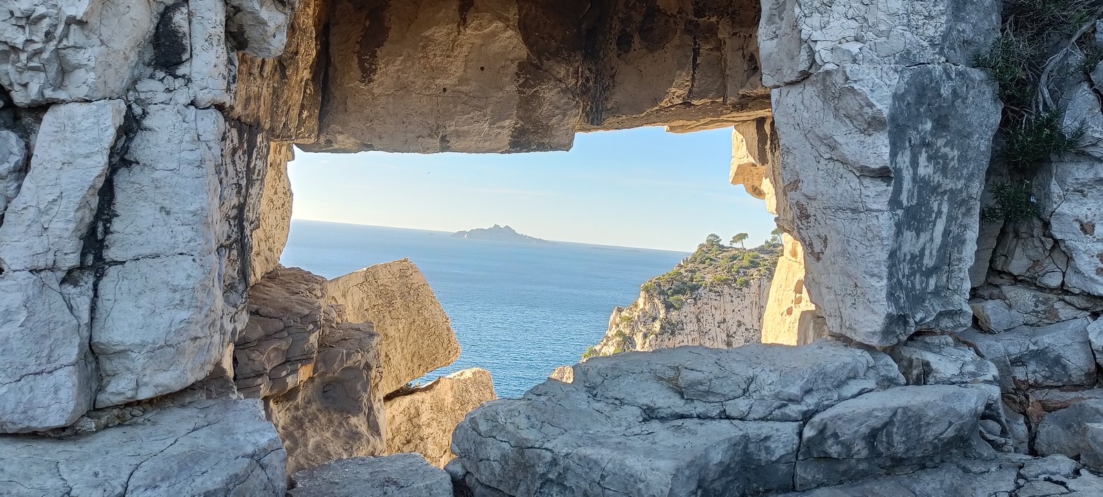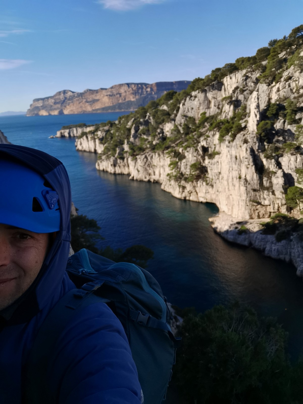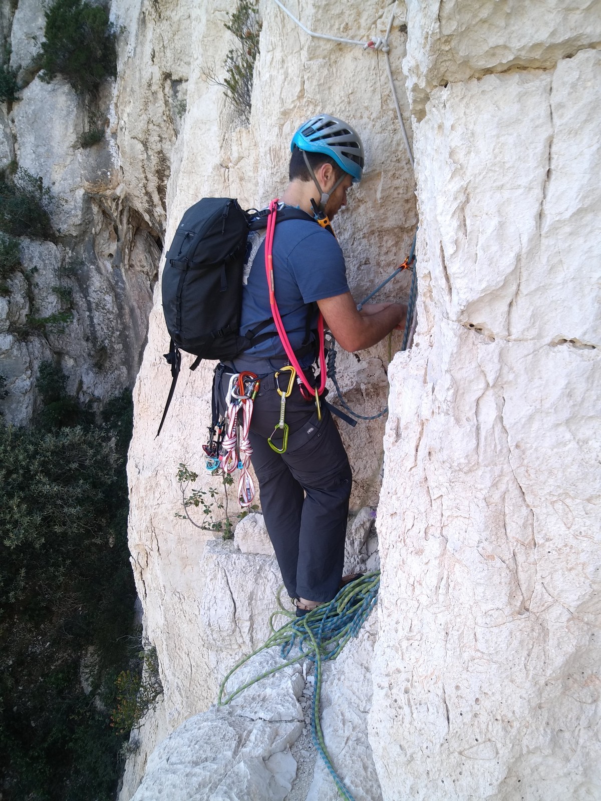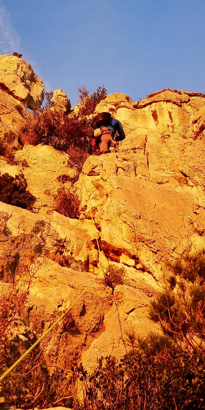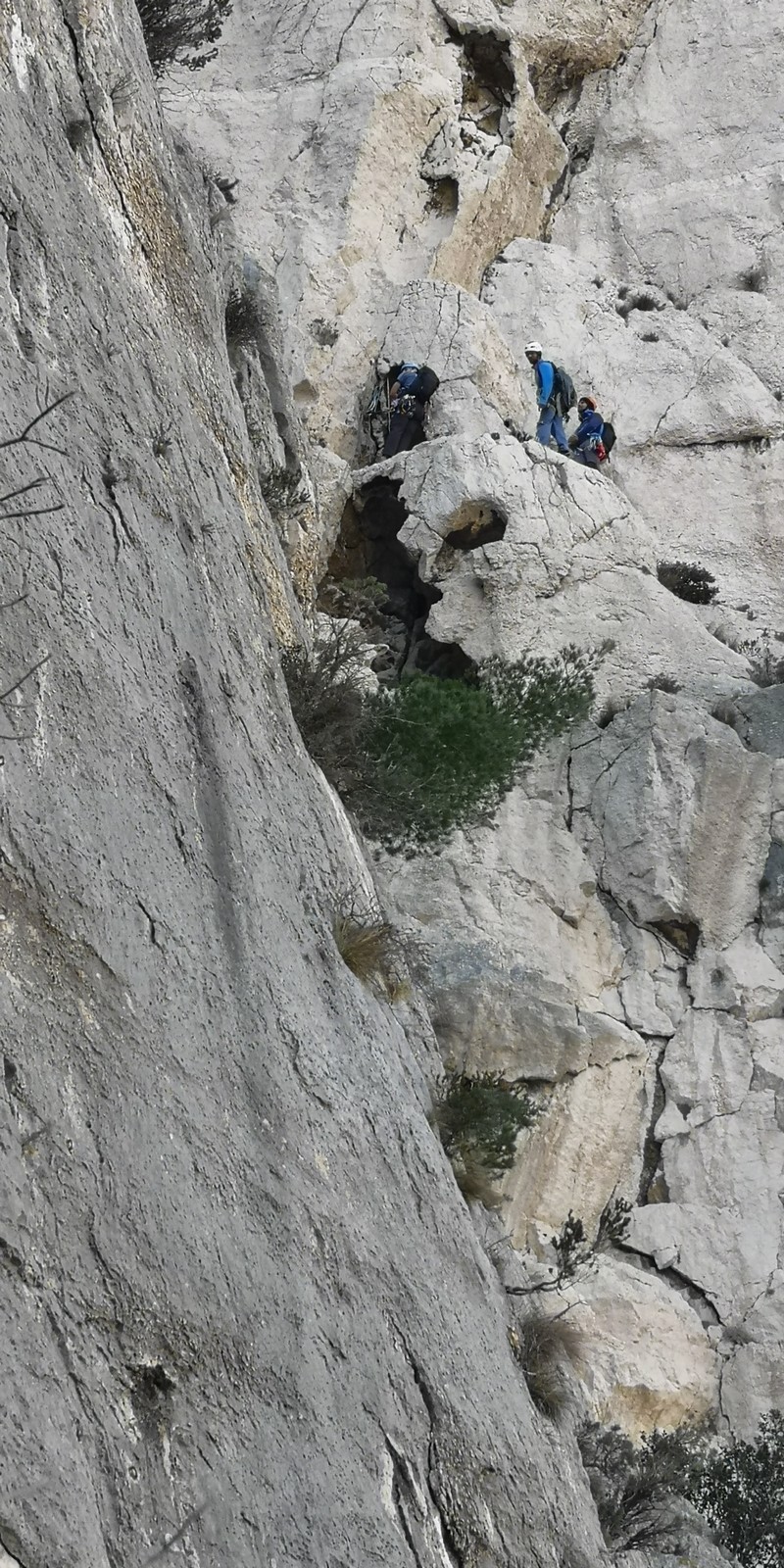 Plutôt moins pour moi et je me lève à 6h30, réveillé depuis belle lurette. Petit déjeuner frugal et je finis de préparer le matériel. On est prêt vers 7h40, 10 petites minutes en retard sur l’horaire prévu. Pas mal… La marche d’approche finit de nous réveiller. Le mistral est tombé, il fait bien moins froid que la veille. On arrive sur le plateau au dessus de la calanque on a décidé de cacher nous sacs avec nos affaires inutiles pour la journée. Dans un groupe comme ça, chaque étape prend du temps. Certains n’avaient pas encore préparé leur sac de grimpe. Je travaille ma patience, sachant pertinemment que chaque minute perdue, c’est du temps de lumière gaché. A cette période de l’année, il fait nuit à 17h30, il ne faut pas trop traîner. Mais il ne faut pas non plus presser…