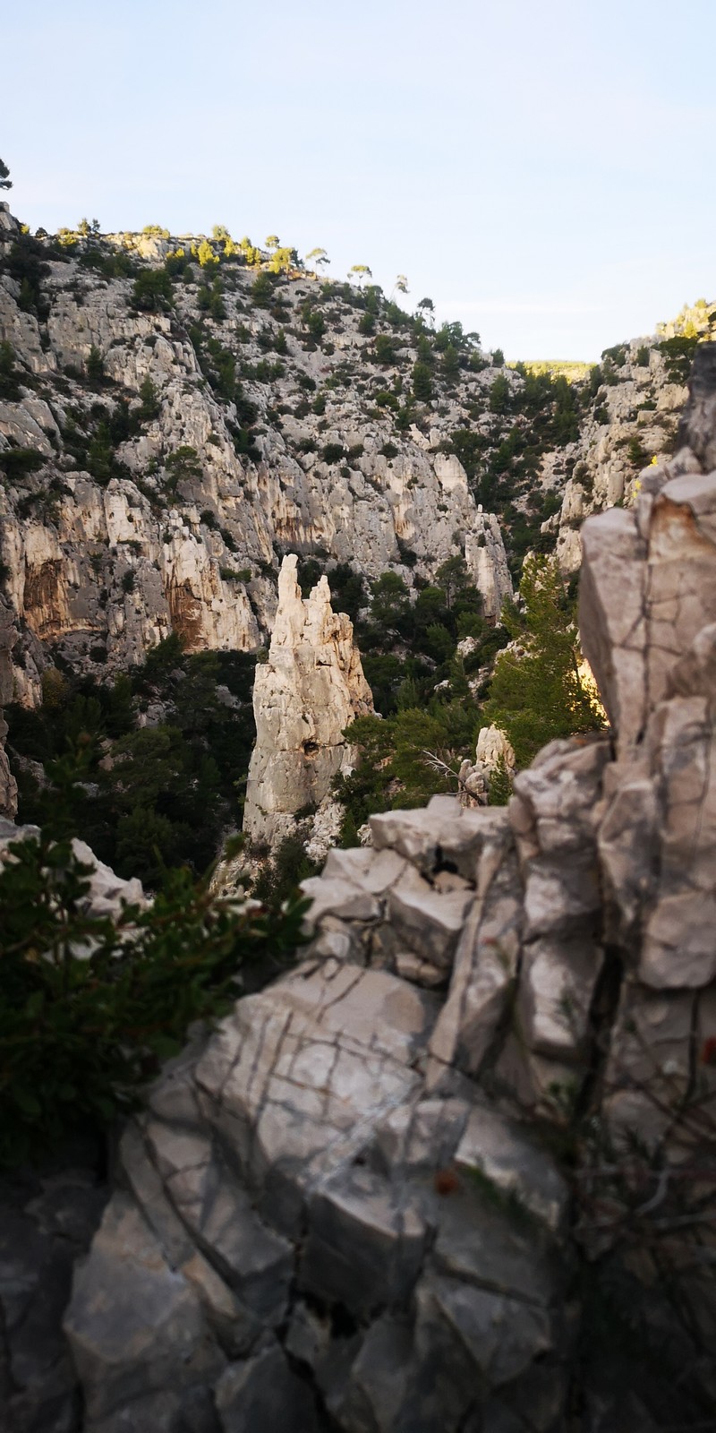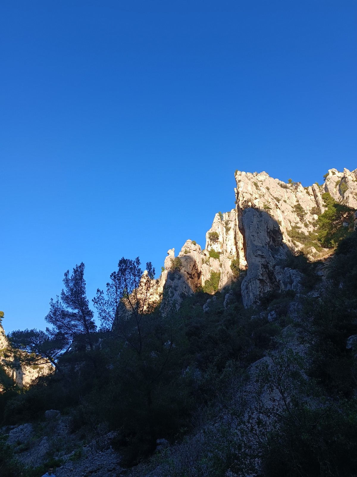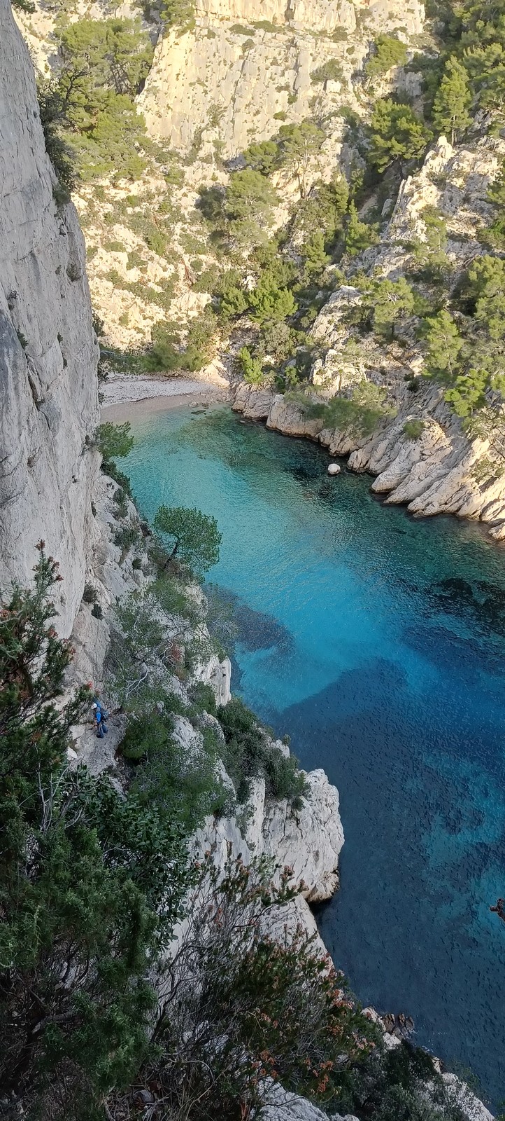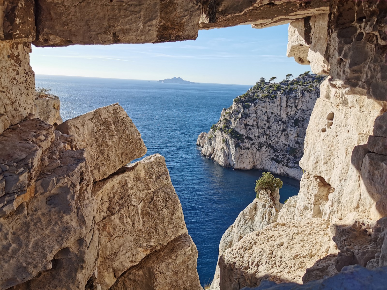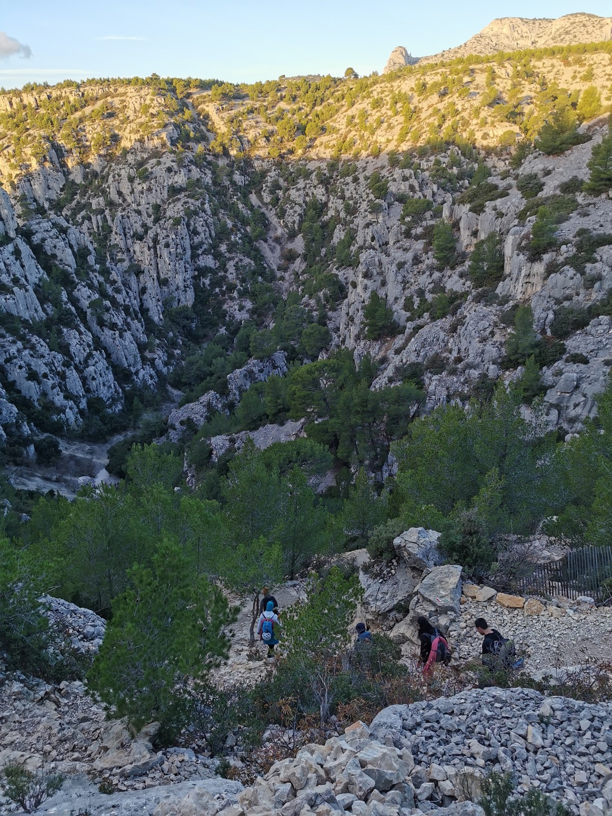 Plutôt moins pour moi et je me lève à 6h30, réveillé depuis belle lurette. Petit déjeuner frugal et je finis de préparer le matériel. On est prêt vers 7h40, 10 petites minutes en retard sur l’horaire prévu. Pas mal… La marche d’approche finit de nous réveiller. Le mistral est tombé, il fait bien moins froid que la veille. On arrive sur le plateau au dessus de la calanque on a décidé de cacher nous sacs avec nos affaires inutiles pour la journée. Dans un groupe comme ça, chaque étape prend du temps. Certains n’avaient pas encore préparé leur sac de grimpe. Je travaille ma patience, sachant pertinemment que chaque minute perdue, c’est du temps de lumière gaché. A cette période de l’année, il fait nuit à 17h30, il ne faut pas trop traîner. Mais il ne faut pas non plus presser…