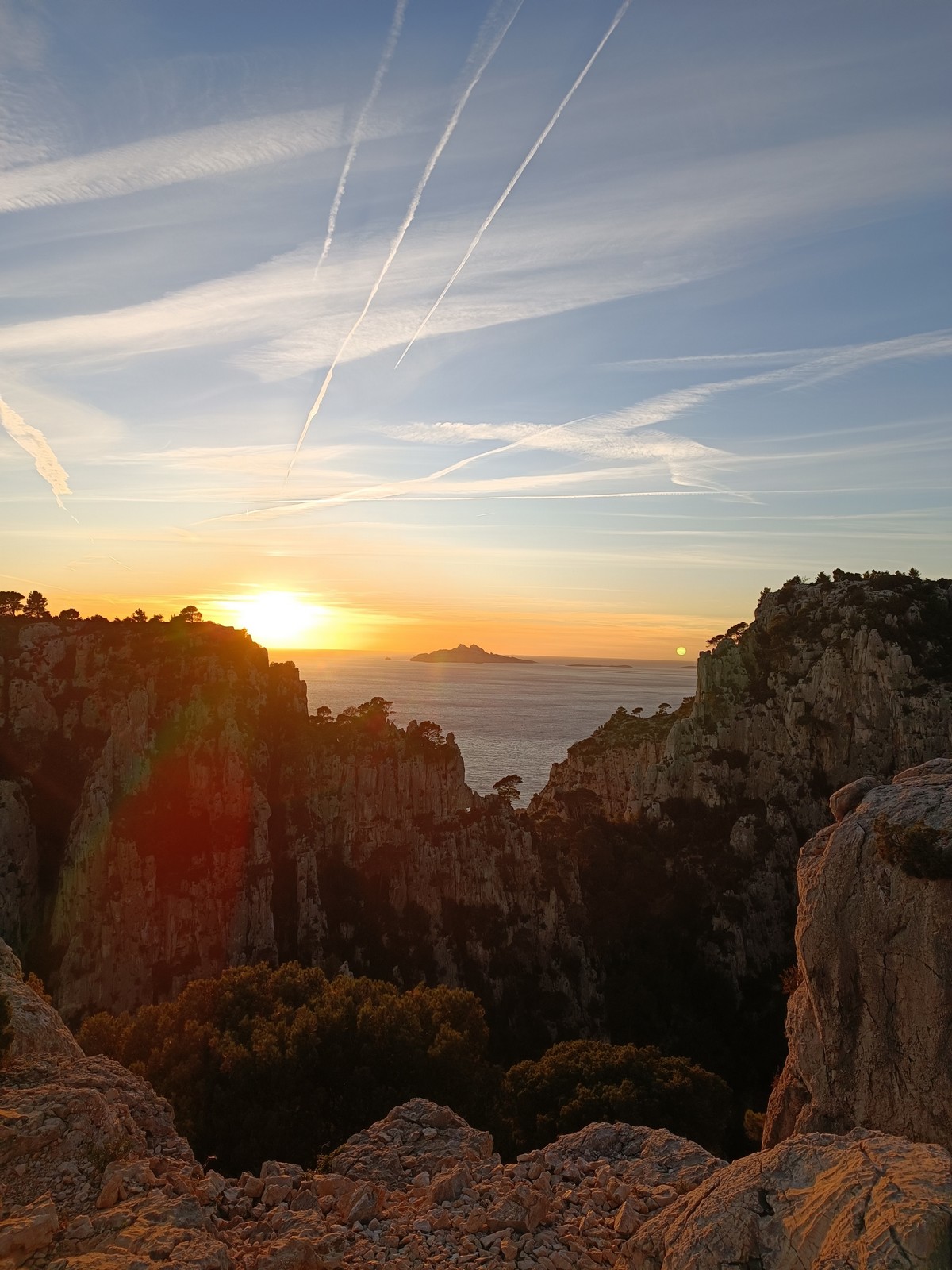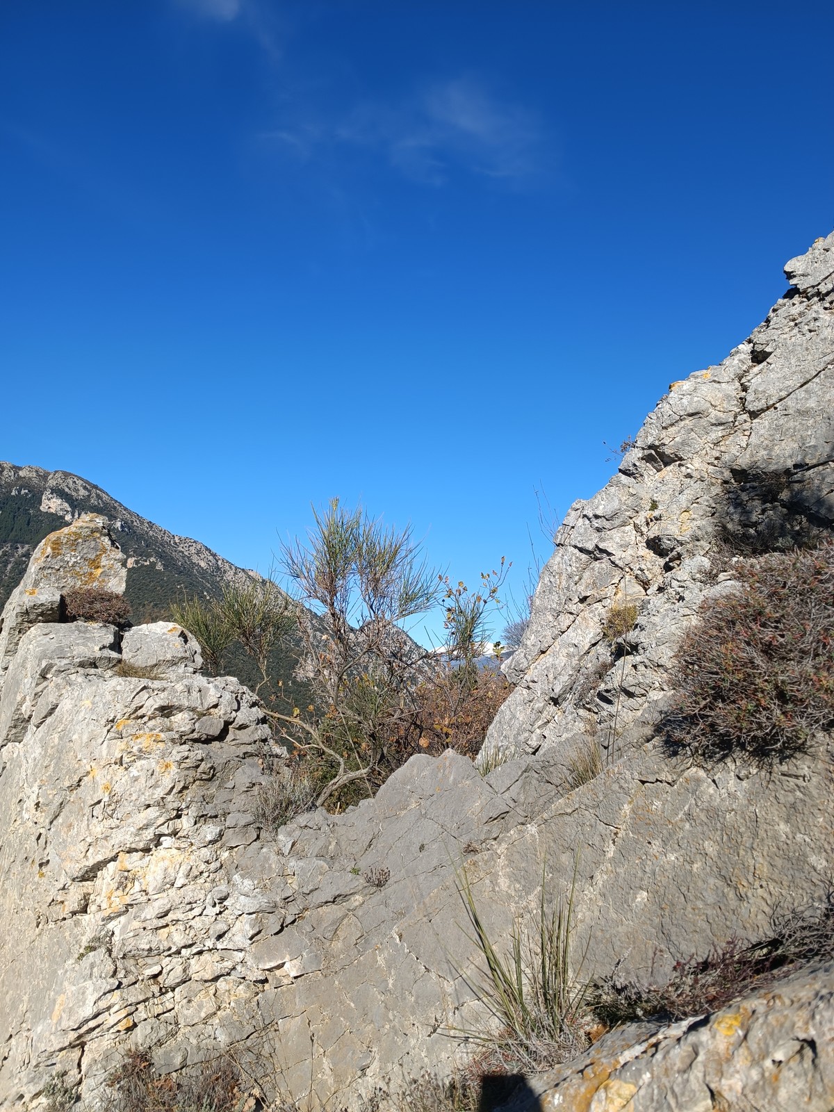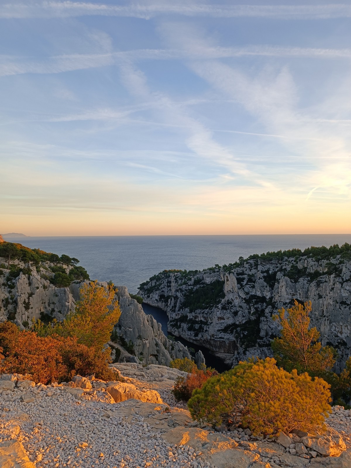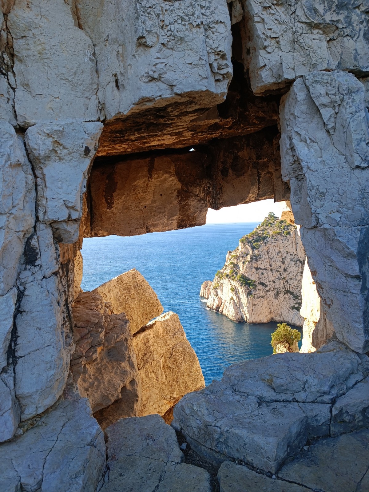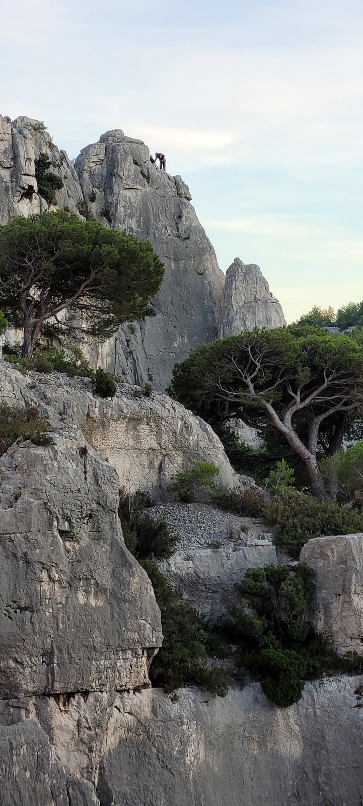 Plutôt moins pour moi et je me lève à 6h30, réveillé depuis belle lurette. Petit déjeuner frugal et je finis de préparer le matériel. On est prêt vers 7h40, 10 petites minutes en retard sur l’horaire prévu. Pas mal… La marche d’approche finit de nous réveiller. Le mistral est tombé, il fait bien moins froid que la veille. On arrive sur le plateau au dessus de la calanque on a décidé de cacher nous sacs avec nos affaires inutiles pour la journée. Dans un groupe comme ça, chaque étape prend du temps. Certains n’avaient pas encore préparé leur sac de grimpe. Je travaille ma patience, sachant pertinemment que chaque minute perdue, c’est du temps de lumière gaché. A cette période de l’année, il fait nuit à 17h30, il ne faut pas trop traîner. Mais il ne faut pas non plus presser…