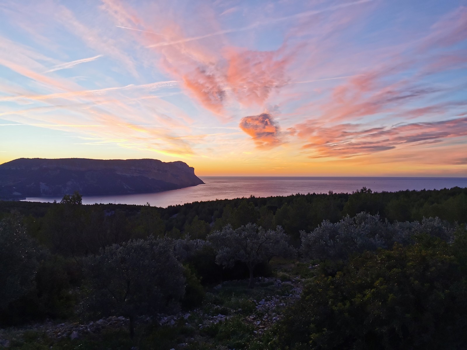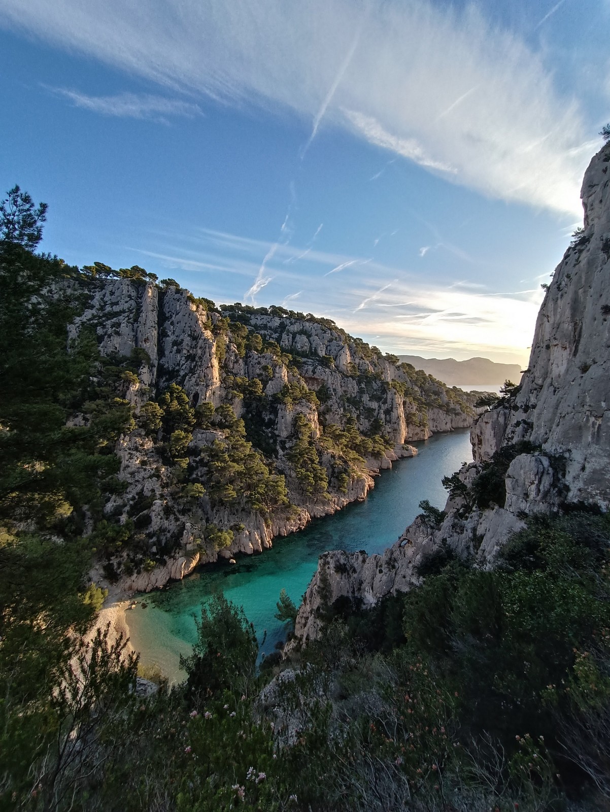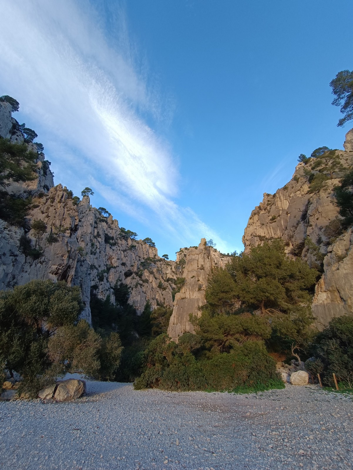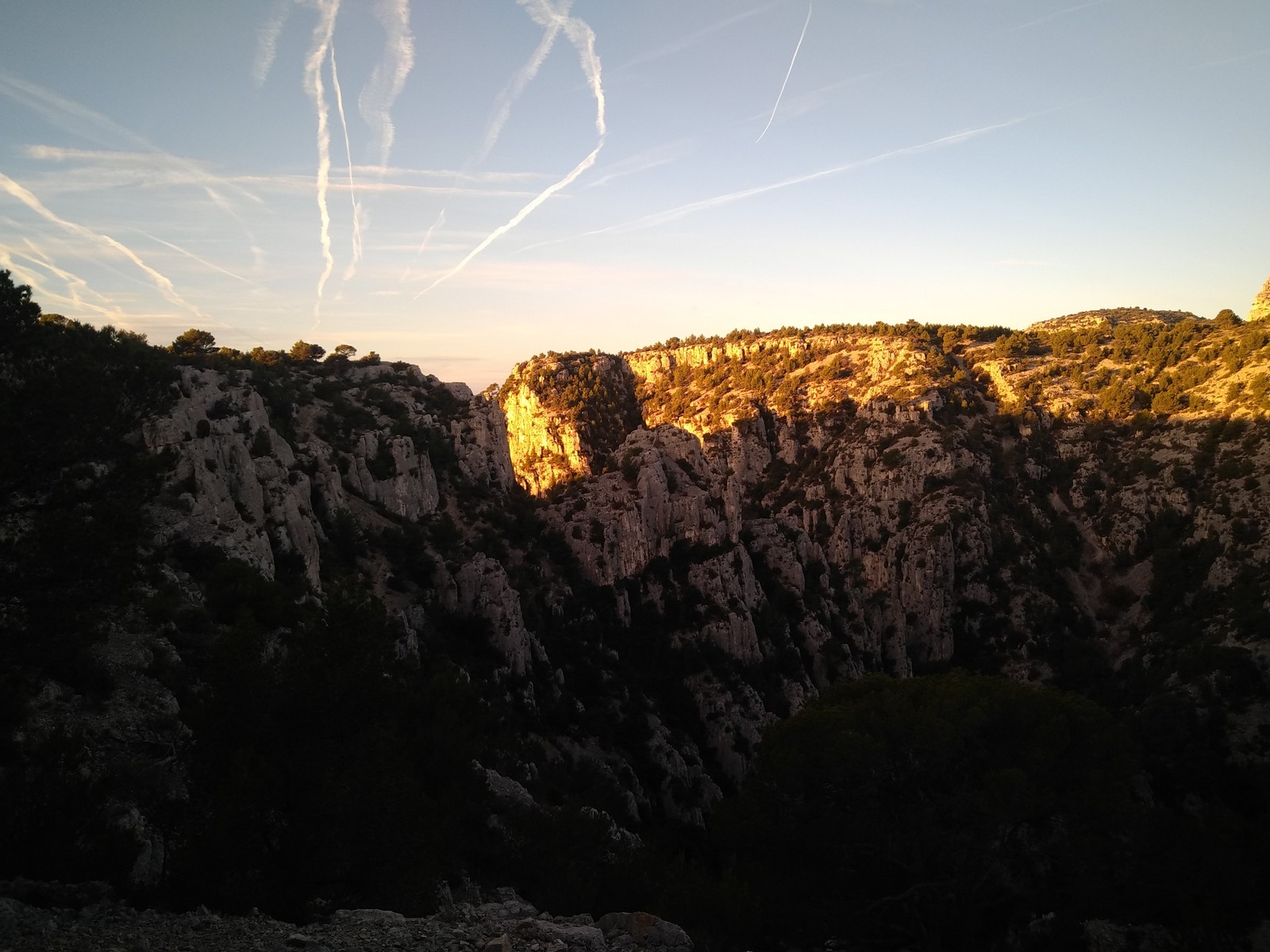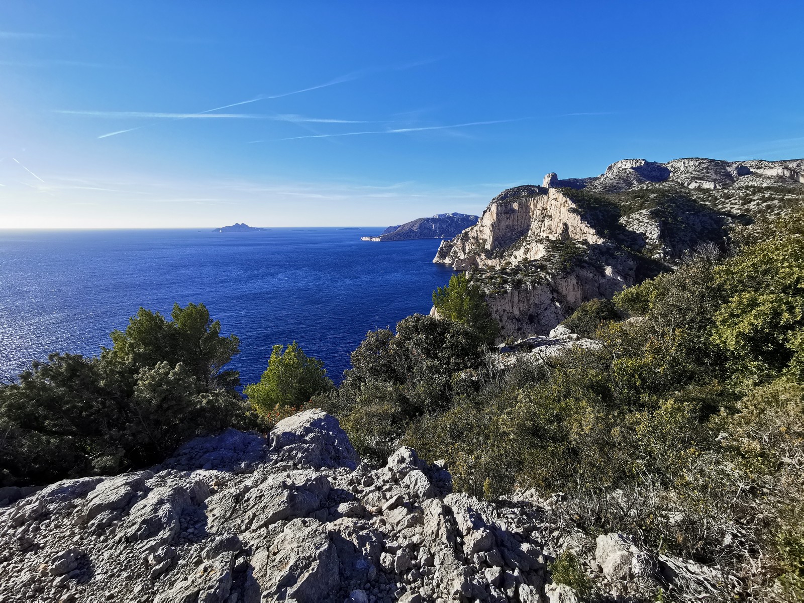 Plutôt moins pour moi et je me lève à 6h30, réveillé depuis belle lurette. Petit déjeuner frugal et je finis de préparer le matériel. On est prêt vers 7h40, 10 petites minutes en retard sur l’horaire prévu. Pas mal… La marche d’approche finit de nous réveiller. Le mistral est tombé, il fait bien moins froid que la veille. On arrive sur le plateau au dessus de la calanque on a décidé de cacher nous sacs avec nos affaires inutiles pour la journée. Dans un groupe comme ça, chaque étape prend du temps. Certains n’avaient pas encore préparé leur sac de grimpe. Je travaille ma patience, sachant pertinemment que chaque minute perdue, c’est du temps de lumière gaché. A cette période de l’année, il fait nuit à 17h30, il ne faut pas trop traîner. Mais il ne faut pas non plus presser…