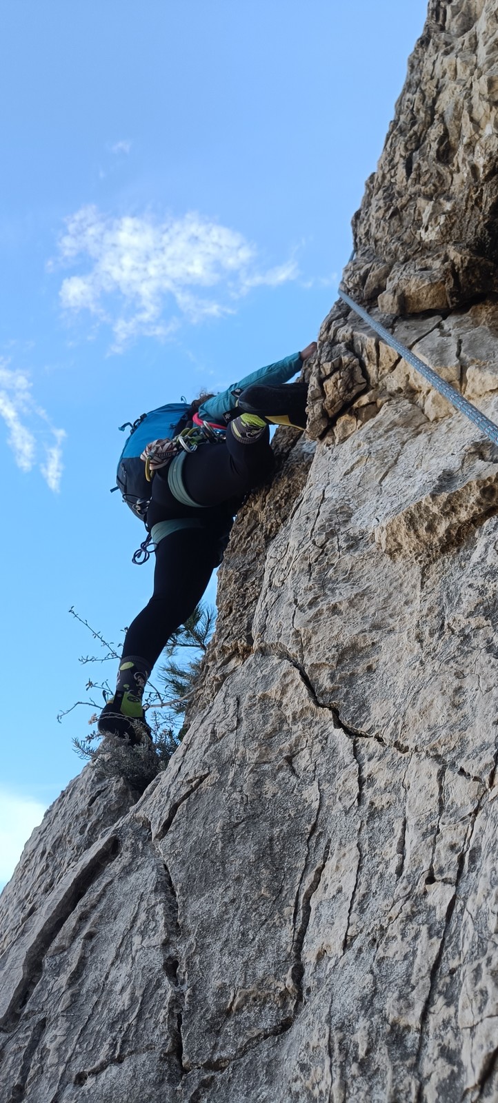 A partir de là, les choses se déroulent plutôt bien. Chaque cordée est prête rapidement et à l’attaque. Le caillou est froid, les doigts peu sensibles et les pieds glacés mais ça grimpe bien. Camille s’en sort à merveille, se pose un peu aux rares points en place et rejoint son premier relais. JP avale sa première longueur en 6a pour revenir sur la vire et assure ses compagnons de cordée avant d’attaquer le 6b qu’il négociera avec brio mais un peu plus de temps.