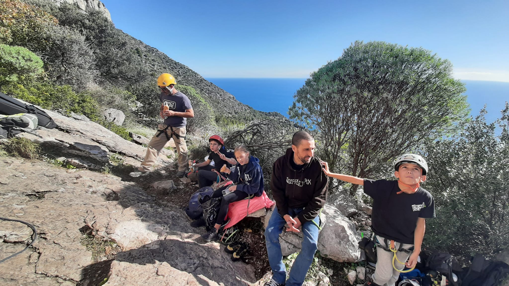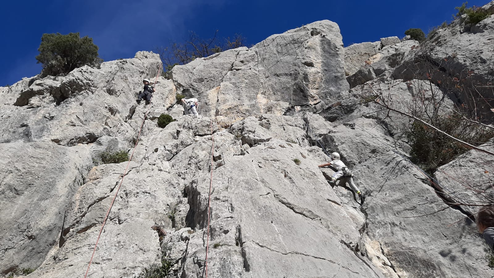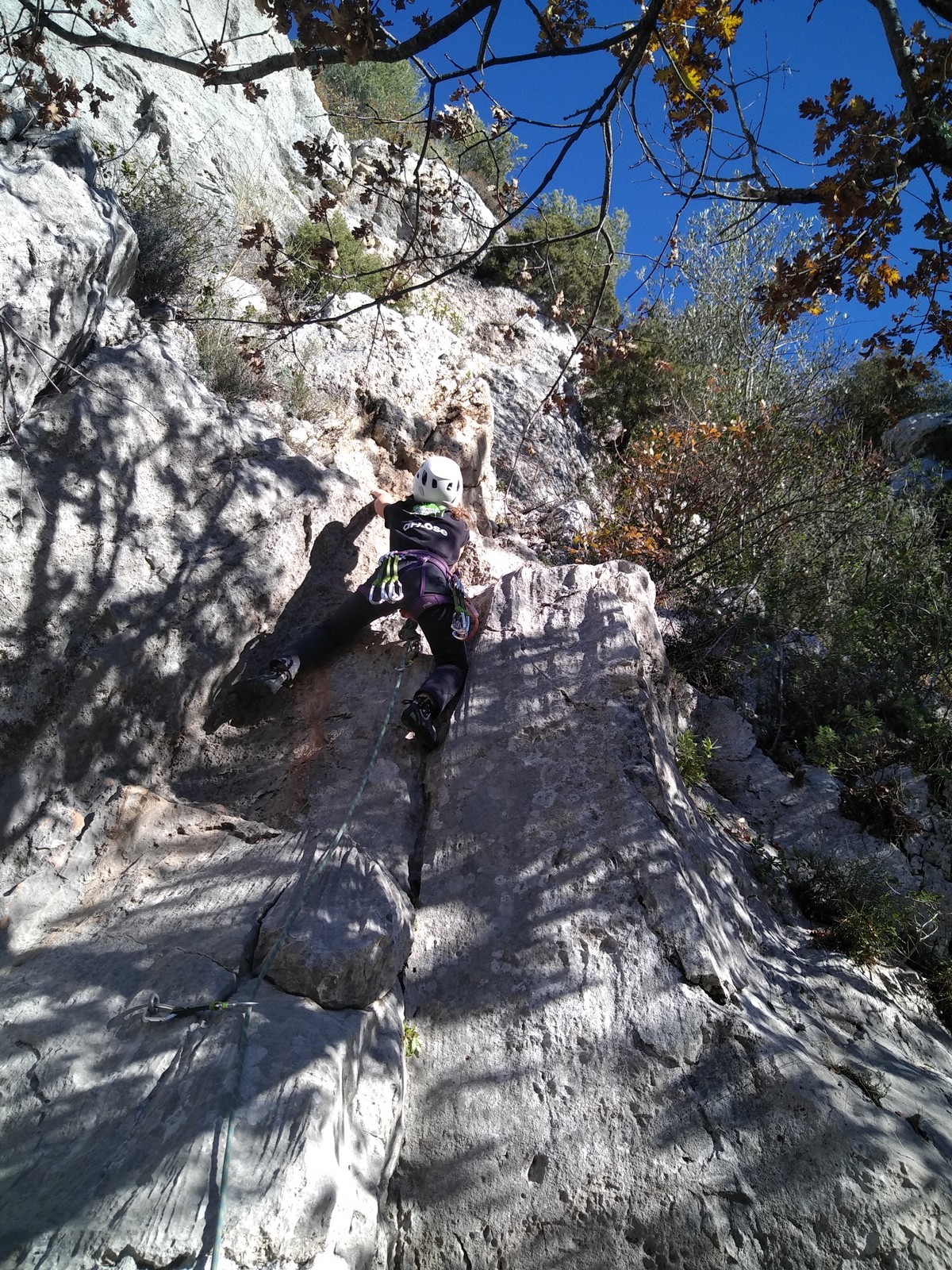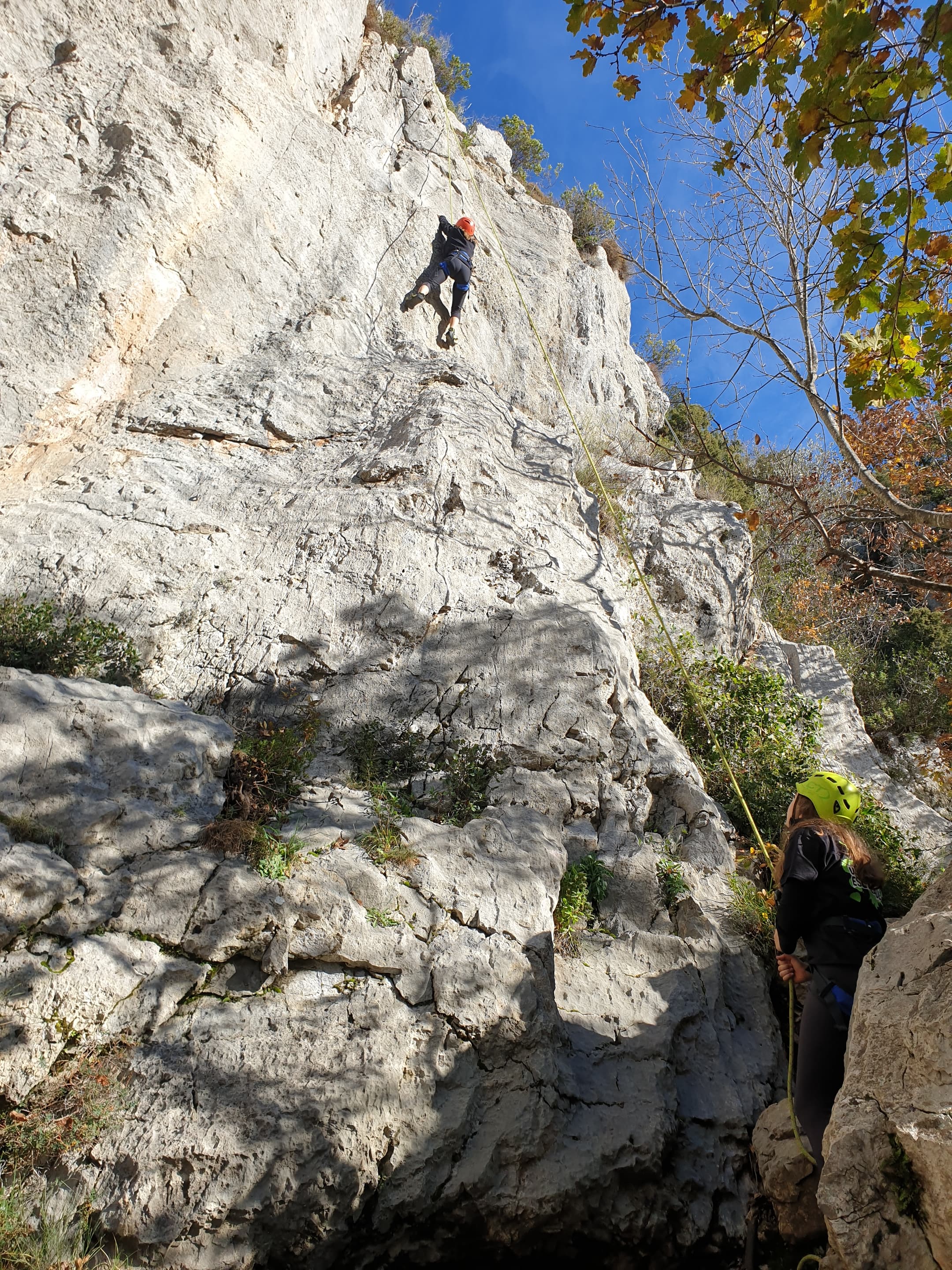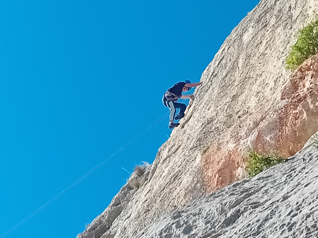 C’est donc avec 8 enfants et 4 parents, tous grimpeurs, que nous débarquons à la falaise. Le CAF de Nice est déjà sur place avec une dizaine d’adultes dans la partie droite de la falaise. On ne se gênera pas. Je commence la journée par un petit apprentissage de la manip du relais pour ceux qui ne la connaissent pas, tandis que Milo part déjà installer une première moulinette dans « l’abeille a le bourdon », la voie la plus facile du secteur. Très vite, Romane s’occupe de « la baleine à bosse » tandis qu’Alexander essaie infructueusement d’atteindre le relais de « Zed et Gnougnou ». Les cordées sont organisées par tranche d’âge et genre. Romane grimpe avec Jeanne, Adèle avec Louise, Alexander avec Paul et Milo avec Boris.