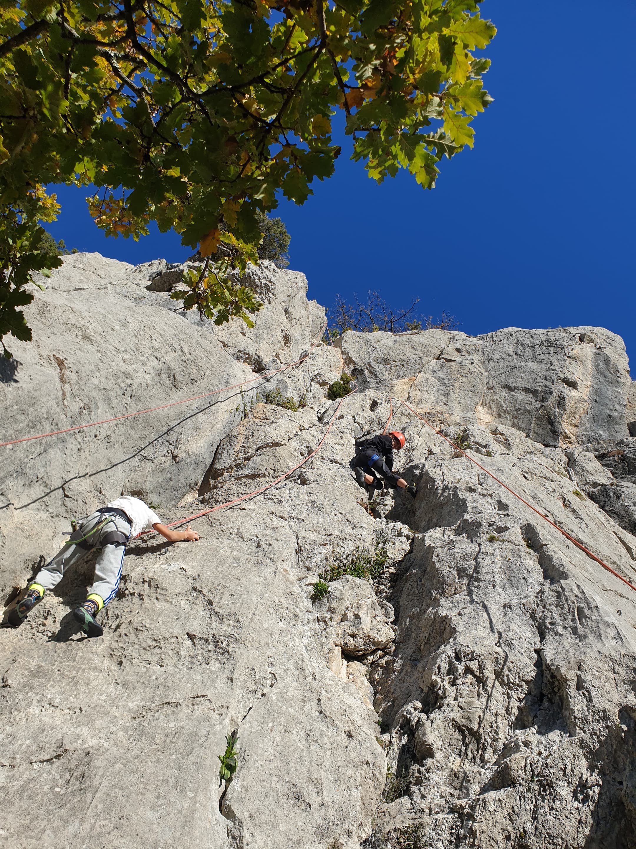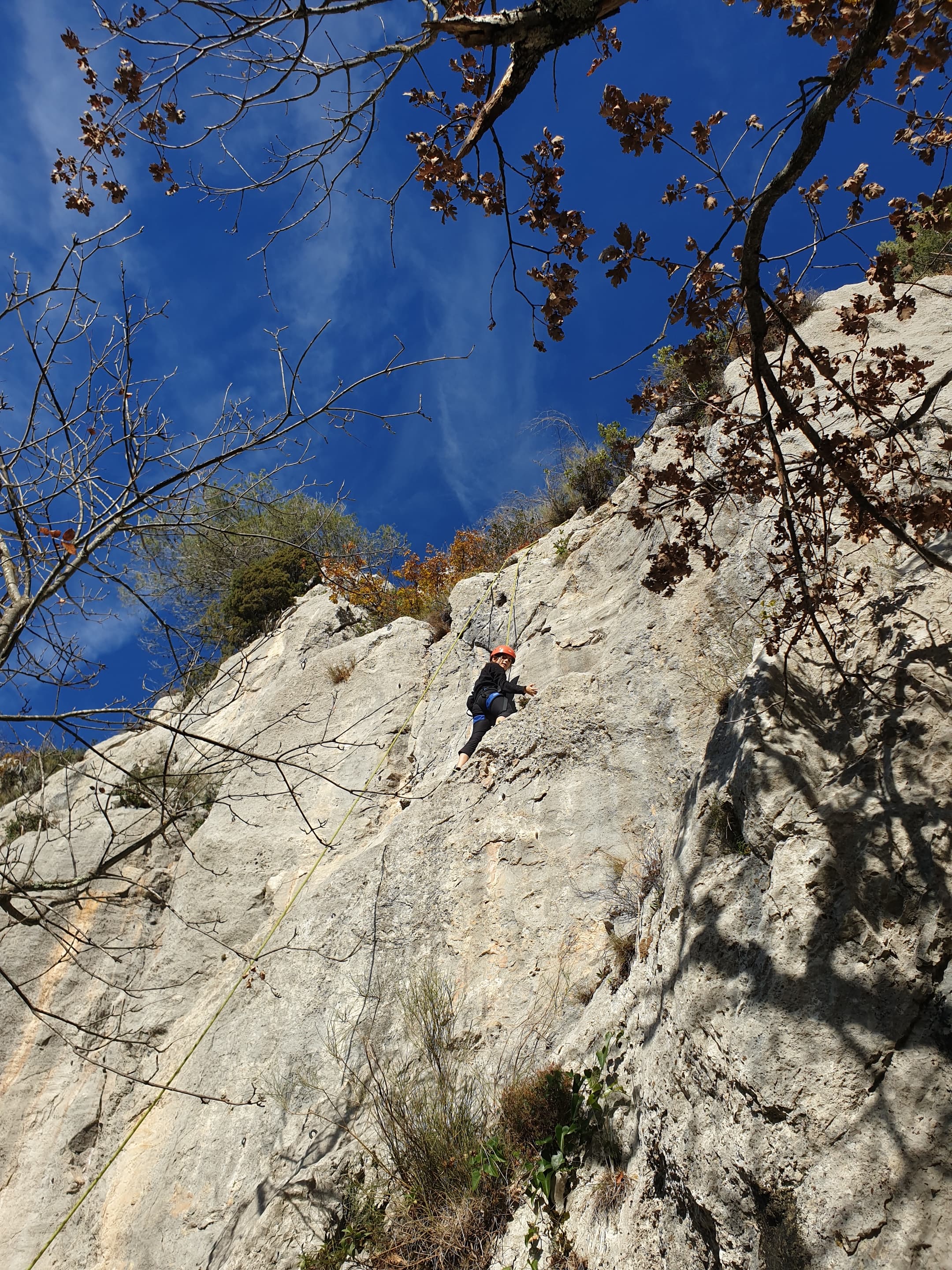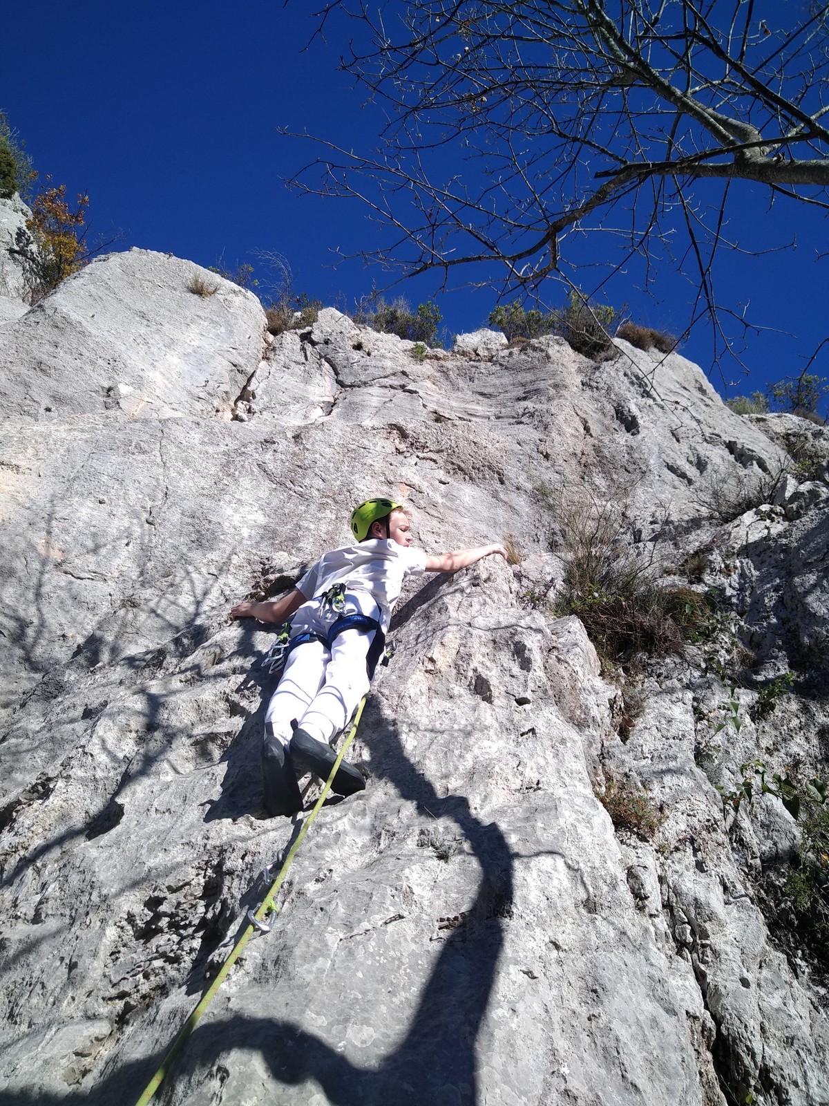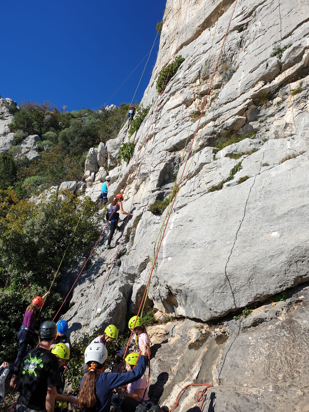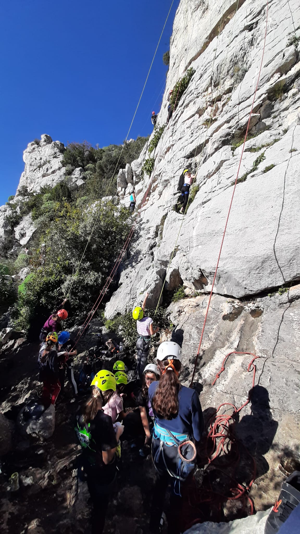 C’est donc avec 8 enfants et 4 parents, tous grimpeurs, que nous débarquons à la falaise. Le CAF de Nice est déjà sur place avec une dizaine d’adultes dans la partie droite de la falaise. On ne se gênera pas. Je commence la journée par un petit apprentissage de la manip du relais pour ceux qui ne la connaissent pas, tandis que Milo part déjà installer une première moulinette dans « l’abeille a le bourdon », la voie la plus facile du secteur. Très vite, Romane s’occupe de « la baleine à bosse » tandis qu’Alexander essaie infructueusement d’atteindre le relais de « Zed et Gnougnou ». Les cordées sont organisées par tranche d’âge et genre. Romane grimpe avec Jeanne, Adèle avec Louise, Alexander avec Paul et Milo avec Boris.