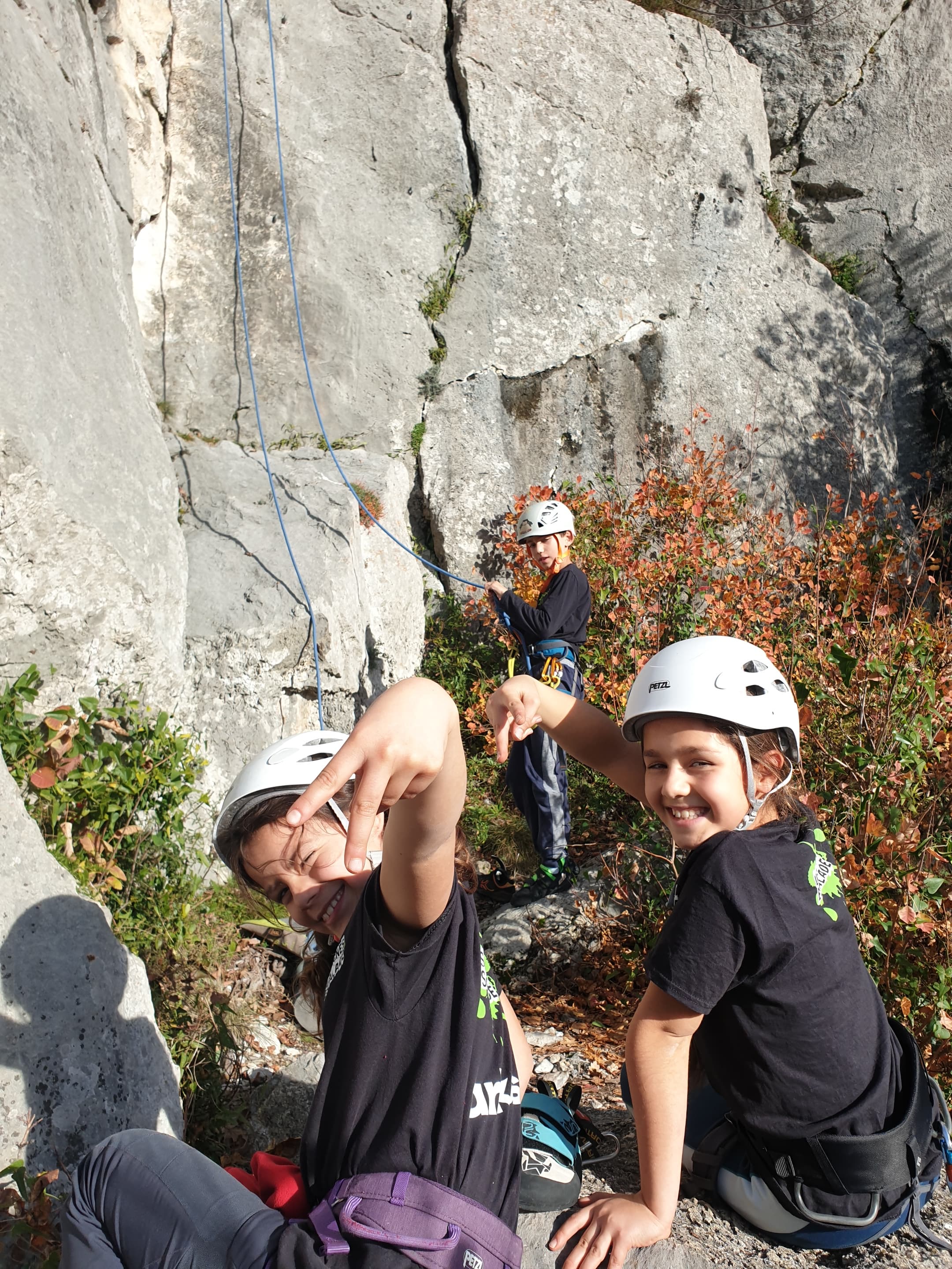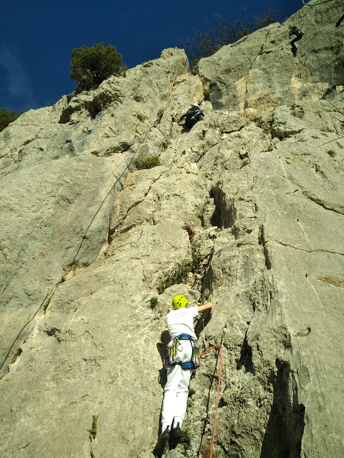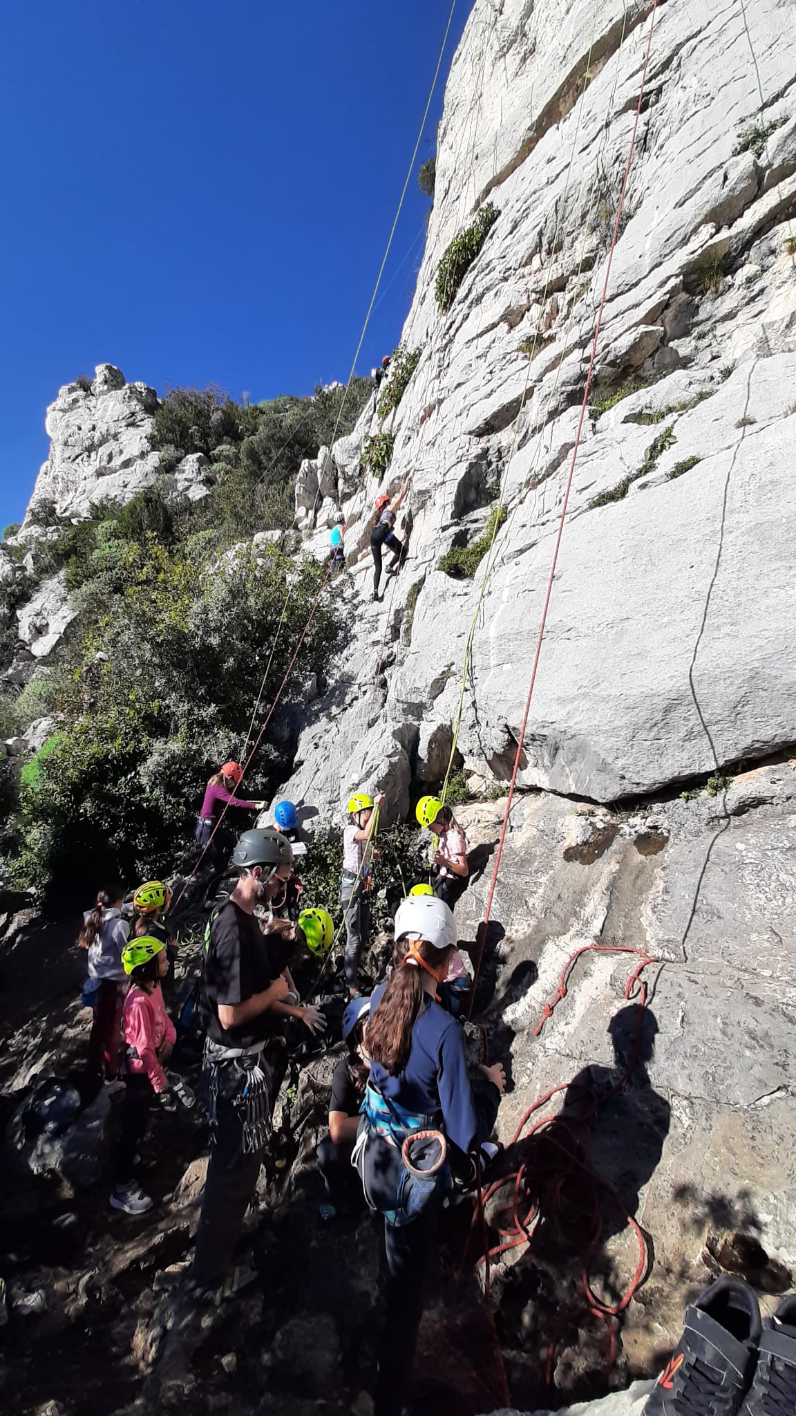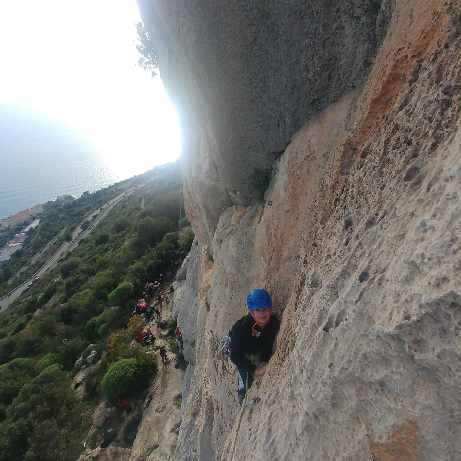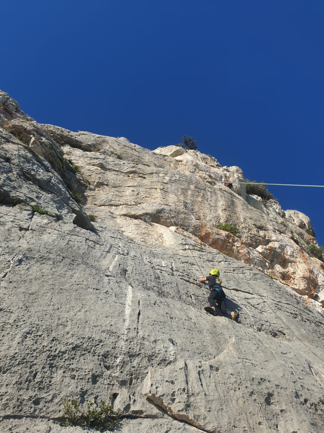 C’est donc avec 8 enfants et 4 parents, tous grimpeurs, que nous débarquons à la falaise. Le CAF de Nice est déjà sur place avec une dizaine d’adultes dans la partie droite de la falaise. On ne se gênera pas. Je commence la journée par un petit apprentissage de la manip du relais pour ceux qui ne la connaissent pas, tandis que Milo part déjà installer une première moulinette dans « l’abeille a le bourdon », la voie la plus facile du secteur. Très vite, Romane s’occupe de « la baleine à bosse » tandis qu’Alexander essaie infructueusement d’atteindre le relais de « Zed et Gnougnou ». Les cordées sont organisées par tranche d’âge et genre. Romane grimpe avec Jeanne, Adèle avec Louise, Alexander avec Paul et Milo avec Boris.