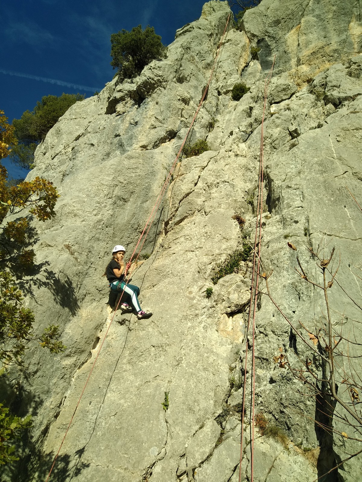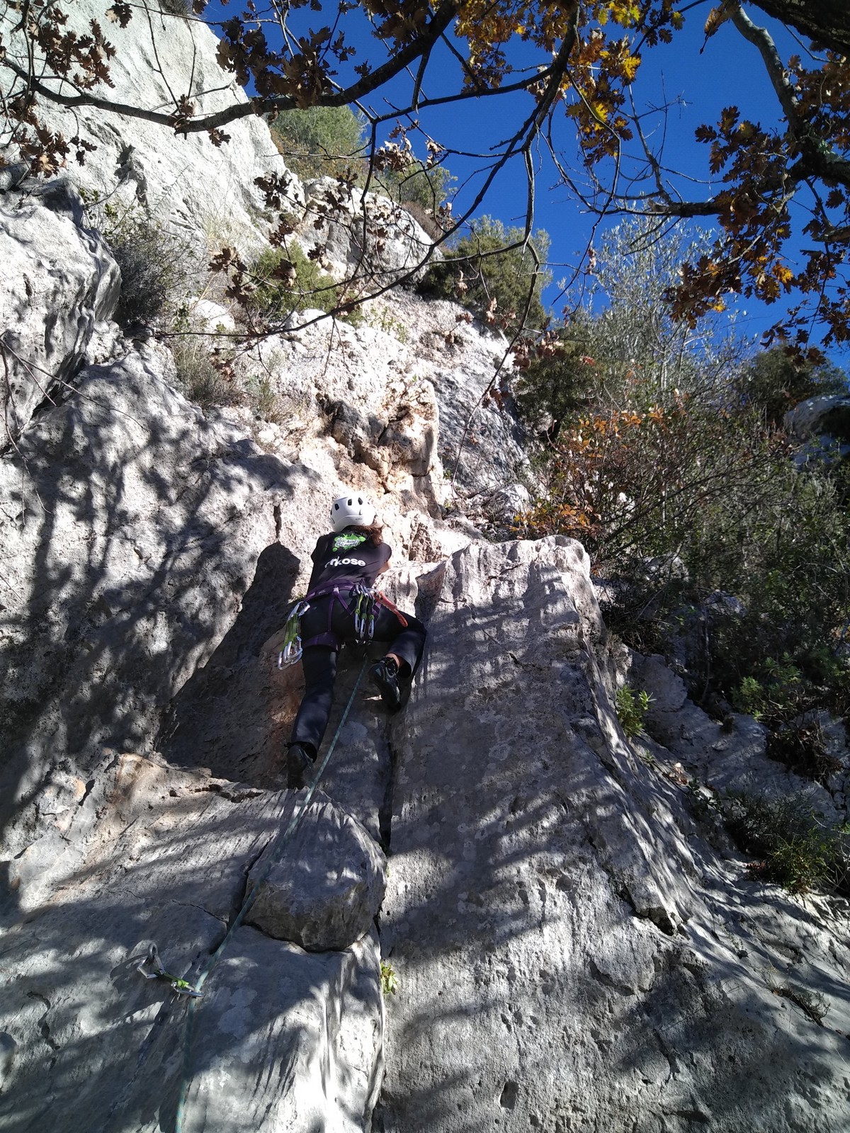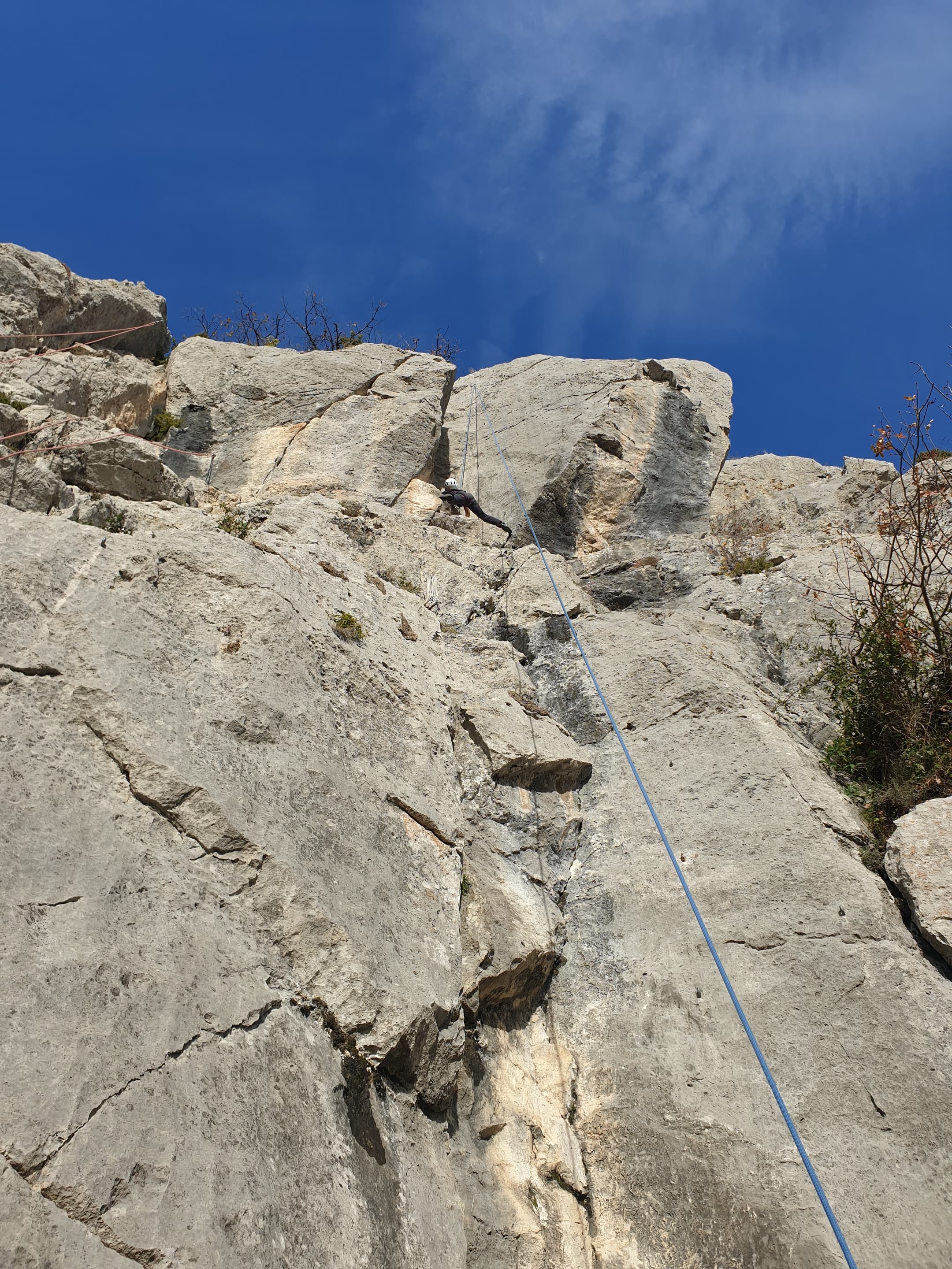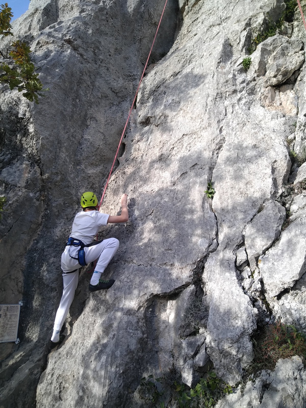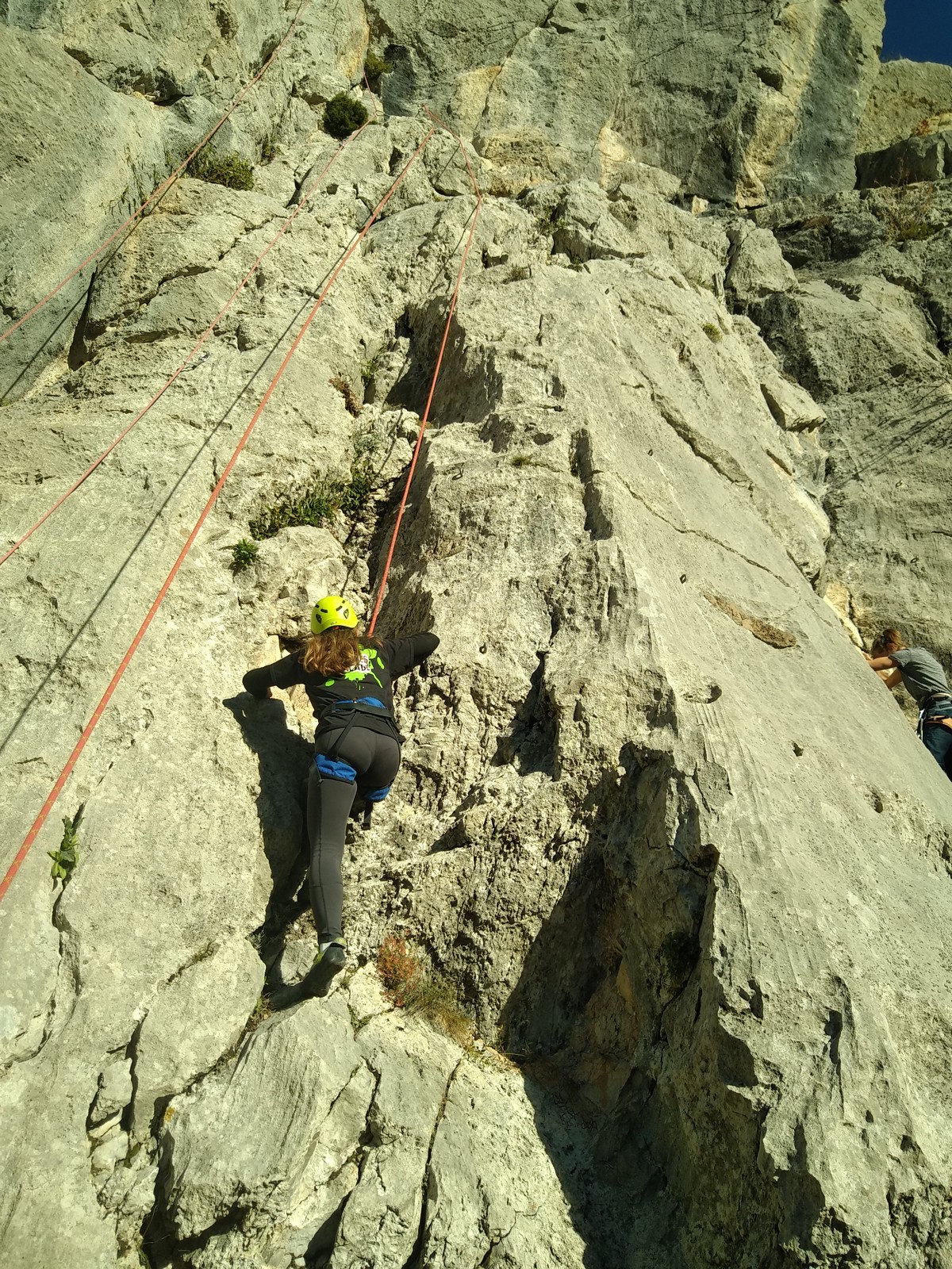 C’est donc avec 8 enfants et 4 parents, tous grimpeurs, que nous débarquons à la falaise. Le CAF de Nice est déjà sur place avec une dizaine d’adultes dans la partie droite de la falaise. On ne se gênera pas. Je commence la journée par un petit apprentissage de la manip du relais pour ceux qui ne la connaissent pas, tandis que Milo part déjà installer une première moulinette dans « l’abeille a le bourdon », la voie la plus facile du secteur. Très vite, Romane s’occupe de « la baleine à bosse » tandis qu’Alexander essaie infructueusement d’atteindre le relais de « Zed et Gnougnou ». Les cordées sont organisées par tranche d’âge et genre. Romane grimpe avec Jeanne, Adèle avec Louise, Alexander avec Paul et Milo avec Boris.
