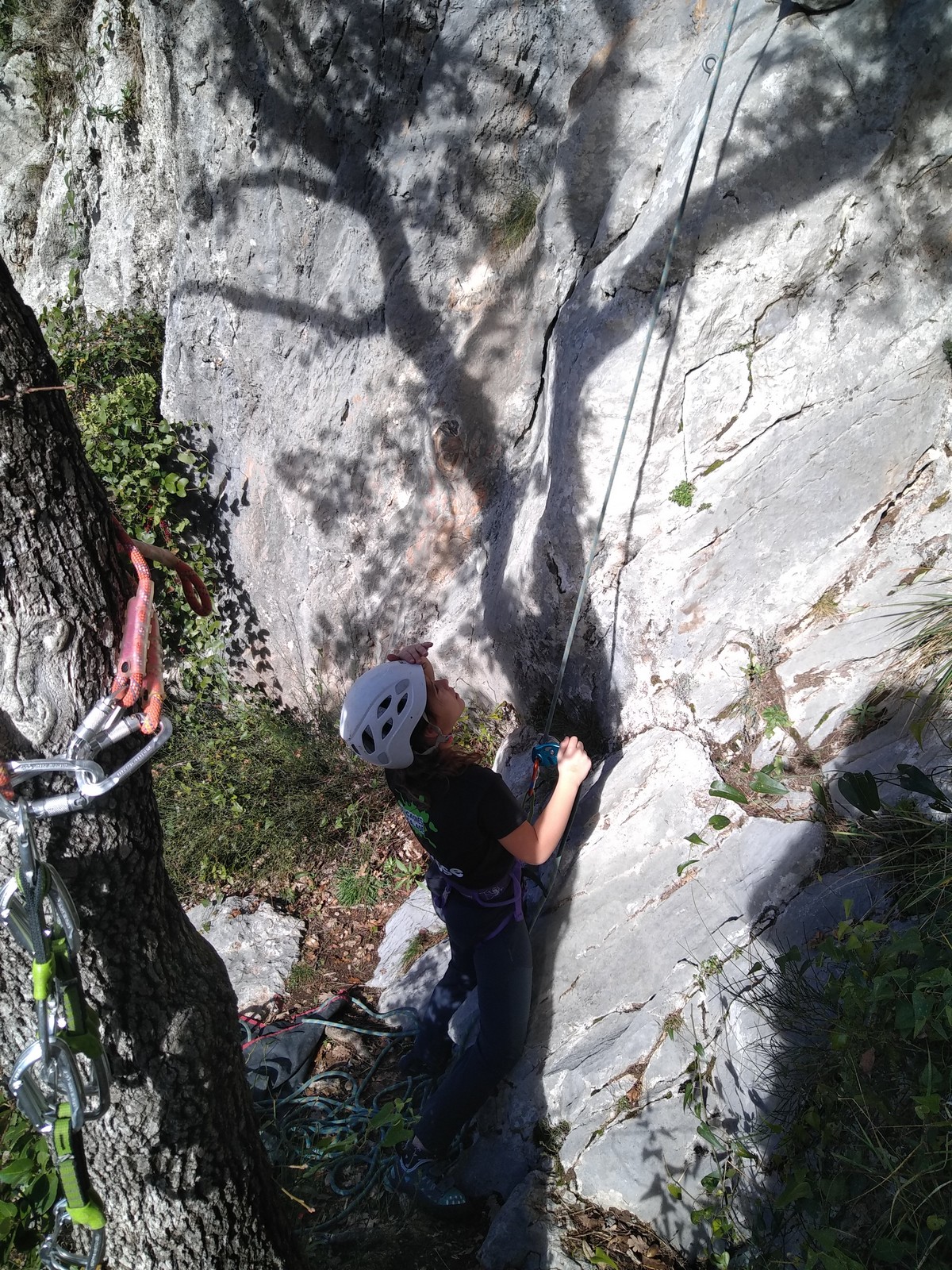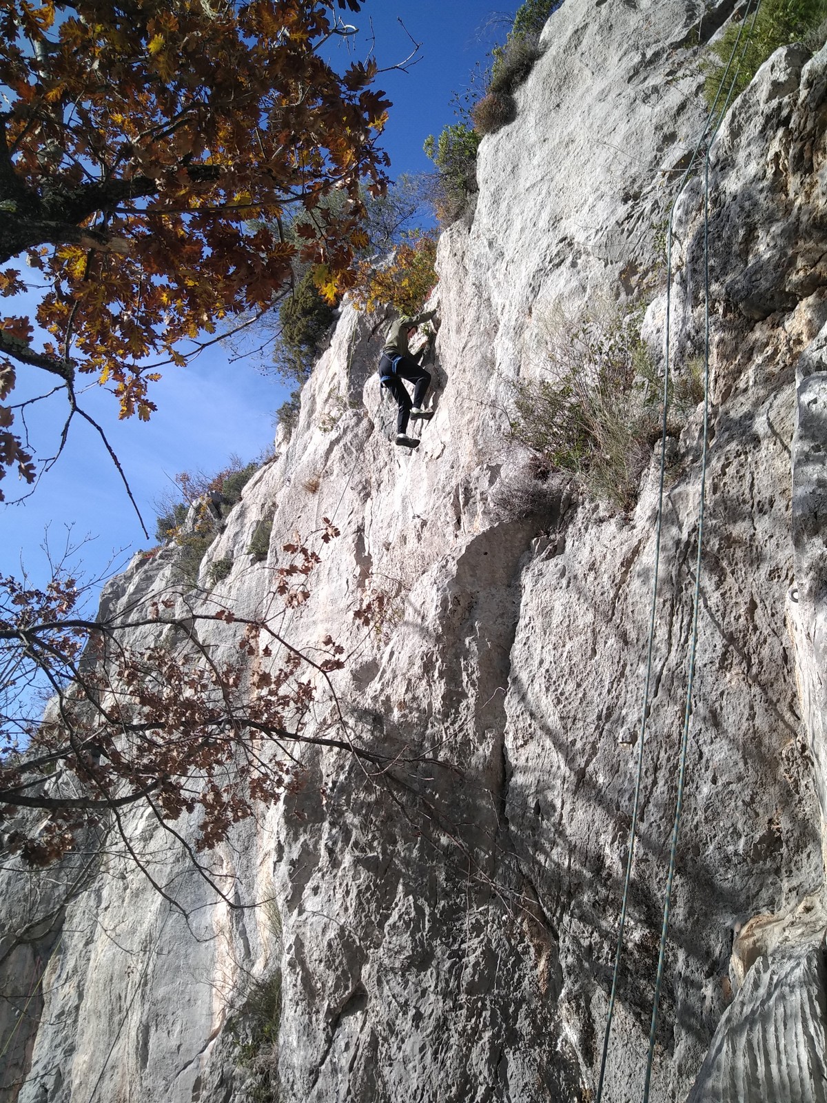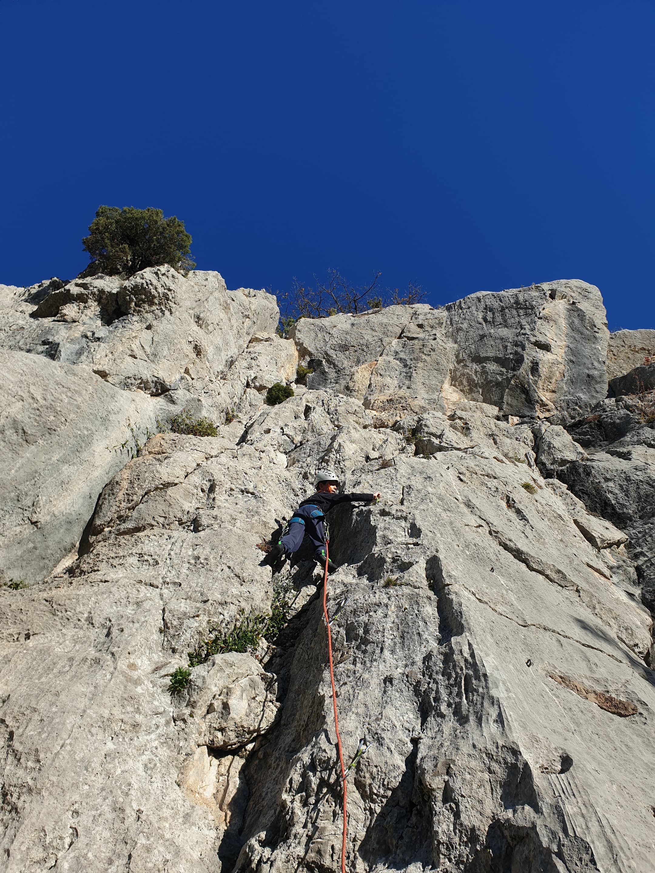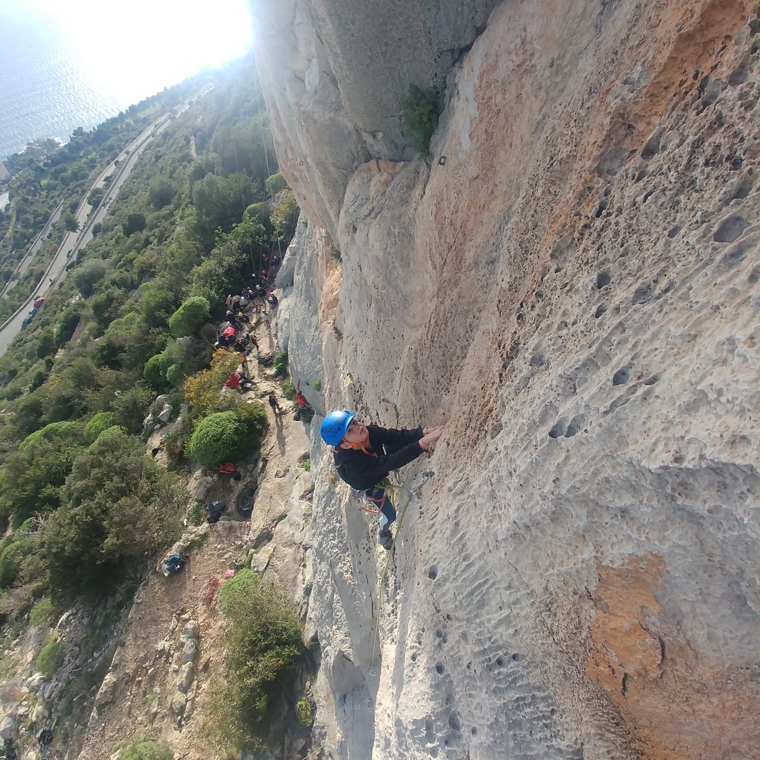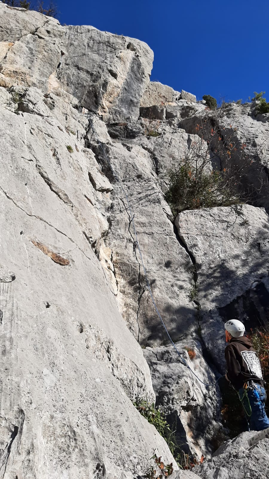 C’est donc avec 8 enfants et 4 parents, tous grimpeurs, que nous débarquons à la falaise. Le CAF de Nice est déjà sur place avec une dizaine d’adultes dans la partie droite de la falaise. On ne se gênera pas. Je commence la journée par un petit apprentissage de la manip du relais pour ceux qui ne la connaissent pas, tandis que Milo part déjà installer une première moulinette dans « l’abeille a le bourdon », la voie la plus facile du secteur. Très vite, Romane s’occupe de « la baleine à bosse » tandis qu’Alexander essaie infructueusement d’atteindre le relais de « Zed et Gnougnou ». Les cordées sont organisées par tranche d’âge et genre. Romane grimpe avec Jeanne, Adèle avec Louise, Alexander avec Paul et Milo avec Boris.