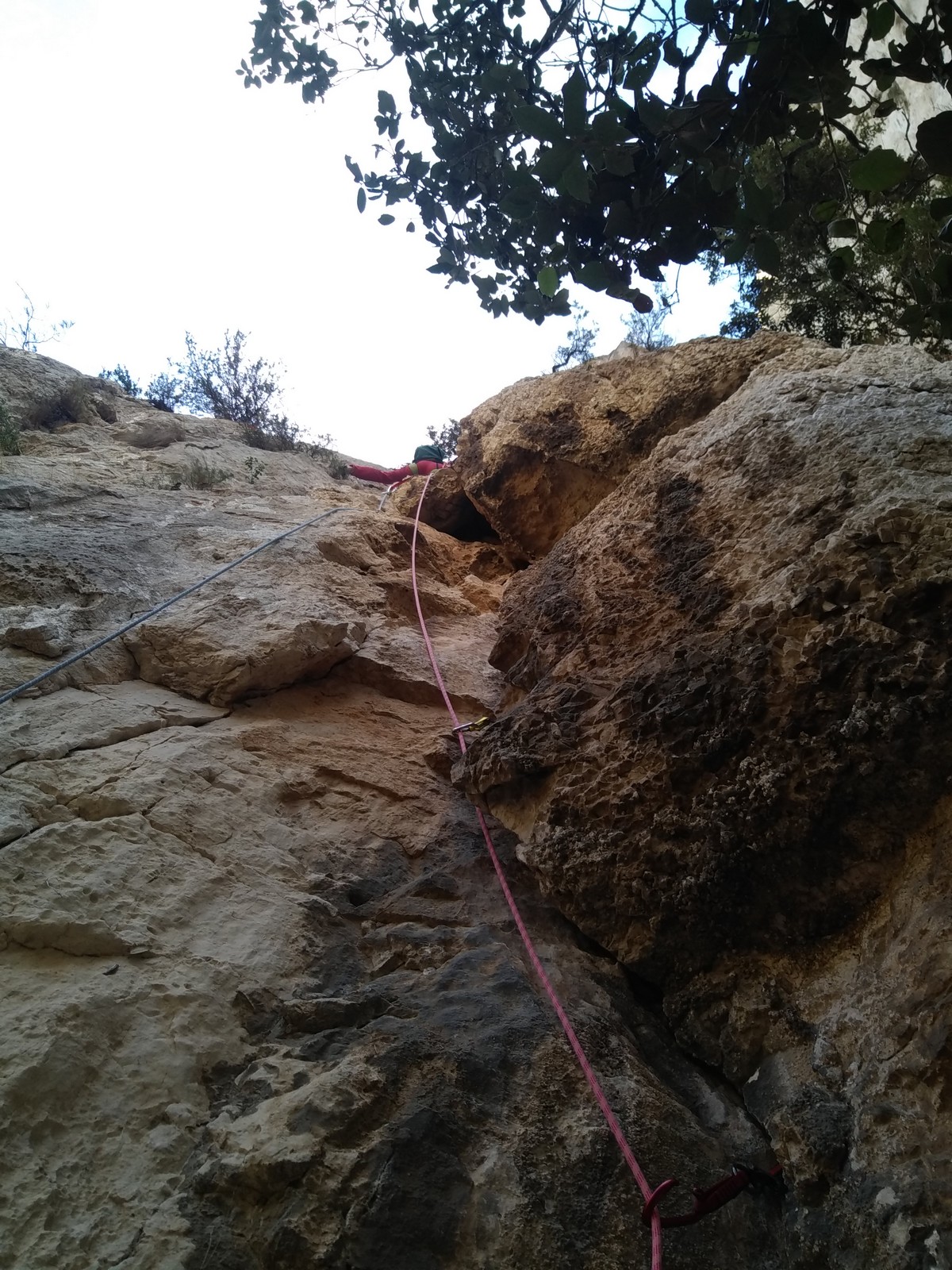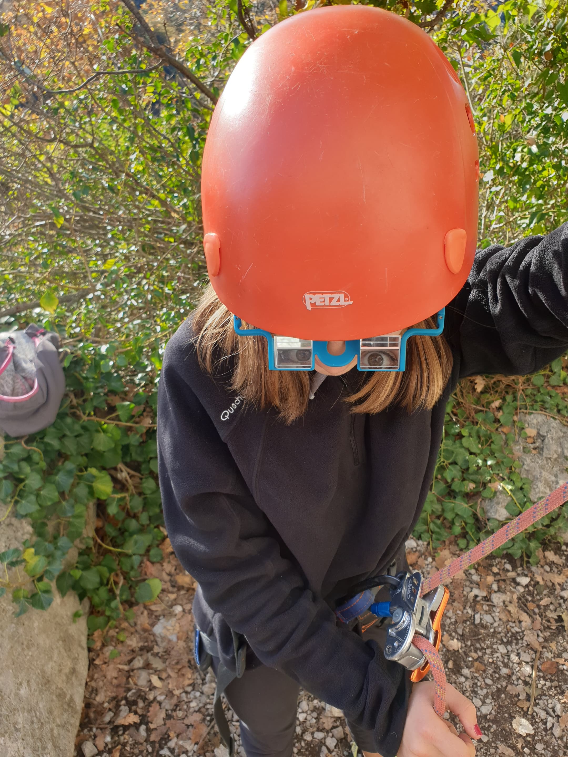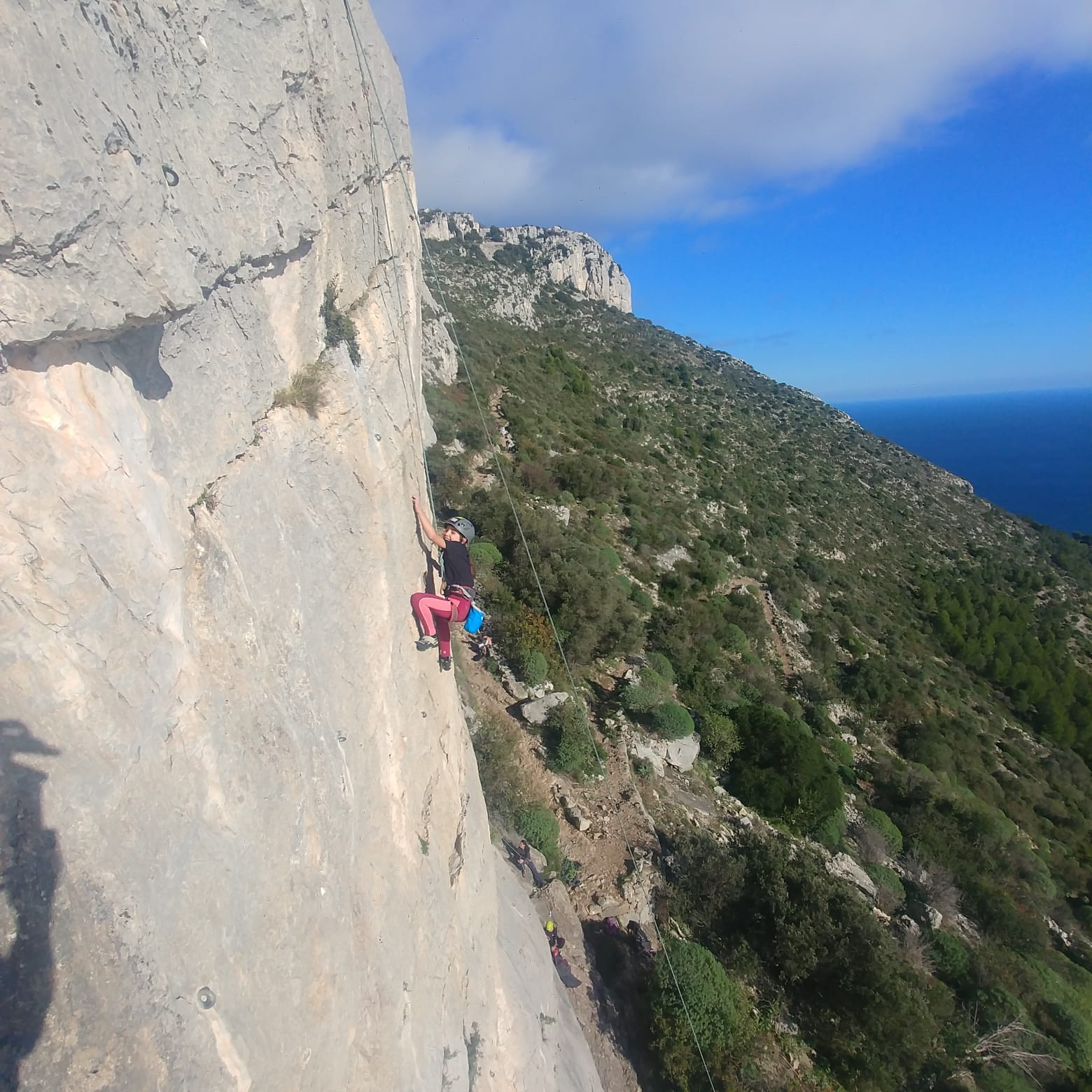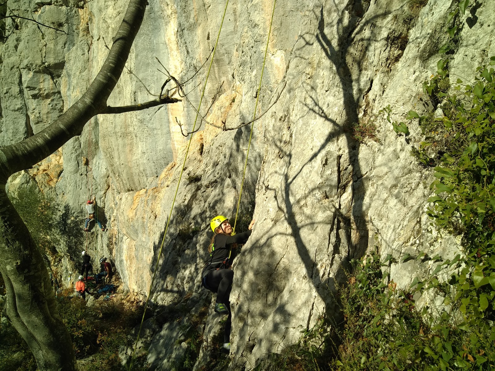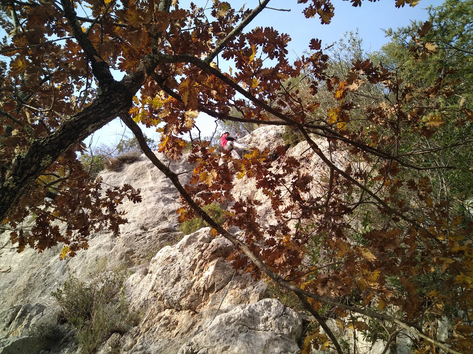 C’est donc avec 8 enfants et 4 parents, tous grimpeurs, que nous débarquons à la falaise. Le CAF de Nice est déjà sur place avec une dizaine d’adultes dans la partie droite de la falaise. On ne se gênera pas. Je commence la journée par un petit apprentissage de la manip du relais pour ceux qui ne la connaissent pas, tandis que Milo part déjà installer une première moulinette dans « l’abeille a le bourdon », la voie la plus facile du secteur. Très vite, Romane s’occupe de « la baleine à bosse » tandis qu’Alexander essaie infructueusement d’atteindre le relais de « Zed et Gnougnou ». Les cordées sont organisées par tranche d’âge et genre. Romane grimpe avec Jeanne, Adèle avec Louise, Alexander avec Paul et Milo avec Boris.