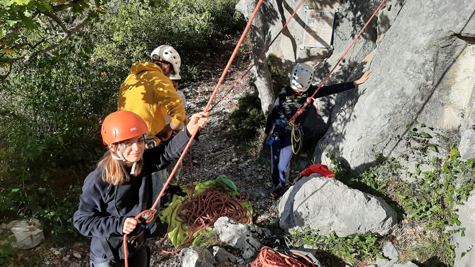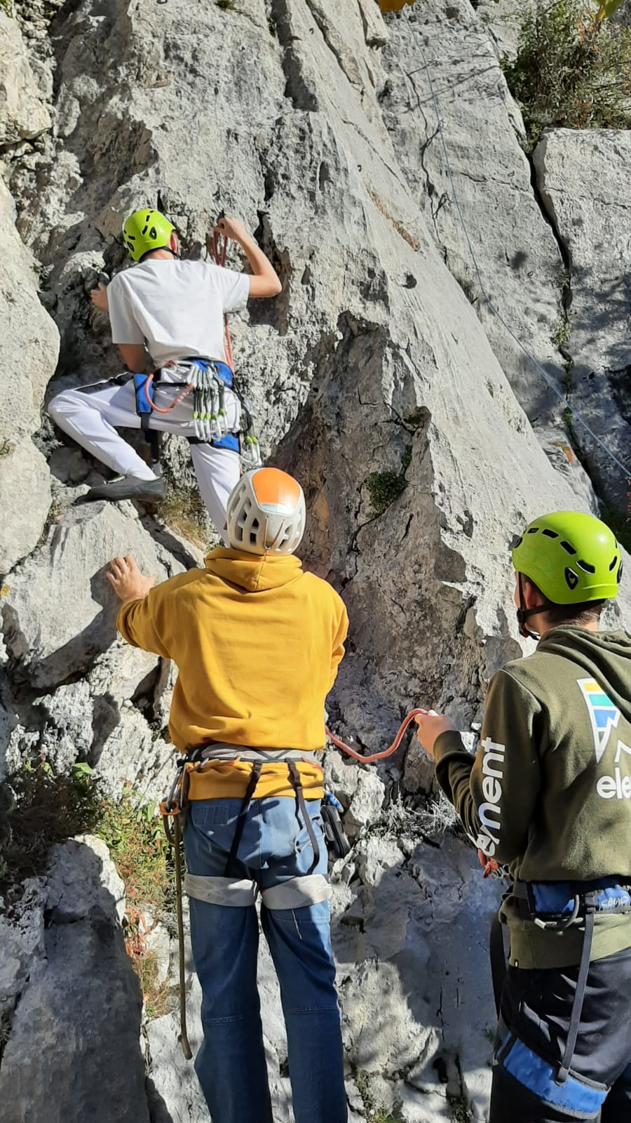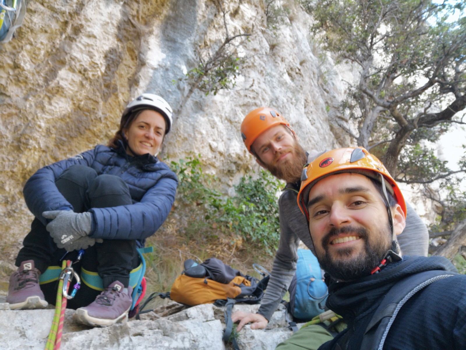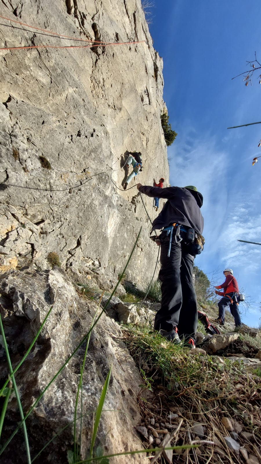 – Jean-Luc, Brice et Matthieu qui commencent facile avec « le croupoin du griffon« , une voie équipée qui ne dépasse pas le 5a. Idéale pour que Matthieu manipe en toute tranquillité.