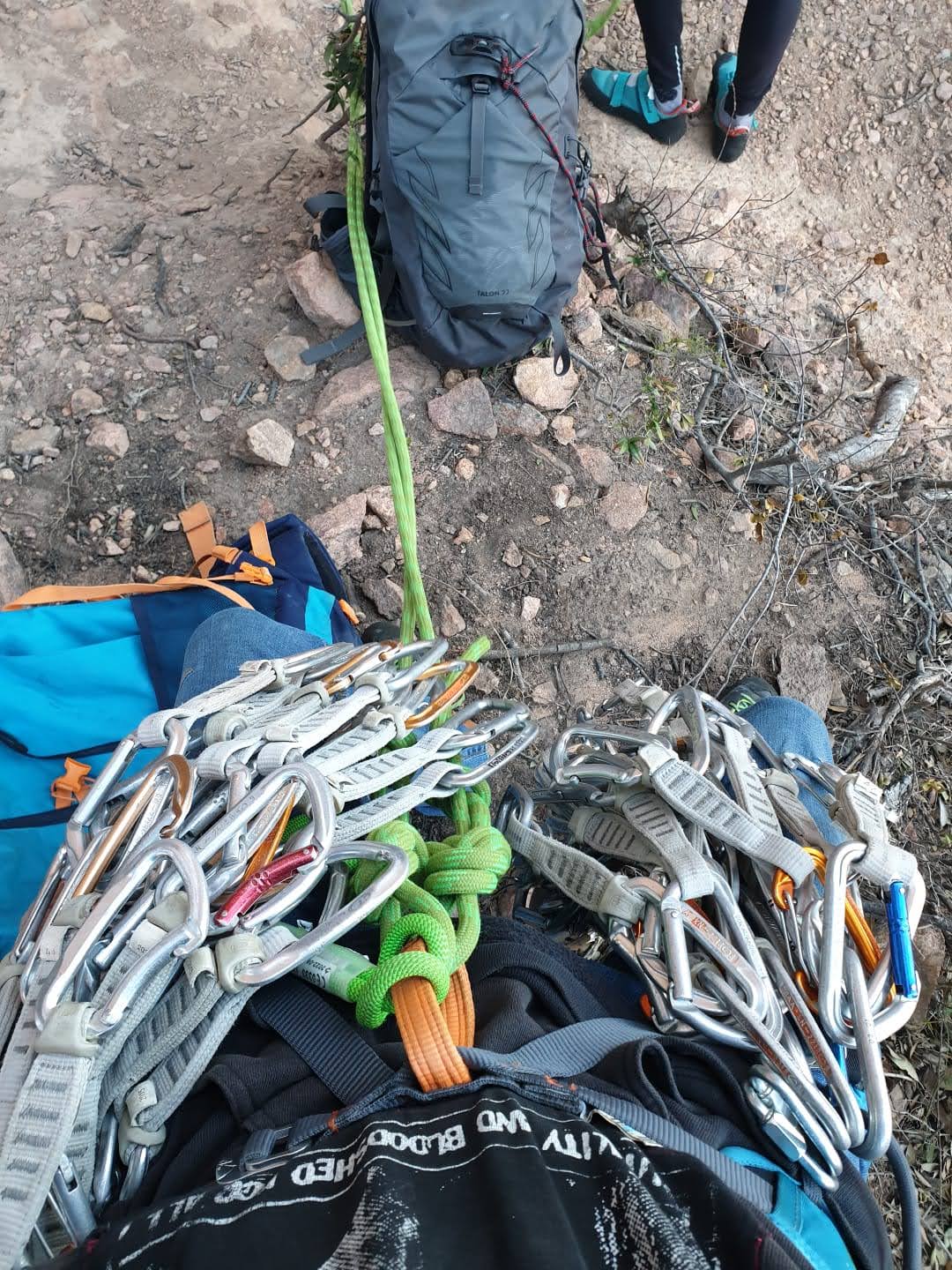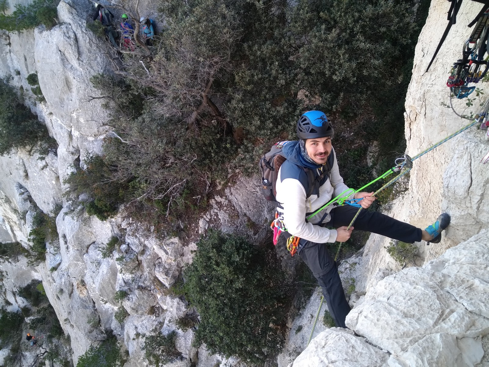 Jean-Luc et Brice récupèrent un jeu de friends et redescendent direct pour faire les schtroumpfs tandis que nous mangeons rapidement un bout. Certains avaient décidé de ne faire qu’une seule voie dans la journée et prennent un peu plus de temps avant de redescendre aux voitures avec le matos en trop. Djé, Sandrine, Alexis, Dounia, Stéphanie et Gautier nous quittent, non sans nous saluer depuis le parking.