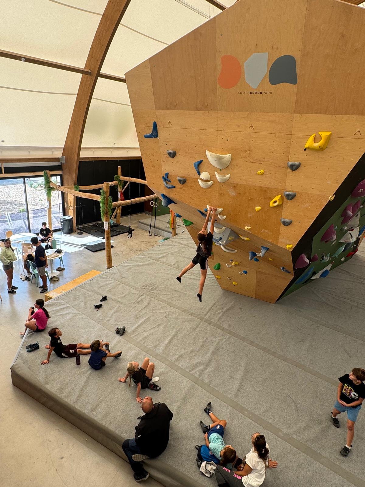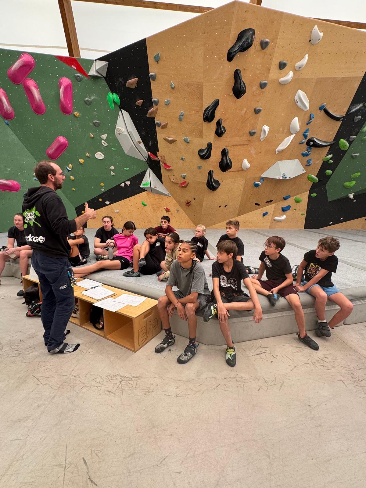 Et c’est parti pour l’escalade ! J’attaque avec les plus jeunes : Romane, Lino, Rose, Lilas, Lya, Maya et Mélia. Ils connaissent déjà les rudiments de l’activité puisqu’on avait fait une session en septembre, de la pose de pads à la parade. Les parents sont également vigilants et bien présents derrière nos jeunes bambins qui se chauffent allègrement dans les premiers blocs adaptés à leur taille.