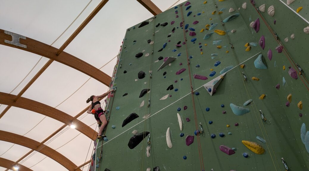 Après un petit concours de suspension, je m’éclipse pour rentrer à la maison, alors que se préparait un coucours de jeté où Léane a de nouveau été brillante de ce que j’ai entendu… Elle a autant de facilité en escalade qu’en bavardage celle-là !