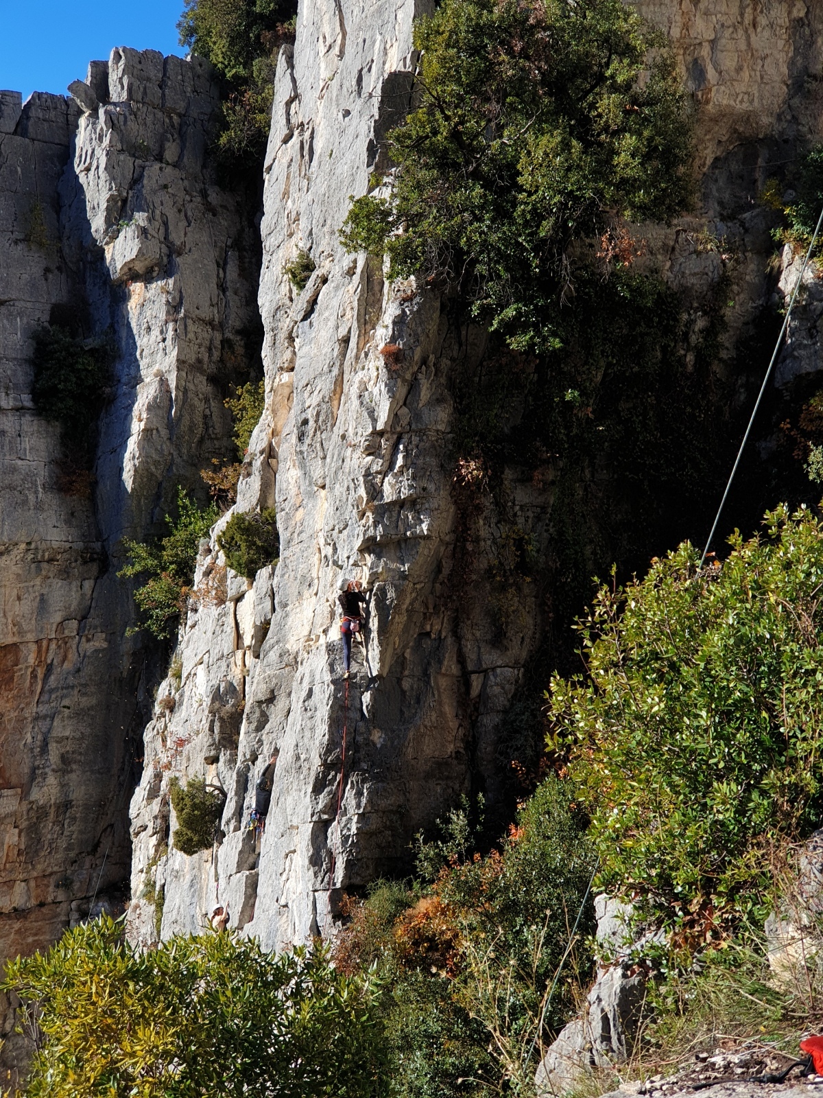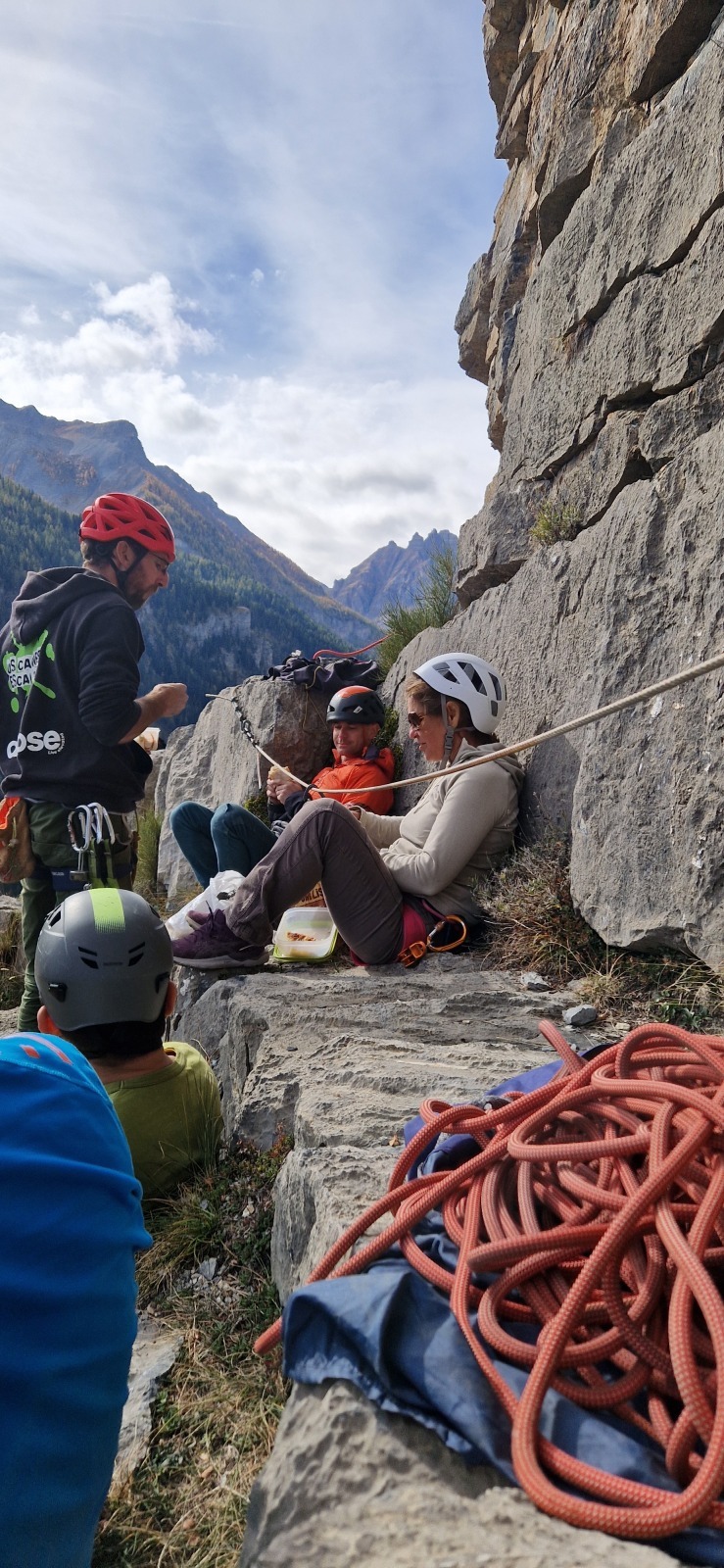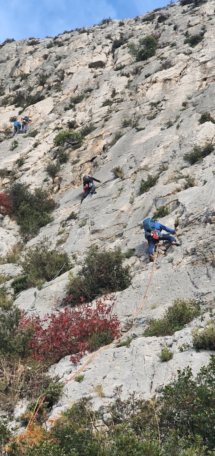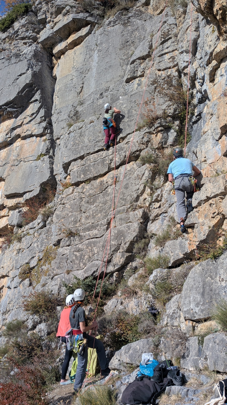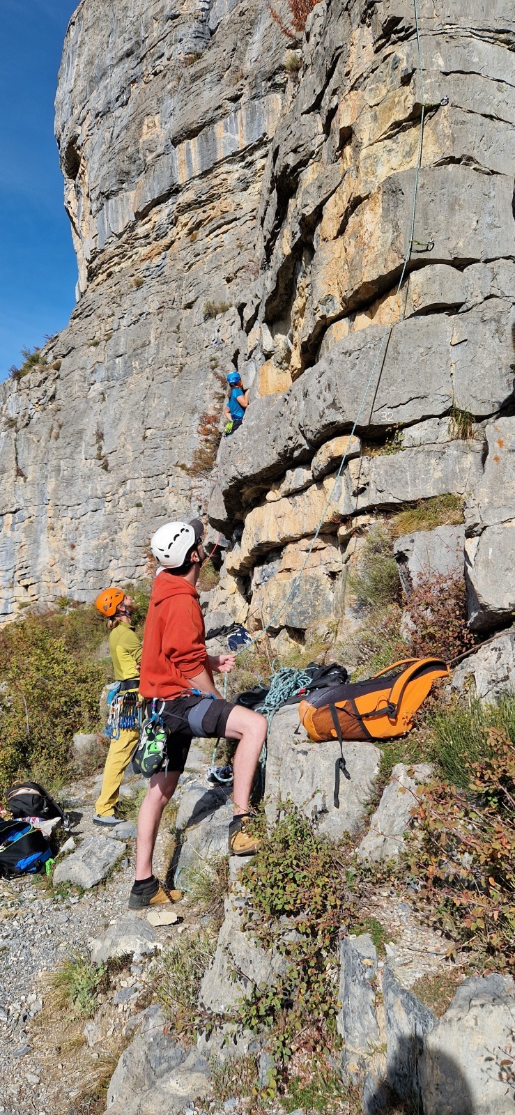 A notre gauche, Julien s’occupe de guide les cordées. Il enchaîne les deux premières longueurs (5c puis 6a) laissant la place à Roxane qui se perd un peu dans la longueur en 5c suivante malgré les indications claires « Vraiment à gauche ! » et oblige ses compagnons de cordée à traverser quelques buissons. Elle conserve le lead sur la longueur suivante et utilise ses compétences en TA pour improviser un relais mixte arbre/plaquette.